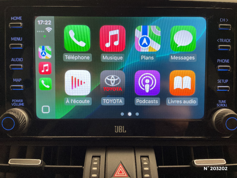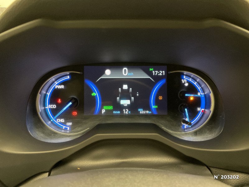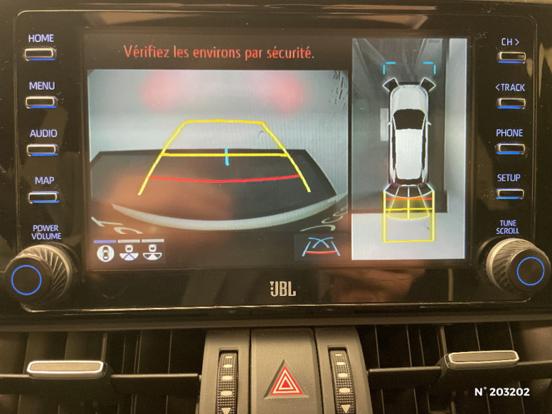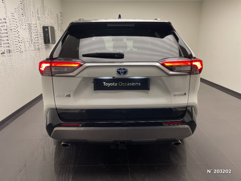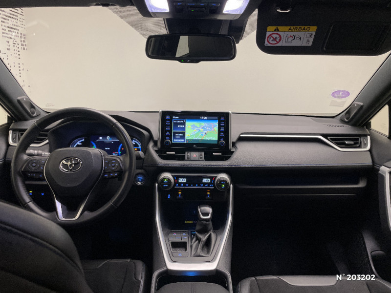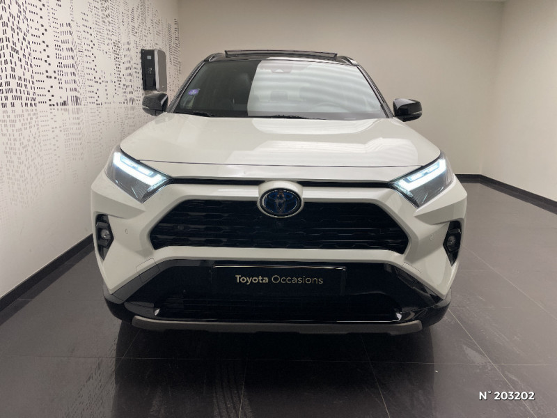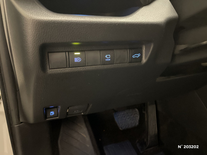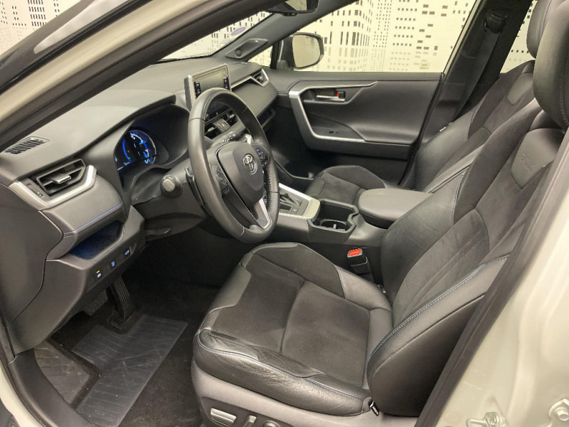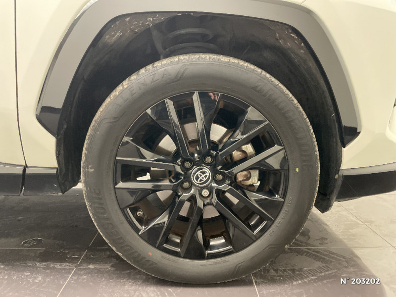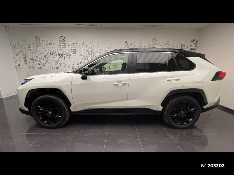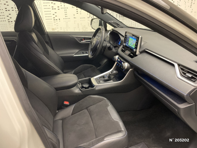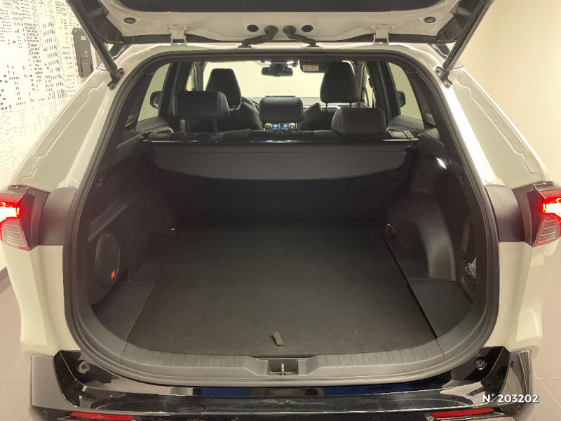 Seuils des portes aluminium siglés RAV4 / Siège conducteur à réglage lombaire électrique / Système anti-démarrage avec fonction double verrouillage / Système audio Toyota Touch avec écran couleur tactile 8" multifonction, connectique auxiliaire/USB et radio digitale (DAB) / Système audio Toyota Touch avec écran couleur tactile 8" multifonction, lecteur CD, système de téléphonie Bluetooth, connectique auxiliaire/USB, 6 haut-parleurs et antenne DAB. / Système AVAS (Acoustic Vehicle Alerting System) / Système d'appel d'urgence automatique "E-Call" / Système de connectivité smartphone Apple CarPlay / Android Auto / Système de téléphone Bluetooth / Système d'ouverture/fermeture des portes et démarrage sans clé "Smart Entry & Start" / Accoudoir central AV avec compartiment de rangement / Accoudoir central AV avec compartiment de rangement rétroéclairé / Alerte d'oubli de ceinture et de lumière / Antenne de toit type requin / Appuis-tête AV réglables en hauteur et en inclinaison réglables / "ATTENTION" - Equipements non communiqués / Avertisseur de circulation AR avec freinage d'urgence automatique (PKSB) / Barres de toit longitudinales / Cache-bagages / Carrosserie bi-ton avec toit et piliers peints en Noir Attitude / Ciel de pavillon noir / Clé sécurisée contre les attaques par relais / Coffre à ouverture et fermeture électriques / Combiné d'instrumentation avec écran couleur TFT 8" / Contreportes en cuir synthétique / Crochets porte-manteaux x2 / Double sortie d'echappement ovale / Ecrous antivol / Eléments de carrosserie de couleur Noir Laqué / Espace de rangement latéral dans le coffre / Essuie-glaces AV avec détecteur de pluie / Fermeture centralisée avec commande à distance et verrouillage des ouvrants en roulant / Feux clignotants à halogène / Feux stop à halogène / Filet coffre / Frein de stationnement électrique / Grille de calandre couleur acier / Indicateur de perte de pression des pneus / Jantes en alliage 19" Mojave Noir / Kit de réparation anti-crevaison / Kit de sécurité / Optiques AV et AR à LED / Optiques AV full-LED Premium / Optiques AV LED avec signature lumineuse Premium / Peinture bi-ton Blanc Nacré/Noir Attitude / Plancher de coffre réversible avec revers imperméable / Poignées de portes extérieures couleur carroserie / Porte-gobelets rétroéclairés / Protections de soubassement AV et AR grises / Rétroviseur intérieur électrochromatique / Rétroviseurs extérieurs couleur carrosserie / Rétroviseurs extérieurs électriques, dégivrants et rabattables électriquement avec rappel de clignotants / Sélection mode de conduite : ECO, NORMAL, SPORT, EV / Sellerie en cuir Alcantara noir avec embossage "RAV4" / Séparateur de coffre / Système intelligent de plancher plat Toyota Easy Flat System / Systèmes de contrôle de motricité (TRC) et de stabilité (TSC) / Systèmes de freinage antiblocage (ABS) et d'amplification de freinage d'urgence (BA) + EBD / Tapis de sol RAV4 Hybrid en velours, AV et AR / Toyota Safety Sense Système de sécurité précollision avec détection des piétons, Alerte de franchissement de ligne et détecteur de fatigue, gestion automatique des feux de route, lecture des panneaux de signalisation, régulateur de vitesse adaptatif. / Toyota Touch & Go : système de navigation à écran tactile 8" avec info trafic et cartographie européenne / Vitres électriques AV et AR à fonction anti-pincement avec descente et remontée à impulsion / Volant et levier de vitesse gainés cuir / Volant multifonction 3 branches, réglable manuellement en hauteur et profondeur / 7 Airbags (frontaux et latéraux pour conducteur et passager AV, rideaux AV et AR et protège-genoux conducteur) / 9 HP