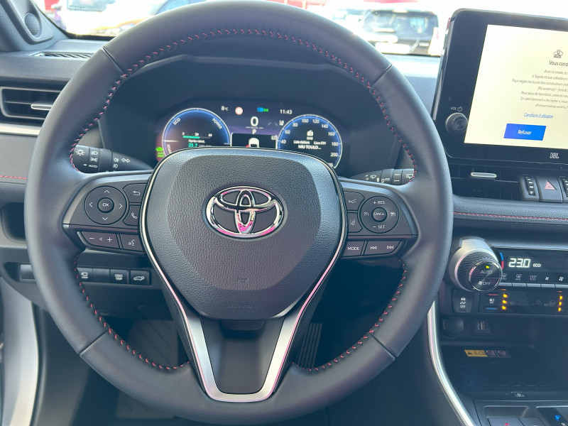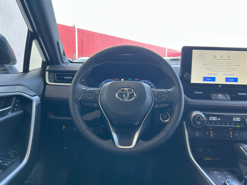 1 Port USB sur console centrale / 7 Airbags (1 protège-genoux conducteur, 2 fronteaux AV, 2 lateraux AV, 2 rideaux AV et AR) avec déconnexion de l'airbag passager / Accoudoir central AV avec compartiment de rangement / Antenne de toit type requin / Avertisseur de circulation AR avec freinage d'urgence automatique (PKSB) / Bandeau de planche de bord gainé de cuir noir / Barres de toit longitudinales / Câble de recharge Mode 2 (Type 2) - Domestique (3.3 kW) / Câble de recharge Mode 3 (Type 2) 6,6kW - 7,5m - avec prise Mennekes / Calandre AV noir laqué / Carrosserie bi-ton avec toit et piliers peints en Noir Attitude / Ciel de pavillon noir / Climatisation à régulation automatique bizone activable à distance / Coffre à ouverture et fermeture électriques / Commande de blocage de différentiel "Trail" / Commande de boîte de vitesses séquentielles / Commandes des vitres rétroéclairées / Compartiment de rangement dans la console centrale / Compteur numérique personnalisable 12,3" / Coques de rétroviseur extérieur noir laqué / Direction électrique motorisée (RP-EPS) / Double sortie d'echappement ovale / Eclairage d'accueil LED aux places AV / Ecrous antivol / Eléments de carrosserie de couleur Noir Laqué bas de caisse latéraux, bas de porte de coffre et haut de pare-chocs AR, pare-chocs AV et passages de roues / Essuie-glaces AV avec détecteur de pluie / Fermeture centralisée avec commande à distance et verrouillage des ouvrants en roulant / Filet coffre / Frein de stationnement électrique / Indicateur de perte de pression des pneus / Indicateur de température extérieure / Kit de sécurité / Optiques AV et AR à LED avec nouvelle signature lumineuse Premium / Ornement de calandre AV chromé / Ornements supérieurs de vitre chromés / Ouverture électrique de la trappe à carburant / Poignées de portes extérieures couleur carroserie / Ports USB (1 x console centrale) / Ports USB - Type C - 2 ports supplémentaires dans l'accoudoir / Ports USB - Type C (2 x passagers AR) / Prise 12V 1 x console centrale, 1 x coffre / Prise 220 V / 150 W dans le coffre / Programme "Toyota Experience" / Rétroviseur intérieur électrochromatique / Rétroviseurs extérieurs électriques, dégivrants et rabattables électriquement avec rappel de clignotants / Roue de secours de type galette dans le coffre / Sacoche de rangement pour le câble de recharge / Sélection mode de conduite : ECO, NORMAL, SPORT, EV MODE, EV AUTO, HYBRID MODE, CHARGE MODE / Sellerie cuir noir avec surpiqûres rouges / Services connectés de contrôle à distance MyToyota (inclus 4 ans) / Services connectés standards MyToyota (inclus 10 ans) / Seuils des portes aluminium / Siège conducteur à réglage lombaire électrique / Sièges AV réglables électriquement - 8 posotions (à mémoire côté conducteur) / Système audio JBL Premium avec 9HP / Système d'alarme avec fonction double verrouillage et détection de bris de glace / Système d'appel d'urgence automatique "E-Call" / Système de contrôle de motricité (TRC) et de stabilité du véhicule et de l'attelage (TSC) / Système de freinage antiblocage ABS+BA+EBD / Système d'ouverture/fermeture et démarrage sans clé "Smart Entry & Start" / Système multimédia Toyota Smart Connect: Écran couleur tactile 10,5 haute définition, Connectivité Bluetooth, USB et radio FM et DAB (digitale), Système de connectivité smartphone Apple CarPlay (sans fil), Android Auto (filaire avec un câble USB certifié) Services intelligents dont navigation connectée avec infotrafic en temps réel, mises à jour cartographiques, assistant vocal Hey Toyota et recherche de points d'intérêts / Tapis de sol / Toyota Safety Sense Système de sécurité précollision avec détection des véhicules, piétons et cyclistes, actif également dans les intersections. Alerte de franchissement de ligne avec aide au maintien dans la file, assistant de trajectoire et détecteur de fatigue, Lecture des panneaux de signalisation avec limiteur de vitesse, Gestion automatique des feux de route, Régulateur de vitesse adaptatif intelligent, Système d'aide aux manoeuvres d'évitement d'urgence avec détection des véhicules, piétons et cyclistes / Vitres électriques AV et AR à fonction anti-pincement avec descente et remontée à impulsion / Volant et levier de vitesse gainés cuir / Volant multifonction 3 branches, réglable manuellement en hauteur et profondeur