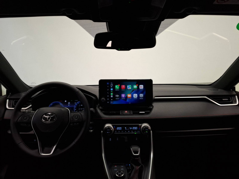 1 Port USB sur console centrale / 7 Airbags (1 protège-genoux conducteur, 2 fronteaux AV, 2 lateraux AV, 2 rideaux AV et AR) avec déconnexion de l'airbag passager / Accoudoir central AV avec compartiment de rangement / Antenne de toit type requin / Bandeau de planche de bord gainé de cuir noir / Barres de toit longitudinales / Câble de recharge Mode 2 (Type 2) - Domestique (3.3 kW) / Câble de recharge Mode 3 (Type 2) 6,6kW - 7,5m - avec prise Mennekes / Calandre AV noir laqué / Ciel de pavillon noir / Climatisation à régulation automatique bizone activable à distance / Coffre à ouverture et fermeture électriques / Commande de blocage de différentiel "Trail" / Commande de boîte de vitesses séquentielles / Commandes des vitres rétroéclairées / Compartiment de rangement dans la console centrale / Compteur numérique personnalisable 12,3" / Coques de rétroviseur couleur carrosserie / Direction électrique motorisée (RP-EPS) / Double sortie d'echappement ovale / Eclairage d'accueil LED aux places AV / Ecrous antivol / Eléments de carrosserie de couleur Noir Laqué bas de caisse latéraux, bas de porte de coffre et haut de pare-chocs AR, pare-chocs AV et passages de roues / Essuie-glaces AV avec détecteur de pluie / Fermeture centralisée avec commande à distance et verrouillage des ouvrants en roulant / Filet coffre / Frein de stationnement électrique / Indicateur de perte de pression des pneus / Indicateur de température extérieure / Kit de sécurité / Optiques AV et AR à LED avec nouvelle signature lumineuse Premium / Ornement de calandre AV chromé / Ornements supérieurs de vitre chromés / Ouverture électrique de la trappe à carburant / Poignées de portes extérieures couleur carroserie / Ports USB (1 x console centrale) / Ports USB - Type C (2 x passagers AR) / Prise 12V 1 x console centrale, 1 x accoudoir, 1 x coffre / Prise 220 V / 150 W dans le coffre / Programme "Toyota Experience" / Rétroviseur intérieur électrochromatique / Rétroviseurs extérieurs électriques, dégivrants et rabattables électriquement avec rappel de clignotants / Roue de secours de type galette dans le coffre / Sacoche de rangement pour le câble de recharge / Sélection mode de conduite : ECO, NORMAL, SPORT, EV MODE, EV AUTO, HYBRID MODE, CHARGE MODE / Sellerie sport en tissu noir avec surpiqûres rouges / Services connectés de contrôle à distance MyToyota (inclus 4 ans) / Services connectés standards MyToyota (inclus 10 ans) / Siège conducteur à réglage lombaire électrique / Système d'appel d'urgence automatique "E-Call" / Système de contrôle de motricité (TRC) et de stabilité du véhicule et de l'attelage (TSC) / Système de freinage antiblocage ABS+BA+EBD / Système d'ouverture/fermeture et démarrage sans clé "Smart Entry & Start" / Système multimédia Toyota Smart Connect: Écran couleur tactile 10,5 haute définition, Connectivité Bluetooth, USB et radio FM et DAB (digitale), Système de connectivité smartphone Apple CarPlay (sans fil), Android Auto (filaire avec un câble USB certifié) Services intelligents dont navigation connectée avec infotrafic en temps réel, mises à jour cartographiques, assistant vocal Hey Toyota et recherche de points d'intérêts / Tapis de sol / Toyota Safety Sense Système de sécurité précollision avec détection des véhicules, piétons et cyclistes, actif également dans les intersections. Alerte de franchissement de ligne avec aide au maintien dans la file, assistant de trajectoire et détecteur de fatigue, Lecture des panneaux de signalisation avec limiteur de vitesse, Gestion automatique des feux de route, Régulateur de vitesse adaptatif intelligent, Système d'aide aux manoeuvres d'évitement d'urgence avec détection des véhicules, piétons et cyclistes / Vitres électriques AV et AR à fonction anti-pincement avec descente et remontée à impulsion / Volant et levier de vitesse gainés cuir / Volant multifonction 3 branches, réglable manuellement en hauteur et profondeur