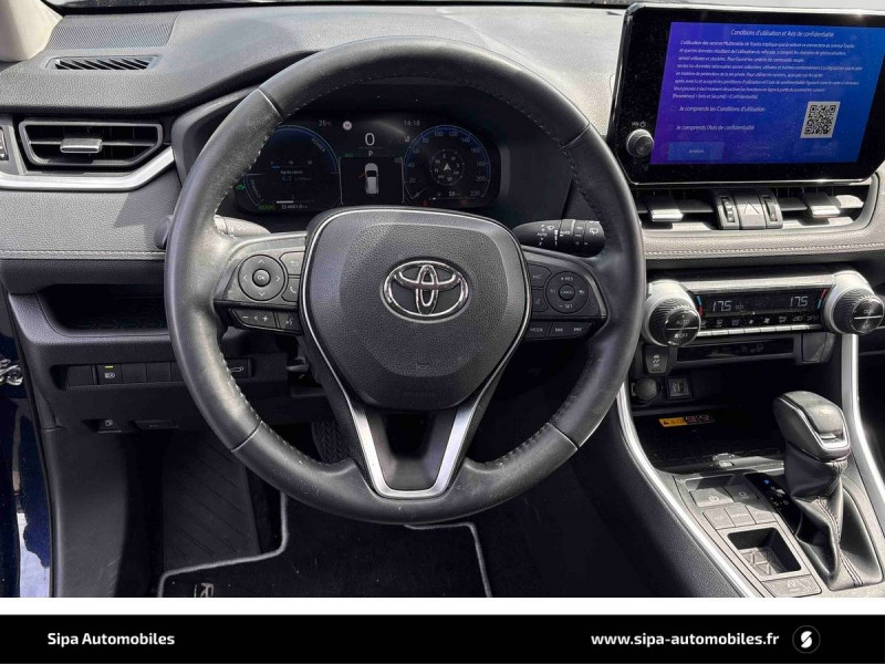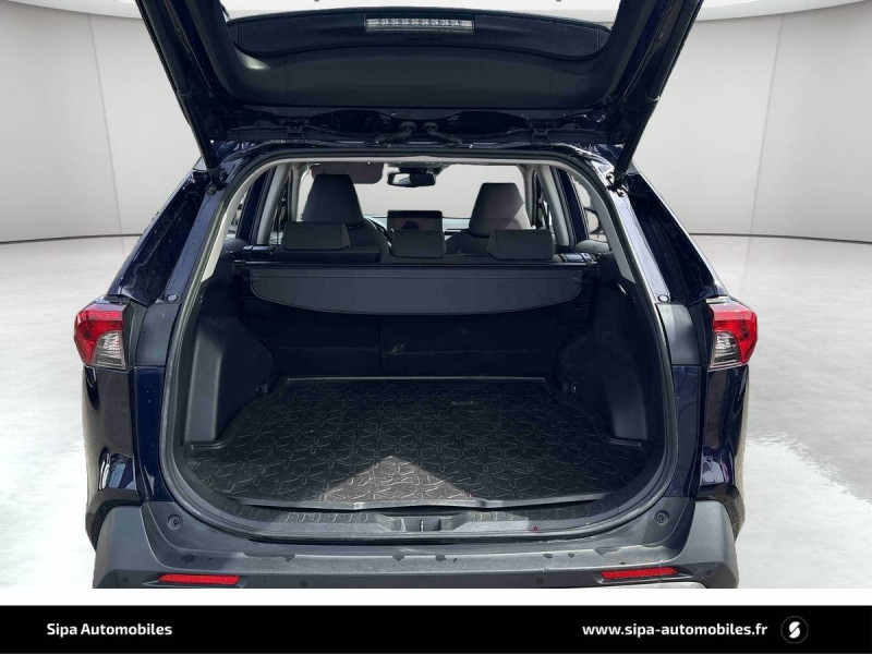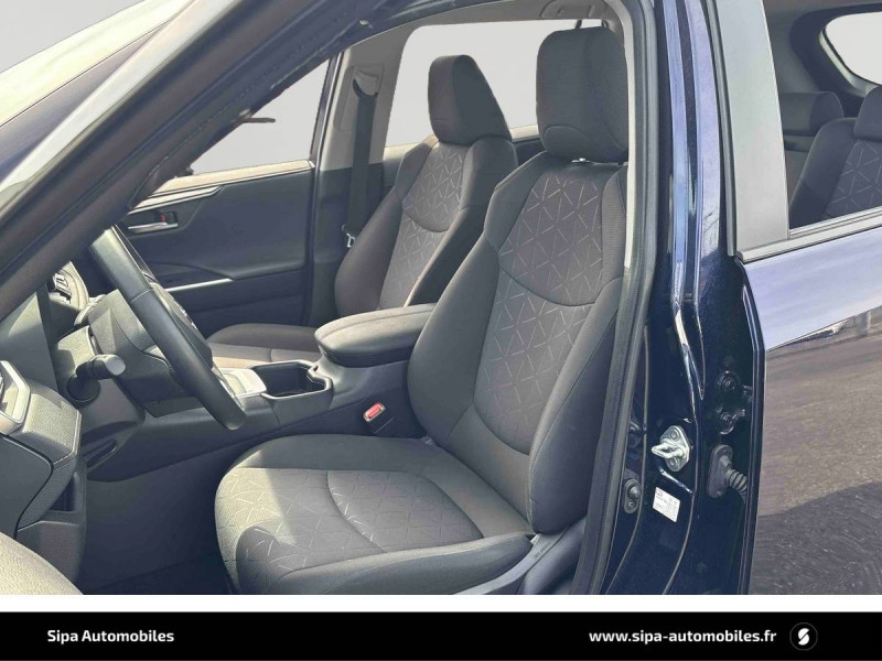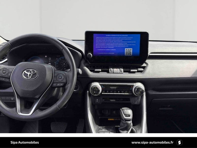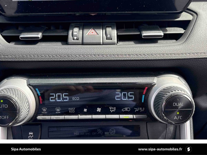 6 HP / 7 Airbags (frontaux et latéraux pour conducteur et passager AV, rideaux AV et AR et protège-genoux conducteur) / Accoudoir central AV avec compartiment de rangement rétroéclairé / Alerte d'oubli de ceinture et de lumière / Antenne de toit type requin / Appuis-tête AV réglables en hauteur et en inclinaison réglables / Barres de toit longitudinales / Ciel de pavillon gris / Clé sécurisée contre les attaques par relais / Coffre à ouverture et fermeture électriques / Combiné d'instrumentation avec écran couleur TFT 8" / Contreportes en cuir synthétique / Crochets porte-manteaux x2 / Double sortie d'echappement ovale / Ecrous antivol / Espace de rangement latéral dans le coffre / Essuie-glaces AV avec détecteur de pluie / Fermeture centralisée avec commande à distance et verrouillage des ouvrants en roulant / Feux clignotants à halogène / Feux stop à halogène / Filet coffre / Frein de stationnement électrique / Grille de calandre couleur acier / Indicateur de perte de pression des pneus / Kit de sécurité / Optiques AV et AR à LED / Peinture Blanc Pur / Plancher de coffre réversible avec revers imperméable / Poignées de portes extérieures couleur carroserie / Protections de soubassement AV et AR grises / Rétroviseur intérieur électrochromatique / Rétroviseurs extérieurs couleur carrosserie / Rétroviseurs extérieurs électriques, dégivrants et rabattables électriquement avec rappel de clignotants / Roue de secours de type galette dans le coffre / Sélection mode de conduite : ECO, NORMAL, SPORT, EV / Sellerie en tissu sport noir / Système AVAS (Acoustic Vehicle Alerting System) / Système d'appel d'urgence automatique "E-Call" / Système de connectivité smartphone Apple CarPlay / Android Auto / Système de téléphone Bluetooth / Système d'ouverture/fermeture des portes et démarrage sans clé "Smart Entry & Start" / Système intelligent de plancher plat Toyota Easy Flat System / Systèmes de contrôle de motricité (TRC) et de stabilité (TSC) / Systèmes de freinage antiblocage (ABS) et d'amplification de freinage d'urgence (BA) + EBD / Tapis de sol RAV4 Hybrid en velours, AV et AR / Toyota Safety Sense Système de sécurité précollision avec détection des piétons, Alerte de franchissement de ligne et détecteur de fatigue, gestion automatique des feux de route, lecture des panneaux de signalisation, régulateur de vitesse adaptatif. / Toyota Smart Connect / Vitres électriques AV et AR à fonction anti-pincement avec descente et remontée à impulsion / Volant et levier de vitesse gainés cuir / Volant multifonction 3 branches, réglable manuellement en hauteur et profondeur