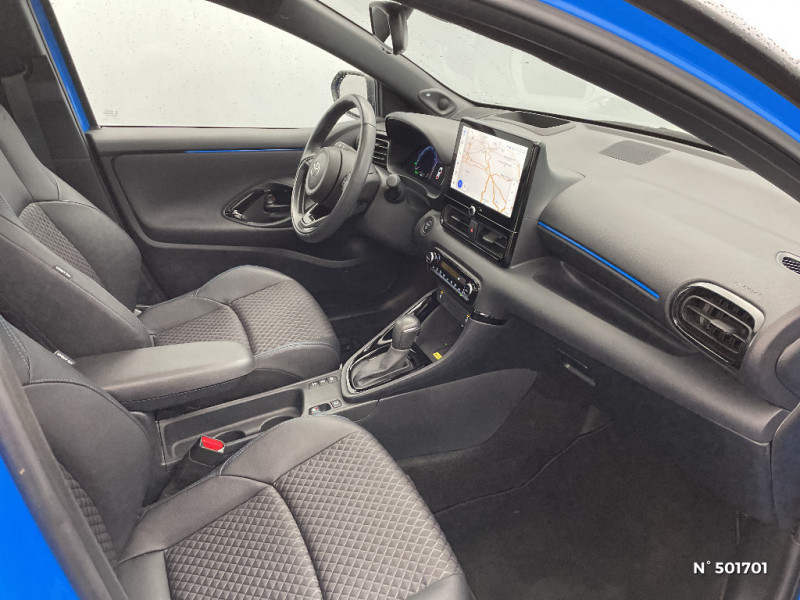 Alerte de détection des cyclistes et véhicules à l'ouverture des portes (SEA) / Antenne de toit aileron de requin / Avertisseur de circulation AR (RCTA) / Inserts décoratifs bleus dans l'habitacle / Purificateur d'air ionique nanoe X / Rétroviseur intérieur électrochromatique / Sellerie Premium et tissu avec surpiqûres bleues / Sellerie simili-cuir et tissu avec surpiqûres bleues / Ciel de toit noir / Clé digitale / Compteur numérique personnalisable 12,3" / Contour de vitres noir laqué / Double plancher du coffre / Eclairage d'ambiance intérieur / Ecran TFT 7" / Feux AR à LED (hors clignotants) / Feux de croisement à LED / Services connectés de contrôle à distance MyToyota (inclus 4 ans) / Services connectés MyT avec contrôle à distance (Verrouillage et déverrouillage des portes, localiser mon véhicule (feux clignotants) et commande à distance de température) / Siège conducteur avec support lombaire électrique / Système d'appel d'urgence automatique "E-Call" / Système de connectivité smartphone sans fil Apple CarPlay et Android Auto / Système d'ouverture/fermeture et démarrage sans clé "Smart Entry & Start" / Système multimédia Toyota Smart Connect avec écran tactile 10,5" haute définition, Bluetooth, USB, Radio FM et DAB (digitale), 2 ports USB-C et 6 hp, Services intelligents avec Navigation connectée avec infotrafic en temps réel, mises à jour cartographiques, assistant vocal "Hey Toyota" et recherche de points d'intérêts (inclus 4 ans) / Système multimédia Toyota Smart Connect avec Ecran tactile 10,5", Navigation connectée avec radio digitale DAB, Bluetoot, 2 ports USB-C, infotrafic en temps réel, Smart Parking (aide à la recherche de stationnement), Connectivité smartphone sans fil, Assistant vocal HEY TOYOTA, 4 ans de mises à jour cartographiques et services connectés inclus / Tableau de bord moussé / Toyota Safety Sense 3 Alerte de franchissement de ligne avec aide au maintien dans la file et assistant de trajectoire et détecteur de fatigue (LDA), Gestion automatique des feux de route (AHB), Lecture des panneaux de signalisation de route (RSA), Régulateur de vitesse adaptatif (ACC) / Toyota T-MATE / Systemes d'aide à la conduite et au stationnement Avertisseur de circulation AR, Avertisseur d'angles morts, Aide à la sortie sécurisée / Toyota T-MATE / Toyota Safety Sense Système de sécurité précollision avec détection des véhicules, piétons et cyclistes, actif également dans les intersections+Alerte de franchissement de ligne avec aide au maintien dans la file, assistant de trajectoire et détecteur de fatigue+Lecture des panneaux de signalisation avec limiteur de vitesse+Gestion automatique des feux de route+Régulateur de vitesse adaptatif intelligent+Système d'arrêt d'urgence autonome +Système d'assistance à la conduite proactive+Suppression de l'acceleration / Volant chauffant