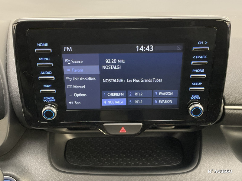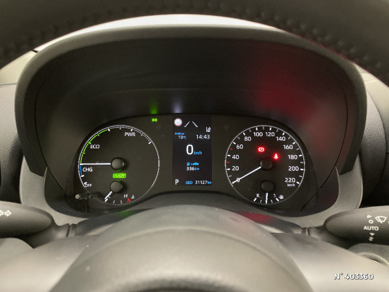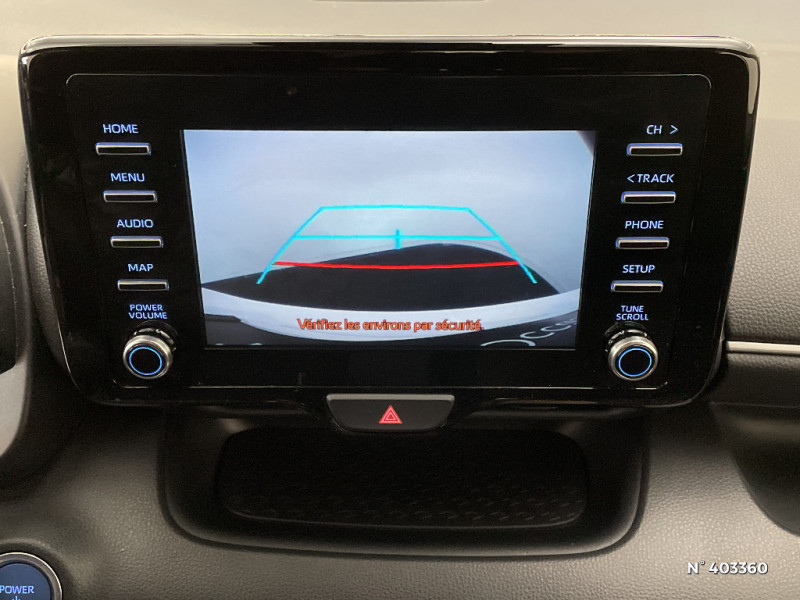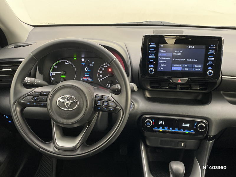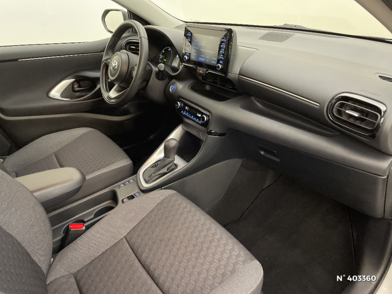 Antenne de toit aileron de requin / Boîte automatique à variation continue / Ciel de toit gris clair / Contrôle de traction (TCS) / Double plancher du coffre / Electrostabilisateur programmé (ESP) / Enjoliveurs 15" / Feux de route halogènes / Rétroviseur intérieur électrochromatique / Rétroviseurs extérieurs couleur carrosserie / Services connectés standards MyToyota (inclus 10 ans) / Système d'appel d'urgence automatique "E-Call" / Système de connectivité smartphone sans fil Apple CarPlay et Android Auto / Système d'ouverture/fermeture et démarrage sans clé "Smart Entry & Start" / Système multimédia Toyota Touch 3 écran tactile 9", radio digitale (DAB), Bluetooth, 2 ports USB-C et 6 hp / Tableau de bord moussé / Toyota T-MATE / Toyota Safety Sense Système de sécurité précollision avec détection des véhicules, piétons et cyclistes, actif également dans les intersections+Alerte de franchissement de ligne avec aide au maintien dans la file, assistant de trajectoire et détecteur de fatigue+Lecture des panneaux de signalisation avec limiteur de vitesse+Gestion automatique des feux de route+Régulateur de vitesse adaptatif intelligent+Système d'arrêt d'urgence autonome +Système d'assistance à la conduite proactive+Suppression de l'acceleration