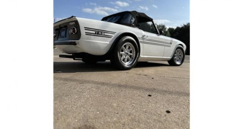 1974 Triumph TR6. Moteur 4.3l V6. Boîte mécanique TH350 avec kit de vitesses et différentiel limité de Nissan 300ZX, soutenu par des joints CV de Good Engineering. Suspension indépendante avant et arrière à ressorts de courroie, freins à disque avant et tambours arrière, master cylindre Wildwood. Jantes VTO Minilite-style. Couleur extérieure Blanche, intérieur Noir en tissu avec tableau de bord personnalisé en fibre de carbone et instruments électroniques, volant à quatre branches, palette de vitesse Lokar, sièges en vinyle noir, manchette de rangement de console centrale, couverture de coffre en tapis et coffre tapissé. Restoration complète, avec châssis restauré et amélioré. Bon état général.. Provenance : North Carolina. Disponibilité : environ 7 semaines, clés en main. 35 500 € tout compris (importation, taxes, procédure d'immatriculation). Annonce publiée le 01/12/2025