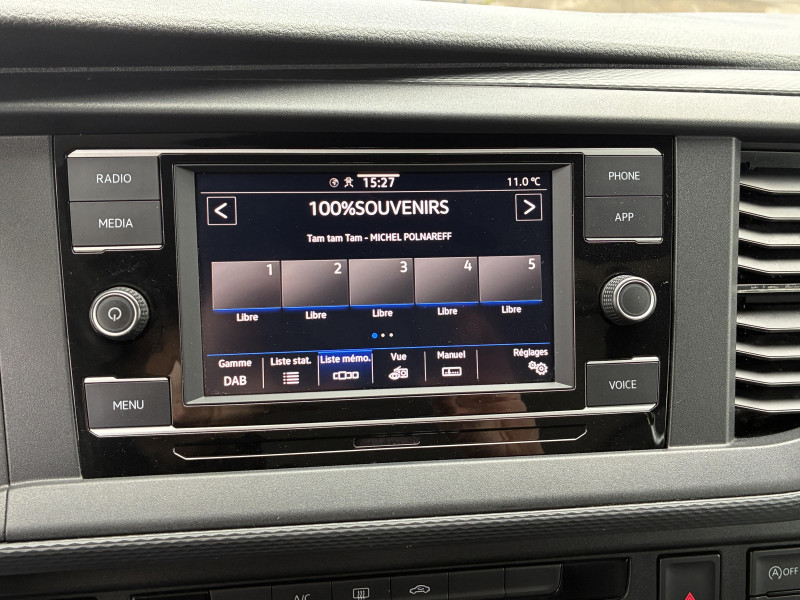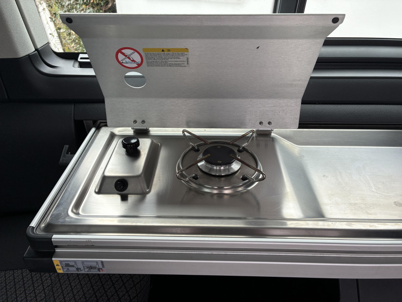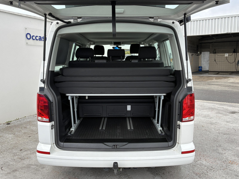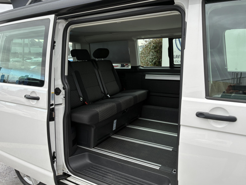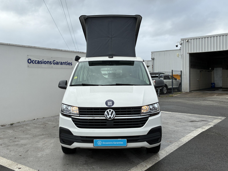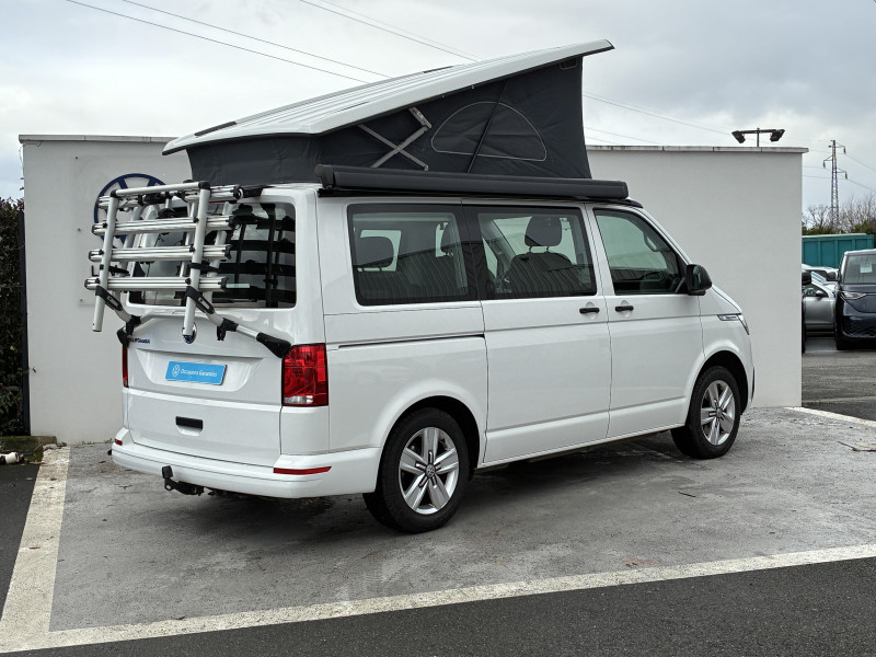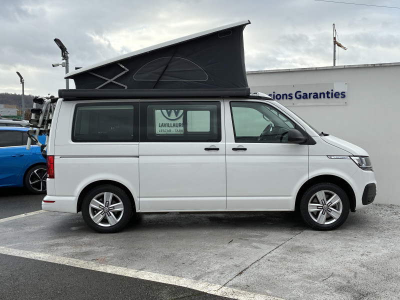 Climatisation "Climatic" (semi-automatique) dans la cabine avec réglage électronique et chauffage dans compartiment passagers/charge, réglable séparément / Correcteur électronique de trajectoire ESP avec aide au freinage d?urgence AFU système antiblocage des freins ABS, système de stabilisation de la remorque, système anti-patinage ASR, régulateur de couple d?inertie moteur MSR / Jantes en acier 7Jx17" / Préparation pour dispositif d'attelage / 2 clés pliantes de radiocommande pour le système de fermeture avec télécommande / 2 connexions USB (type C) dans le tableau de bord / 2e batterie (75 Ah, AGM) avec relais de coupure et surveillance de la batterie / 6 haut-parleurs : 2 haut-parleurs d?aigus, 2 haut-parleurs de graves. 2 haut-parleurs à large spectre / Accoudoirs pour les 2 sièges AV / Affichage multifonctions Plus / Airbags frontaux pour conducteur et passager, rétracteurs à gauche et à droite et désactivation de l?airbag du passager / Airbags latéraux et airbags de tête conducteur et passager AV / Ancrage pour siège-enfant ISOFIX et Top Tether / Appuie-tête (réglables en hauteur à l?AV et en hauteur et en inclinaison à l?AR) / Appuis lombaires réglables manuellement pour sièges individuels AV (non réglable en hauteur) / Assistant de vent latéral / Autoradio "Composition Colour" avec écran tactile 6,5" / Avertisseur sonore 1 ton / Banquette/couchette 2 places, coulissante et rabattable en 2 couchages, dans la 3ème rangée de siège / Batterie standard et alternateur plus puissant / Boitiers des rétroviseurs extérieurs et poignées de porte couleur noire / Caches d'obscuration en tissu pour la cabine / Car-Net "App-Connect" / Charnières pour portes AR/hayon en version normale / Chauffage d'appoint dans le compartiment passagers, chauffage (à régulation mécanique) dans la cabine / Combiné d?instruments (km/h); affichages de vitesse, compteur total./journalier, régime, niveau carburant, heure / Direction assistée électromécanique avec colonne de direction de sécurité réglable en hauteur et en profondeur / Dispositif start/stop de mise en veille avec récupération de l'énergie au freinage / Eclairage du marche-pieds avec inscription "California" / Eclairage du marchepied, sur les portes dans la cabine et les porte(s) coulissante(s) dans l'espace passagers / Eclairage jour (allumé en permanence pendant la marche) / Fenêtre coulissante à l'AV et fenêtre fixe à l'AR dans le compartiment de charge/passager à gauche / Fenêtres latérales dans le compartiment passagers/charge, à droite / Fermeture du hayon sans fonction de déverrouillage de l'intérieur / Feux AR en version standard / Fonctionnement intermittent de l'essuie-glace / Garniture de plancher en moquette dans la cabine / Grille de calandre avec deux baguettes chromées / Hayon avec baie de fenêtre / Interface pour téléphone portable / Kitchenette (sur le panneau latéral entre montants B et C) avec réchaud à gaz 1 feu avec allumage piézo / Lit sous toit (env. 2 000 x 1 200 mm) avec coupelles de ressort et matelas / Lunette AR avec verre athermique, dégivrante, et essuie-glace/lave-glace AR / Outillage de bord et cric / Pare-brise en verre feuilleté en verre athermique / Pare-chocs peints dans la couleur de carrosserie / Pare-soleil avec miroir, éclairés, et étiquette d?airbag sur le pare-soleil du passager AV / Pneus 215/60 R17 C 109/107T à résistance au roulement optimisée / Poids Total Admissible 3080 kg / Poignées (rabattables et à retour freiné) sur le cadre de toit / Poignées d?accès sur le montant AV, côté conducteur et passager AV / Porte coulissante à droite dans le compartiment passagers / Prise électrique à l?AV / Projecteurs doubles halogènes H7 / Protection centrale de roue / Protection de seuil de chargement en plastique / Radio "Composition Audio" avec écran TFT (monochrome) / Rails de fixation sur le toit (préparation pour galerie porte-bagages coulissante) / Rallonge de lit avec matelas / Revêtement de sol en plastique dans l'espace passagers / Revêtement intérieur de pavillon pour Camper / Roue de secours en acier de taille normale / Réchauffeur additionnel / Réglage du site des phares, manuel / Rétroviseur intérieur de sécuritéà réglage jour/nuit / Service d'appel d'urgence e-Call / Signal sonore et lumineux pour ceinture de sécurité conducteur non attachée / Siège conducteur et passager "Confort" pivotants, avec appuis lombaires et accoudoirs / Suspension et amortissement standard / Système de plafonniers Camper dans le compartiment passagers / Sécurité enfants sur les portes coulissantes dans le compartiment passagers / Table de camping située dans la porte coulissante et 2 chaises pliantes situées dans le hayon / Tableau de bord standard avec console centrale étroite / Tension de service 12 V et prise 230 V sur l?armature du siège conducteur / Toit relevable à commande manuelle avec 2 fenêtres latérales, soufflet en Basalt Grey / Trains roulants 17" avec frein à disque 17" à l'AV et frein à disques 16" à l'AR / Verre athermique simple (vert) dans la cabine et dans l' espace passagers / Version Fumeur (prise 12V avec allume-cigare, cendriers et 2 porte-gobelets dans le tableau de bord) / Vibreur et témoin d?alerte pour ceinture du conducteur non attachée / Vide-poches de porte avec respectivement 2 compartiments avec porte-bouteille intégré dans la cabine / Volume du réservoir à carburant de 70 l / We Connect Plus
