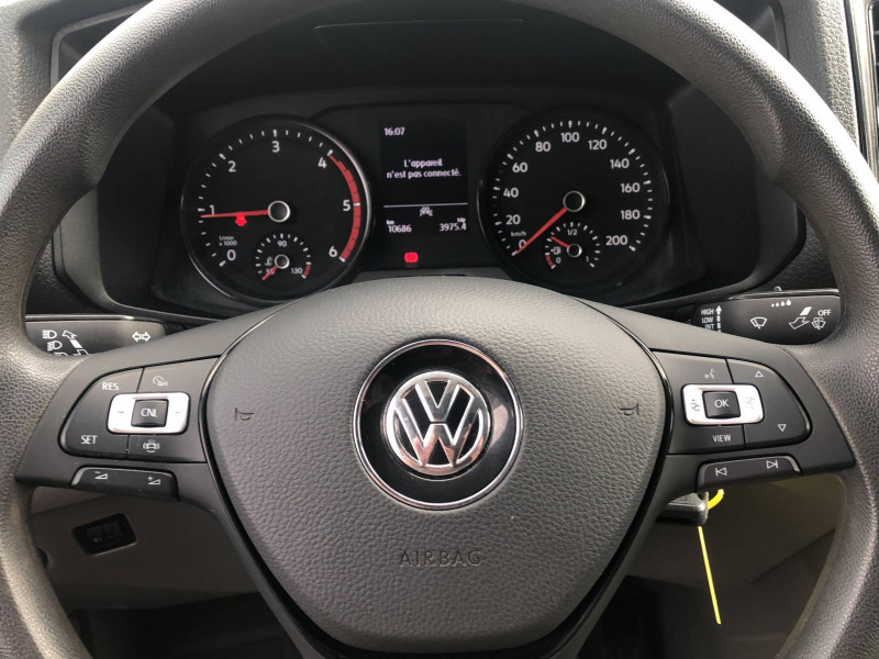 4 jantes en acier 6 1/2 J x 16 avec charge de 1050 kg, en argent / Ceintures de sécurité 3 points automatiques avec réglage hauteur ceinture AV et rétracteurs de ceinture électriques / Climatisation "Climatic" mono zone avec réglage manuel / Eclairage dans le compartiment de charge: 4 spots à LED / Système d'aide au maintien de la trajectoire en cas de vent latéral (Side Wind Assist) / 2 télécommandes de déverrouillage des portes avec clé escamotable / Affichage de la pression et de la température des pneus / Affichage multifonction plus / Alternateur triphasé 140 A / Banquette double pour 2 passagers avec grand espace de rangement sous les assises relevables séparément, d'une table au dos de la place du milieu (rabattable) avec porte-gobelet et porte-stylo / Batterie 420 A (70 Ah) / Boîte à gants (éclairée) avec volet fermant à clé / Cloison de séparation pleine / Combiné d'instruments (km/h), affichages de la vitesse, compteur totalisateur, régime, niveau de carburant et heure / Eclairage diurne / Freins à disque AV 16" / Galerie de toit avec 2 emplacements de rangements et lampes de lecture pour chaque siège / Garniture de plancher dans la cabine en caoutchouc / Glaces latérales en verre athermique / Hauteur de toit H3 / Interface Bluetooth pour téléphone portable / Marchepied à l'entrée de l'espace de chargement, à AR / Mesures d'insonorisation de l'intérieur Plus / Oeillets d'arrimage pour fixation de la charge / Outillage de bord avec cric / Pare-chocs AV dans la couleur de la carrosserie en partie haute / Park Pilot - Radar de recul AV et AR / Paroi entre la cabine et le compartiment de charge parfaitement verticale / Pneus 205/75 R 16 C 113/111, à résistance au roulement optimisée / Poids Total Admissible 3 500 kg / Poignée sur la paroi dans le compartiment de charge / Poignées d'accès sur les montants AR Poignées dédiées à la porte latérale / Porte coulissante à droite dans le compartiment charge / Portes AR à vantaux sans baies de fenêtre / Prise 12 V et 4 porte-gobelets dans le tableau de bord / Protection centrale de roue / Protection latérales de la carrosserie contre les petits chocs du quotidien / Préparation We Connect et We Connect Plus (pour Radio Composition Media) / Radio "Composition Media" Écran tactile 8 pouces Commande vocale Préparation We Connect 2 prises USB-C (compatible iPod/iPhone/iPad), prise multimédia AUX-IN et interface électrique MirrorLink, Android Auto, Apple CarPlay 4 haut-parleurs : 2 haut-parleurs d?aigu, 2 haut-parleurs de basse Boîte à gants avec volet fermant à clé, éclairée Interface pour téléphone portable / Rangements de pavillon au-dessus du pare-brise avec 2 emplacements et illumination individuelle pour chaque siège / Roue de secours avec cric et outil de démontage de roue / Réservoir de carburant avec volume de réservoir de 75 l / Rétroviseurs extérieurs électriques gauche et droit avec clignotant intégré, zone grand angle / Siège suspendu "ErgoComfort" à gauche, dans la 1ère rangée de sièges (réglage de la longueur, de la hauteur et de l'inclinaison de l'assise, du soutien lombaire et accoudoirs des deux côtés) / Système d'appel d'urgence e-Call / Système de contrôle électronique de la trajectoire (ESP) et système d'antiblocage des freins (ABS) / Système Start/Stop avec récupération d'énergie de freinage / Verrouillage centralisé avec radiocommande et commande intérieure / Vibreur et témoin d'alerte pour ceinture du conducteur et du passager AV non attachée / Vide poche en partie centrale du tableau de bord avec espaces de rangement en partie haute
