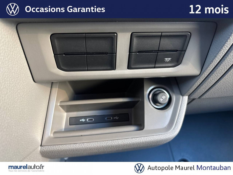 2 télécommandes de déverrouillage des portes avec clé escamotable / 4 jantes en acier 6 1/2 J x 16 avec charge de 1050 kg, en argent / Affichage de la pression et de la température des pneus (mesure directe avec capteur dans chaque roue) / Alternateur triphasé 140 A / App-Connect avec et sans fil / Autoradio "Composition" avec écran tactile couleur "10" 2 interfaces USB-C dans le tableau de bord avec puissance de recharge jusqu'à 45 W, 4 HP: 2 HP d'aigus, 2 HP de graves, Infotainment 10,4", Téléphonie confort, sans raccordement à l'antenne extérieure / Banquette double pour 2 passagers avec grand espace de rangement sous les assises relevables séparément, d'une table au dos de la place du milieu (rabattable) avec porte-gobelet et porte-stylo / Batterie 420 A (70 Ah) / Ceintures de sécurité 3 points automatiques avec réglage hauteur ceinture AV et rétracteurs de ceinture électriques / Climatisation "Climatic" mono zone avec réglage manuel / Cloison de séparation pleine / Combiné d'instruments (km/h), affichages de la vitesse, compteur totalisateur, régime, niveau de carburant et heure / Commande vocale / Digital Cockpit / Eclairage dans le compartiment de charge : 4 spots à LED / Eclairage diurne / Extension de garantie, 3 ans addtionnels ou 150 000 km / Frein de stationnement électronique / Freins à disque AV 16" / Galerie de toit avec 2 emplacements de rangements et lampes de lecture pour chaque siège / Garniture de plancher dans la cabine en caoutchouc / Glaces latérales en verre athermique / Hauteur de toit H3 / Interface Bluetooth pour téléphone portable / Interface mobile confort avec fonction de charge à induction / Marchepied à l'entrée de l'espace de chargement, à AR / Mesures d'insonorisation de l'intérieur Plus / Oeillets d'arrimage pour fixation de la charge / Outillage de bord avec cric / Pack Assistance - Limiteur de vitesse et limiteur de vitesse prédictif - Régulateur de vitesse électronique / Pack Technique - Airbag conducteur et passager AV avec désactivation de l'airbag passager AV - Asisstant maintien de voie «Lane Assist» - Détecteur de fatigue - Fonctionnement intermitent des essuie-glaces avec détecteur de pluie - Limiteur de vitesse - Système d'aide au stationnement AV et AR - Front Assist avec fonction de freinage d'urgence city - Volant multifonction 3 branches - Eclairage de jour avec allumage automatique des projecteurs, fonction leaving home et fonction coming home manuelle / Pack vide-poches 2 Rangements de pavillon au format A4 avec 2 emplacements. 1 DIN et lampe de lecture / Pare-chocs AV dans la couleur de la carrosserie en partie haute / Pare-chocs en gris / Paroi entre la cabine et le compartiment de charge parfaitement verticale / Pneus 205/75 R 16 C 113/111, à résistance au roulement optimisée / Poids Total Admissible 3 500 kg / Poignées d'accès sur les montants AR Poignées dédiées à la porte latérale / Poignées dédiées à la porte latérale / Poignée sur la paroi dans le compartiment de charge / Port de chargement USB-C pour appareils mobiles dans la base du rétroviseur sur le pare-brise / Porte coulissante à droite dans le compartiment charge / Portes AR à vantaux sans baies de fenêtre / Préparation VW Connect et VW Connect Plus sans navigation (3 ans) pour (Composition Media) / Prise 12 V et 4 porte-gobelets dans le tableau de bord / Protection centrale de roue / Protection latérales de la carrosserie contre les petits chocs du quotidien / Rangements de pavillon au-dessus du pare-brise avec 2 emplacements et illumination individuelle pour chaque siège / Réservoir de carburant avec volume de réservoir de 75 l / Rétroviseurs extérieurs électriques gauche et droit avec clignotant intégré, zone grand angle / Roue de secours avec cric et outil de démontage de roue / Sellerie en tissu, dessin "Austin" / Siège suspendu "ErgoComfort" à gauche, dans la 1ère rangée de sièges (réglage de la longueur, de la hauteur et de l'inclinaison de l'assise, du soutien lombaire et accoudoirs des deux côtés) / Système d'aide au maintien de la trajectoire en cas de vent latéral (Side Wind Assist) / Système d'appel d'urgence e-Call / Système de contrôle électronique de la trajectoire (ESP) et système d'antiblocage des freins (ABS) / Système multimédia "Composition Media" avec écran tactile 10'" / Verrouillage centralisé avec radiocommande et commande intérieure / Verrouillage centralisé avec système de démarrage sans clé«Keyless Start» sans verrouillage sécurisé / Vibreur et témoin d'alerte pour ceinture du conducteur et du passager AV non attachée / Vide poche en partie centrale du tableau de bord avec espaces de rangement en partie haute