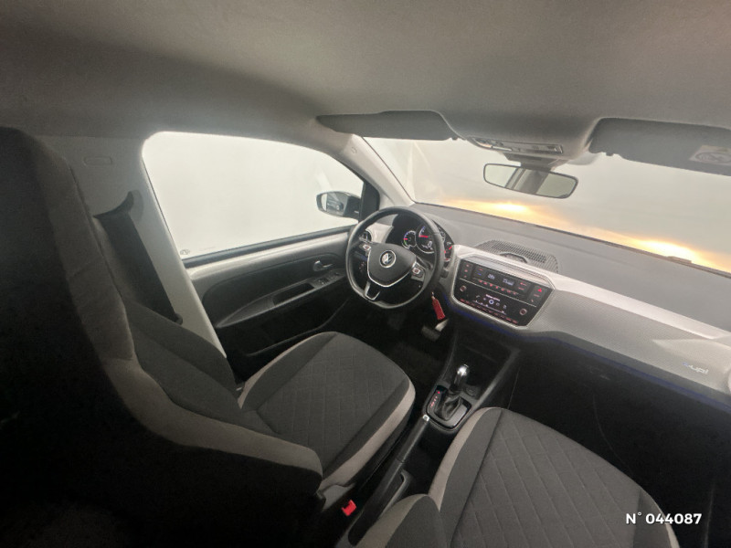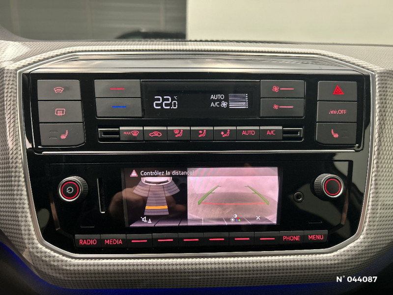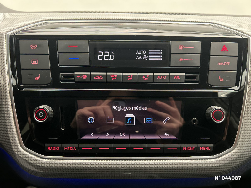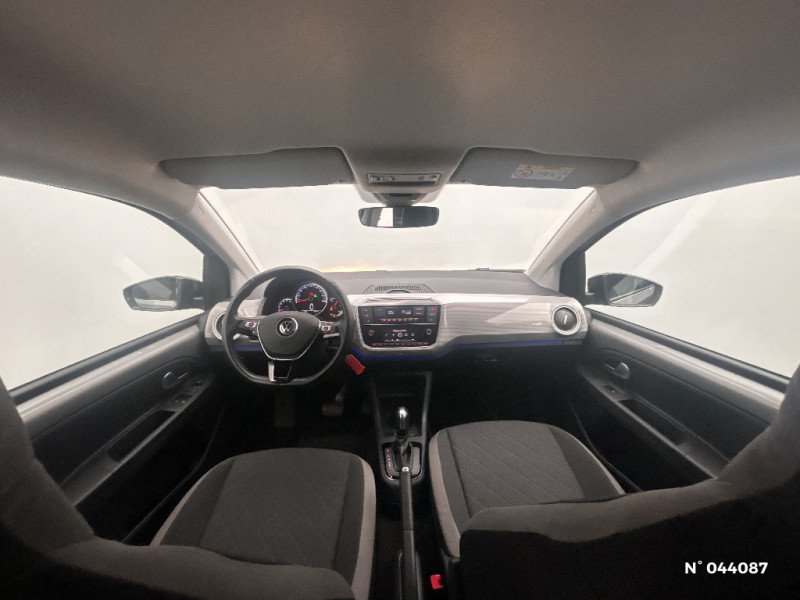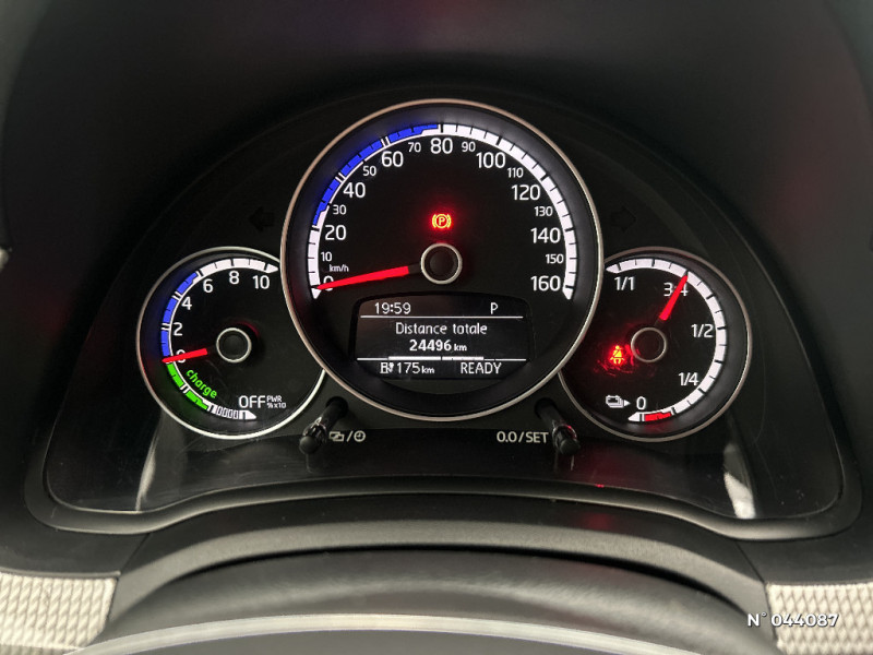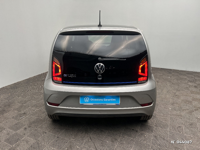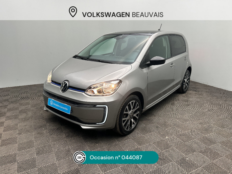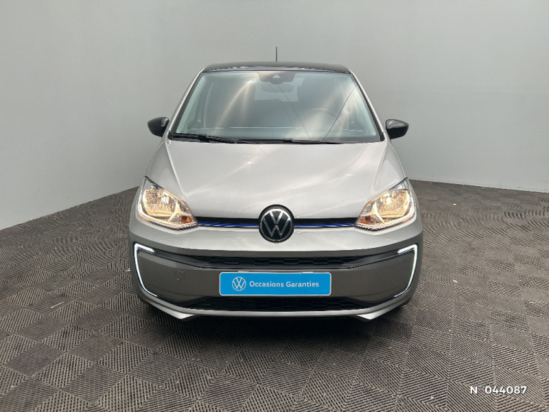 Appuis-tête intégrés dans les dossiers à l' AV / Appus-tête (2) et ceintures de sécuritéà 3 points (2) sur la banquette AR / Avertisseur sonore / Bacs de rangement dans les portes avec porte-boisson pour bouteilles de 1 Litre à l'AV / Baguette AV bleue entre les projecteurs / Banquette 2 places AR monobloc / Boîtiers de rétroviseurs extérieurs et poignées de porte couleur carrosserie / Câble de recharge (32A) pour borne domestique 'wallbox' ou borne publique compatible (7,4kW) (mode 3, type 2) / Câble de recharge (8A) pour prise de courant domestique (1,8 kW) (mode 2, type 2) / Cache-bagages / Dossier de banquette AR asymétrique et rabattable 60/40 / Double Airbag frontal a l'AV - Possibilité de désactiver l'Airbag passager AV / Double airbag latéral et de tête à l'AV et Airbag de tête AR / Double plancher de coffre à bagages, amovible / Eclairage d'ambiance bleu / Volant cuir multifonctions 3 branches réglable en hauteur / 2 accroche-sacs dans le coffre / 4 Jantes Alliage léger "Upsilon" 6Jx16" pneus 185/50 R16 / 6 haut parleurs (4HP à l'AV et 2HP à l'AR) / Eclairage du coffre à bagages / Essuie-glace AV avec commande d' intermitence et lave-glace / Feux de circulation de jour à LED en "C" (inactifs lorsque les feux du véhicule sont activés) / Générateur de son e-sound non désactivable / Kit de dépannage en cas de crevaison (compresseur 12V et produit d'étanchéité de pneu) / Caméra de recul avec visualisation de la zone située à l'AR du véhicule sur l'écran de la radionavigation / Carte de recharge Volkswagen e-Pass avec 1 an d'abonnement et 50 ' de crédit offerts / Clignotants confort (1 impulsion = 3 clignotements) / Clignotants latéraux intégrés dans les rétroviseurs extérieurs / Console centrale avec 1 porte-boissons à l'AV et 1 à l'AR / Correcteur électronique de trajectoire ESP, amplificateur de freinage d'urgence, système d'antiblocage de roues ABS, antipatinage électronique ASR, régulateur électronique de couple MSR et aide au démarrage en côte "Hill Hold" / Direction assistée électromécanique asservie à la vitesse / Disques de frein ventilés à l'AV / Prise de recharge compatible AC (type 2) / DC (CCS : Combined Charging System) / Radio "Composition Phone" avec port USB / Reconnaissance de l'écriture manuscrite / coaching de conduite "Think Blue Trainer" / Rétroviseurs extérieurs asphérique côté conducteur / Sellerie en tissu "Cross" / Oeillets d'arrimage ISOFIX (dispositif pour fixation de 2 sièges-enfants sur la banquette AR) / Outillage de bord / Pack Chrome Intérieur / Pare-brise chauffant / Pare-chocs peint dans la couleur de la carrosserie / Park Pilot, aide au stationnement AR avec signaux d'avertissement acoustiques en cas d'obstacles / Peinture unie / Vitres électriques AV (entrebâillantes AR) / Phares halogènes et feux de jour à LED en 'C' / Plafonnier à temporisation à l'AV avec contacteur de portière / Plancher de coffre à bagages / Poignée de frein à main en cuir / Poignées de porte noires / Poignées intérieures des portes chromées / Pommeau du levier de vitesse cuir / Logo "e-Up !" sur les portes AV et la malle AR / Préparation pour 'e-Remote' - Durée 3 ans / Signal d'avertissement acoustique et optique pour ceinture de sécurité conducteur non attachée AV/AR / Smartphone intégration / Système de récupération de l'énergie en décélération (5 modes de récupétion et 3 profils de conduite "normal/eco/eco+"), pneumatiques à faible résistance au roulement / Tableau de bord gris "Shark skin" / Tapis de sol AV/AR / Toit et boitiers des rétroviseurs peints en Noir Intense / Troisième Feu stop blanc surélevé / Seuils de portes avec logo "e-up!" à l'AV / Affichage multifonctions Plus / Allumage automatique des feux avec fonctions "Coming Home - Leaving Home" / Antenne AR de pavillon / Application Volkswagen "Maps+More"