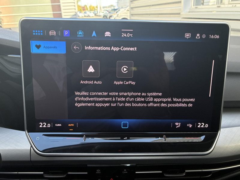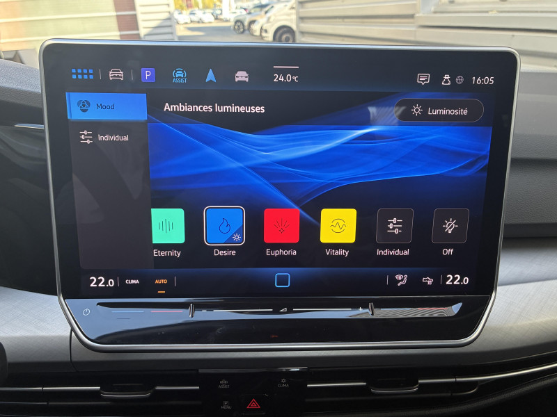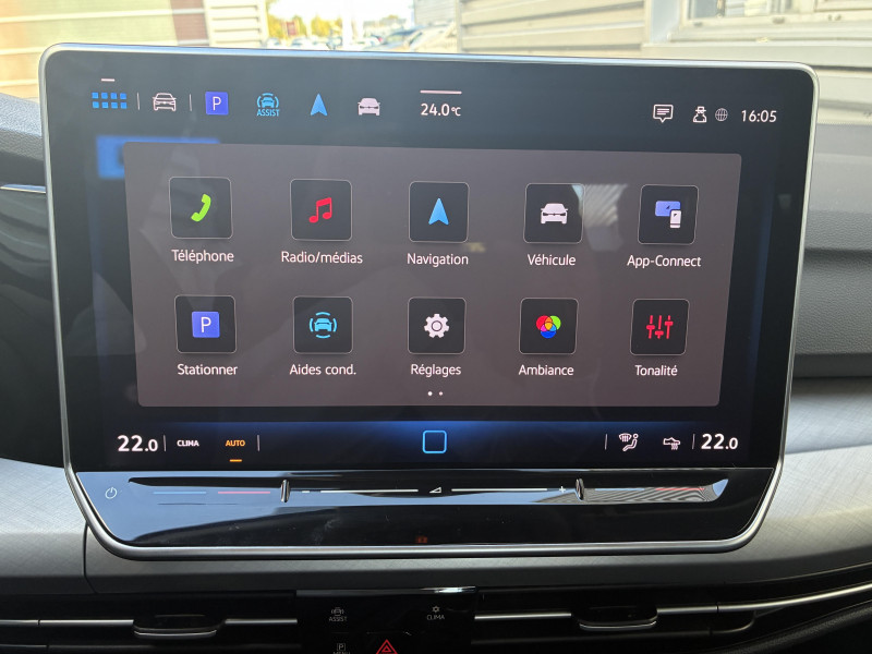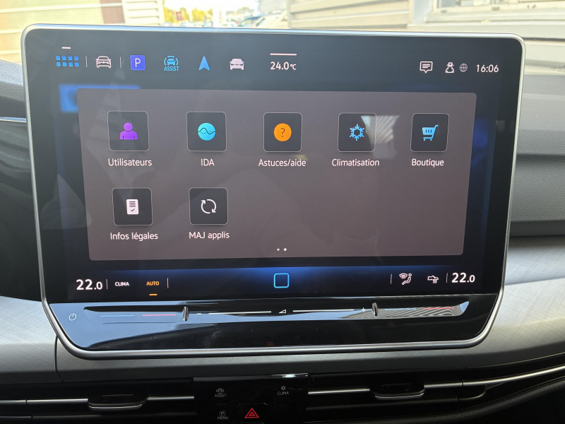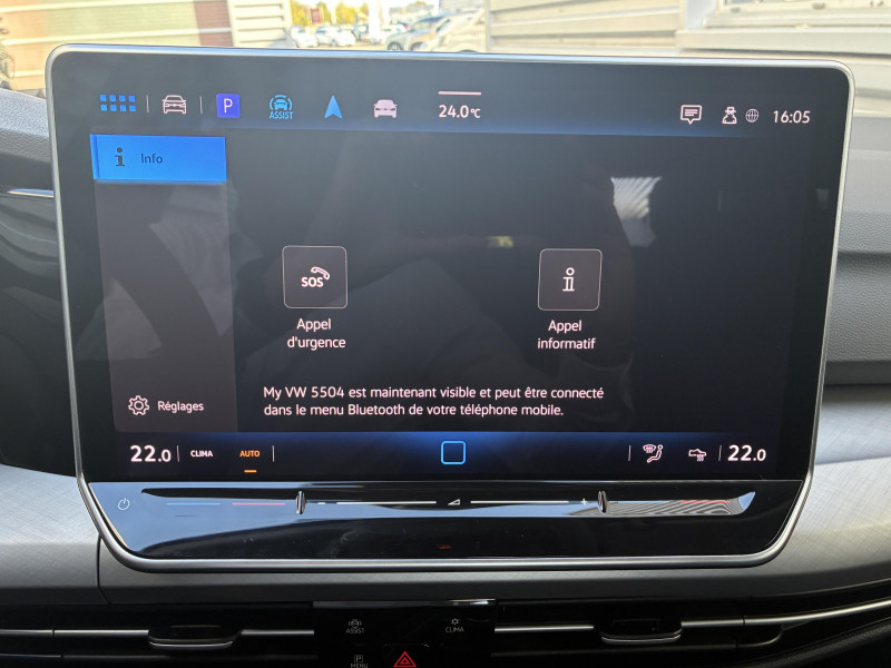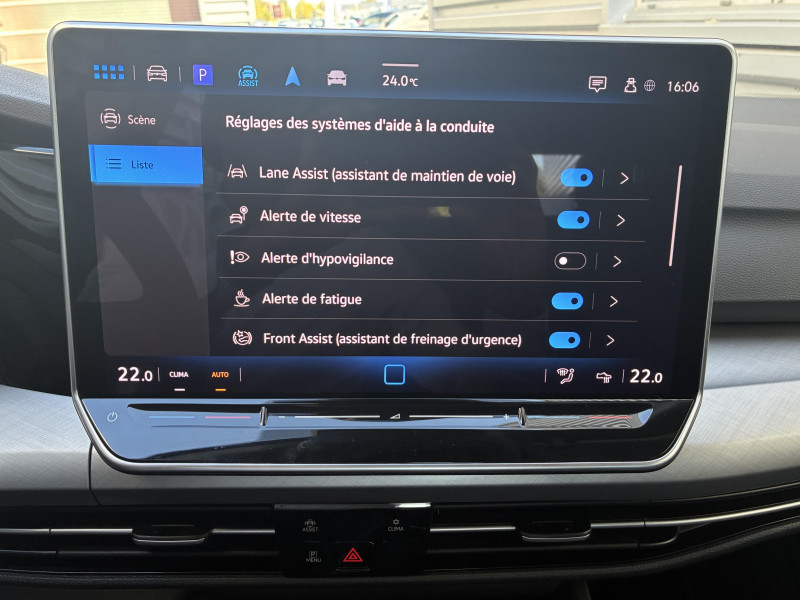 Activation automatique du signal de détresse en cas de freinage d'urgence / Caméra de recul "Rear View" caméra de recul avec visualisation de la zone située AR du véhicule sur l'écran de la radio ou de la radionavigation / Ceintures de sécurité automatiques AV 3 points à enrouleur, réglables en hauteur, avec prétentionneurs / Climatisation "Air Care Climatronic" 3 zones et filtre anti-allergène et éléments de commandes à l'AR / eCall : Appel d'urgence manuel ou automatique / Eclairage à LED de la plaque d'immatriculation AR / Frein de stationnement électromécanique avec fonction d'immobilisation en pente "Auto Hold" et assistant de démarrage en côte / Jantes en alliage 16'' "Norfolk" pneumatiques 205/55 R16 / Park Pilot : Système d'aide au stationnement AV/AR avec signaux sonores et visualisation de la distance des obstacles sur l'écran / Pommeau du levier de vitesse cuir / Projecteurs 100% LED (projecteurs, feux de jour AV, feux AR) / Régulateur de vitesse adaptatif et prédictif ACC avec limiteur de vitesse détecte dans les limites du système et à l'aide d'un capteur radar les véhicules qui précèdent et maintient la distance en intervenant sur les freins et l'accélérateur (régulation active, de 30 à 210 km/h). Le conducteur peut calibrer la distance souhaitée par rapport aux autres automobilistes / Rétroviseur intérieur à réglage jour/nuit automatique / Side Assist (assistance changement de voie et de sortie de stationnement) / Sign Assist: Reconnaissance des panneaux de signalisation et affichage sur le 'Digital Cockpit' et l'écran du système de radionavigation / Système de freinage anti multicollision: ce dispositif freine automatiquement le véhicule après un premier choc afin de limiter le risque de multicollision / Système de Navigation & Infotainment "Discover" avec "Services de streaming et radio via Internet" via carte eSIM intégrée, Radio 7 HP et écran couleur tactile 12,9" avec projection de la cartographie dans l'écran du "Digital Cockpit Pro" / 2 interfaces USB-C à l'AV / 2 prises de chargement USB-C derrière l'accoudoir pour les passagers AR / 2 spots de lecture à l'AV et à l'AR / Accoudoir central AR rabattable avec 2 portes-boissons / Accoudoir central AV réglable en hauteur et en profondeur avec compartiment de rangement / Airbags de tête pour passagers AV/AR / Airbags frontaux AV conducteur et passager (Airbag passager désactivable) / App-Connect sans fil affichage et contrôle via l'écran tactile du véhicule, du contenu, des fonctions et des applications compatibles présents sur le Smartphone (compatibilité avec les systèmes Apple CarPlay et Android Auto) / Application décorative "Nature Cross Brushed" pour tableau de bord et les revêtements de portes / Appuis lombaires réglables à l'AV / Avertisseur sonore et lumineux pour ceintures non attachées AV/AR / Cache-bagages amovible / Cerclage chromé des commandes des vitres, de réglage des rétroviseurs et des aérateurs / Commande vocale (IDA) avec amplificateur de voix électronique / Correcteur électronique de trajectoire ESP, amplificateur de freinage d'urgence, système d'antiblocage de roues ABS, blocage électronique de différentiel EDS, répartiteur électronique EBV, antipatinage électronique ASR, régulateur de couple MSR et assistance au contrebraquage / Câble adaptateur USB-C vers USB-A / Digital Cockpit Pro : combiné d'instruments digital avec écran digital haute résolution de 10,25" / Eclairage d'ambiance 10 couleurs / Eclairage d'ambiance extérieur poignées de portes éclairées et éclairage périmétrique avec projection du logo / Ecrous antivol / Essuie-glace AR intermittent avec lave-glace / Fatigue Détection : système de détection de fatigue du conducteur qui analyse le comportement du conducteur et recommande un temps de repos par l'apparition d'un message visuel et sonore / Feu AR de brouillard d'un côté, feux de recul des deux côtés / Front Assist - Système de surveillance périmétrique avec fonctions de freinage d'urgence en ville et détection des piétons / Indicateur de température extérieure avec avertisseur de gel / Interface téléphone Bluetooth / Lane Assist: Assistant de maintien dans la voie / Mesures de protection des piétons supplémentaires / Miroirs de courtoisie éclairés dans les pare-soleils / Oeillets d'arrimage ISOFIX (dispositif pour fixation de 2 sièges-enfants sur la banquette AR) / Pare-chocs, boîtiers de rétroviseurs extérieurs et poignées de portes dans la couleur carrosserie / Prise 12 V dans le coffre / Préparation pour "VW Connect" et "VW Connect Plus" / Revêtement de porte et latéral en feuille de mousse et tissu / Roue de secours à encombrement réduit avec cric / Réglage du site des phares / Rétroviseurs extérieurs à réglage, rabattement et dégivrage électriques, avec fonction mémoire / Service d'appel d'urgence (inclus 10 ans et disponible indépendamment de l'inscription dans le système d'infotainment) / Système Start/Stop avec dispositif de récupération de l'énergie au freinage / Tapis de sol AV/AR / Verrouillage centralisé avec télécommande à fréquence radio par clé rétractable / XDS : Système agissant comme un différentiel autobloquant électronique permettant une meilleure motricité en courbe grâce à une répartition optimale de la puissance et du couple sur les roues AV