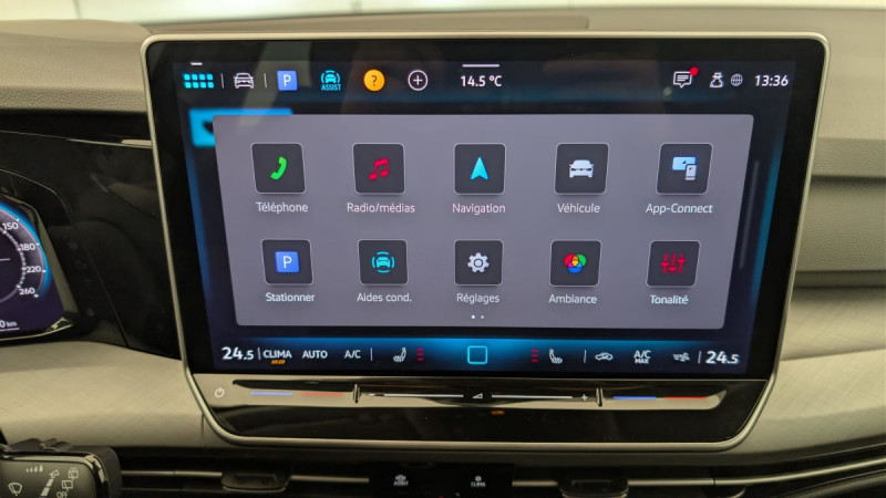 Prise 12 V dans le coffre / Oeillets d'arrimage ISOFIX (dispositif pour fixation de 2 sièges-enfants sur la banquette AR) / Interface téléphone Bluetooth / Lane Assist: Assistant de maintien dans la voie / Frein de stationnement électromécanique avec fonction d'immobilisation en pente "Auto Hold" et assistant de démarrage en côte / Sellerie en tissu "Maze" / Allumage automatique des feux avec fonctions "Coming Home - Leaving Home" / Appuis lombaires réglables à l'AV / Airbags frontaux AV conducteur et passager (Airbag passager désactivable) / Park Pilot : Système d'aide au stationnement AV/AR avec signaux sonores et visualisation de la distance des obstacles sur l'écran / 2 interfaces USB-C à l'AV / Front Assist - Système de surveillance périmétrique avec fonctions de freinage d'urgence en ville et détection des piétons / 2 prises de chargement USB-C derrière l'accoudoir pour les passagers AR / Système Start/Stop avec dispositif de récupération de l'énergie au freinage / Sign Assist: Reconnaissance des panneaux de signalisation et affichage sur le 'Digital Cockpit' et l'écran du système de radionavigation / App-Connect sans fil affichage et contrôle via l'écran tactile du véhicule, du contenu, des fonctions et des applications compatibles présents sur le Smartphone (compatibilité avec les systèmes Apple CarPlay et Android Auto) / Pommeau du levier de vitesse cuir / Eclairage d'ambiance 10 couleurs / Fatigue Détection : système de détection de fatigue du conducteur qui analyse le comportement du conducteur et recommande un temps de repos par l'apparition d'un message visuel et sonore / Système de Navigation & Infotainment "Discover" avec commande vocale (IDA) avec amplificateur de voix électronique / Application décorative "Nature Cross Brushed" pour tableau de bord et les revêtements de portes / Projecteurs 100% LED (projecteurs, feux de jour AV, feux AR) / Régulateur de vitesse adaptatif et prédictif ACC avec limiteur de vitesse détecte dans les limites du système et à l'aide d'un capteur radar les véhicules qui précèdent et maintient la distance en intervenant sur les freins et l'accélérateur (régulation active, de 30 à 210 km/h). Le conducteur peut calibrer la distance souhaitée par rapport aux autres automobilistes / Digital Cockpit Pro : combiné d'instruments digital avec écran digital haute résolution de 10,25" / Jantes en alliage 16'' "Norfolk" pneumatiques 205/55 R16 / Climatisation "Air Care Climatronic" 3 zones et filtre anti-allergène et éléments de commandes à l'AR / Verrouillage centralisé avec télécommande à fréquence radio par clé rétractable / Rétroviseurs extérieurs à réglage, rabattement et dégivrage électriques, avec fonction mémoire /