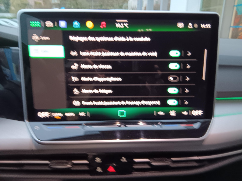 Activation automatique du signal de détresse en cas de freinage d'urgence / Caméra de recul "Rear View" caméra de recul avec visualisation de la zone située AR du véhicule sur l'écran de la radio ou de la radionavigation / Ceintures de sécurité automatiques AV 3 points à enrouleur, réglables en hauteur, avec prétentionneurs / Climatisation "Air Care Climatronic" 3 zones et filtre anti-allergène et éléments de commandes à l'AR / Cross Traffic Alert?: assistant d?intersection qui détecte les véhicules circulant en sens perpendiculaire et vous avertit par un signal visuel et sonore. Il peut déclencher un freinage d?urgence pour atténuer l?impact d?une collision ou même mieux, l?éviter, (Les outils d?aide à la conduite automobile ne dispensent pas le conducteur d?être vigilant.) / eCall : Appel d'urgence manuel ou automatique / Eclairage à LED de la plaque d'immatriculation AR / Frein de stationnement électromécanique avec fonction d'immobilisation en pente "Auto Hold" et assistant de démarrage en côte / Jantes en alliage 16'' "Norfolk" avec pneumatiques 205/55 R16 à résistance au roulement optimisée / Park Pilot : Système d'aide au stationnement AV/AR avec signaux sonores et visualisation de la distance des obstacles sur l'écran / Pommeau du levier de vitesse cuir / Projecteurs 100% LED (projecteurs, feux de jour AV, feux AR) / Régulateur de vitesse adaptatif et prédictif ACC avec limiteur de vitesse détecte dans les limites du système et à l'aide d'un capteur radar les véhicules qui précèdent et maintient la distance en intervenant sur les freins et l'accélérateur (régulation active, de 30 à 210 km/h). Le conducteur peut calibrer la distance souhaitée par rapport aux autres automobilistes / Rétroviseur intérieur à réglage jour/nuit automatique / Sign Assist: Reconnaissance des panneaux de signalisation et affichage sur le 'Digital Cockpit' et l'écran du système de radionavigation / Système de freinage anti multicollision: ce dispositif freine automatiquement le véhicule après un premier choc afin de limiter le risque de multicollision / Système Navigation "Discover" avec "Services de streaming et radio via Internet" via carte eSIM intégrée, Radio 7 HP et écran couleur tactile 12,9" avec projection de la cartographie dans l'écran du "Digital Cockpit Pro" / 2 interfaces USB-C à l'AV / 2 lampes de lecture à l'AV et à l'AR / 2 prises de chargement USB-C derrière l'accoudoir pour les passagers AR / Accoudoir central AR rabattable avec 2 portes-boissons / Accoudoir central AV réglable en hauteur et en profondeur avec compartiment de rangement / Airbags de tête pour passagers AV/AR / Airbags frontaux AV conducteur et passager (Airbag passager désactivable) / App-Connect sans fil affichage et contrôle via l'écran tactile du véhicule, du contenu, des fonctions et des applications compatibles présents sur le Smartphone (compatibilité avec les systèmes Apple CarPlay et Android Auto) / Application décorative "Nature Cross Brushed" pour tableau de bord et les revêtements de portes AV / Appuis lombaires réglables à l'AV / Assistant de changement de voie avec détecteurs d?angle mort 'Side Assist' / Avertisseur sonore et lumineux pour ceintures non attachées AV/AR / Boîte de vitesse manuelle 6 rapports / Cache-bagages amovible / Cerclage chromé des commandes des vitres, de réglage des rétroviseurs et des aérateurs / Commande vocale (IDA) avec amplificateur de voix électronique / Contrôle de la traction (TCS) / Coques de rétroviseurs extérieurs couleur carrosserie / Correcteur électronique de trajectoire ESP, amplificateur de freinage d'urgence, antiblocage des roues ABS, blocage électronique de différentiel EDS, répartiteur électronique de freinage EBV, antipatinage électronique ASR, régulateur électronique de couple MSR et assistance au contrebraquage / Câble adaptateur USB-C vers USB-A / Digital Cockpit Pro : combiné d'instruments digital avec écran digital haute résolution de 10,25" / Eclairage d'ambiance 10 couleurs / Eclairage d'ambiance extérieur poignées de portes éclairées et éclairage périmétrique avec projection du logo / Ecrous antivol / Essuie-glace AR intermittent avec lave-glace / Fatigue Détection : système de détection de fatigue du conducteur qui analyse le comportement du conducteur et recommande un temps de repos par l'apparition d'un message visuel et sonore / Feu AR de brouillard d'un côté, feux de recul des deux côtés / Front Assist - Système de surveillance périmétrique avec fonctions de freinage d'urgence en ville et détection des piétons / Indicateur de température extérieure avec avertisseur de gel / Interface téléphone Bluetooth / Lane Assist: Assistant de maintien dans la voie / Mesures de protection des piétons supplémentaires / Miroirs de courtoisie éclairés dans les pare-soleils / Oeillets d'arrimage ISOFIX (dispositif pour fixation de 2 sièges-enfants sur la banquette AR) / Pare-chocs et poignées de portes dans la couleur carrosserie / Prise 12 V dans le coffre / Préparation pour "VW Connect" et "VW Connect Plus" / Revêtement de porte et latéral en feuille de mousse et tissu / Roue de secours à encombrement réduit avec cric / Réglage du site des phares / Rétroviseurs extérieurs avec fonction mémoire, rabattables/réglables électriquement et dégivrage séparé / Service d'appel d'urgence (inclus 10 ans et disponible indépendamment de l'inscription dans le système d'infotainment) / Système Start/Stop avec dispositif de récupération de l'énergie au freinage / Tapis de sol AV/AR / Verrouillage centralisé avec télécommande à fréquence radio par clé rétractable / XDS : Système agissant comme un différentiel autobloquant électronique permettant une meilleure motricité en courbe grâce à une répartition optimale de la puissance et du couple sur les roues AV