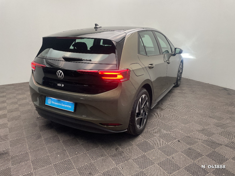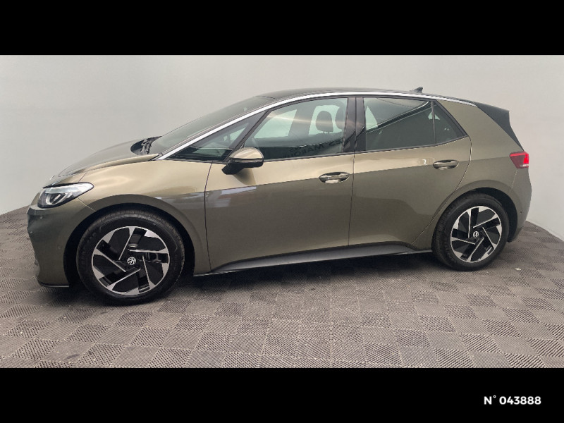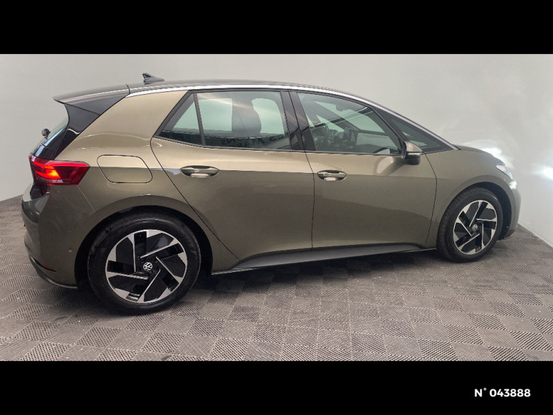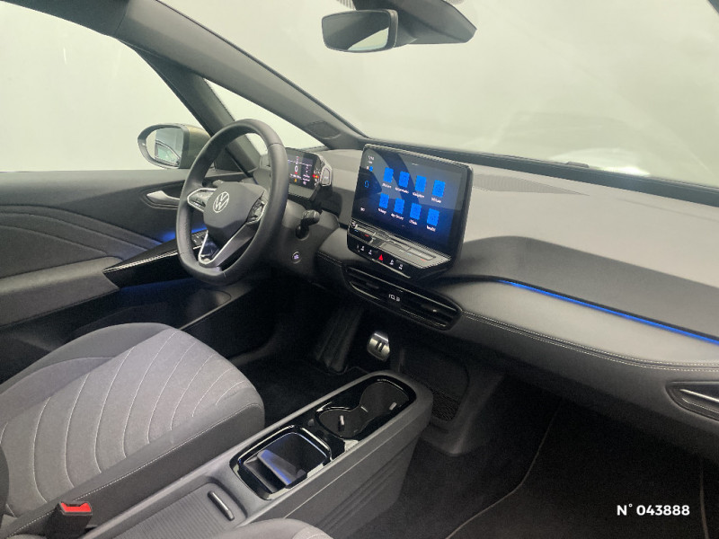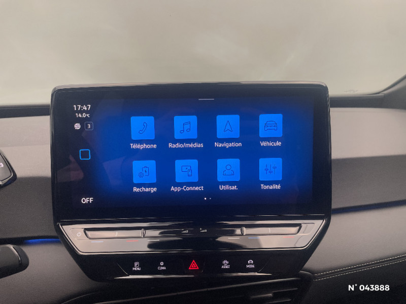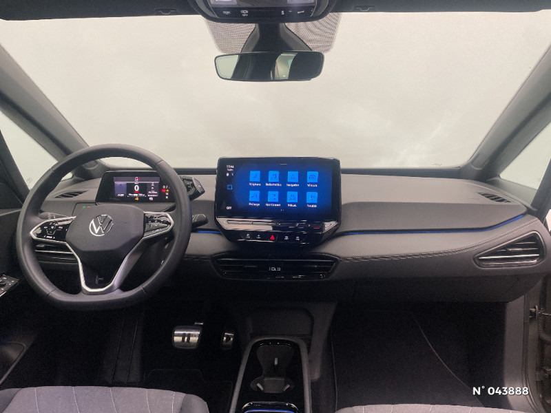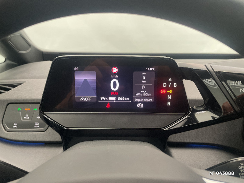 Réglage des phares tactile / Réglages de la charge via le système d'infodivertissement ou l'application "Volkswagen" / Réglages de la charge via le système d'infodivertissement ou l'application We Connect ID / Rétroviseur intérieur à réglage jour/nuit automatique / Rétroviseurs extérieurs réglables, rabattables et dégivrants électriquement avec abaissement du rétroviseur passager / Revêtement du tableau de bord et des portes tissu "Taia" composé de matériaux durables / ID. Display de 5,3'': L'ID. Display est un combiné d'instruments numérique doté d'un afficheur couleur TFT à haute résolution. En plus du tachymètre numérique, il est possible d'afficher des informations supplémentaires provenant des systèmes d'aide à la conduite, par la sélection de divers profils d'information / Indicateur de température extérieure avec avertisseur de gel / Intelligent Park Assist Plus Assistant aux manoeuvres de stationnement comprenant un système d'aide au stationnement AV et AR avec signaux sonores et visualisation de la distance des obstacles sur l'écran / Intelligent Park Assist Système d'aide au stationnement AV et AR / Interface Bluetooth / Interface téléphone Bluetooth / Intérieur Pro Performance Sellerie Tissu Gris Taia, Revêtement du tableau de bord et des portes tissu Taia avec matériaux durables, Pédalier en acier inoxydable avec symboles 'Play & Pause', Banquette arrière 3 places rabattable (2/3 - 1/3) avec trappe à skis, Sièges avant réglables en hauteur / Intervention de freinage automatique lors des manoevres: L'intervention de freinage automatique d'un système de stationnement est utilisée pour réduire le risque de collision si un obstacle est détecté pendant le processus de stationnement / Jantes 18'' "East Derry" bicolore Argent Pneumatiques 215/55 R18 / Sélecteur de vitesse situéà droite derrière le volant avec frein de stationnement électronique Il dispose d'une marche AV (D/B), du neutre (N) et d'une marche AR (R). En position (D), la récupération d'énergie au freinage est en mode normal. En position (B), le système d'aide à l'éco-conduite est activé et la récupération d'énergie est plus élevée / Sign Assist - Système de détection de la signalisation routière Le système de détection de la signalisation routière détecte les panneaux de signalisation standard à l'aide d'une caméra située dans le pied du rétroviseur intérieur et vous informe des limitations de vitesse, interdictions de dépasser et panneaux de danger identifiés / Système d'aide à l'éco-conduite - Eco Assistance / Sellerie Tissu Gris Taia / Services connectés "We Connect ID." 36 mois / Système d'appel d'urgence - eCall Appel d'urgence manuel ou automatique / Système de démarrage sans clé Keyless-Go Démarrage possible avec une simple pression sur la pédale de frein / Système de Freinage anti-multi collision Ce dispositif freine automatiquement le véhicule après un premier choc afin de limiter le risque de multi collision / Système de récupération de l'énergie en décélération / Système de refroidissement liquide / Système de son 4+1 haut-parleurs / Système de son 4+1 HP AV / Système d'infotainment 'Ready to Discover' avec écran 12 pouces personnalisable et ID.Display de 5,3 pouces / Système d'ouverture et de fermeture sans clé dans un périmètre de détection Keyless Access Advanced / Système proactif de protection des occupants - Pre Safe Assist / Tapis de sol AV/AR / Turn Assist : Freinage d'urgence d'intersection - Le freinage d'urgence au braquage peut empêcher votre véhicule d'entrer en collision avec un véhicule arrivant en sens inverse lorsque vous changez de direction / Verrouillage centralisé avec télécommande à fréquence radio / Vitres AV/AR électriques avec dispositif anti-pincement / Volant multifonction à réglage mécanique en hauteur et en longueur / 2 port USB-C à l'AV (recharge et data) et 2 à l'AR (recharge) / 7 Airbags Airbags frontaux AV conducteur et passager (Airbag passager désactivable par clé), Airbags latéraux à l'AV, airbags interactif à l'AV et avec airbags de tête AV/AR, Airbag central situé sur le côté droit du siège conducteur, permet la protection des chocs entre les occupants des sièges AV en cas de collision latérale ou de retournement / Car2X La fonction Car2X utilise les informations des autres véhicules présents dans un périmètre pouvant s'étendre jusqu'à 800 mètres, ainsi que les signaux des infrastructures de transport pour avertir le conducteur et transmettre ces avertissements à d'autres véhicules équipés de la fonction Car2X / Clignotants confort : (1) touche = (3) clignotements / Climatisation stationnaire: permet de réfrigérer, de ventiler ou de chauffer l'habitacle du véhicule à l'arrêt. Elle permet également de dégivrer le pare-brise, de le désembuer et de le débarrasser d'une fine couche de neige en hiver. La climatisation stationnaire est alimentée par la prise de courant ou par la batterie haute tension du véhicule / Climatiseur 1-Zone "Climatronic" avec mode recyclage de l'air ambiant / Commande vocale intuitive / Commande vocale intuitive -"Bonjour ID." - Certaines fonctions peuvent être exécutées grâce à la commande vocale / Console centrale rétro éclairée avec volet occultant et 2 porte-gobelets / Correcteur électronique de trajectoire ESP, amplificateur de freinage d' urgence,système d'antiblocage des roues ABS, blocage électronique de différentiel EDS, antipatinage électronique ASR et régulateur électronique de couple MSR / Correcteur électronique de trajectoire ESP, Amplificateur de freinage d'urgence AFU, Servofrein électromécanique eBKV, Freinage mixte BKU, système d'antiblocage des roues ABS, blocage électronique de différentiel EDS,répartiteur électronique de freinage EBV,anti patinage électronique ASR, régulateur électronique de couple MSR et assistance au contre-braquage, Programme é
