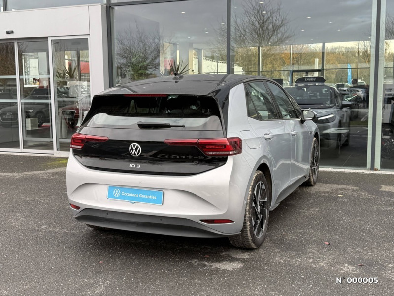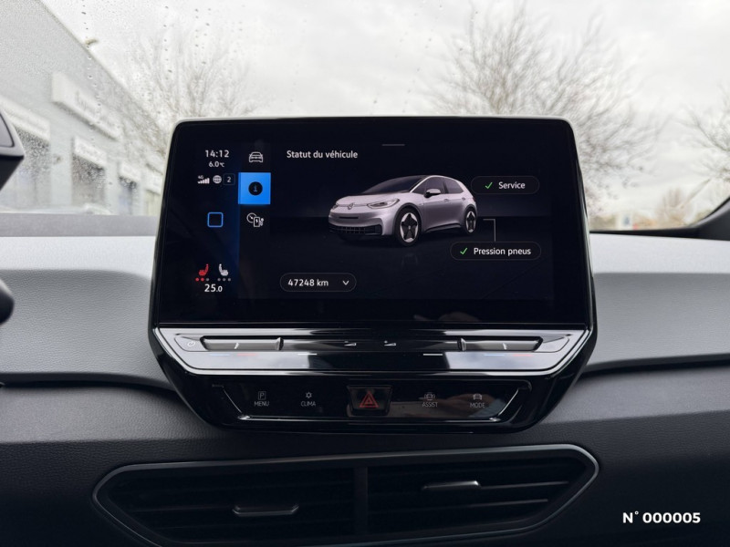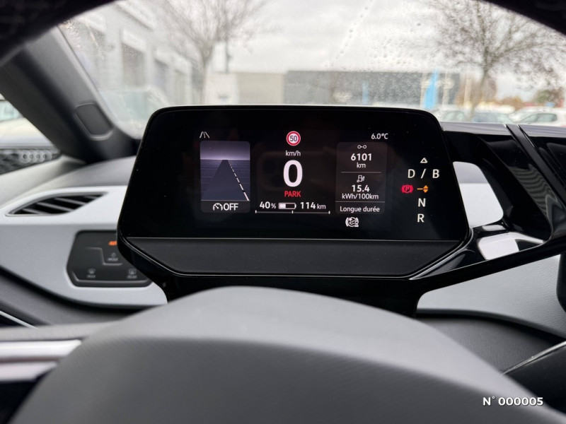 ID.Light: L'ID. Light est un concept d'éclairage intelligent qui vous fournit des informations complémentaires sur l'état du véhicule et sur la situation de conduite / Services connectés "We Connect ID." 36 mois / Galerie porte-bagages / Pack Assistance / Sièges AV réglables manuellement en hauteur, profondeur et inclinables / Pack Infotainment / Système de freinage anti multicollision: ce dispositif freine automatiquement le véhicule après un premier choc afin de limiter le risque de multicollision / Pochette de premiers secours, triangle de sécurité et gilet rétro réfléchissant / Intervention de freinage automatique lors des manoevres: L'intervention de freinage automatique d'un système de stationnement est utilisée pour réduire le risque de collision si un obstacle est détecté pendant le processus de stationnement / Vitres AV/AR électriques avec dispositif anti-pincement / Sign Assist - Système de détection de la signalisation routière Le système de détection de la signalisation routière détecte les panneaux de signalisation standard à l'aide d'une caméra située dans le pied du rétroviseur intérieur et vous informe des limitations de vitesse, interdictions de dépasser et panneaux de danger identifiés / Jantes 18'' "East Derry" bicolore Argent Pneumatiques 215/55 R18 / Volant multifonction à réglage mécanique en hauteur et en longueur / Système d'aide à l'éco-conduite - Eco Assistance / App-Connect sans fil (en fonction du téléphone compatible) pour Apple CarPlay, Android Auto et Mirror Link (avec fil). / Système d'appel d'urgence - eCall Système d'appel de dépannage et Système d'appel informatif / Phares LED et feux AR à LED / Portes AR avec sécurité enfants / Ceintures de sécurité automatiques AV 3 points à enrouleur avec prétensionneurs et AR 3 points à enrouleur / Freins à disque à l'AV / Correcteur électronique de trajectoire ESP, Amplificateur de freinage d'urgence AFU, Servofrein électromécanique eBKV, Freinage mixte BKU, système d'antiblocage des roues ABS, blocage électronique de différentiel EDS, répartiteur électronique de freinage EBV, antipatinage électronique ASR, régulateur électronique de couple MSR, assistance au contrebraquage, Programme électronique de stabilisation ESC,Système agissant comme un différentiel autobloquant électronique permettant une meilleure motricité en courbe grâce à une répartition optimale de la puissance et du couple sur les roues AR XDS / Kit de dépannage : compresseur 12 V et produit d'étanchéité de pneu / Sélecteur de vitesse derrière le volant avec la touche de frein de stationnement électronique / E-sound - son spécifique ID / Verrouillage centralisé avec télécommande à fréquence radio / Pack Infotainment / Réglage des phares tactile / Pare-soleils AV avec miroir de courtoisie éclairé / Climatiseur 1-Zone "Air Care Climatronic" avec mode recyclage de l'air ambiant / Peinture Unie Gris Lunaire/Toit Noir / Climatiseur 1-Zone "Climatronic" / Câble de recharge Mode 2 - Type 2 (8 A) pour prise domestique / Réglages de la charge via le système d'infodivertissement ou l'application We Connect ID / Lane Assist - Assistant au maintien dans la voie avec correction de trajectoire / Câble de recharge Mode 3 - Type 2 pour borne de recharge (32 A) / Système de refroidissement liquide / Turn Assist : Freinage d'urgence d'intersection - Le freinage d'urgence au braquage peut empêcher votre véhicule d'entrer en collision avec un véhicule arrivant en sens inverse lorsque vous changez de direction / ID. Display de 5,3'': L'ID. Display est un combiné d'instruments numérique doté d'un afficheur couleur TFT à haute résolution. En plus du tachymètre numérique, il est possible d'afficher des informations supplémentaires provenant des systèmes d'aide à la conduite, par la sélection de divers profils d'information / Intérieur Style avec habillage et volant Noir et avec sellerie en ArtVelours et similicuir, tableau de bord personnalisable, revêtement du tableau de bord et des portes soft-touch, éclairage d'ambiance personnalisable, pédalier en acier inoxydable avec symboles Play et Pause, banquette AR 3 places rabattable (2/3 - 1/3) avec trappe à skis, sièges AV réglables en hauteur / Direction électromécanique à assistance variable en fonction de la vitesse / Avertisseur sonore 1 ton / Activation automatique du signal de détresse en cas de freinage d'urgence / Avertissement de distance avec le véhicule précédent / Système de son 4+1 haut-parleurs / Dispositif électronique de démarrage sans clé "Keyless-Go": Démarrage possible avec une simple pression sur la pédale de frein / Gestion des paramètres de confidentialité liés à la eSIM et à We Connect / Accoudoir pour les sièges AV / Pack Visibilité / Système d'appel en cas de panne B-Call / Pack Visibilité / Clignotants confort (1 impulsion = 3 clignotements) / Tapis de sol AV/AR / Prise 12 V dans le coffre / Oeillets d'arrimage ISOFIX (dispositif pour fixation de 2 sièges-enfants sur la banquette AR) / Frein de stationnement électromécanique avec fonction d'immobilisation en pente Auto-Hold / Lampes de lecture tactiles avec réglage manuel de l'intensité lumineuse / Appui-tête réglables en hauteur sur les sièges AV et AR / Chargeur embarqué pour prise Type 2 : 11 kW AC / Commande vocale intuitive -"Bonjour ID." - Certaines fonctions peuvent être exécutées grâce à la commande vocale / 2 ports USB-C à l'AV (recharge et data) / Boîte à gants verrouillable et éclairée / Jantes 18'' "East Derry" Argent Pneumatiques 215/55 R18 / Indicateur de température extérieure avec avertisseur de gel / Eclairage à LED de la plaque d'immatriculation AR / Freins à tambours à l' AR / Car2X / Système de récupération d'énergie au freinage et à la décélération / Carrosserie bicolore - Toit et hayon noir / Avertisseur sonore et lumineux pour ceintures non attachées AV/AR / E
