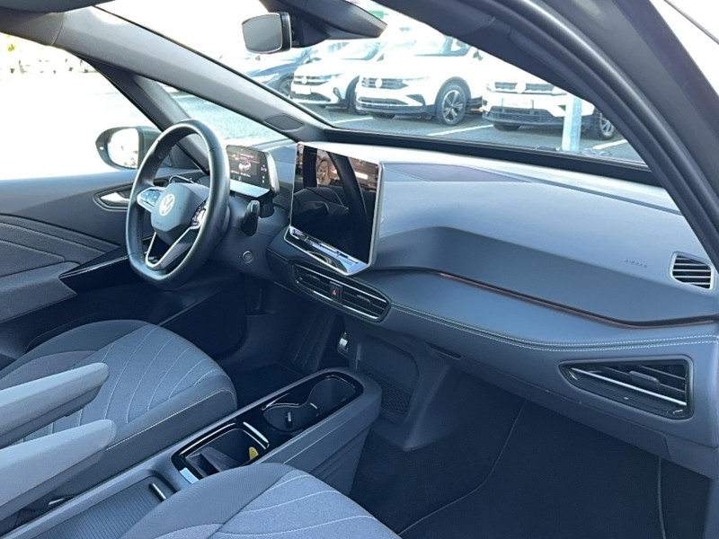 Activation automatique du signal de détresse en cas de freinage d'urgence / Allumage automatique des feux, capteurs de pluie avec essuie-glace automatique / Buses à dégivrage automatique à l'AV / Climatisation stationnaire: permet de réfrigérer, de ventiler ou de chauffer l'habitacle du véhicule à l'arrêt. Elle permet également de dégivrer le pare-brise, de le désembuer et de le débarrasser d'une fine couche de neige en hiver. La climatisation stationnaire est alimentée par la prise de courant ou par la batterie haute tension du véhicule / Eclairage à LED de la plaque d'immatriculation AR / Frein de stationnement électromécanique avec fonction d'immobilisation en pente "Auto Hold" La fonction Auto Hold garantit une immobilisation du véhicule sans déplacement intempestif, la pédale de frein ne devant pour cela pas être maintenue actionnée / ID. Display de 5,3'': L'ID. Display est un combiné d'instruments numérique doté d'un afficheur couleur TFT à haute résolution. En plus du tachymètre numérique, il est possible d'afficher des informations supplémentaires provenant des systèmes d'aide à la conduite, par la sélection de divers profils d'information / Intervention de freinage automatique lors des manoevres: L'intervention de freinage automatique d'un système de stationnement est utilisée pour réduire le risque de collision si un obstacle est détecté pendant le processus de stationnement / Jantes 18'' "East Derry" bicolore Argent Pneumatiques 215/55 R18 / Park Pilot - Aide au stationnement AV et AR / Projecteurs LED et feux AR à LED / Rétroviseur intérieur à réglage jour/nuit automatique / Sign Assist - Système de détection de la signalisation routière Le système de détection de la signalisation routière détecte les panneaux de signalisation standard à l'aide d'une caméra située dans le pied du rétroviseur intérieur et vous informe des limitations de vitesse, interdictions de dépasser et panneaux de danger identifiés / Système d'aide à l'éco-conduite - Eco Assistance / Système d'appel d'urgence - eCall Appel d'urgence manuel ou automatique / Système de Freinage anti-multi collision Ce dispositif freine automatiquement le véhicule après un premier choc afin de limiter le risque de multi collision / Sélecteur de vitesse situéà droite derrière le volant avec frein de stationnement électronique Il dispose d'une marche AV (D/B), du neutre (N) et d'une marche AR (R). En position (D), la récupération d'énergie au freinage est en mode normal. En position (B), le système d'aide à l'éco-conduite est activé et la récupération d'énergie est plus élevée / 2 port USB-C à l'AV (recharge et data) et 2 à l'AR (recharge) / 7 Airbags Airbags frontaux AV conducteur et passager (Airbag passager désactivable par clé), Airbags latéraux à l'AV, airbags interactif à l'AV et avec airbags de tête AV/AR, Airbag central situé sur le côté droit du siège conducteur, permet la protection des chocs entre les occupants des sièges AV en cas de collision latérale ou de retournement / ACC: Régulateur de vitesse adaptatif avec limiteur de vitesse adapte la vitesse en fonction des limitations de vitesse détectées / Accoudoirs pour les sièges AV / App-Connect sans fil (en fonction du téléphone compatible) pour Apple CarPlay, Android Auto et Mirror Link (avec fil). / Avertissement de distance avec le véhicule précédent / Avertisseur sonore 1 ton / Avertisseur sonore et lumineux pour ceintures non attachées AV et AR / Banquette AR 3 places rabattable (2/3 - 1/3) avec trappe à skis / Capacité de batterie nette - 59 kWh / Capacité de puissance de recharge maximale sur prise CCS : 165 kW DC / Capacité de puissance maximale du chargeur embarqué pour prise Type 2 : 11 kW AC / Car2X La fonction Car2X utilise les informations des autres véhicules présents dans un périmètre pouvant s'étendre jusqu'à 800 mètres, ainsi que les signaux des infrastructures de transport pour avertir le conducteur et transmettre ces avertissements à d'autres véhicules équipés de la fonction Car2X / Clignotants confort : (1) touche = (3) clignotements / Commande vocale intuitive -"Bonjour ID." - Certaines fonctions peuvent être exécutées grâce à la commande vocale / Console centrale rétroéclairée avec rangements, volet occultant, 2 porte-gobelets / Correcteur électronique de trajectoire ESP, Amplificateur de freinage d'urgence AFU, Servofrein électromécanique eBKV, Freinage mixte BKU, système d?antiblocage des roues ABS, blocage électronique de différentiel EDS,répartiteur électronique de freinage EBV,anti patinage électronique ASR, régulateur électronique de couple MSR et assistance au contre-braquage, Programme électronique de stabilisation ESC,Système agissant comme un différenti.autobloquant électronique permettant une meilleure motricité en courbe grâce à une répartition optimale de la puissance et du couple sur les roues AR XDS / Câble de recharge Mode 3 - Type 2 pour borne de recharge (32 A) / Direction électromécanique à assistance variable en fonction de la vitesse / Détection de fatigue Système de détection de fatigue du conducteur qui analyse le comportement du conducteur et recommande un temps de repos par l'apparition d'un message visuel et sonore / E-sound - son spécifique ID: L'e-Sound est un bruit électronique de moteur signalant l'approche de véhicules électriques aux autres usagers de la route. Plus le véhicule roule vite, plus le volume sonore de l'e-Sound diminue lentement / Eclairage d'ambiance personnalisable (10 couleurs) / Eclairage des poignées de portes avec éclairage de bienvenue 'Welcome Light' / Ecran central tactile de 12,9'' personnalisable / Freins à disques AV et freins à tambours AR / Front Assist - Système de surveillance périmétrique avec fonctions de freinage d'urgence en ville et détection des piétons / Gestion des paramètres de confidentialité liés à la 