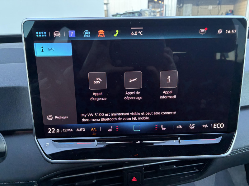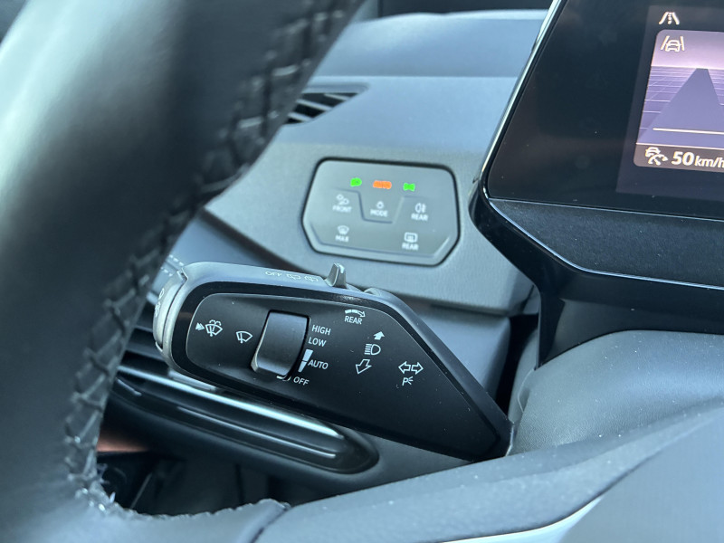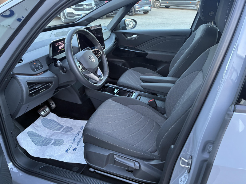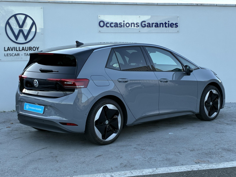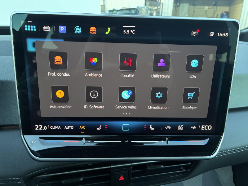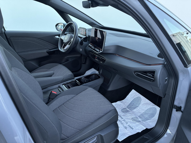Activation automatique du signal de détresse en cas de freinage d'urgence / Allumage automatique des feux, capteurs de pluie avec essuie-glace automatique / Buses à dégivrage automatique à l'AV / Climatisation stationnaire: permet de réfrigérer, de ventiler ou de chauffer l'habitacle du véhicule à l'arrêt. Elle permet également de dégivrer le pare-brise, de le désembuer et de le débarrasser d'une fine couche de neige en hiver. La climatisation stationnaire est alimentée par la prise de courant ou par la batterie haute tension du véhicule / Eclairage à LED de la plaque d'immatriculation AR / Frein de stationnement électromécanique avec fonction d'immobilisation en pente "Auto Hold" La fonction Auto Hold garantit une immobilisation du véhicule sans déplacement intempestif, la pédale de frein ne devant pour cela pas être maintenue actionnée / ID. Display de 5,3'': L'ID. Display est un combiné d'instruments numérique doté d'un afficheur couleur TFT à haute résolution. En plus du tachymètre numérique, il est possible d'afficher des informations supplémentaires provenant des systèmes d'aide à la conduite, par la sélection de divers profils d'information / Intervention de freinage automatique lors des manoevres: L'intervention de freinage automatique d'un système de stationnement est utilisée pour réduire le risque de collision si un obstacle est détecté pendant le processus de stationnement / Jantes en alliage 20" 'Sanya' bicolore Argent Pneumatiques AirStop 215/45 R20 / Park Pilot - Aide au stationnement AV et AR / Projecteurs LED et feux AR à LED / Rétroviseur intérieur à réglage jour/nuit automatique / Sign Assist - Système de détection de la signalisation routière Le système de détection de la signalisation routière détecte les panneaux de signalisation standard à l'aide d'une caméra située dans le pied du rétroviseur intérieur et vous informe des limitations de vitesse, interdictions de dépasser et panneaux de danger identifiés / Système d'aide à l'éco-conduite - Eco Assistance / Système d'appel d'urgence - eCall Appel d'urgence manuel ou automatique / Système de Freinage anti-multi collision Ce dispositif freine automatiquement le véhicule après un premier choc afin de limiter le risque de multi collision / Sélecteur de vitesse situéà droite derrière le volant avec frein de stationnement électronique Il dispose d'une marche AV (D/B), du neutre (N) et d'une marche AR (R). En position (D), la récupération d'énergie au freinage est en mode normal. En position (B), le système d'aide à l'éco-conduite est activé et la récupération d'énergie est plus élevée / 2 port USB-C à l'AV (recharge et data) et 2 à l'AR (recharge) / 7 Airbags Airbags frontaux AV conducteur et passager (Airbag passager désactivable par clé), Airbags latéraux à l'AV, airbags interactif à l'AV et avec airbags de tête AV/AR, Airbag central situé sur le côté droit du siège conducteur, permet la protection des chocs entre les occupants des sièges AV en cas de collision latérale ou de retournement / ACC: Régulateur de vitesse adaptatif avec limiteur de vitesse adapte la vitesse en fonction des limitations de vitesse détectées / Accoudoirs pour les sièges AV / App-Connect sans fil (en fonction du téléphone compatible) pour Apple CarPlay, Android Auto et Mirror Link (avec fil). / Avertissement de distance avec le véhicule précédent / Avertisseur sonore 1 ton / Avertisseur sonore et lumineux pour ceintures non attachées AV et AR / Banquette AR 3 places rabattable (2/3 - 1/3) avec trappe à skis / Capacité de batterie nette - 77 kWh / Capacité de puissance de recharge maximale sur prise CCS : 175 kW DC / Capacité de puissance maximale du chargeur embarqué pour prise Type 2 : 11 kW AC / Car2X La fonction Car2X utilise les informations des autres véhicules présents dans un périmètre pouvant s'étendre jusqu'à 800 mètres, ainsi que les signaux des infrastructures de transport pour avertir le conducteur et transmettre ces avertissements à d'autres véhicules équipés de la fonction Car2X / Clignotants confort : (1) touche = (3) clignotements / Commande vocale intuitive -"Bonjour ID." - Certaines fonctions peuvent être exécutées grâce à la commande vocale / Console centrale rétroéclairée avec rangements, volet occultant, 2 porte-gobelets / Correcteur électronique de trajectoire ESP, Amplificateur de freinage d'urgence AFU, Servofrein électromécanique eBKV, Freinage mixte BKU, système d?antiblocage des roues ABS, blocage électronique de différentiel EDS,répartiteur électronique de freinage EBV,anti patinage électronique ASR, régulateur électronique de couple MSR et assistance au contre-braquage, Programme électronique de stabilisation ESC,Système agissant comme un différenti.autobloquant électronique permettant une meilleure motricité en courbe grâce à une répartition optimale de la puissance et du couple sur les roues AR XDS / Câble de recharge Mode 3 - Type 2 pour borne de recharge (32 A) / Direction électromécanique à assistance variable en fonction de la vitesse / Détection de fatigue Système de détection de fatigue du conducteur qui analyse le comportement du conducteur et recommande un temps de repos par l'apparition d'un message visuel et sonore / E-sound - son spécifique ID: L'e-Sound est un bruit électronique de moteur signalant l'approche de véhicules électriques aux autres usagers de la route. Plus le véhicule roule vite, plus le volume sonore de l'e-Sound diminue lentement / Eclairage d'ambiance personnalisable (10 couleurs) / Eclairage des poignées de portes avec éclairage de bienvenue 'Welcome Light' / Ecran central tactile de 12,9'' personnalisable / Freins à disques AV et freins à tambours AR / Front Assist - Système de surveillance périmétrique avec fonctions de freinage d'urgence en ville et détection des piétons / Gestion des paramètres de confidentialité