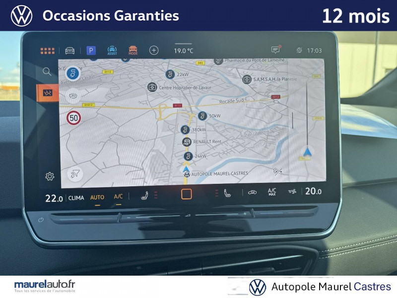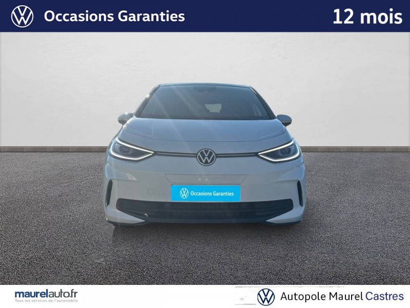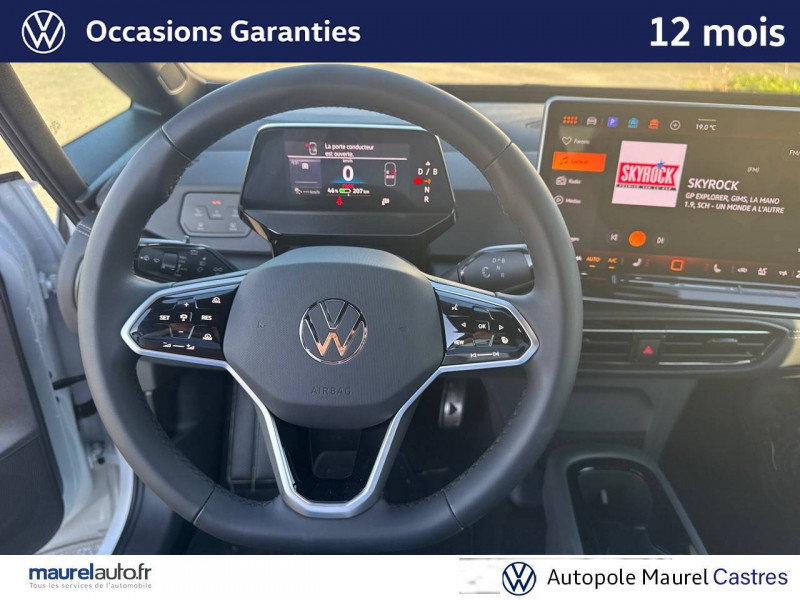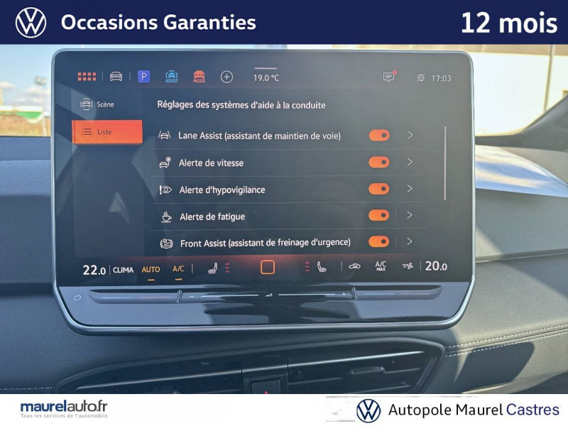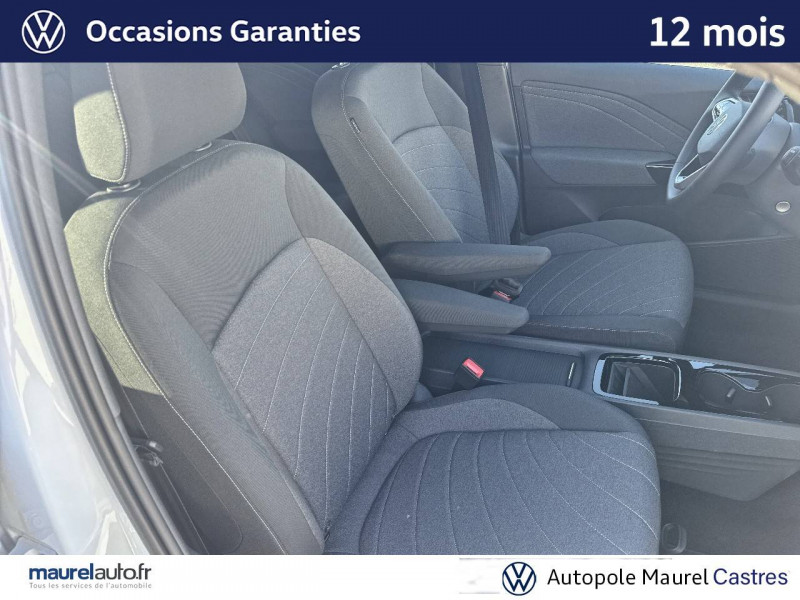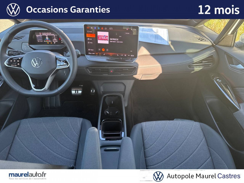 Activation automatique du signal de détresse en cas de freinage d'urgence / Allumage automatique des feux, capteurs de pluie avec essuie-glace automatique / Buses à dégivrage automatique à l'AV / Climatisation stationnaire permet de réfrigérer, de ventiler ou de chauffer l'habitacle du véhicule à l'arrêt. Elle permet également de dégivrer le pare-brise, de le désembuer et de le débarrasser d'une fine couche de neige en hiver. La climatisation stationnaire est alimentée par la prise de courant ou par la batterie haute tension du véhicule / Eclairage à LED de la plaque d'immatriculation AR / Frein de stationnement électromécanique avec fonction d'immobilisation en pente "Auto Hold" La fonction Auto Hold garantit une immobilisation du véhicule sans déplacement intempestif, la pédale de frein ne devant pour cela pas être maintenue actionnée / ID. Display de 5,3'' L'ID. Display est un combiné d'instruments numérique doté d'un afficheur couleur TFT à haute résolution. En plus du tachymètre numérique, il est possible d'afficher des informations supplémentaires provenant des systèmes d'aide à la conduite, par la sélection de divers profils d'information / Intervention de freinage automatique lors des manoevres / Jantes 18'' "East Derry" bicolore Argent Pneumatiques 215/55 R18 / Pack Assistance Système d'ouverture et de fermeture sans cléà distance 'Keyless Access Advanced', Caméra de recul 'Rear View' située dans le logo Volkswagen, Intelligent Park Assist Plus : Système d'aide au stationnement AV et AR, Système proactif de protection des occupants - Pre Safe Assist, Alarme antivol - Protection volumétrique et anti-soulèvement, Éclairage des poignées de portes / Pack confort - Volant multifonction, chauffant, avec commande tactile et capacitif - Climatiseur 2-Zones 'Air Care Climatronic' avec filtre à charbon actif - Sièges AV chauffants - Système de navigation & infotainment Discover Pro avec Services de streaming et radio via Internet, fonction planificateur d'itinéraire - Interface téléphonique "Confort" avec fonction de chargement inductive / Pack Extérieur Projecteurs IQ. Light Matrix LED avec commutation automatique des feux de route, éclairage de mauvais temps et fonction de bienvenue, Régulation dynamique des feux de route "Dynamic Light Assist, Bande lumineuse entre les projecteurs et le logo, Feux AR à LED avec clignotants séquentiels, Vitres AR sur-teintées / Park Pilot - Aide au stationnement AV et AR / Projecteurs LED et feux AR à LED / Rétroviseur intérieur à réglage jour/nuit automatique / Système d'aide à l'éco-conduite - Eco Assistance / Système d'appel d'urgence - eCall Appel d'urgence manuel ou automatique / Système de Freinage anti-multi collision Ce dispositif freine automatiquement le véhicule après un premier choc afin de limiter le risque de multicollision / Sélecteur de vitesse situéà droite derrière le volant avec frein de stationnement électronique Il dispose d'une marche AV (D/B), du neutre (N) et d'une marche AR (R). En position (D), la récupération d'énergie au freinage est en mode normal. En position (B), le système d'aide à l'éco-conduite est activé et la récupération d'énergie est plus élevée / 2 port USB-C à l'AV (recharge et data) et 2 à l'AR (recharge) / 7 Airbags Airbags frontaux AV conducteur et passager (Airbag passager désactivable par clé), Airbags latéraux à l'AV, airbags interactif à l'AV et avec airbags de tête AV/AR, Airbag central situé sur le côté droit du siège conducteur, permet la protection des chocs entre les occupants des sièges AV en cas de collision latérale ou de retournement / ACC: Régulateur de vitesse adaptatif avec limiteur de vitesse adapte la vitesse en fonction des limitations de vitesse détectées / Accoudoirs pour les sièges AV / App-Connect sans fil (en fonction du téléphone compatible) pour Apple CarPlay, Android Auto et Mirror Link (avec fil) / Avertissement de distance avec le véhicule précédent / Avertisseur sonore 1 ton / Avertisseur sonore et lumineux pour ceintures non attachées AV et AR / Banquette AR 3 places rabattable (2/3 - 1/3) avec trappe à skis / Capacité de batterie nette - 59 kWh / Capacité de puissance de recharge maximale sur prise CCS : 165 kW DC / Capacité de puissance maximale du chargeur embarqué pour prise Type 2 : 11 kW AC / Car2X La fonction Car2X utilise les informations des autres véhicules présents dans un périmètre pouvant s'étendre jusqu'à 800 mètres, ainsi que les signaux des infrastructures de transport pour avertir le conducteur et transmettre ces avertissements à d'autres véhicules équipés de la fonction Car2X / Carrosserie bicolore - Toit et hayon noir / Clignotants confort : (1) touche = (3) clignotements / Commande vocale intuitive -"Bonjour ID." - Certaines fonctions peuvent être exécutées grâce à la commande vocale / Console centrale rétroéclairée avec rangements, volet occultant, 2 porte-gobelets / Correcteur électronique de trajectoire ESP, Amplificateur de freinage d'urgence AFU, Servofrein électromécanique eBKV, Freinage mixte BKU, système d'antiblocage des roues ABS, blocage électronique de différentiel EDS,répartiteur électronique de freinage EBV,anti patinage électronique ASR, régulateur électronique de couple MSR et assistance au contre-braquage, Programme électronique de stabilisation ESC,Système agissant comme un différenti.autobloquant électronique permettant une meilleure motricité en courbe grâce à une répartition optimale de la puissance et du couple sur les roues AR XDS / Câble de recharge Mode 3 - Type 2 pour borne de recharge (32 A) / Direction électromécanique à assistance variable en fonction de la vitesse / Détection de fatigue Système de détection de fatigue du conducteur qui analyse le comportement du conducteur et recommande un temps de repos par l'apparition d'un message visuel et sonore / E-sound - son spécifi
