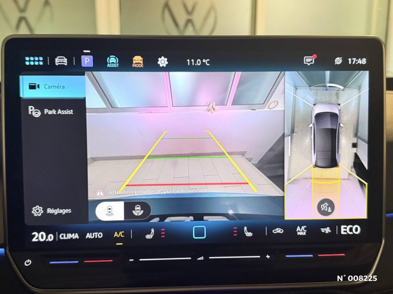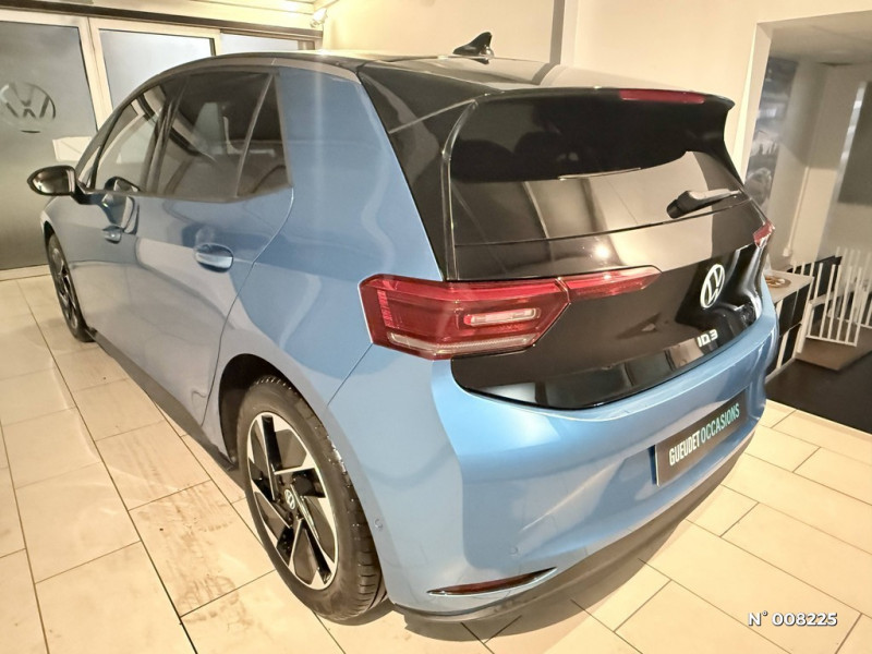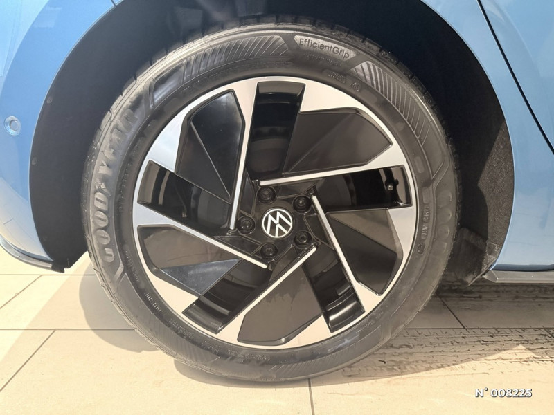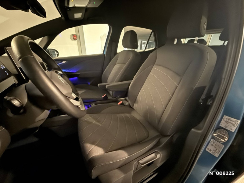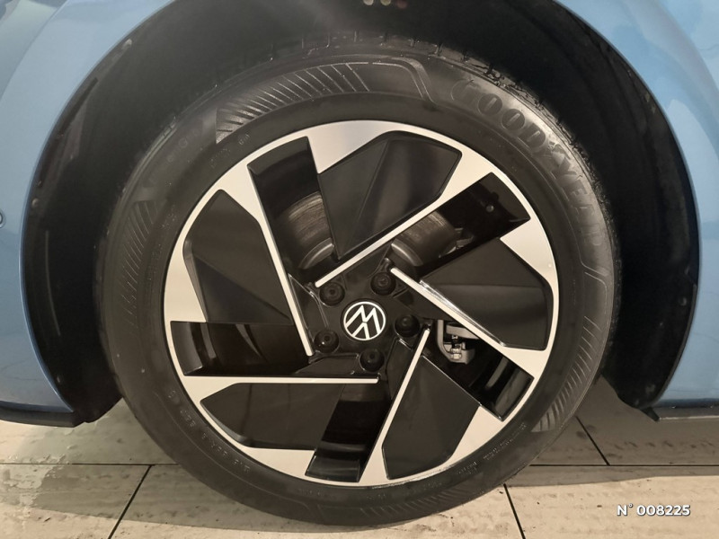 Système de récupération de l'énergie en décélération / Système de refroidissement liquide / Volant multifonction à réglage mécanique en hauteur et en longueur / Vitres AV/AR électriques avec dispositif anti-pincement / Alarme antivol - Protection volumétrique et anti-soulévement / Verrouillage centralisé avec télécommande à fréquence radio / Feux AR à LED 3D avec clignotants séquentiels / Bande lumineuse entre les projecteurs et le logo, éclairage des poignées de porte avec éclairage de bienvenue 'Welcome Light' / Climatiseur 2-Zones "Air Care Climatronic" avec filtre à charbon actif / Régulation dynamique des feux de route "Dynamic Light Assist" / Projecteurs IQ.Light - Matrix LED avec commutation automatique des feux de route, éclairage de mauvais temps et fonction de bienvenue / Interface téléphonique "Comfort" avec fonction de chargement par induction / Kit de dépannage : compresseur 12 V et produit d'étanchéité de pneu / Park Pilot - Aide au stationnement AV et AR / Pédalier en acier inoxydable avec symboles "Play & Pause" / Oeillets d'arrimage ISOFIX (dispositif pour fixation de 2 sièges-enfants sur la banquette AR) / Peinture métallisée/Toit Noir/Hayon Noir / Portes AR avec sécurité / Préparation pour services connectés "VW Connect" activables via la boutique en ligne du véhicule ou via l'espace MyVolkswagen / Préchauffage de la batterie manuel (via infotainment) inclus Réglages de la charge via le système d'infodivertissement ou l'application Volkswagen / Projecteurs LED et feux AR à LED / Prise 12 V dans le coffre / Régulation des feux de route "Light Assist" / Réglage des phares tactile / Rétroviseur intérieur à réglage jour/nuit automatique / Sélecteur de vitesse situéà droite derrière le volant avec frein de stationnement électronique Il dispose d'une marche AV (D/B), du neutre (N) et d'une marche AR (R). En position (D), la récupération d'énergie au freinage est en mode normal. En position (B), le système d'aide à l'éco-conduite est activé et la récupération d'énergie est plus élevée / Sign Assist - Système de détection de la signalisation routière Le système de détection de la signalisation routière détecte les panneaux de signalisation standard à l'aide d'une caméra située dans le pied du rétroviseur intérieur et vous informe des limitations de vitesse, interdictions de dépasser et panneaux de danger identifiés / Rétroviseurs extérieurs réglables, rabattables et dégivrants électriquement avec abaissement du rétroviseur passager / Sellerie Tissu Gris Taia / Système d'appel d'urgence - eCall Appel d'urgence manuel ou automatique / Système d'aide à l'éco-conduite - Eco Assistance / Revêtement du tableau de bord et des portes tissu "Taia" composé de matériaux durables / Système de démarrage sans clé Keyless-Go Démarrage possible avec une simple pression sur la pédale de frein / Système de Freinage anti-multi collision Ce dispositif freine automatiquement le véhicule après un premier choc afin de limiter le risque de multi collision / Turn Assist : Freinage d'urgence d'intersection - Le freinage d'urgence au braquage peut empêcher votre véhicule d'entrer en collision avec un véhicule arrivant en sens inverse lorsque vous changez de direction / Tapis de sol AV et AR / Système proactif de protection des occupants - "Pre Safe Assist" / Volant multifonction chauffant, avec commande tactile et capacitif / Climatisation stationnaire: permet de réfrigérer, de ventiler ou de chauffer l'habitacle du véhicule à l'arrêt. Elle permet également de dégivrer le pare-brise, de le désembuer et de le débarrasser d'une fine couche de neige en hiver. La climatisation stationnaire est alimentée par la prise de courant ou par la batterie haute tension du véhicule / Commande vocale intuitive -"Bonjour ID." - Certaines fonctions peuvent être exécutées grâce à la commande vocale / Console centrale rétroéclairée avec rangements, volet occultant, 2 porte-gobelets / Clignotants confort : (1) touche = (3) clignotements / Correcteur électronique de trajectoire ESP, Amplificateur de freinage d'urgence AFU, Servofrein électromécanique eBKV, Freinage mixte BKU, système d'antiblocage des roues ABS, blocage électronique de différentiel EDS,répartiteur électronique de freinage EBV,anti patinage électronique ASR, régulateur électronique de couple MSR et assistance au contre-braquage, Programme électronique de stabilisation ESC,Système agissant comme un différenti.autobloquant électronique permettant une meilleure motricité en courbe grâce à une répartition optimale de la puissance et du couple sur les roues AR XDS / Eclairage à LED de la plaque d'immatriculation AR / Direction électromécanique à assistance variable en fonction de la vitesse / Détection de fatigue Système de détection de fatigue du conducteur qui analyse le comportement du conducteur et recommande un temps de repos par l'apparition d'un message visuel et sonore / Eclairage d'ambiance personnalisable (10 couleurs) / E-sound - son spécifique ID: L'e-Sound est un bruit électronique de moteur signalant l'approche de véhicules électriques aux autres usagers de la route. Plus le véhicule roule vite, plus le volume sonore de l'e-Sound diminue lentement / Ecran central tactile de 12,9'' personnalisable / Eclairage des poignées de portes avec éclairage de bienvenue 'Welcome Light' / Freins à disques AV et freins à tambours AR / Frein de stationnement électromécanique avec fonction d'immobilisation en pente "Auto Hold" La fonction Auto Hold garantit une immobilisation du véhicule sans déplacement intempestif, la pédale de frein ne devant pour cela pas être maintenue actionnée / Gestion des paramètres de confidentialité liés à la eSIM et à VW Connect / Front Assist - Système de surveillance périmétrique avec fonctions de freinage d'urgence en ville et détection des piétons / Jantes e