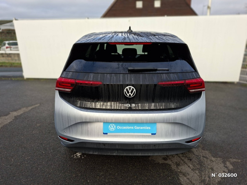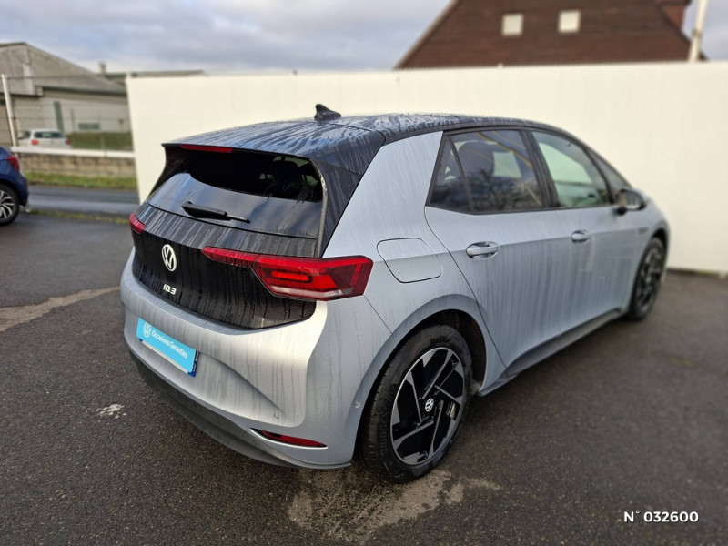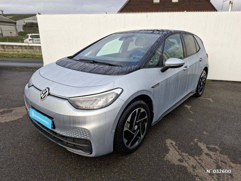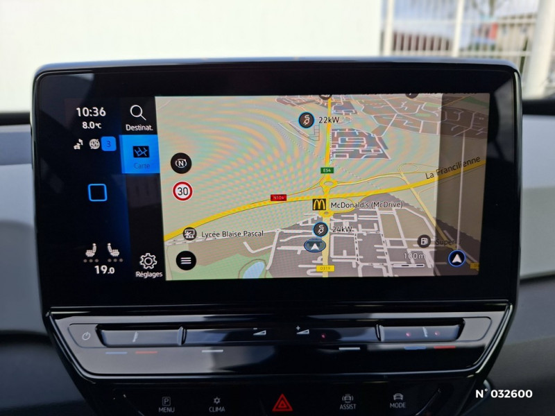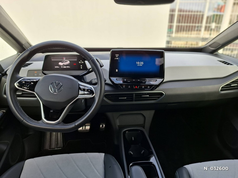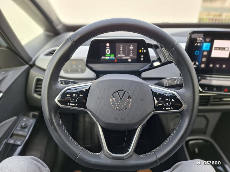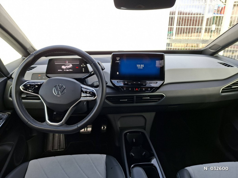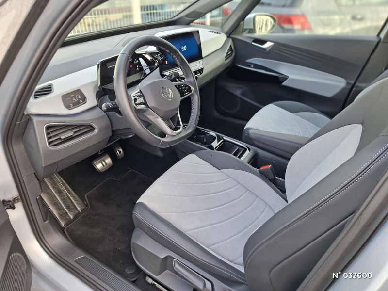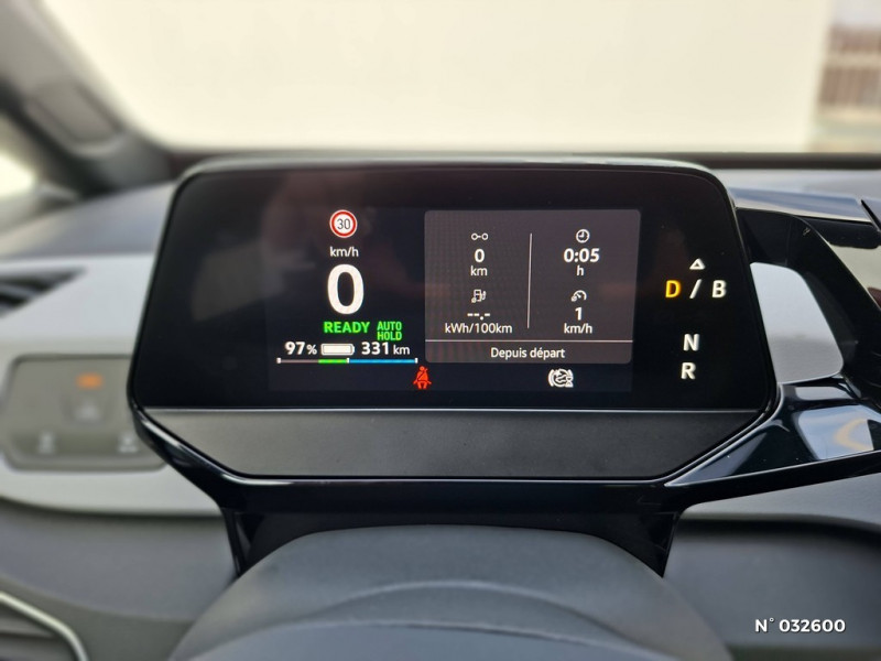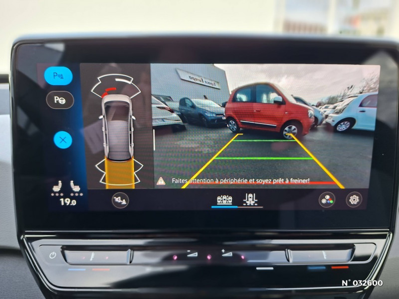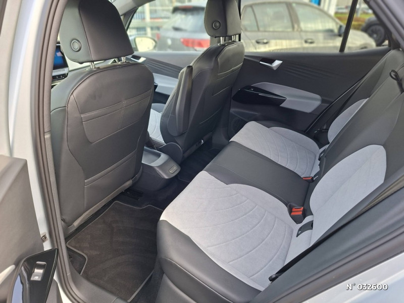 Volant multifonction à réglage mécanique en hauteur et en longueur / Vitres AV/AR électriques avec dispositif anti-pincement / Turn Assist : Freinage d'urgence d'intersection / Volant multifonction, chauffant et capacitif / Tapis de sol AV/AR / Sélecteur de vitesse derrière le volant avec la touche de frein de stationnement électronique / Système d'ouverture et de fermeture sans cléà discance Keyless Access Advanced / Sièges AV réglables manuellement en profondeur et inclinables / Sign Assist - Système de détection de la signalisation routière / Système proactif de protection des occupants - Pre Safe Assist / Système de freinage anti multicollision : ce dispositif freine automatiquement le véhicule après un premier choc afin de limiter le risque de multicollision / Réception de radio numérique DAB+ (Digital Audio Broadcasting) / Système d'appel en cas de panne B-Call / Rétroviseurs extérieurs réglables, rabattables et degivrants électriquement avec abaissement du rétroviseur extérieur passager / Système de son 4+1 HP AV / Système de Navigation & Infotainment Discover Pro avec écran central tactile de 10'' personnalisable / Projecteurs LED et feux AR à LED / Oeillets d'arrimage ISOFIX (dispositif pour fixation de 2 sièges-enfants sur la banquette AR) / Pare-soleils AV avec miroir de courtoisie éclairé / Lane Assist: Assistant de maintien dans la voie / Pédalier en acier inoxydable avec symboles "Play & Pause" / Kit de dépannage : compresseur 12 V et produit d'étanchéité de pneu (uniquement pour les pneumatiques non Airstop) / Peinture unie Gris Lunaire/Toit noir / Portes AR avec sécurité enfants / Park Pilot: Système d'aide au stationnement AV/AR avec signaux sonores et visualisation de la distance des obstacles sur l'écran / Rear View : Caméra de recul située dans le logo Volkswagen / Câble de recharge domestique 8 A / Capacité de puissance maximale du chargeur embarqué pour prise Type 2 : 7,2 kW AC / Capacité de puissance de recharge maximale sur prise CCS : 165 kW DC / Avertisseur sonore et lumineux pour ceintures non attachées à l'AV et à l'AR / Banquette AR 2/3 1/3 avec accoudoir central et trappe à skis (3 personnes) / Boîte à gants verrouillable et éclairée / Buses à dégivrage automatique à l'AV / Appui-tête réglables en hauteur sur les sièges AV et AR / Avertissement de distance avec le véhicule précédent / Avertisseur sonore 1 ton / Activation automatique du signal de détresse en cas de freinage d'urgence / Alarme antivol - Protection volumétrique et anti-soulévement / App-Connect sans fil / 2 ports USB-C à l'AV (data et recharge) et 2 ports USB-C à l'AR (recharge uniquement) / 7 Airbags Airbags frontaux AV conducteur et passager (Airbag passager désactivable par clé), Airbags latéraux à l'AV, airbags interactif à l'AV et avec airbags de tête AV/AR, Airbag central situé sur le côté droit du siège conducteur, permet la protection des chocs entre les occupants des sièges AV en cas de collision latérale ou de retournement / Accoudoirs pour les sièges AV / ACC : Régulateur de vitesse adaptatif et prédictif (avec limiteur de vitesse) / Lampes de lecture tactiles avec réglage manuel de l'intensité lumineuse / ID.Light / Prise 12 V dans le coffre / Intervention de freinage automatique lors des manoevres / Indicateur de température extérieure avec avertisseur de gel / Jantes en alliage 18'' "East Derry" et pneumatiques 215/55 R18 avec écrous antivol / Intelligent Park Assist Système d'aide au stationnement AV et AR / Interface téléphonique Bluetooth Confort avec fonction de recharge par induction avec Services de streaming et radio via Internet / ID. Display de 5,3" / Gestion des paramètres de confidentialité liés à la eSIM et à We Connect / E-sound - son spécifique ID / Extension de garantie 1 an / max 30 000 km / Front Assist - Système de surveillance périmétrique avec fonctions de freinage d'urgence en ville et détection des piétons / Galerie porte-bagages / Eclairage de bienvenue (Welcome Light) / Eclairage des poignées de portes / Freins à disque à l'AV / Freins à tambour à l' AR / Frein de stationnement électromécanique avec fonction d'immobilisation en pente Auto-Hold / Direction électromécanique à assistance variable en fonction de la vitesse / Eclairage à LED de la plaque d'immatriculation AR / Eclairage d'ambiance personnalisable (30 couleurs) / Détection de fatigue / Console centrale rétro éclairée avec volet occultant et 2 porte-gobelets / Correcteur électronique de trajectoire ESP, Amplificateur de freinage d'urgence AFU, Servofrein électromécanique eBKV, Freinage mixte BKU, système d'antiblocage des roues ABS, blocage électronique de différentiel EDS, répartiteur lectronique de freinage EBV, antipatinage électronique ASR, régulateur électronique de couple MSR, assistance au contrebraquage, Programme électronique de stabilisation ESC, Système agissant comme un différentiel autobloquant électronique permettant une meilleure motricité en courbe grâce à une répartition optimale de la puissance et du couple sur les roues AR XDS / Commande vocale intuitive -"Bonjour ID." - Certaines fonctions peuvent être exécutées grâce à la commande vocale / Climatiseur 1-Zone "Climatronic" avec mode recyclage de l'air ambiant / Carrosserie bicolore - Toit et hayon noir / Clignotants confort (1 impulsion = 3 clignotements) / Câble de recharge Mode 3 - Type 2 pour borne de recharge (32 A) / Car2X / Sellerie "ArtVelours" et similicuir / Services connectés "We Connect ID." 36 mois / Système de récupération d'énergie au freinage et à la décélération / Système d'appel d'urgence - eCall Appel d'urgence manuel ou automatique / Réglage des phares tactile / Réglages de la charge via le systeme d'infodivertissement ou l'application We Connect ID / Système de refroidissement liquide / Rétroviseur intérieur à réglage jour/nuit automatique / Systè