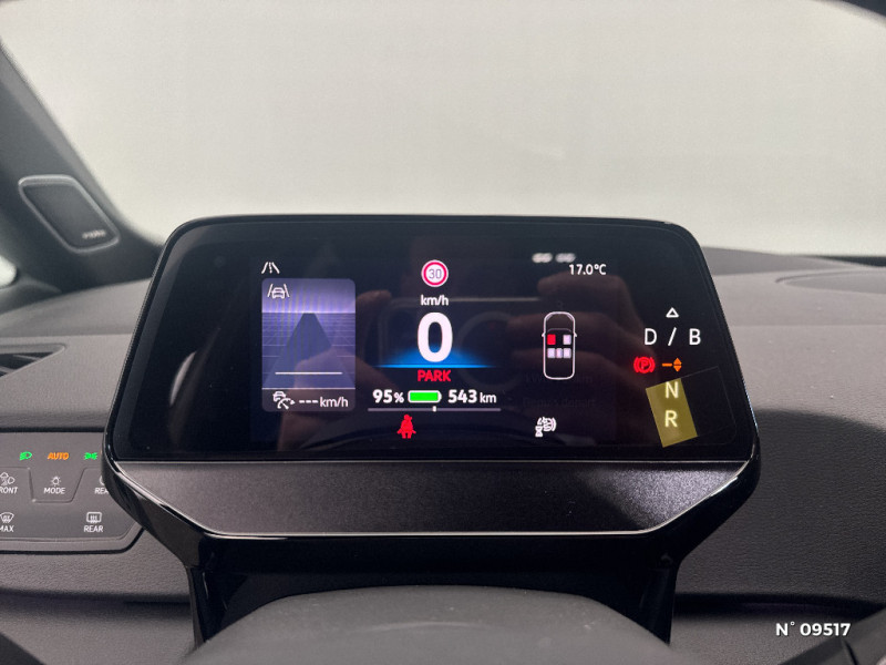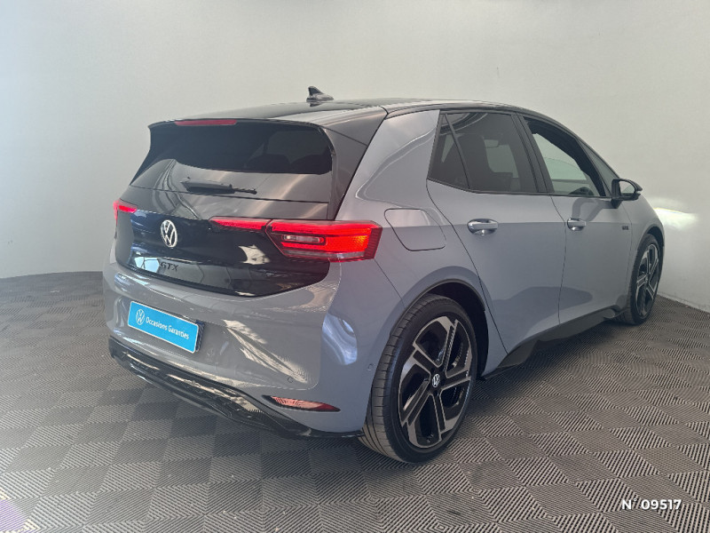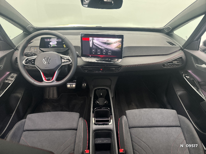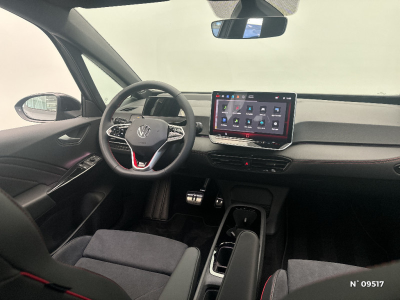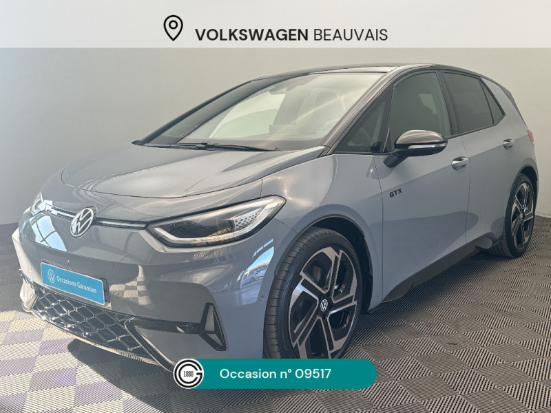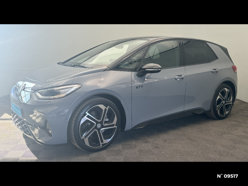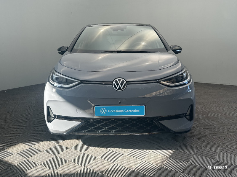 Activation automatique du signal de détresse en cas de freinage d'urgence / Allumage automatique des feux, capteurs de pluie avec essuie-glace automatique / App-Connect sans fil (en fonction du téléphone compatible) pour Apple CarPlay, Android Auto et Mirror Link (avec fil). / Avertissement de distance avec le véhicule précédent / Avertisseur sonore et lumineux pour ceintures non attachées AV et AR / Avertisseur sonore 1 ton / Badge 'GTX' noir spécifique sur les portières conducteur et passager AV / Banquette AR 2/3 1/3 avec accoudoir central et trappe de chargement (3 personnes) / Boîte de vitesse automatique à variation continue / Câble de recharge Mode 3 - Type 2 pour borne de recharge (32 A) / Capacité de batterie nette - 79 kWh / Capacité de puissance de recharge maximale sur prise CCS : 185 kW DC / Capacité de puissance maximale du chargeur embarqué pour prise Type 2 : 11 kW AC / Carrosserie bicolore - Toit et hayon noir / Carrosserie spécifique 'GTX' AV/AR avec LED de jour à l'AV / Clignotants confort : (1) touche = (3) clignotements / Climatisation stationnaire: permet de réfrigérer, de ventiler ou de chauffer l'habitacle du véhicule à l'arrêt. Elle permet également de dégivrer le pare-brise, de le désembuer et de le débarrasser d'une fine couche de neige en hiver. La climatisation stationnaire est alimentée par la prise de courant ou par la batterie haute tension du véhicule / Commande vocale intuitive -"Bonjour ID." - Certaines fonctions peuvent être exécutées grâce à la commande vocale / ACC: Régulateur de vitesse adaptatif avec limiteur de vitesse adapte la vitesse en fonction des limitations de vitesse détectées / Console centrale rétroéclairée avec rangements, volet occultant, 2 porte-gobelets / Contrôle de la traction (TCS) / Coques de rétroviseurs extérieurs Noires / Détection de fatigue Système de détection de fatigue du conducteur qui analyse le comportement du conducteur et recommande un temps de repos par l'apparition d'un message visuel et sonore / Direction électromécanique à assistance variable en fonction de la vitesse / Eclairage à LED de la plaque d'immatriculation AR / Eclairage de bienvenue (Welcome Light) / Ecran central tactile de 12,9'' personnalisable / E-sound - son spécifique ID: L'e-Sound est un bruit électronique de moteur signalant l'approche de véhicules électriques aux autres usagers de la route. Plus le véhicule roule vite, plus le volume sonore de l'e-Sound diminue lentement / Frein de stationnement électromécanique avec fonction d'immobilisation en pente "Auto Hold" La fonction Auto Hold garantit une immobilisation du véhicule sans déplacement intempestif, la pédale de frein ne devant pour cela pas être maintenue actionnée / Freins à disques AV et freins à tambours AR / Front Assist - Système de surveillance périmétrique avec fonctions de freinage d'urgence en ville et détection des piétons / Correcteur électronique de trajectoire ESP, Amplificateur de freinage d'urgence AFU, Servofrein électromécanique eBKV, Freinage mixte BKU, système d¿antiblocage des roues ABS, blocage électronique de différentiel EDS,répartiteur électronique de freinage EBV,anti patinage électronique ASR, régulateur électronique de couple MSR et assistance au contre-braquage, Programme électronique de stabilisation ESC,Système agissant comme un différenti.autobloquant électronique permettant une meilleure motricité en courbe grâce à une répartition optimale de la puissance et du couple sur les roues AR XDS / Garantie constructeur de 2 ans kilométrage illimité / Gestion des paramètres de confidentialité liés à la eSIM et à VW Connect / ID. Display de 5,3'': L'ID. Display est un combiné d'instruments numérique doté d'un afficheur couleur TFT à haute résolution. En plus du tachymètre numérique, il est possible d'afficher des informations supplémentaires provenant des systèmes d'aide à la conduite, par la sélection de divers profils d'information / Indicateur de température extérieure avec avertisseur de gel / Interface téléphone Bluetooth / Intervention de freinage automatique lors des manoevres: L'intervention de freinage automatique d'un système de stationnement est utilisée pour réduire le risque de collision si un obstacle est détecté pendant le processus de stationnement / Jantes en alliage léger 20'' 'Skagen' Noires Pneumatiques 215/45 R20 / Jupes latérales spécifiques 'GTX' en noir laqué / Kit de dépannage : compresseur 12 V et produit d'étanchéité de pneu / Lane Assist - Assistant au maintien dans la voie avec correction de trajectoire / Oeillets d'arrimage ISOFIX (dispositif pour fixation de 2 sièges-enfants sur la banquette AR) / Pack Assistance Système d'ouverture et de fermeture sans cléà distance 'Keyless Access Advanced', Caméra de recul 'Rear View' située dans le logo Volkswagen, Intelligent Park Assist Plus : Système d'aide au stationnement AV et AR, Système proactif de protection des occupants - Pre Safe Assist, Alarme antivol - Protection volumétrique et anti-soulèvement, Éclairage des poignées de portes / Pack confort - Volant multifonction, chauffant, avec commande tactile et capacitif - Climatiseur 2-Zones 'Air Care Climatronic' avec filtre à charbon actif - Sièges AV chauffants - Système de navigation & infotainment Discover Pro avec Services de streaming et radio via Internet, fonction planificateur d'itinéraire - Interface téléphonique "Confort" avec fonction de chargement inductive / Pack Extérieur Projecteurs IQ. Light Matrix LED avec commutation automatique des feux de route, éclairage de mauvais temps et fonction de bienvenue, Régulation dynamique des feux de route "Dynamic Light Assist, Bande lumineuse entre les projecteurs et le logo, Feux AR à LED avec clignotants séquentiels, Vitres AR sur-teintées / Pack Intérieur Style Plus GTX avec habillage et volant Noir Sellerie Top-Sport bi-matière Artvelours