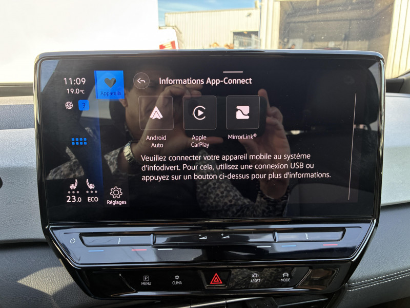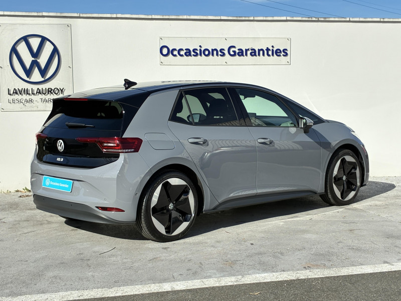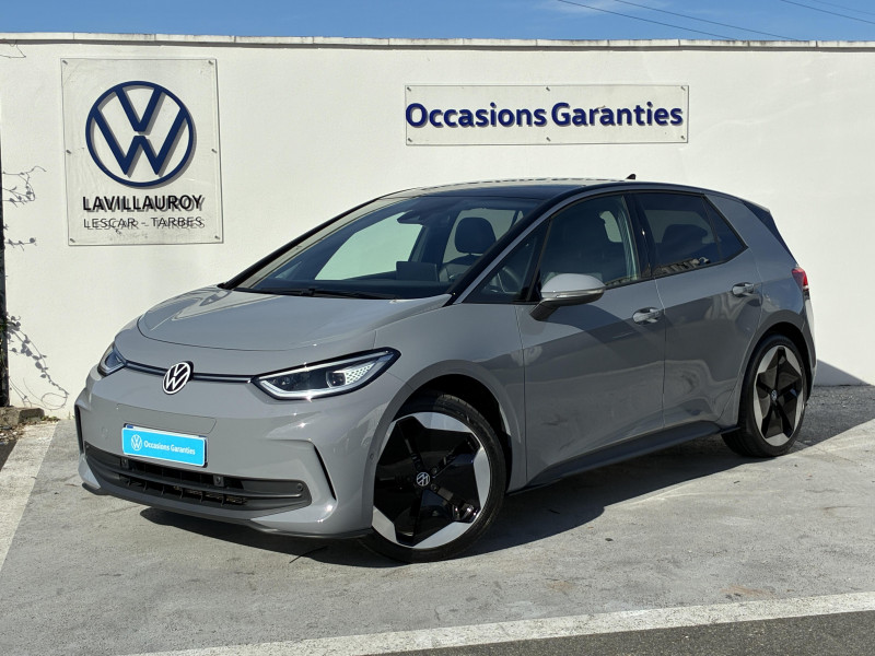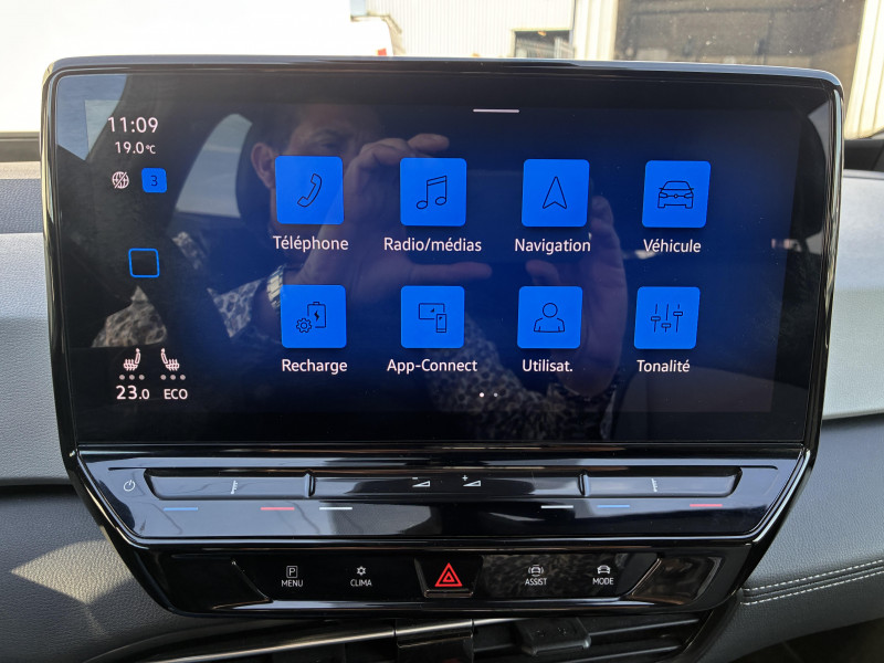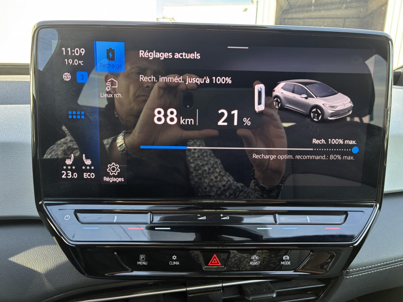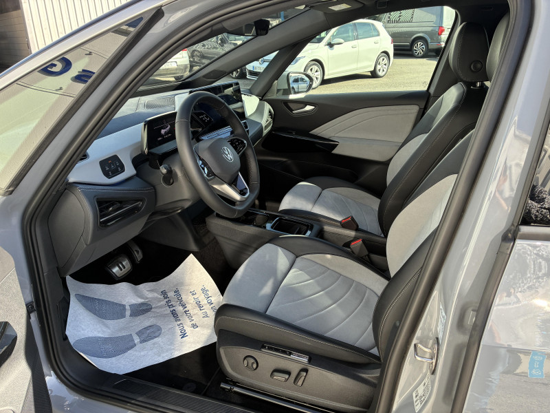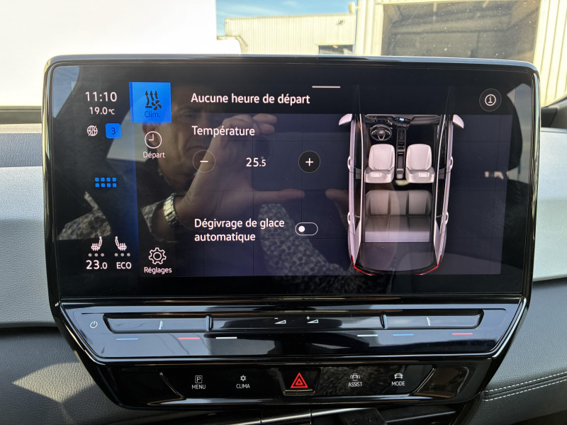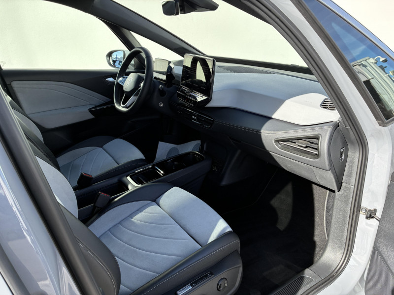 Activation automatique du signal de détresse en cas de freinage d'urgence / Allumage automatique des feux, capteurs de pluie avec essuie-glace automatique / Buses à dégivrage automatique à l'AV / Climatisation stationnaire: permet de réfrigérer, de ventiler ou de chauffer l'habitacle du véhicule à l'arrêt. Elle permet également de dégivrer le pare-brise, de le désembuer et de le débarrasser d'une fine couche de neige en hiver. La climatisation stationnaire est alimentée par la prise de courant ou par la batterie haute tension du véhicule / Eclairage à LED de la plaque d'immatriculation AR / Frein de stationnement électromécanique avec fonction d'immobilisation en pente "Auto Hold" Le véhicule se maintien automatiquement en pente et une simple action qur l'accélérateur suffit à désactiver le frein / ID. Display de 5,3'': L'ID. Display est un combiné d'instruments numérique doté d'un afficheur couleur TFT à haute résolution. En plus du tachymètre numérique, il est possible d'afficher des informations supplémentaires provenant des systèmes d'aide à la conduite, par la sélection de divers profils d'information / Intelligent Park Assist Système d'aide au stationnement AV et AR / Intervention de freinage automatique lors des manoevres: L'intervention de freinage automatique d'un système de stationnement est utilisée pour réduire le risque de collision si un obstacle est détecté pendant le processus de stationnement / Intérieur Pro S Sellerie ArtVelours avec similicuir, bicolore Gris-Noir, Sièges avant ErgoActive : ajustable électriquement - 12 positions,chauffants, avec supports lombaires ajustables, assises coulissantes, massants et à mémoire,? Revêtement du tableau de bord et des portes ArtVelours, Pédalier en acier inoxydable avec symboles ?Play & Pause?, Banquette arrière 2 places rabattable de manière asymétrique / Park Pilot - Aide au stationnement AV et AR / Projecteurs LED et feux AR à LED / Préparation pour activation ultérieure de la Navigation via Upgrades / Rétroviseur intérieur à réglage jour/nuit automatique / Sign Assist - Système de détection de la signalisation routière Le système de détection de la signalisation routière détecte les panneaux de signalisation standard à l'aide d'une caméra située dans le pied du rétroviseur intérieur et vous informe des limitations de vitesse, interdictions de dépasser et panneaux de danger identifiés / Système d'aide à l'éco-conduite - Eco Assistance / Système d'appel d'urgence - eCall Appel d'urgence manuel ou automatique / Système de Freinage anti-multi collision Ce dispositif freine automatiquement le véhicule après un premier choc afin de limiter le risque de multi collision / Sélecteur de vitesse situéà droite derrière le volant avec frein de stationnement électronique Il dispose d'une marche AV (D/B), du neutre (N) et d'une marche AR (R). En position (D), la récupération d'énergie au freinage est en mode normal. En position (B), le système d'aide à l'éco-conduite est activé et la récupération d'énergie est plus élevée / 2 port USB-C à l'AV (recharge et data) et 2 à l'AR (recharge) / 7 Airbags Airbags frontaux AV conducteur et passager (Airbag passager désactivable par clé), Airbags latéraux à l'AV, airbags interactif à l'AV et avec airbags de tête AV/AR, Airbag central situé sur le côté droit du siège conducteur, permet la protection des chocs entre les occupants des sièges AV en cas de collision latérale ou de retournement / ACC: Régulateur de vitesse adaptatif avec limiteur de vitesse adapte la vitesse en fonction des limitations de vitesse détectées / Accoudoir pour les sièges AV / App-Connect sans fil (en fonction du téléphone compatible) pour Apple CarPlay, Android Auto et Mirror Link (avec fil). / Avertissement de distance avec le véhicule précédent / Avertisseur sonore 1 ton / Avertisseur sonore et lumineux pour ceintures non attachées AV et AR / Banquette AR 2 places rabattable de manière asymétrique / Capacité de batterie nette - 77 kWh / Capacité de puissance de recharge maximale sur prise CCS : 170 kW DC / Capacité de puissance maximale du chargeur embarqué pour prise Type 2 : 11 kW AC / Car2X La fonction Car2X utilise les informations des autres véhicules présents dans un périmètre pouvant s'étendre jusqu'à 800 mètres, ainsi que les signaux des infrastructures de transport pour avertir le conducteur et transmettre ces avertissements à d'autres véhicules équipés de la fonction Car2X / Clignotants confort : (1) touche = (3) clignotements / Commande vocale intuitive -"Bonjour ID." - Certaines fonctions peuvent être exécutées grâce à la commande vocale / Console centrale rétro éclairée avec volet occultant et 2 porte-gobelets / Correcteur électronique de trajectoire ESP, Amplificateur de freinage d'urgence AFU, Servofrein électromécanique eBKV, Freinage mixte BKU, système d?antiblocage des roues ABS, blocage électronique de différentiel EDS,répartiteur électronique de freinage EBV,anti patinage électronique ASR, régulateur électronique de couple MSR et assistance au contre-braquage, Programme électronique de stabilisation ESC,Système agissant comme un différenti.autobloquant électronique permettant une meilleure motricité en courbe grâce à une répartition optimale de la puissance et du couple sur les roues AR XDS / Câble de recharge Mode 3 - Type 2 pour borne de recharge (32 A) / Direction électromécanique à assistance variable en fonction de la vitesse / E-sound - son spécifique ID: L'e-Sound est un bruit électronique de moteur signalant l'approche de véhicules électriques aux autres usagers de la route. Plus le véhicule roule vite, plus le volume sonore de l'e-Sound diminue lentement / Eclairage d'ambiance - 10 couleurs / Eclairage de bienvenue (Welcome Light) / Ecran central tactile de 12'' personnalisable / Freins à disques AV et freins à tambours AR / F