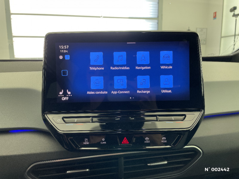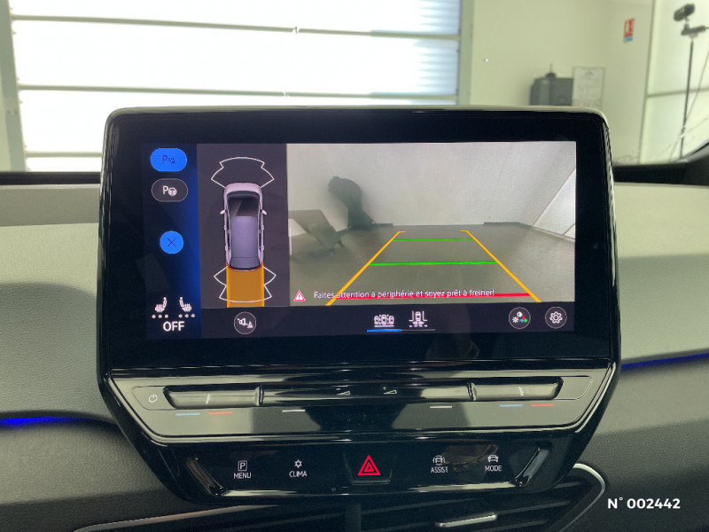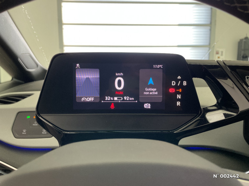 Climatiseur 1-Zone "Climatronic" / Kit de dépannage : compresseur 12 V et produit d'étanchéité de pneu / Sélecteur de vitesse derrière le volant avec la touche de frein de stationnement électronique / E-sound - son spécifique ID / Verrouillage centralisé avec télécommande à fréquence radio / Lane Assist - Assistant au maintien dans la voie avec correction de trajectoire / Front Assist - Système de surveillance périmétrique avec fonctions de freinage d'urgence en ville et détection des piétons. L¿assistance au freinage d¿urgence autonome (Front Assist) peut détecter des collisions frontales imminentes et avertir avant qu¿elles ne surviennent. De plus, le système peut fournir au conducteur une assistance pendant le freinage et la manoeuvre d¿évitement de l¿obstacle, et freiner le véhicule de façon automatique. / Park Pilot: Système d'aide au stationnement AV/AR avec signaux sonores et visualisation de la distance des obstacles sur l'écran / ID.Light: L'ID. Light est un concept d'éclairage intelligent qui vous fournit des informations complémentaires sur l'état du véhicule et sur la situation de conduite / Services connectés "We Connect ID." 36 mois / Galerie porte-bagages / Pack Assistance / Sièges AV réglables manuellement en hauteur, profondeur et inclinables / Carrosserie bicolore - Toit et hayon noir / Avertisseur sonore et lumineux pour ceintures non attachées AV/AR / Pack Infotainment / Réglage des phares tactile / Pare-soleils AV avec miroir de courtoisie éclairé / Ecran central tactile de 10'' personnalisable / Commande vocale intuitive -"Bonjour ID." - Certaines fonctions peuvent être exécutées grâce à la commande vocale / Boîte à gants verrouillable et éclairée / 2 ports USB-C à l'AV (recharge et data) / Jantes 18'' "East Derry" Argent Pneumatiques 215/55 R18 / Système de refroidissement liquide / Câble de recharge Mode 3 - Type 2 pour borne de recharge (32A) / Turn Assist : Freinage d'urgence d'intersection - Le freinage d'urgence au braquage peut empêcher votre véhicule d'entrer en collision avec un véhicule arrivant en sens inverse lorsque vous changez de direction / ID. Display de 5,3'': L'ID. Display est un combiné d'instruments numérique doté d'un afficheur couleur TFT à haute résolution. En plus du tachymètre numérique, il est possible d'afficher des informations supplémentaires provenant des systèmes d'aide à la conduite, par la sélection de divers profils d'information / Intérieur Style avec habillage et volant Noir et avec sellerie en ArtVelours et similicuir, tableau de bord personnalisable, revêtement du tableau de bord et des portes soft-touch, éclairage d¿ambiance personnalisable, pédalier en acier inoxydable avec symboles Play et Pause, banquette AR 3 places rabattable (2/3 - 1/3) avec trappe à skis, sièges AV réglables en hauteur / Direction électromécanique à assistance variable en fonction de la vitesse / Avertisseur sonore 1 ton / Activation automatique du signal de détresse en cas de freinage d'urgence / Détecteur de fatigue Système de détection de fatigue du conducteur qui analyse le comportement du conducteur et recommande un temps de repos par l¿apparition d¿un message visuel et sonore / Avertissement de distance avec le véhicule précédent / Système de son 4+1 haut-parleurs / Dispositif électronique de démarrage sans clé "Keyless-Go": Démarrage possible avec une simple pression sur la pédale de frein / Gestion des paramètres de confidentialité liés à la eSIM et à We Connect / Accoudoir pour les sièges AV / Pack Visibilité / Volant multifonction à réglage mécanique en hauteur et en longueur / Système d'appel en cas de panne B-Call / Pack Visibilité / Clignotants confort (1 impulsion = 3 clignotements) / Tapis de sol AV/AR / Prise 12 V dans le coffre / Oeillets d'arrimage ISOFIX (dispositif pour fixation de 2 sièges-enfants sur la banquette AR) / Frein de stationnement électromécanique avec fonction d'immobilisation en pente Auto-Hold / Indicateur de température extérieure avec avertisseur de gel / Eclairage à LED de la plaque d'immatriculation AR / Freins à tambours à l' AR / Car2X / Système de récupération d'énergie au freinage et à la décélération / Système de freinage anti multicollision: ce dispositif freine automatiquement le véhicule après un premier choc afin de limiter le risque de multicollision / Pochette de premiers secours, triangle de sécurité et gilet rétro réfléchissant / Intervention de freinage automatique lors des manoeuvres: L'intervention de freinage automatique d'un système de stationnement est utilisée pour réduire le risque de collision si un obstacle est détecté pendant le processus de stationnement / Vitres AV/AR électriques avec dispositif anti-pincement / Sign Assist - Système de détection de la signalisation routière Le système de détection de la signalisation routière détecte les panneaux de signalisation standard à l'aide d'une caméra située dans le pied du rétroviseur intérieur et vous informe des limitations de vitesse, interdictions de dépasser et panneaux de danger identifiés / Système d'appel d'urgence - eCall Système d'appel de dépannage et Système d'appel informatif / Phares LED et feux AR à LED / Freins à disque à l'AV / Portes AR avec sécurité enfants / Ceintures de sécurité automatiques AV 3 points à enrouleur avec prétensionneurs et AR 3 points à enrouleur / Climatiseur 1-Zone "Air Care Climatronic" avec mode recyclage de l'air ambiant / Peinture Unie Gris Lunaire/Toit Noir / Câble de recharge Mode 2 - Type 2 (8A) pour prise domestique / Réglages de la charge via le système d'infodivertissement ou l'application We Connect ID / Pack Infotainment / Lampes de lecture tactiles avec réglage manuel de l'intensité lumineuse / Appui-tête réglables en hauteur sur les sièges AV et AR / Chargeur embarqué pour prise Type 2 : 11 kW AC / Jantes 18'' "East Derry" 