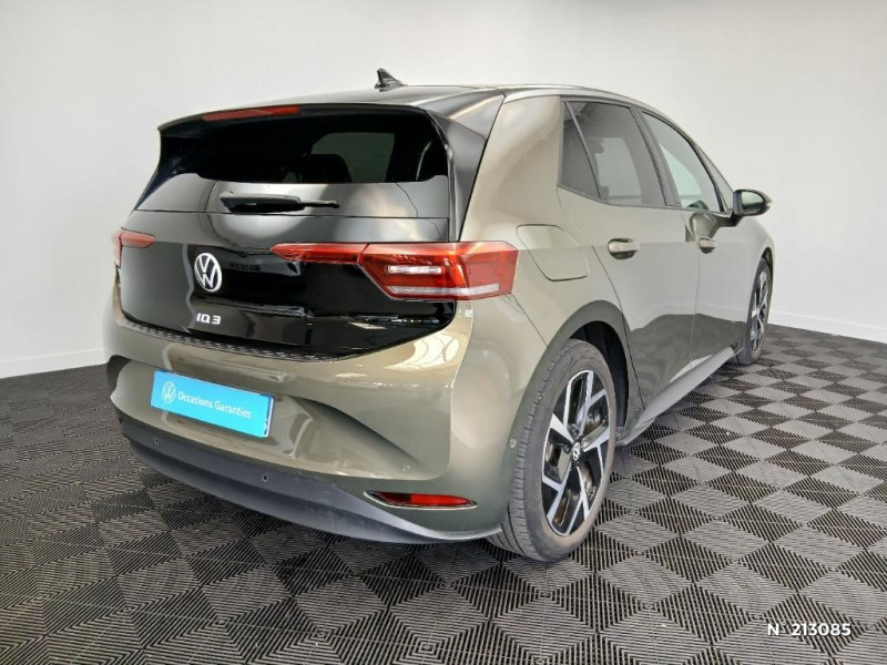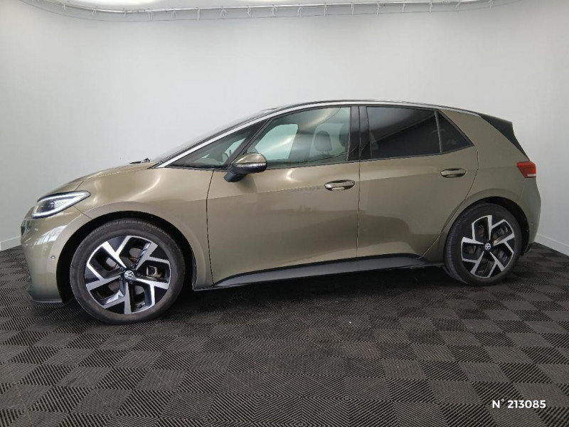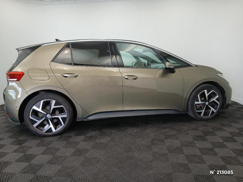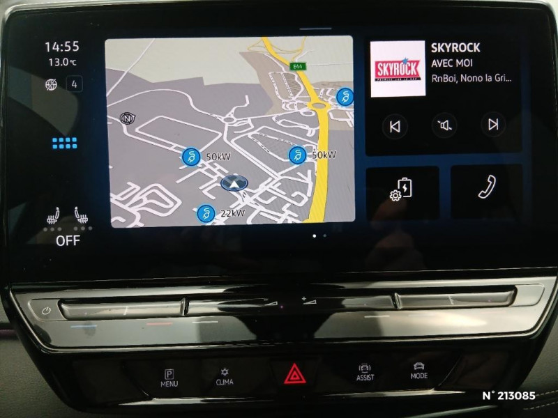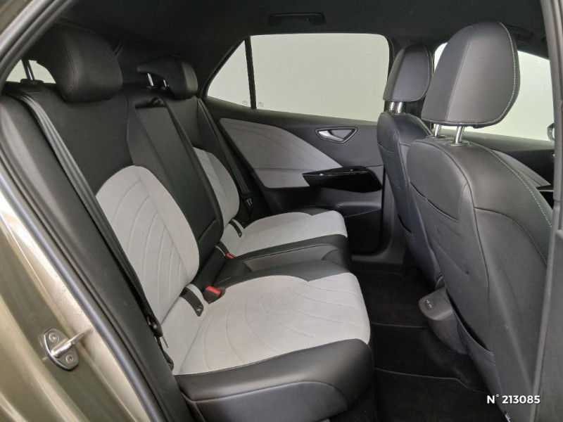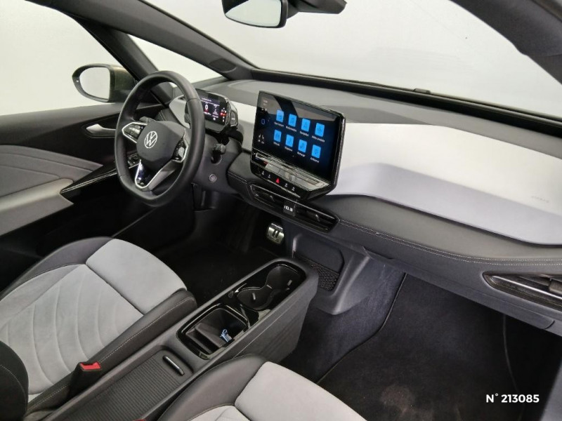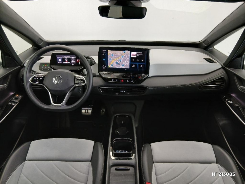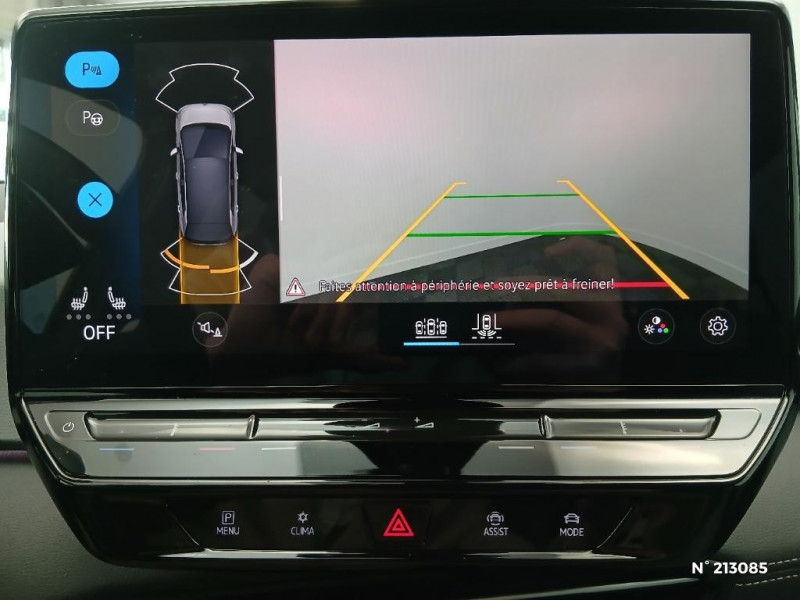 Gestion des paramètres de confidentialité liés à la eSIM et à We Connect / ID. Display de 5,3'': L'ID. Display est un combiné d'instruments numérique doté d'un afficheur couleur TFT à haute résolution. En plus du tachymètre numérique, il est possible d'afficher des informations supplémentaires provenant des systèmes d'aide à la conduite, par la sélection de divers profils d'information / Indicateur de température extérieure avec avertisseur de gel / Intelligent Park Assist Plus Assistant aux manoeuvres de stationnement comprenant un système d'aide au stationnement AV et AR avec signaux sonores et visualisation de la distance des obstacles sur l'écran / Intelligent Park Assist Système d'aide au stationnement AV et AR / Interface Bluetooth / Interface téléphone Bluetooth / Intérieur Pro S Sellerie ArtVelours avec similicuir, bicolore Gris-Noir, Sièges avant ErgoActive : ajustable électriquement - 12 positions,chauffants, avec supports lombaires ajustables, assises coulissantes, massants et à mémoire,¿ Revêtement du tableau de bord et des portes ArtVelours, Pédalier en acier inoxydable avec symboles ¿Play & Pause¿, Banquette arrière 2 places rabattable de manière asymétrique / Intervention de freinage automatique lors des manoeuvres: L'intervention de freinage automatique d'un système de stationnement est utilisée pour réduire le risque de collision si un obstacle est détecté pendant le processus de stationnement / Jantes en alliage 19" 'Wellington Anthracite bicolore Argent Pneumatiques AirStop 215/50 R19 / Jantes en alliage 19" 'Wellington Noir bicolore Argent Pneumatiques AirStop 215/50 R19 / Rétroviseurs extérieurs réglables, rabattables et dégivrants électriquement avec abaissement du rétroviseur passager / Revêtement du tableau de bord et des portes ArtVelours / Revêtement du tableau de bord et des portes ArtVelours / Sélecteur de vitesse situéà droite derrière le volant avec frein de stationnement électronique Il dispose d'une marche AV (D/B), du neutre (N) et d'une marche AR (R). En position (D), la récupération d'énergie au freinage est en mode normal. En position (B), le système d'aide à l'éco-conduite est activé et la récupération d'énergie est plus élevée / Sellerie ArtVelours avec similicuir, bicolore Gris-Noir / Sellerie bi-matière ArtVelours, bicolore Gris-Noir / Sellerie Tissu Gris Taia / Services connectés "We Connect ID." 36 mois / Projecteurs IQ.Light - Matrix LED avec commutation automatique des feux de route, éclairage de mauvais temps et fonction de bienvenue / Projecteurs LED et feux AR à LED / Puissance de 150 kW (204 ch) - Couple de 310 Nm / Réglage des phares tactile / Réglages de la charge via le système d'infodivertissement ou l'application "Volkswagen" / Réglages de la charge via le système d¿infodivertissement ou l'application We Connect ID / Régulation dynamique des feux de route "Dynamic Light Assist" / Rétroviseur intérieur à réglage jour/nuit automatique / Sièges AV ErgoActive ajustable électriquement - 12 positions, chauffants, avec supports lombaires ajustables, assise coulissante, fonction massante et fonction de mémoire / Sièges AV ErgoActive ajustable électriquement - 12 positions, chauffants, avec supports lombaires ajustables, assise coulissante, fonction massante et fonction de mémoire / Sign Assist - Système de détection de la signalisation routière Le système de détection de la signalisation routière détecte les panneaux de signalisation standard à l'aide d'une caméra située dans le pied du rétroviseur intérieur et vous informe des limitations de vitesse, interdictions de dépasser et panneaux de danger identifiés / Système d'aide à l'éco-conduite - Eco Assistance / Système d'appel d'urgence - eCall Appel d'urgence manuel ou automatique / Système de démarrage sans clé Keyless-Go Démarrage possible avec une simple pression sur la pédale de frein / Système de Freinage anti-multi collision Ce dispositif freine automatiquement le véhicule après un premier choc afin de limiter le risque de multi collision / Système de Navigation & Infotainment "Discover Pro" avec "Services de streaming et radio via Internet" / Système de récupération de l'énergie en décélération / Système de refroidissement liquide / Système de son 4+1 haut-parleurs / Système de son 4+1 HP AV / Système d'ouverture et de fermeture sans clé dans un périmètre de détection Keyless Access Advanced / Système proactif de protection des occupants - Pre Safe Assist / Tapis de sol AV/AR / Turn Assist : Freinage d'urgence d'intersection - Le freinage d'urgence au braquage peut empêcher votre véhicule d'entrer en collision avec un véhicule arrivant en sens inverse lorsque vous changez de direction / Verrouillage centralisé avec télécommande à fréquence radio / Vitres AV/AR électriques avec dispositif anti-pincement / Volant chauffant / Volant multifonction à réglage mécanique en hauteur et en longueur / 2 port USB-C à l'AV (recharge et data) et 2 à l'AR (recharge) / 7 Airbags - Airbags frontaux AV conducteur et passager (Airbag passager désactivable par clé) - Airbags latéraux AV, airbags interactif à l'AV et avec airbags de tête AV/AR - Airbag central situé sur le côté droit du siège conducteur, permet la protection des chocs entre les occupants des sièges AV en cas de collision latérale ou de retournement / ACC : Régulateur de vitesse adaptatif et prédictif (avec limiteur de vitesse) / ACC: Régulateur de vitesse adaptatif avec limiteur de vitesse adapte la vitesse en fonction des limitations de vitesse détectées / Accoudoir pour les sièges AV / Activation automatique du signal de détresse en cas de freinage d'urgence / Alarme antivol - Protection volumétrique et anti-soulévement / Allumage automatique des feux, capteurs de pluie avec essuie-glace automatique / App-Connect sans fil (en fonction du téléphone compatible) pour Apple CarP