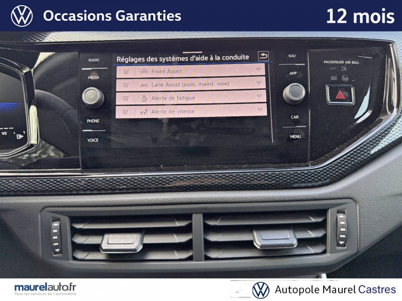 2 interfaces USB-C à l'AV / Accoudoir central AV réglable en longueur avec compartiment de rangement et 2 ports USB-C de recharge AR / Airbags frontaux AV conducteur et passager (Airbag passager désactivable par clé) / Allumage automatique des projecteurs avec feux de jour à LED et fonction "Coming/Leaving Home" / Antenne AR de pavillon / App-Connect sans fil affichage et contrôle via l'écran tactile du véhicule, du contenu, des fonctions et des applications compatibles présents sur le Smartphone (compatibilité avec les systèmes Apple CarPlay et Android Auto). Fonction sans fil uniquement disponible avec Apple CarPlay / Applications décoratives "Lava Stone Black" sur le tableau de bord / Appuis-tête (3) et ceintures de sécuritéà 3 points (3) sur la banquette AR / Aumônières au dos des sièges AV / Avertisseur sonore et lumineux de non-extinction des phares et de non bouclage des ceintures de sécuritéà l'AV et à l'AR / Bacs de rangement dans toutes les portes, à l'AV avec porte-boisson / Boîtiers de rétroviseurs extérieurs et poignées de porte dans la teinte du véhicule / Câble adaptateur USB-C vers USB-A / Cache-bagages / Caméra de recul Rear View avec visualisation de la zone située à l'AR du véhicule sur l'écran de la radionavigation / Ciel de pavillon couleur céramique / Climatisation manuelle "Climatic" / Correcteur électronique de trajectoire ESP avec amplificateur de freinage d'urgence, système d'antiblocage des roues ABS, antipatinage électronique ASR, blocage électronique de différentiel EDS, régulateur électronique de couple d'inertie MSR, aide au démarrage en côte ?Hill-Hold' / Déflecteur de toit intégré / Digital Cockpit : combiné d'instruments entièrement digital de 8" / Disques de frein à l'AV et freins à tambour à l'AR / Dossier AR non divisé et rabattable / Eclairage du coffre à bagages / Essuie-glaces AV/AR avec commande d'intermittence et lave-glace / Fatigue Detection : système de détection de fatigue du conducteur qui analyse le comportement du conducteur et recommande un temps de repos par l'apparition d'un message visuel et sonore / Filtre à charbon actif avec aspiration d'air frais / Front Assist: système de surveillance périmétrique contribuant à la prévention des collisions avec fonction de détection des piétons et des cyclistes. Ce système freine automatiquement le véhicule en cas de détection d'obstacle aussi bien en ville que sur autoroute / Grille de calandre avec baguette chromée / Interface Bluetooth pour téléphone mains libres / Jantes en alliage léger 15" ?Essex' et pneumatiques 185/65 R15 avec écrous antivol / Kit de dépannage en cas de crevaison incluant compresseur 12 V et produit colmatant / Lampes de lecture AV/AR / Lane Assist: Assistant de maintien de trajectoire qui corrige, dans la limite du système, le mouvement du volant avant que le véhicule dépasse involontairement la bande de roulement. Système actif à partir de 65 km/h / Light Assist : Régulation automatique des feux de route / Miroirs de courtoisie éclairés dans les pare-soleil pour conducteur et passager AV / Oeillets d'arrimage ISOFIX (dispositif pour fixation de 2 sièges enfants sur les places extérieures de la banquette AR et 1 siège enfant sur le siège passager AV) / Pack Chrome Intérieur / Pare-chocs peints dans la couleur de carrosserie / Park Pilot : aide au stationnement AV/ AR avec signaux d'avertissement acoustiques en cas d'obstacle / Plafonnier à temporisation à l'AV avec contacteur de portière / Pommeau de levier de vitesses et poignée de frein à main en cuir / Porte-boissons (2) à l'AV / Préparation pour activation ultérieure de la Navigation "Discover Media" / Préparation pour "VW Connect" et "VW Connect Plus" vous permet d'obtenir des informations sur votre véhicule directement sur votre smartphone. Application totalement gratuite et facile à utiliser. Produit 100% compatible avec votre Volkswagen et garantie constructeur préservée. Aperçu de toutes les données de votre véhicule et des prochaines maintenances à effectuer. Sécurité totale des données grâce à un cryptage / Projecteurs à LED et feux de jour à LED Eco / Régulateur de vitesse y compris limiteur de vitesse / Rétroviseur extérieur asphérique côté conducteur / Rétroviseur intérieur à réglage jour/nuit automatique / Sellerie en tissu "Polo" / Système Audio & Infotainment "Ready 2 Discover" avec «Services de streaming et radio via Internet» via carte eSIM intégrée, écran couleur tactile 8'', 6 HP, affichage de la couverture des albums, fonction ?Intuitive Touch' / Système de freinage anti multicollision: ce dispositif freine automatiquement le véhicule après un premier choc afin de limiter le risque de multicollision / Système de récupération de l'énergie en décélération / Système "Start-Stop" de coupure-redémarrage du moteur à l'arrêt / Tableau de bord avec revêtement moussé en partie supérieure / Tapis de sol AV/AR / Témoin d'alerte pour niveau de liquide lave-glace / Témoins de contrôle et indicateur d'intervalle de révision / Verrouillage centraliséà distance, 2 clés pliantes de radiocommande fournies / Vitres athermiques teintées vertes