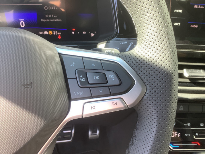 2 interfaces USB-C AV et 2 ports USB-C de recharge AR / 2 lampes de lecture a l'AV / ACC : Le Regulateur de vitesse adaptatif avec limiteur de vitesse (ACC) / Accoudoir central a l'AV reglable en longueur, avec compartiment de rangement / App-Connect sans fil / Application decorative de tableau de bord ""Piano Noir"" brillante / Appuis-tte AR (3) et ceintures de scurit 3 points (3) sur la banquette AR / Avertisseur de non bouclage des ceintures de securite AV et AR / Bote de rangement sous le sige passager AV / Camera de recul Rear view avec visualisation de la zone situee a l'AR du vehicule / Chassis Sport: Direction progressive / Ciel de pavillon noir / Climatisation automatique tactile Climatronic bi-zone avec filtre anti-allergene, reglable / Combin d'instrumentalisation entirement digital 'Digital Cockpit' / Compartiment de rangement pour manuel d'utilisation sous siege conducteur / Correcteur electronique de trajectoire ESP, systeme d'antiblocage de roues ABS, EDL, EDTC, / Emergency Assist / Essuie-glaces AV/AR avec commande d'intermittence et lave-glace / Fatigue Detection : systeme de detection de fatigue du conducteur qui analyse le comportement du / Feux AR de brouillard des 2 cotes, feux de recul des 2 cotes / Frein de stationnement electromecanique avec fonction d'immobilisation en pente ""Auto Hold"" et / Front Assist avec fonction de secours en ville et detecteur de pieton / Insert argent sur le haut des vitres / Insert argent sur le haut des vitres, allant des portieres AV jusqu'a l'AR du vehicule / Interface Bluetooth pour telephone mains libres / Keyless Access: Systme de verrouillage/dverrouillage sans cl et dmarrage avec bouton start/stop / Lampes de lecture AV/AR / Lane Assist - Assistant au maintien dans la voie avec correction de trajectoire / Light Assist : Regulation automatique des feux de route / Logo R-Line brode sur les sieges AV / Logo R-Line sur la calandre et sur les ailes / Pack ""Aide a la conduite IQ.DRIVE"" / Pack Aide a la Conduite / Pack Visibilit / Pack Aide a la conduite IQ.DRIVE / Pare chocs AR spcifiques R-Line dans la couleur carrosserie / Pare chocs AV spcifique R-Line dans la couleur carrosserie / Park Assist - Assistance au stationnement / Park Assist - assistant aux manoeuvres de stationnement / Partie exterieure et appuie-tete bi-matiere ArtVelours et surpiques en Gris / Partie exterieure et appuie-tete en similicuir et surpiques en Gris / Pedalier en acier inoxydable brosse / Plancher de coffre a bagages reglable en hauteur et amovible / Poignes de portes et rtroviseurs extrieurs dans la teinte de la carrosserie / Preparation pour ""VW Connect"" / Projecteurs a LED Plus : projecteurs LED haute performance avec feux de jour a LED / Projecteurs antibrouillard AV avec clairage statique d'intersection / Selection du profil de conduite / Sellerie specifique avec partie centrale en tissu ""Karoso"", interieur des bourrelets lateraux / Seuils de porte avec logo R-Line / Sige passager AV rabattable / Systme d'infotainment avec cran d'accueil R-Line / Systme Start/Stop avec rcupration d'nergie au freinage / Systeme d'aide au stationnement - signaux davertissement en cas dobstacles AV et AR / Systeme d'aide au stationnement AV et AR / Systeme Navigation & Infotainment ""Discover Media"" / Tmoin d'alerte pour niveau de liquide lave-glace