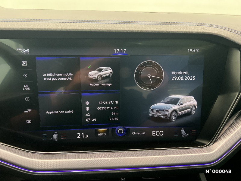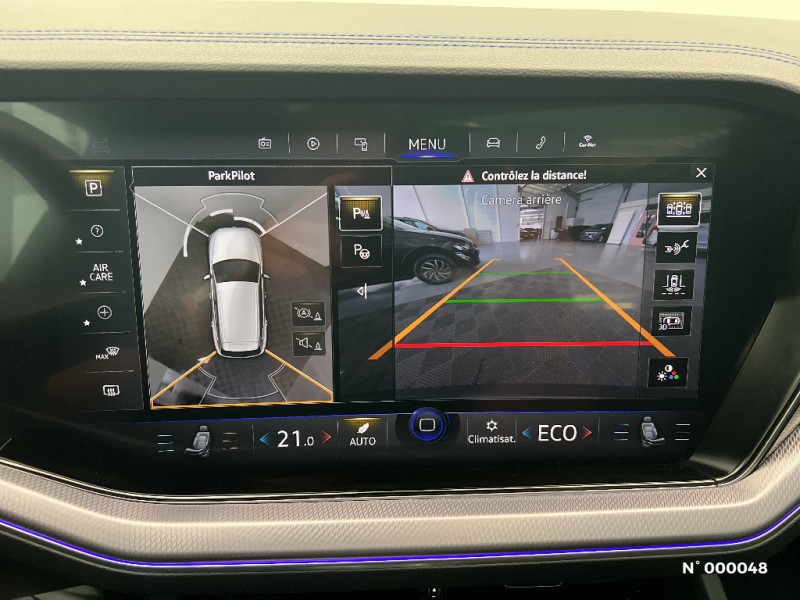 Système de protection active des piétons avec capot actif / Interface USB C et prise chargement / IQ.LIGHT - Matrix LED / Système de protection des passagers proactive Pre Safe Assist / Système Start/Stop avec récupération d'énergie de freinage / Tapis de sol AV et AR / Traffic Jam Assist : Assistant de conduite semi-autonome dans les embouteillages / "Travel Assist" Assistant de conduite semi-autonome / Volant chauffant / Blocage automatique de différentiel / Volant en cuir avec palettes / Volant sport en cuir avec palettes, chauffant / 8 HP / Câble de recharge Mode 3 type 2, 32 A / Câble de recharge M2 UE Schuko coudé 8A / Câble de recharge 32 A pour borne domestique "wallbox" ou borne publique compatible (jusqua 7.2kW) (mode 3, type 2/type 2) / Câble de recharge 8A pour prise de courant domestique (1,8kW) (mode2,type2) / Caméra de recul "Rear Assist" / Carte de recharge Volkswagen e-Pass avec 1 an d'abonnement et 50 Euro de credit offerts / Ciel de pavillon Noir / Ciel de pavillon Noir / Climatisation 4 zones "Air Care Climatronic" / DAB+ / Détection d'angles morts / Détection d'angles morts Side Assist pour vous guider dans les changements de voie, il signale par des indications visuelles dans les rétroviseurs extérieurs lorsqu'un véhicule se trouve dans votre angle mort ou à moins de 50 mètres derrière vous. / Détection de fatigue / Dynamic Light Assist / Eclairage d'ambiance 30 couleurs / Emergency Assist / Frein à main électrique avec fonction Auto Hold / Front Assist avec freinage d'urgence automatique en ville / Guide & Inform et Security & Service Plus 3 ans / Indicateur de pression des pneumatiques / Innovision Cockpit tableau de bord panoramique entièrement numérique, composé du Digital Cockpit de 12,3'' ainsi que du Discover Premium de 15'' / Inserts décoratifs en aluminium Silver Wave / Affichage tête haute affichage sur le pare-brise d'une sélection d'informations telles que la vitesse, la signalisation et les instructions de navigation / "App-Connect" / Appel d'urgence automatique en cas d'accident / Appuis lombaires avec réglages sur 4 voies / Assistant de maintien dans la voie "Dynamic Lane Assist" / Assistant d'intersection système de surveillance périmétrique des intersections. Ce système freine automatiquement le véhicule en cas de de proximité d'un véhicule lors d'une intersection. / Volant chauffant / Jantes en alliage léger 20" Braga 9Jx20 en Dark Graphite 285/45 R20 / Keyless Access avec fonction Easy Open/Easy Close / Kit anti-crevaison / Pack Black R-line / Pack Cuir Vienna avec sièges ergoComfort / Pack Cuir Vienna R avec sièges ergoComfort / Pack Drive Assist Plus / Pare-chocs AV R-Line / Pédalier aluminium / Rampes de pavillon noires / Rampes de pavillon noires / Réservoir 75L / Rétroviseur intérieur jour/nuit automatique / Rétroviseurs extérieurs côté passager s'inclinant vers le sol en marche AR / Rétroviseurs extérieurs jour/nuit automatique côté conducteur / Sélection du profil de conduite / Seuils de portes éclairés / Sièges AV à fonction mémoire / Suspension pneumatique / Système "Coming Home/Leaving Home"