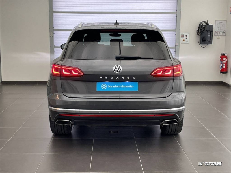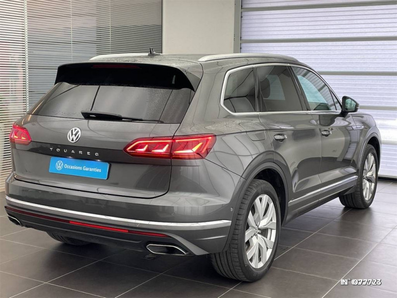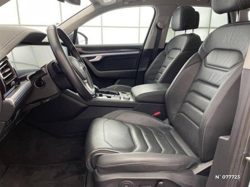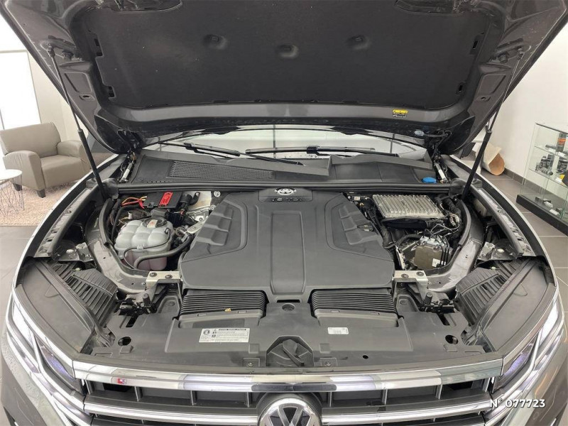 Allumage et extinction automatique des phares par détecteur d' obscurité / Verrouillage automatique des portières au démarrage, programmable en fonction de la vitesse et désactivable / Applications décoratives métallisées "Anthracite" / EDS / ASR / Accoudoir central réglable vers AV/AR avec 2 vide-poches et porte-bouteille / Inserts décoratifs métallisés Anthracite sur le tableau de bord et les contre-portes AV / Cache-bagages amovible à enrouleur / Système d'aide au stationnement avec radars AV/AR et signal acoustique et sonore / Alarme antivol avec protection volumétrique, sirène indépendante et protection antiremorquage / Direction assistée asservie à la vitesse / Projecteurs (doubles) halogènes et clignotants monoblocs sous vitre transparente / Equipements incomplets / Essuie-glace 'Aéro' et champ de balayage régléélectroniquement, 2 moteurs indépendants / 3 Ceintures de sécurité AR 3 points à enrouleur, réglables en hauteur aux places extérieures / Roue de secours à poids et encombrement réduit, avec compresseur 12V / Sécurité "Enfants" sur les portières AR et les lève-glace électriques AR, sécurité commandée par le conducteur / Rétroviseur intérieur jour/nuit automatique / Radio Delta avec lecteur CD intégré, antenne diversifiée et 10 HP / Verrouillage centralisé avec télécommande à fréquance radio, commande intérieure et détecteur de collision pour ouverture automatique / Paquet Chrome (Touareg, VOLKSWAGEN). / Boîtiers de rétroviseurs extérieurs de la couleur de carrosserie / 4 jantes alliage léger "Canyon" 7,5J x 17" avec écrous antivol, pneus 255/60 R17 / Tapis complémentaires en velours tuftéà l' AV/AR / Climatisation "Climatronic 2C" réglage séparément gauche et droite pour les passagers AV recyclage automatique avec capteur de pollution et touche "Rest" / Eclairage permanent au niveau des pieds AV/AR avec variateur d'intensité; spots de lecture AV/AR; poignées intérieures de portières éclairées / Essuie-glace à cadencement automatique, à 4 niveaux de sensibilité (détecteur de pluie) / Calandre chromée / Etui à lunette sur le pavillon (sauf avec option boussole) / Clignotant de confort (1 impulsion = 3 clignotements) / Commande intérieure électrique pour le déverrouillage du hayon / Transmission à 4 roues motrices permanentes '4X Motion' / Chargeur 6 CD dans le coffre / Baguettes latérales de bas de portes et de contour des vitres chromées / Protection antidémarrage Immotronic agréée SRA 7 clés par les compagnies d'assurance / Alarme d'oubli de ceinture de sécurité des sièges conducteur et passager AV / Banquette AR rabattable asymétriquement avec accoudoir central / Volant à 4 branches en cuir / Porte-boissons à l' AV / Sièges AV électriques confort 12 positions avec sellerie cuir "Cricket" / Système "Coming Home/Leaving Home" / Hayon avec lunette AR relevable séparément / Eclairage et feux extérieurs / 3 Appuie-tête de banquette AR, dont appuie-tête central facilitant la vision / Vide-poches central avec volet de fermeture sur le haut de la planche de bord / Indicateur multifonction MFA sur l' instrumentation avec écran monochrome de 3" / Sélection par le conducteur du déverrouillage des ouvrants / Pommeau de levier de vitesses en cuir avec insert au aluminium / Sièges AV Conforts électriques à réglage 12 Voies / Vide-poches de portières / Vitres AV/AR électriques avec verrouillage enfant et système anti pincement / Volant multifonction gainé de cuir avec commande du régulateur de vitesse, de l'éventuel téléphone d'origine et du menu set up / Rétroviseurs extérieurs électriques et dégivrants à réglage synchronisé, sans angle mort côté conduteur, armateur en aluminium et spot d'éclairage périphérique intégré, escamotables électriquement / Crochet d'attelage escamotable avec déverouillage électrique et assistant aux manoeuvres "Trailer Assist" / Carrosserie entièrement galvanisée garantie 12 ans contre la corrosion d'origine interne / Rampes de pavillon noires / Pare-chocs AR avec barre de seuil chromée / Ceintures de sécurité AV 3 points à enrouleur, réglables en hauteur avec prétensionneurs / Préparation pour fixation de sièges enfants suivants norme Isofix pour les 2 sièges extérieurs de la 2éme rangée / Condamnation "Enfants" des portes AR par commande électrique depuis un interrupteur dans la porte conducteur / 4 oeilletons de fixation chromés dans le coffre / Pares-soleil doubles pour le conducteur et le passager AV avec miroir de courtoisie éclairé sur le frontal