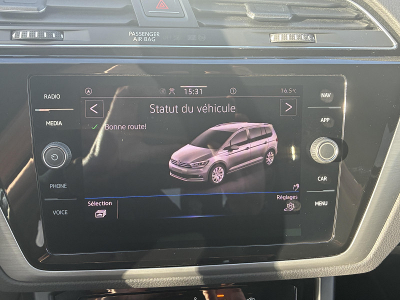 Activation automatique des feux de détresse lors d'un freinage d'urgence / Aide au stationnement AV/AR avec signaux sonores et visualisation de la distance des obstacles sur l'écran / Climatisation automatique "Air Care Climatronic", 3 zones avec filtre anti-allergènes, réglable séparément pour conducteur et passager et les sièges AR / Eclairage à LED de la plaque d'immatriculation AR / Jantes en alliage "Karlstad" 5Jx16"et pneumatiques 205/60 R16 / Rétroviseurs extérieurs électriques, à réglage jour/nuit automatique et asphérique côté conducteur et abaissement côté passager lors d?une marche AR / Système Front Assist : système de freinage automatique en cas de détection d'obstacle / Système Navigation & Infotainment "Discover Media" avec écran tactile 8?? / Système Start/Stop automatique et dispositif de récupération de l'énergie de freinage / 2 ports USB-C compatibles Apple / 2 spots de lecture AV et 2 spots de lecture AR / 7 places / Accoudoir central AV réglable avec compartiment de rangement, porte-gobelet intégré, et prise 12 V pour les passagers AR / Airbags frontaux AV (Airbag passager désactivable par clé) / Airbags rideaux pour 3ème rangée / Airbags rideaux pour les 1ère et 2ème rangées / App-Connect sans fil - affichage et contrôle via l?écran tactile de la voiture, du contenu, des fonctions et des applications compatibles présents sur le Smartphone (compatibilité avec les systèmes Apple CarPlay, Apple CarPlay sans fil, Android Auto, MirrorLink). Seuls les contenus validés et utilisables en «main libre» peuvent fonctionner. / Appuis-tête (3) réglables en hauteur sur la 2ème rangée de sièges / Avertisseur sonore et témoin d'oubli du port de la ceinture de sécuritéà l'AV et témoin d'oubli du port de la ceinture de sécurité pour la 2ème rangée / Boitiers des rétroviseurs extérieurs couleur carrosserie / Calandre noire avec 3 lamelles chromées / Ceintures de sécurité (3) trois points sur la 2ème rangée de sièges / Ceintures de sécurité AV 3 points à enrouleur réglables en hauteur avec prétensionneurs / Compartiment de rangement sous la planche de bord / Compartiment de rangement sur la planche de bord avec trappe / Compartiment de rangement à gauche du volant / Console de pavillon avec un grand compartiment de rangement / Correcteur électronique de trajectoire ESP, système d'antiblocage de roues ABS, blocage électronique de différentiel EDS, antipatinage électronique ASR, régulateur de couple MSR et assistance au contrebraquage / Couvre-coffre enroulable et amovible / Câble adaptateur USB-C vers USB-A / Digital Cockpit / Direction électromécanique à assistance variable en fonction de la vitesse / Dossier du siège passager rabattable (Fold Flat) / Eclairage de jour / Entourage des aérateurs chromées / Essuie-glace AV avec commande d'intermittence / Fatigue Detection : système de détection de fatigue du conducteur qui analyse le comportement du conducteur et recommande un temps de repos par l'apparition d'un message visuel et sonore / Frein à main électrique / Hill-Hold : Assistant au démarrage en côte grâce à une fonction anti-recul / Interface téléphone Confort avec chargeur induction / Kit de réparation pour crevaison (compresseur 12 V et bombe anti-crevaison) / Lane Assist: Assistant de maintien dans la voie / Mesures de protection des piétons et des cyclistes étendues / Miroir de courtoisie éclairé sur les pare-soleil / Oeilletons de fixation (4) dans le coffre / Pare-chocs peints dans la couleur de carrosserie / Plancher de coffre modulable / Poignées de portes couleur carrosserie / Porte-bouteille dans toutes les portes (1,5 L à l?AV et 1 L à l?AR) / Pre Safe Assist - Système proactif de protection des passagers / Prise 12 V dans la console centrale AR / Prise 12 V dans le coffre / Projecteurs antibrouillard AV avec éclairage statique d'intersection / Préparation pour "VW Connect" et "VW Connect Plus" vous permet d?obtenir des informations sur votre véhicule directement sur votre smartphone. Accès au concessionnaire Volkswagen le plus proche, Aperçu de toutes les données de votre véhicule et des prochaines maintenances à effectuer, Application totalement gratuite et facile à utiliser, Produit 100% compatible avec votre Volkswagen et garantie constructeur préservée, Sécurité totale des données grâce à un cryptage / Préparation pour fixation de sièges enfants suivant norme "Isofix" pour tous les 3 sièges de la 2ème rangée / Rampe de pavillon anodisées / Service d'appel d'urgence / Side Assist : assistance de changement de voie avec détecteurs d?angle mort / Sièges AV Confort réglables en hauteur avec réglage lombaire / Sièges individuels (3) de la 2ème rangée réglables en longueur (200 mm) et rabattables / Système de protection évitant l'utilisation d'un mauvais carburant / Tablette pliable au dos des sièges conducteur et passager AV / Tapis de sol / Tiroir sous les sièges AV / Triangle de présignalisation / Verrouillage centralisé avec télécommande à fréquence radio par clé rétractable / XDS : Système agissant comme un différentiel autobloquant électronique permettant une meilleure motricité en courbe grâce à une répartition optimale de la puissance et du couple sur les roues AV