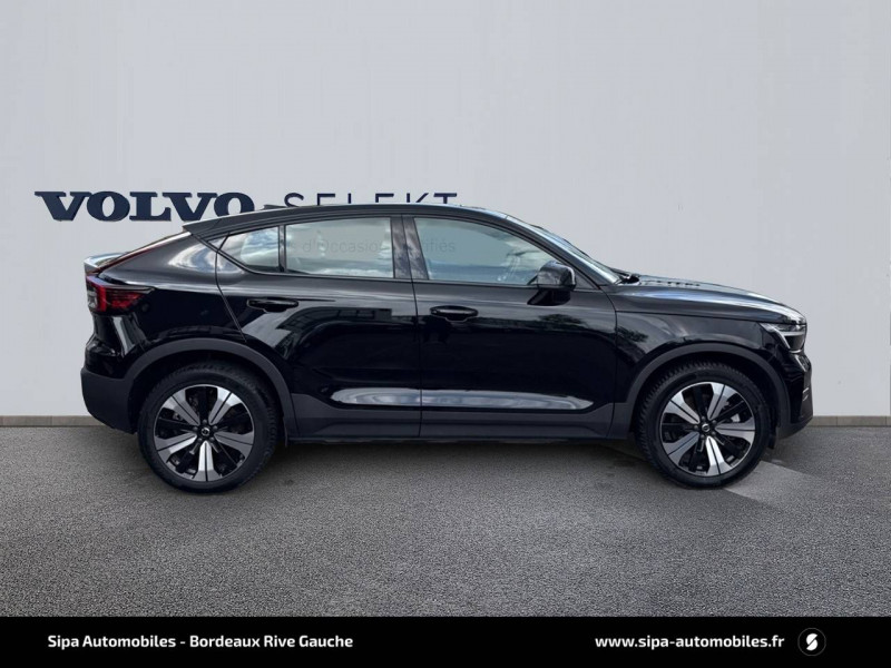Alerte automatique au service d´urgence Volvo, en cas de collision / City Safety, système d'anticipation de collision intelligent Détection des véhicules, cyclistes, piétons et grands animaux avec freinage automatique à pleine puissance, Détection des véhicules aux intersections avec freinage automatique à pleine puissance, Avertissement lumineuse et sonore, Préparation des freins et ceintures de sécurité AV / CleanZone : Filtre à charbon de climatisation multi-actif / Climatisation automatique bi-zone (incluant ouïes d'aération à l'AR) / Commande vocale avancée (climatisation, médias, téléphone, eManuel utilisateur et navigation) / Déclenchement automatique des feux de detresse lors d'un freinage d'urgence / Fonction climatisation de l'habitacle moteur coupé / Frein de parking électronique automatique avec fonction Auto Hold (désactivable) / Freinage automatique post-collision (réduction du risque de suraccident) / Jantes alliage 19" 10 branches Graphite Mat / Diamant / Phares LED avec feux de jour design marteau de Thor et feux de route adaptatifs / Pommeau de levier de vitesses gainé Simili-Cuir / Pré-câblage électrique pour le crochet d'attelage / Seuils de coffre Aluminium / Seuils de portes AV Volvo en Aluminium / Télécommande de verrouillage centralisé avec clé contact integrée, fermeture à distance des vitres et du toit ouvrant et fonction panique (déclenchement du klaxon et des feux de détresse) / Verrouillage automatique des portes à partir de 7 km/h / Volant sport en Simili-Cuir avec insert Aluminium / 2 porte-cintres / Accès au service d'assistance Volvo via bouton dédié / Accès au service d'urgence Volvo via bouton SOS dans le plafonnier / Airbag passager désactivable avec témoin d'indication (on/off) / Airbags conducteur et passager à déclenchement différencié / Alerte vigilance conducteur (Driver Alert Control) Informe le conducteur lorsque le système remarque qu'il est nécessaire de porter plus d'attention sur le trafic ou que la conduite semble anormale. Si le conducteur ne réagit pas, alors le véhicule pourra effectuer un arrêt de sécurité / Application Volvo Cars / Assise des sièges AV extensible manuellement / Assistance à l'évitement des piétons et des cyclistes / Badge Recharge ou Recharge Twin sur le hayon / Bas de caisse et passages de roues Anthracite / Calandre AV pleine couleur carrosserie / Ceintures de sécuritéà inertie à 3 points d'ancrage (sur les 5 sièges) / Coffre sous le capot AV d'une capacité de 31 litres / Combiné d'instruments digital 12,3" personnalisable, nouvelle génération / Contrôle de la transmission en descente HDC / Coques de rétroviseurs Noir Brillant / Corbeille intégrée et amovible au niveau du tunnel central AV / Crochet pour sacs intégréà la boîte à gants / Câble de recharge de 7 mètres / 10 A. Pour prise secteur / Deuxième câble de recharge Type 2, 4, 5 mètres, 32 A triphasé (fonctionne également en monophasé) Pour borne de recharge / Diffuseur AR Noir Laqué / Direction assistée électrique asservie à la vitesse / Eclairage d'approche et d'accompagnement / Ecran tactile multimédia haute résolution 9", personnalisable / Espace de rangement sous la console centrale / Freins à disques à l'AV et à l'AR / Gravure Recharge sur les montants AR / Incrustations Origin / Indicateur de perte de pression des pneus / Infotainment Google Android Chargeur de téléphone par induction,Services Google, Assistant, Google Play Store, chargeur smartphone par induction et kit mains libres Bluetooth, Streaming Audio, mode d'emploi numérique du véhicule, réception de la radio numérique (DAB+), mises à jour Over the Air (OTA) / Kit anticrevaison / Matériaux anti-allergènes dans l'habitacle / Miroirs de courtoisie éclairés, spots de lecture à l'AV et éclairage dans le coffre / Mise à jour du système à distance / Pare-brise en verre feuilleté et colonne de direction rétractable en cas de choc / Parties inférieures des vitres Noir brillant / Pneus toutes saisons / Port de recharge sur l'aile AR gauche et connecteur charge rapide (jusqu'à 150 kW) / Porte-cartes bancaires et cartes de services intégré dans la planche de bord / Protections de pare-chocs AV et AR Noir brillant / Préparation pour fixations Isofix (places latérales de la deuxième rangée de sièges) / Rappel d'oubli de bouclage de ceinture de sécurité AV et AR / Réglage en hauteur manuel des ceintures AV / Rétroviseurs intérieur (sans contour) et extérieur électrochrome / Sabots de protection AV et AR Noir / Sonde de température extérieure et horloge / Système audio Volvo High Performance avec technologie air woofer au niveau de la console centrale : 250 W, 8 HP, radio numérique terrestre, prise 12 V et 2 ports USB C à l'AV / Système de contrôle de la stabilité et de la traction STC / Système de contrôle du freinage du véhicule VDC / Système de protection anti-sortie de route / Système de protection contre le coup du lapin WHIPS (sièges AV) / Système de protection contre les chocs latéraux SIPS / Système de protection en cas de sortie de route : Ceintures de sécurité actives à prétensionneurs, Assise des sièges AV à absorption d'énergie, Pédale de frein rétractable en cas de collision frontale / Système de préconditionnement de l'habitacle (chauffage) / Système de réglage en hauteur des phares / Système intelligent d'informations au conducteur IDIS / Tapis de sol premium / Trousse de premiers secours et triangle de présignalisation / Tunnel de la console centrale Noir brillant / Verrouillage de sécurité enfant manuel / Vitres AV et AR électriques à impulsion (montée et descente) avec système anti-pincement