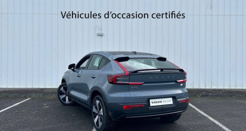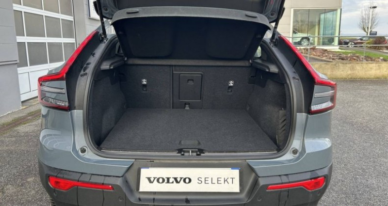 VOLVO C40 Recharge Extended Range 252 ch 1EDT Start, coupé, gris, 5 portes, première mise en circulation le 21/02/2023, garantie : 12 mois. Prix TTC : 28 880 € Prix HT : 24 066 € La TVA est récupérable sur ce véhicule. 5 places, couleur intérieur : Tissu City Canvas Anthracite, ambia OPTIONS ET ÉQUIPEMENTS : Audio - Télécommunications : - Connexion Bluetooth Conduite : - Assistance au demarrage en côte - Contrôle de la stabilité au roulis RSC Couleur : - Peinture Métallisée Gris Brume Extérieur : - Caméra de recul - Diffuseur AR Noir Laqué - Feux de freinage d'urgence - Jantes alliage 19 10 branches Graphite Mat / Diamant - Pré-câblage électrique pour le crochet d'attelage - Radars de stationnement AV et AR - Rappels de clignotant à LED intégrés aux rétroviseurs extérieurs - Rétroviseurs extérieurs rabattables électriquement - Toit panoramique fixe Intérieur : - Climatisation automatique bi-zone (incluant ouïes d'aération à l'AR) - Commandes audio au volant - Direction assistée électrique asservie à la vitesse - Dossier de la banquette AR rabattable 60/40 - Ordinateur de bord - Pommeau de levier de vitesses gainé Simili-Cuir - Rétroviseurs intérieur (sans contour) et extérieur électrochrome - Sonde de température extérieure et horloge - Volant réglable en hauteur et en profondeur Pack : - Appuie-tête sur chaque siège, réglable en hauteur - Assise des sièges AV extensible manuellement - Bas de caisse et passages de roues Anthracite - Bouton de verrouillage centralisé - Calandre AV pleine couleur carrosserie - Chargeur de téléphone par induction - CleanZone : Filtre à charbon de climatisation multi-actif - Combiné d'instruments digital 12,3 personnalisable, nouvelle génération - Coques de rétroviseurs Noir Brillant - Câble de recharge de 7 mètres / 10 A. Pour prise secteur - Détecteur de pluie et allumage automatique des feux - Espace de rangement sous la console centrale - Freins à disques à l'AV et à l'AR - Limiteur et régulateur de vitesse - Pneus toutes saisons - Rétroviseur extérieur conducteur grand angle - Seuils de coffre Aluminium - Seuils de portes AV Volvo en Aluminium - Système de protection anti-sortie de route - Tapis de sol premium - Trousse de premiers secours et triangle de présignalisation - Verrouillage de sécurité enfant manuel Sécurité : - Airbag de genoux conducteur - Airbag passager désactivable avec témoin d'indication (on/off) - Airbags latéraux conducteur et passager - Airbags rideaux - Alerte franchissement de ligne active - Contrôle de la transmission en descente HDC - Feu antibrouillard AR - Indicateur de perte de pression des pneus - Kit anticrevaison - Phares antibrouillard AV - Reconnaissance des panneaux de signalisation - Système de protection collision frontale Autres équipements et informations : - 2 porte-cintres - Accès au service d'assistance Volvo via bouton dédié - Accès au service d'urgence Volvo via bouton SOS dans le plafonnier - Airbags conducteur et passager à déclenchement différencié - Alerte automatique au service d´urgence Volvo, en cas de collision - Alerte vigilance conducteur (Driver Alert Control) Informe le conducteur lorsque le système remarque qu'il est nécessaire de porter plus d'attention sur le trafic ou que la conduite semble anormale. Si le conducteur ne réagit pas, alors le véhicule pourra effectuer un arrêt de sécurité - Application Volvo Cars - Assistance à l'évitement des piétons et des cyclistes - Badge Recharge ou Recharge Twin sur le hayon - Ceintures de sécurité à inertie à 3 points d'ancrage (sur les 5 sièges) - City Safety, système d'anticipation de collision intelligent Détection des véhicules, cyclistes, piétons et grands animaux avec freinage automatique à pleine puissance, Détection des véhicules aux intersections avec freinage automatique à pleine puissance, Avertissement lumineuse et sonore, Préparation des freins et ceintures de sécurité AV - Coffre sous le capot AV d'une capacité de 31 litres - Commande vocale avancée (climatisation, médias, téléphone, eManuel utilisateur et navigation) - Corbeille intégrée et amovible au niveau du tunnel central AV - Correcteur électronique de trajectoire ESC - Crochet pour sacs intégré à la boîte à gants - Deuxième câble de recharge Type 2, 4, 5 mètres, 32 A triphasé (fonctionne également en monophasé) Pour borne de recharge - Déclenchement automatique des feux de detresse lors d'un freinage d'urgence - Eclairage d'approche et d'accompagnement - Ecran tactile multimédia haute résolution 9, personnalisable - Fonction climatisation de l'habitacle moteur coupé - Frein de parking électronique automatique avec fonction Auto Hold (désactivable) - Freinage automatique post-collision (réduction du risque de suraccident) - Gravure Recharge sur les montants AR - Incrustations Origin - Infotainment Google Android Chargeur de téléphone par induction,Services Google, Assistant, Google Play Store, chargeur smartphone par induction et kit mains libres Bluetooth, Streaming Audio, mode d'emploi numérique du véhicule, réception de la radio numérique (DAB+), mises à jour Over the Air (OTA) - Matériaux anti-allergènes dans l'habitacle - Miroirs de courtoisie éclairés, spots de lecture à l'AV et éclairage dans le coffre - Mise à jour du système à distance - Pare-brise en verre feuilleté et colonne de direction rétractable en cas de choc - Parties inférieures des vitres Noir brillant - Phares LED avec feux de jour design marteau de Thor et feux de route adaptatifs - Port de recharge sur l'aile AR gauche et connecteur charge rapide (jusqu'à 200 kW) - Porte-cartes bancaires et cartes de services intégré dans la planche de bord - Protections de pare-chocs AV et AR Noir brillant - Préparation pour fixations Isofix (places latérales de la deuxième rangée de sièges) - Rappel d'oubli de bouclage de ceinture de sécurité AV et AR - Réglag