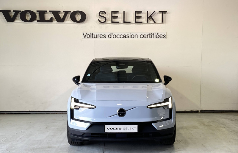 Aide au stationnement automatique nouvelle génération (Park Pilot Assist) Détection des places de parking libres adaptées au véhicule - Affichage du stationnement proposé sur l'écran central - En cas d'acceptation du stationnement proposé le véhicule se garera de lui même - Prise en charge de la direction, des freins et des changements de vitesse Peut être activé jusqu'à 22 km/h / Caméras Surround View (vision panoramique à 360°) incluant caméra AV et caméra de recul / Déclenchement automatique des feux de detresse lors d'un freinage d'urgence / En cas de collision, envoi automatique d'une alerte au service d'urgence Volvo Si un coussin gonflable ou un prétensionneur de ceinture de sécurité est déclenché lors d'une collision, une alerte est automatiquement envoyée au service d'urgence Volvo. Valable pendant 10 ans. / Fonction climatisation de l'habitacle moteur coupé / Fonctions d'intervention sur la direction aide au maintien dans la voie de 65 à 140 km/h, détection du risque de collision frontale en cas de chevauchement de voie du véhicule venant en sens inverse, Aide à diriger la voiture dans une trajectoire qui réduira le risque de sortie de route et si cela ne suffit pas, le système peut également intervenir en freinant pour réduire la vitesse / Frein de parking électronique automatique avec fonction Auto Hold (désactivable) / Jantes alliage 19'' 5 branches Noir / Diamant avec inserts aérodynamiques et pneus été 245/45 R19 / Phares LED avec feux de jour design marteau de Thor et feux de route adaptatifs / Pré-câblage électrique pour le crochet d'attelage / Système d'aide à la vigilance (ou Driver Awareness) Surveillance anti-angle mort BLIS, - Assistance au changement de file, - Alerte trafic en marche arrière, - Alerte collision arrière avec action corrective, - Alerte sortie sécurisée à l'ouverture d'une portière, - Freins actifs à l'arrêt, - Ceintures de sécurité avant avec système de prévention à la collision (serrage automatique) / Système de contrôle de la qualité de l'air avec fonction CleanAir Filtre à charbon de climatisation multi-actif (limite l'entrée de pollen, de particules de pollution et des mauvaises odeurs en fermant automatiquement les arrivées d'air). La fonction CleanAir recycle l'air de l'habitacle. / 2 cartes de verrouillage et déverrouillage du véhicule / 2 prises USB type-C aux places AR / 2 prises USB type-C AV / Accès au service d'assistance Volvo via bouton dédié dans le plafonnier / Accès au service d'urgence Volvo via bouton SOS dans le plafonnier / Airbag passager désactivable avec témoin d'indication (on/off) / Airbags latéraux droit et gauche pour le conducteur et droit pour le passager AV / Alerte vigilance conducteur (Driver Alert Control) Informe le conducteur lorsque le système remarque qu'il est nécessaire de porter plus d'attention sur le trafic ou que la conduite semble anormale. Si le conducteur ne réagit pas, alors le véhicule pourra effectuer un arrêt de sécurité / Application Volvo EX30 sur smartphone (iOS et Android) / Assistance à l'anticipation et à l'atténuation des collisions avec le freinage et la direction véhicule circulant avec écart de vitesse jusqu'à 60 km/h. Détection des piétons, cyclistes, scooters. Freinage en cas d'inattention et arrêt en toute sécurité en fonction de la compréhension de l'état du conducteur / Avertisseur sonore d'approche Le véhicule émettra un son subtil mais audible lorsqu'il est conduit à basse vitesse dans le but d'avertir notamment les piétons et les cyclistes. / Bouton de verrouillage centralisé sur l'accoudoir central AV / Calandre AV pleine couleur carrosserie / Ceintures de sécuritéà inertie à 3 points d'ancrage (sur les 5 sièges) / Chargeur embarqué 22 kW / Chargeur embarqué Puissance de charge maximale de 11 kW (courant alternatif).Puissance de charge maximale de 155 kW (courant continu) / Coffre sous le capot AV d'une capacité de 7 litres / Compartiment de rangement entre les sièges AV / Conduite à une pédale ou One Pedal Drive Une seule pédale vous permet de profiter d'une expérience de conduite encore plus intuitive (fonction désactivable). / Contrôle de la transmission en descente HDC / Coques de rétroviseurs Noir Laqué / Câble de recharge Type 2, 32 A triphasé (fonctionne également en monophasé) Pour borne de recharge / Direction assistée électrique asservie à la vitesse / Eclairage d'ambiance personnalisable selon 5 ambiances - Forêt, Crépuscule, Aurores Boréales, Archipel, Été / Eclairage d'approche et d'accompagnement / Espace de rangement sous l'écran central / Espaces de rangement dans les contre-portes / Espaces de rangement entre les deux sièges AV / Freins à disques 17" ventilés à l'AV et à l'AR / Grand écran central flottant 12,3 / Incrustations Denim recyclé / Indicateur de perte de pression des pneus / Kit anticrevaison / Miroirs de courtoisie éclairés, spots de lecture à l'AV et éclairage dans le coffre / Mise à jour du système à distance (Over The Air ou OTA) / Ouverture des portes sans clé Keyless Entry / Pare-brise en verre feuilleté et colonne de direction rétractable en cas de choc / Parties inférieures des vitres Noir brillant / Pilot Assist Lecture des marquages au sol, Observation de la circulation et des autres véhicules, Assistance avec adaptation de la vitesse, Action sur la direction afin de maintenir le véhicule centré dans sa voie avec un maintien de la distance de sécurité avec le véhicule qui précède, Assistance lorsqu'un changement de voie est nécessaire, peut être activé jusqu'à 130 km/h / Plancher de coffre amovible / Pompe à chaleur permet principalement d'économiser la puissance de la batterie. / Port de recharge sur l'aile AR gauche et connecteur charge rapide / Porte-gobelets AV / Prise 12 V dans le coffre / Préparation pour fixations Isofix (places latérales de la deuxième rangée de sièges) / R