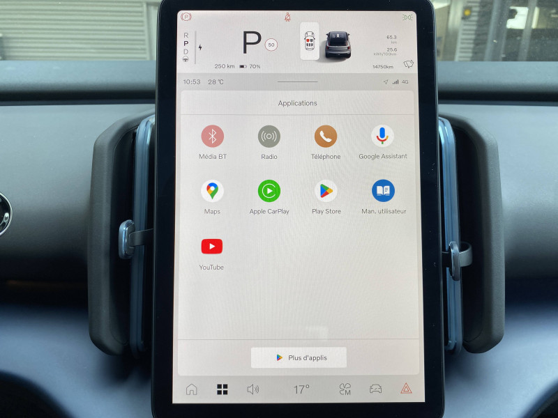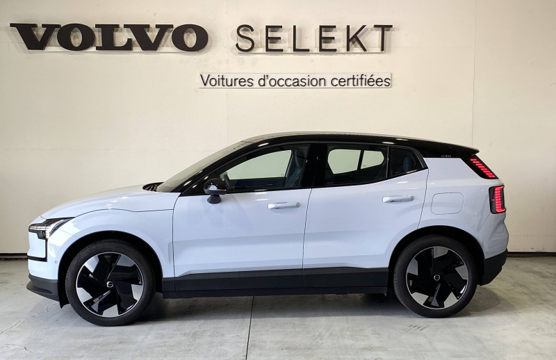 2 cartes de verrouillage et déverrouillage du véhicule / 2 prises USB type-C aux places AR / 2 prises USB type-C AV / Accès au service d'assistance Volvo via bouton dédié dans le plafonnier / Accès au service d'urgence Volvo via bouton SOS dans le plafonnier / Aide au stationnement automatique nouvelle génération (Park Pilot Assist) Détection des places de parking libres adaptées au véhicule - Affichage du stationnement proposé sur l'écran central - En cas d'acceptation du stationnement proposé le véhicule se garera de lui même - Prise en charge de la direction, des freins et des changements de vitesse Peut être activé jusqu'à 22 km/h / Airbag passager désactivable avec témoin d'indication (on/off) / Airbags latéraux droit et gauche pour le conducteur et droit pour le passager AV / Alerte vigilance conducteur (Driver Alert Control) Informe le conducteur lorsque le système remarque qu'il est nécessaire de porter plus d'attention sur le trafic ou que la conduite semble anormale. Si le conducteur ne réagit pas, alors le véhicule pourra effectuer un arrêt de sécurité / Application Volvo EX30 sur smartphone (iOS et Android) / Assistance à l'anticipation et à l'atténuation des collisions avec le freinage et la direction véhicule circulant avec écart de vitesse jusqu'à 60 km/h. Détection des piétons, cyclistes, scooters. Freinage en cas d'inattention et arrêt en toute sécurité en fonction de la compréhension de l'état du conducteur / Avertisseur sonore d'approche Le véhicule émettra un son subtil mais audible lorsqu'il est conduit à basse vitesse dans le but d'avertir notamment les piétons et les cyclistes. / Bouton de verrouillage centralisé sur l'accoudoir central AV / Câble de recharge Type 2, 32 A triphasé (fonctionne également en monophasé) Pour borne de recharge / Calandre AV pleine couleur carrosserie / Caméras Surround View (vision panoramique à 360°) incluant caméra AV et caméra de recul / Ceintures de sécuritéà inertie à 3 points d'ancrage (sur les 5 sièges) / Chargeur embarqué 22 kW / Chargeur embarqué Puissance de charge maximale de 11 kW (courant alternatif).Puissance de charge maximale de 155 kW (courant continu) / Coffre sous le capot AV d'une capacité de 7 litres / Compartiment de rangement entre les sièges AV / Conduite à une pédale ou One Pedal Drive Une seule pédale vous permet de profiter d'une expérience de conduite encore plus intuitive (fonction désactivable). / Contrôle de la transmission en descente HDC / Coques de rétroviseurs Noir Laqué / Déclenchement automatique des feux de detresse lors d'un freinage d'urgence / Direction assistée électrique asservie à la vitesse / Eclairage d'ambiance personnalisable selon 5 ambiances - Forêt, Crépuscule, Aurores Boréales, Archipel, Été / Eclairage d'approche et d'accompagnement / En cas de collision, envoi automatique d'une alerte au service d'urgence Volvo Si un coussin gonflable ou un prétensionneur de ceinture de sécurité est déclenché lors d'une collision, une alerte est automatiquement envoyée au service d'urgence Volvo. Valable pendant 10 ans. / Espace de rangement sous l'écran central / Espaces de rangement dans les contre-portes / Espaces de rangement entre les deux sièges AV / Fonction climatisation de l'habitacle moteur coupé / Fonctions d'intervention sur la direction aide au maintien dans la voie de 65 à 140 km/h, détection du risque de collision frontale en cas de chevauchement de voie du véhicule venant en sens inverse, Aide à diriger la voiture dans une trajectoire qui réduira le risque de sortie de route et si cela ne suffit pas, le système peut également intervenir en freinant pour réduire la vitesse / Frein de parking électronique automatique avec fonction Auto Hold (désactivable) / Freins à disques 17" ventilés à l'AV et à l'AR / Grand écran central flottant 12,3 / Incrustations Denim recyclé / Indicateur de perte de pression des pneus / Jantes alliage 19'' 5 branches Noir / Diamant avec inserts aérodynamiques et pneus été 245/45 R19 / Kit anticrevaison / Miroirs de courtoisie éclairés, spots de lecture à l'AV et éclairage dans le coffre / Mise à jour du système à distance (Over The Air ou OTA) / Ouverture des portes sans clé Keyless Entry / Pare-brise en verre feuilleté et colonne de direction rétractable en cas de choc / Parties inférieures des vitres Noir brillant / Phares LED avec feux de jour design marteau de Thor et feux de route adaptatifs / Pilot Assist Lecture des marquages au sol, Observation de la circulation et des autres véhicules, Assistance avec adaptation de la vitesse, Action sur la direction afin de maintenir le véhicule centré dans sa voie avec un maintien de la distance de sécurité avec le véhicule qui précède, Assistance lorsqu'un changement de voie est nécessaire, peut être activé jusqu'à 130 km/h / Plancher de coffre amovible / Pompe à chaleur permet principalement d'économiser la puissance de la batterie. / Port de recharge sur l'aile AR gauche et connecteur charge rapide / Porte-gobelets AV / Pré-câblage électrique pour le crochet d'attelage / Préparation pour fixations Isofix (places latérales de la deuxième rangée de sièges) / Prise 12 V dans le coffre / Rappel d'oubli de bouclage de ceinture de sécurité AV et AR / Réglage en hauteur manuel des ceintures AV / Régulateur adaptatif de vitesse et de distance ACC / Rétroviseur extérieur conducteur et rétroviseur intérieur électrochromes / Rétroviseur intérieur jour/nuit manuel / Rétroviseurs extérieurs sans contours couleur carrosserie avec partie inférieure noir / Sellerie Marine / Séquence lumineuse d'approche / Siège conducteur à réglages électriques avec réglages lombaires et fonction mémoire / Siège passager AV à réglages électriques / Sièges conducteur et passager avec réglage manuel de l'inclinaison du dossier et de l'assise / Sièges conducteur et passager avec s