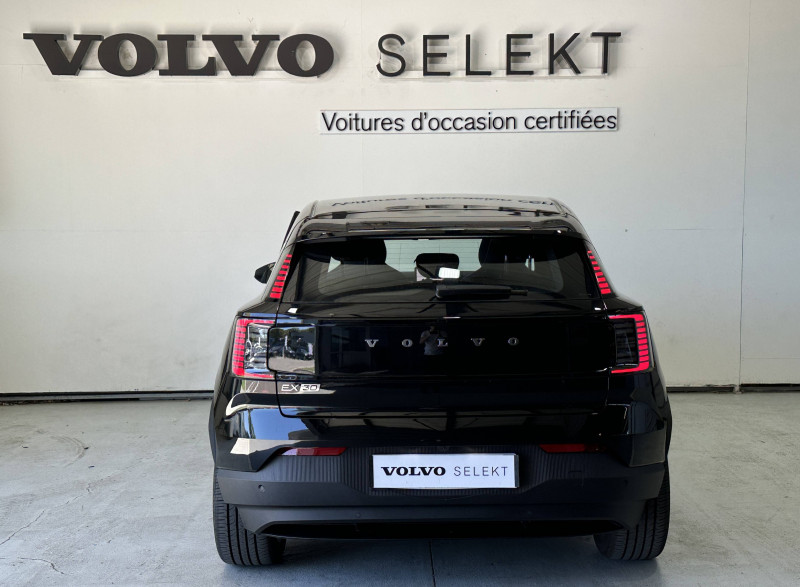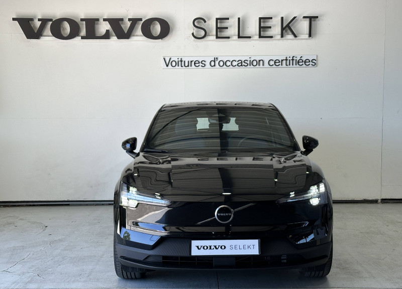 Déclenchement automatique des feux de detresse lors d'un freinage d'urgence / En cas de collision, envoi automatique d'une alerte au service d'urgence Volvo Si un coussin gonflable ou un prétensionneur de ceinture de sécurité est déclenché lors d'une collision, une alerte est automatiquement envoyée au service d'urgence Volvo. Valable pendant 10 ans. / Fonction climatisation de l'habitacle moteur coupé / Fonctions d'intervention sur la direction aide au maintien dans la voie de 65 à 140 km/h, détection du risque de collision frontale en cas de chevauchement de voie du véhicule venant en sens inverse, Aide à diriger la voiture dans une trajectoire qui réduira le risque de sortie de route et si cela ne suffit pas, le système peut également intervenir en freinant pour réduire la vitesse / Frein de parking électronique automatique avec fonction Auto Hold (désactivable) / Jantes alliage 19" 5 branches Noir / Diamant avec inserts aérodynamiques 245/45 R19 / Phares LED avec feux de jour design marteau de Thor et feux de route adaptatifs / Pré-câblage électrique pour le crochet d'attelage / Système d'aide à la vigilance (ou Driver Awareness) Surveillance anti-angle mort BLIS, Assistance au changement de file, Alerte trafic en marche AR, Alerte collision AR avec action corrective, Alerte sortie sécurisée à l'ouverture d'une portière, Freins actifs à l'arrêt, / Système de contrôle de la qualité de l'air avec fonction CleanAir Filtre à charbon de climatisation multi-actif (limite l'entrée de pollen, de particules de pollution et des mauvaises odeurs en fermant automatiquement les arrivées d'air). La fonction CleanAir recycle l'air de l'habitacle. / 2 cartes de verrouillage et déverrouillage du véhicule / 2 prises USB type-C aux places AR / 2 prises USB type-C AV / Accès au service d'assistance Volvo via bouton dédié dans le plafonnier / Accès au service d'urgence Volvo via bouton SOS dans le plafonnier / Airbag passager désactivable avec témoin d'indication (on/off) / Airbags latéraux droit et gauche pour le conducteur et droit pour le passager AV / Alerte vigilance conducteur (Driver Alert Control) Informe le conducteur lorsque le système remarque qu'il est nécessaire de porter plus d'attention sur le trafic ou que la conduite semble anormale. Si le conducteur ne réagit pas, alors le véhicule pourra effectuer un arrêt de sécurité / Application Volvo EX30 sur smartphone (iOS et Android) / Assistance à l'anticipation et à l'atténuation des collisions avec le freinage et la direction véhicule circulant avec écart de vitesse jusqu'à 60 km/h. Détection des piétons, cyclistes, scooters. Freinage en cas d'inattention et arrêt en toute sécurité en fonction de la compréhension de l'état du conducteur / Avertisseur sonore d'approche Le véhicule émettra un son subtil mais audible lorsqu'il est conduit à basse vitesse dans le but d'avertir notamment les piétons et les cyclistes. / Bouton de verrouillage centralisé sur l'accoudoir central AV / Calandre AV pleine couleur carrosserie / Ceintures de sécuritéà inertie à 3 points d'ancrage (sur les 5 sièges) / Chargeur embarqué Puissance de charge maximale de 11 kW (courant alternatif).Puissance de charge maximale de 155 kW (courant continu) / Coffre sous le capot AV d'une capacité de 7 litres / Compartiment de rangement entre les sièges AV / Conduite à une pédale ou One Pedal Drive Une seule pédale vous permet de profiter d'une expérience de conduite encore plus intuitive (fonction désactivable). / Contrôle de la transmission en descente HDC / Coques de rétroviseurs Noir / Câble de recharge Type 2, 32 A triphasé (fonctionne également en monophasé) Pour borne de recharge / Direction assistée électrique asservie à la vitesse / Eclairage d'ambiance personnalisable selon 5 ambiances - Forêt, Crépuscule, Aurores Boréales, Archipel, Été / Eclairage d'approche et d'accompagnement / Espace de rangement sous l'écran central / Espaces de rangement dans les contre-portes / Espaces de rangement entre les deux sièges AV / Freins à disques 17" à l'AV et à l'AR / Grand écran central flottant 12,3 / Incrustations (planche de bord et portières) Denim recyclé / Indicateur de perte de pression des pneus / Kit anticrevaison / Miroirs de courtoisie, spots de lecture à l'AV et éclairage dans le coffre / Ouverture des portes sans clé Keyless Entry / Pare-brise en verre feuilleté et colonne de direction rétractable en cas de choc / Parties inférieures des vitres Noir brillant / Pilot Assist Lecture des marquages au sol, Observation de la circulation et des autres véhicules, Assistance avec adaptation de la vitesse, Action sur la direction afin de maintenir le véhicule centré dans sa voie avec un maintien de la distance de sécurité avec le véhicule qui précède, Assistance lorsqu'un changement de voie est nécessaire, peut être activé jusqu'à 130 km/h / Plancher de coffre amovible / Pompe à chaleur permet principalement d'économiser la puissance de la batterie. / Port de recharge sur l'aile AR gauche et connecteur charge rapide / Porte-gobelets AV / Prise 12 V dans le coffre / Préparation pour fixations Isofix (places latérales de la deuxième rangée de sièges) / Rappel d'oubli de bouclage de ceinture de sécurité AV et AR / Réglage en hauteur manuel des ceintures AV / Régulateur adaptatif de vitesse et de distance ACC / Rétroviseur extérieur conducteur et rétroviseur intérieur électrochromes / Rétroviseur intérieur jour/nuit manuel / Sièges conducteur et passager avec réglage manuel de l'inclinaison du dossier et de l'assise / Sièges conducteur et passager avec réglage manuel de la hauteur / Sièges conducteur et passager avec supports lombaires fixes / Sonde de température extérieure et horloge / Système audio Premium signé Harman Kardon Les 9 haut-parleurs, dont une iconique barre de son en haut de la console centrale regroupant 5 haut-parleur