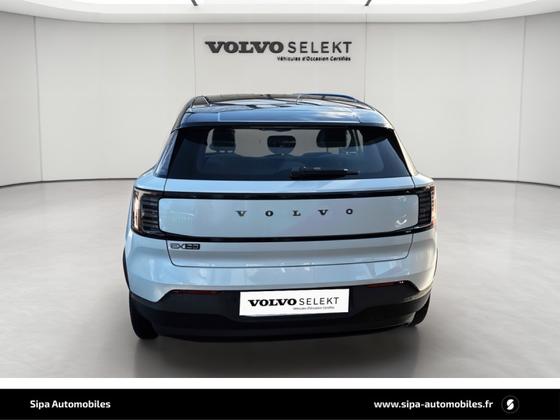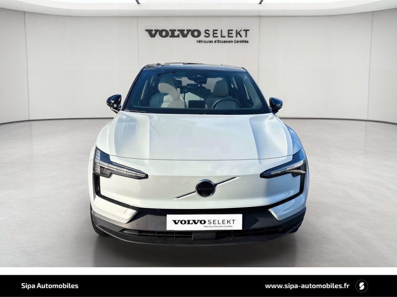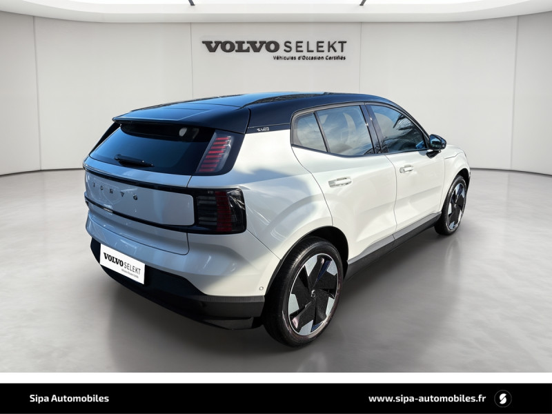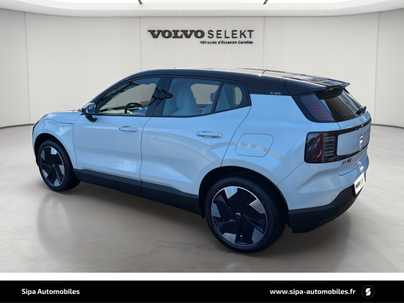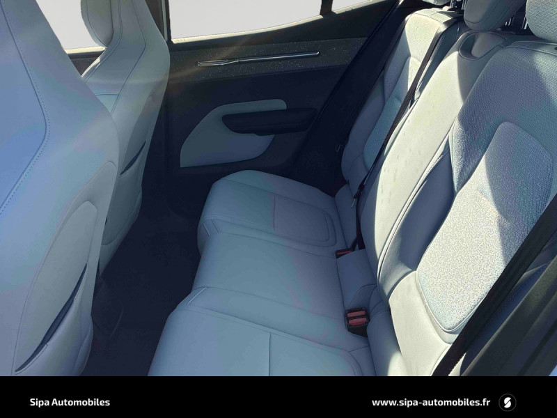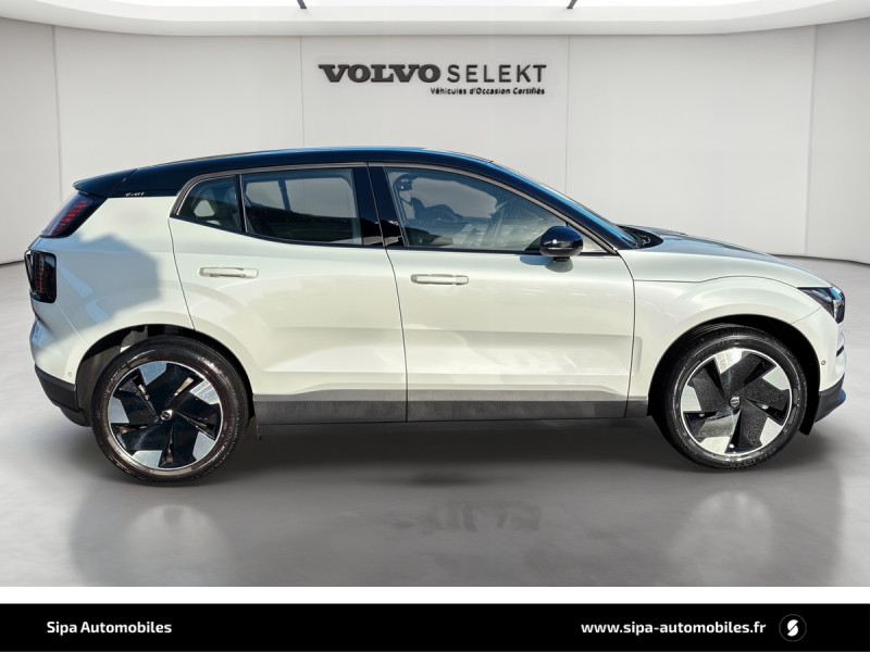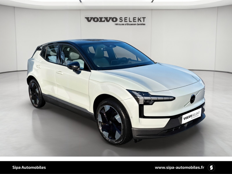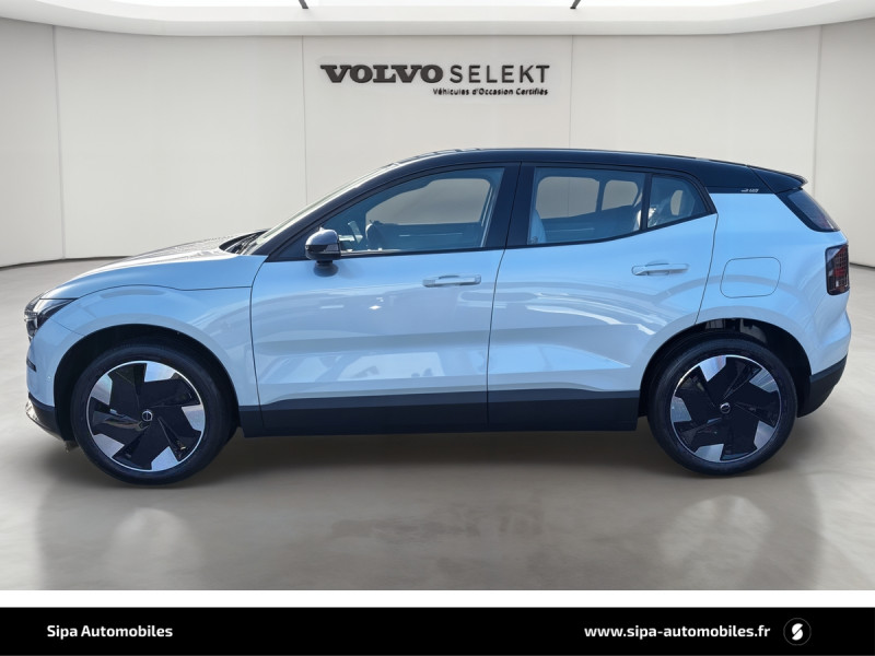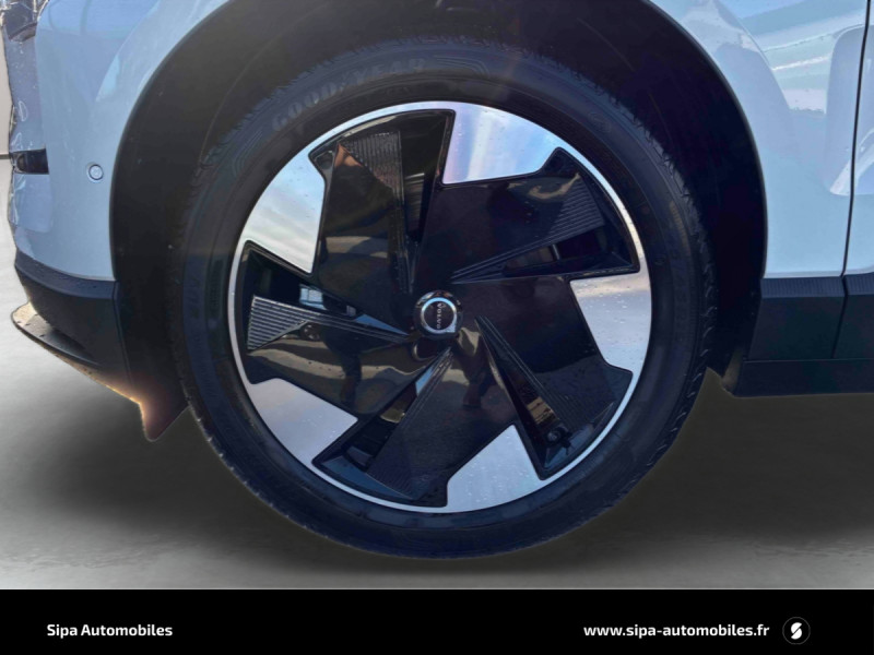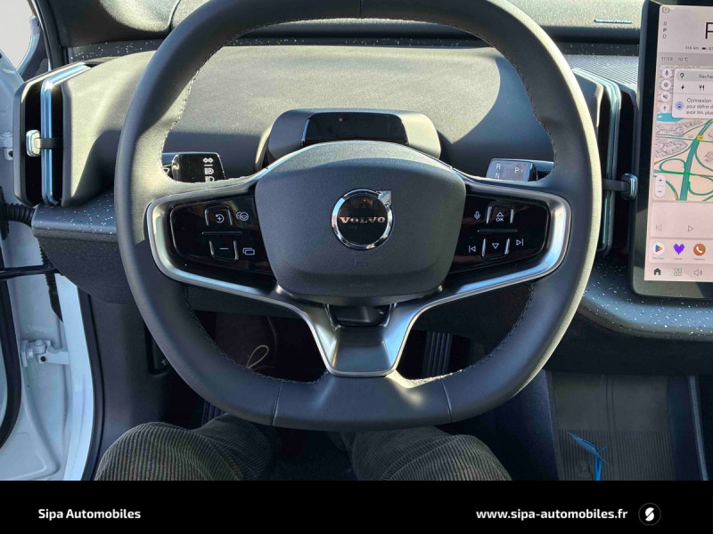 Aide au stationnement automatique nouvelle génération (Park Pilot Assist) Détection des places de parking libres adaptées au véhicule - Affichage du stationnement proposé sur l?écran central - En cas d?acceptation du stationnement proposé le véhicule se garera de lui même - Prise en charge de la direction, des freins et des changements de vitesse Peut être activé jusqu?à 22 km/h / Caméras Surround View (vision panoramique à 360°) incluant caméra AV et caméra de recul / Déclenchement automatique des feux de detresse lors d'un freinage d'urgence / En cas de collision, envoi automatique d'une alerte au service d'urgence Volvo Si un coussin gonflable ou un prétensionneur de ceinture de sécurité est déclenché lors d'une collision, une alerte est automatiquement envoyée au service d'urgence Volvo. Valable pendant 10 ans. / Fonction climatisation de l'habitacle moteur coupé / Fonctions d'intervention sur la direction aide au maintien dans la voie de 65 à 140 km/h, détection du risque de collision frontale en cas de chevauchement de voie du véhicule venant en sens inverse, Aide à diriger la voiture dans une trajectoire qui réduira le risque de sortie de route et si cela ne suffit pas, le système peut également intervenir en freinant pour réduire la vitesse / Frein de parking électronique automatique avec fonction Auto Hold (désactivable) / Jantes alliage 19" 5 branches Noir / Diamant avec inserts aérodynamiques 245/45 R19 / Phares LED avec feux de jour design marteau de Thor et feux de route adaptatifs / Pré-câblage électrique pour le crochet d'attelage / Système de contrôle de la qualité de l?air avec fonction CleanAir Filtre à charbon de climatisation multi-actif (limite l?entrée de pollen, de particules de pollution et des mauvaises odeurs en fermant automatiquement les arrivées d?air). La fonction CleanAir recycle l?air de l?habitacle. / Système d?aide à la vigilance (ou Driver Awareness) Surveillance anti-angle mort BLIS, Assistance au changement de file, Alerte trafic en marche AR, Alerte collision AR avec action corrective, Alerte sortie sécurisée à l?ouverture d?une portière, Freins actifs à l?arrêt, / 2 cartes de verrouillage et déverrouillage du véhicule / 2 prises USB type-C aux places AR / 2 prises USB type-C AV / Accès au service d?assistance Volvo via bouton dédié dans le plafonnier / Accès au service d?urgence Volvo via bouton SOS dans le plafonnier / Airbag passager désactivable avec témoin d'indication (on/off) / Airbags latéraux droit et gauche pour le conducteur et droit pour le passager AV / Alerte vigilance conducteur (Driver Alert Control) Informe le conducteur lorsque le système remarque qu'il est nécessaire de porter plus d'attention sur le trafic ou que la conduite semble anormale. Si le conducteur ne réagit pas, alors le véhicule pourra effectuer un arrêt de sécurité / Application Volvo EX30 sur smartphone (iOS et Android) / Assistance à l'anticipation et à l'atténuation des collisions avec le freinage et la direction véhicule circulant avec écart de vitesse jusqu'à 60 km/h. Détection des piétons, cyclistes, scooters. Freinage en cas d?inattention et arrêt en toute sécurité en fonction de la compréhension de l'état du conducteur / Avertisseur sonore d?approche Le véhicule émettra un son subtil mais audible lorsqu?il est conduit à basse vitesse dans le but d?avertir notamment les piétons et les cyclistes. / Bouton de verrouillage centralisé sur l?accoudoir central AV / Calandre AV pleine couleur carrosserie / Ceintures de sécuritéà inertie à 3 points d'ancrage (sur les 5 sièges) / Chargeur embarqué 22 kW / Chargeur embarqué Puissance de charge maximale de 11 kW (courant alternatif).Puissance de charge maximale de 155 kW (courant continu) / Coffre sous le capot AV d'une capacité de 7 litres / Compartiment de rangement entre les sièges AV / Conduite à une pédale ou One Pedal Drive Une seule pédale vous permet de profiter d?une expérience de conduite encore plus intuitive (fonction désactivable). / Contrôle de la transmission en descente HDC / Coques de rétroviseurs Noir / Câble de recharge Type 2, 32 A triphasé (fonctionne également en monophasé) Pour borne de recharge / Direction assistée électrique asservie à la vitesse / Eclairage d'ambiance personnalisable selon 5 ambiances - Forêt, Crépuscule, Aurores Boréales, Archipel, Été / Eclairage d'approche et d'accompagnement / Espace de rangement sous l?écran central / Espaces de rangement dans les contre-portes / Espaces de rangement entre les deux sièges AV / Freins à disques 17" à l'AV et à l'AR / Grand écran central flottant 12,3 / Incrustations (planche de bord et portières) Denim recyclé / Indicateur de perte de pression des pneus / Kit anticrevaison / Miroirs de courtoisie, spots de lecture à l'AV et éclairage dans le coffre / Ouverture des portes sans clé Keyless Entry / Pare-brise en verre feuilleté et colonne de direction rétractable en cas de choc / Parties inférieures des vitres Noir brillant / Pilot Assist Lecture des marquages au sol, Observation de la circulation et des autres véhicules, Assistance avec adaptation de la vitesse, Action sur la direction afin de maintenir le véhicule centré dans sa voie avec un maintien de la distance de sécurité avec le véhicule qui précède, Assistance lorsqu?un changement de voie est nécessaire, peut être activé jusqu?à 130 km/h / Plancher de coffre amovible / Pompe à chaleur permet principalement d?économiser la puissance de la batterie. / Port de recharge sur l'aile AR gauche et connecteur charge rapide / Porte-gobelets AV / Prise 12 V dans le coffre / Préparation pour fixations Isofix (places latérales de la deuxième rangée de sièges) / Rappel d'oubli de bouclage de ceinture de sécurité AV et AR / Réglage en hauteur manuel des ceintures AV / Régulateur adaptatif de vitesse et de distance ACC / Rétroviseur extérieur conduct