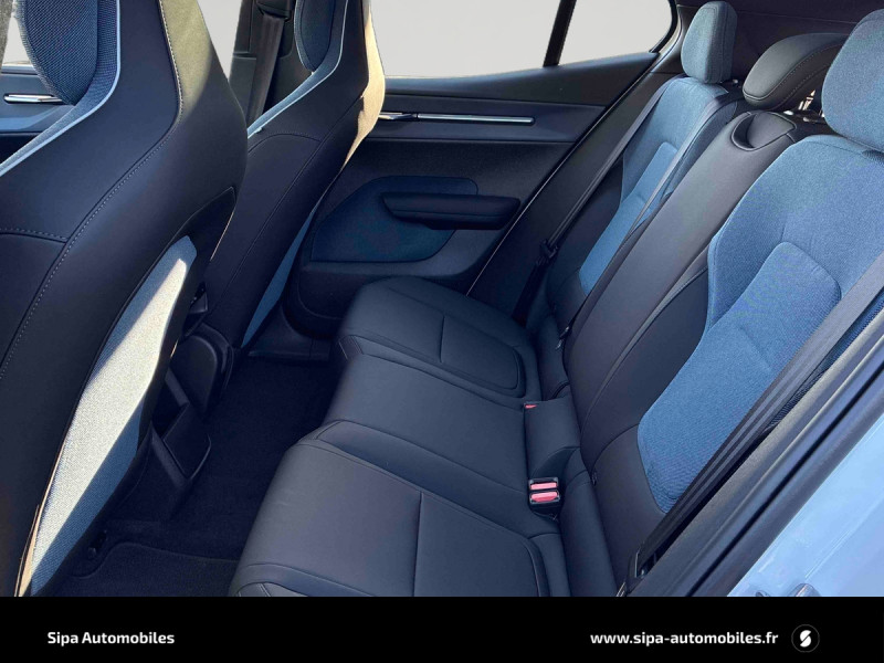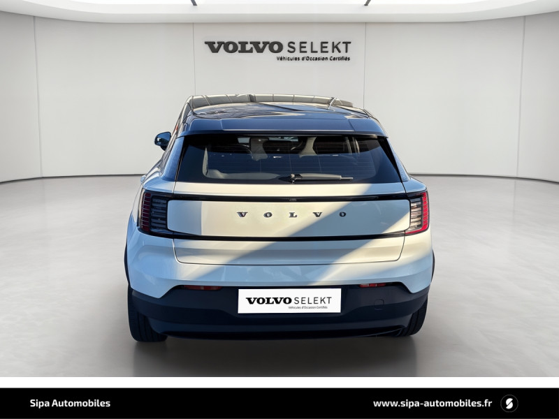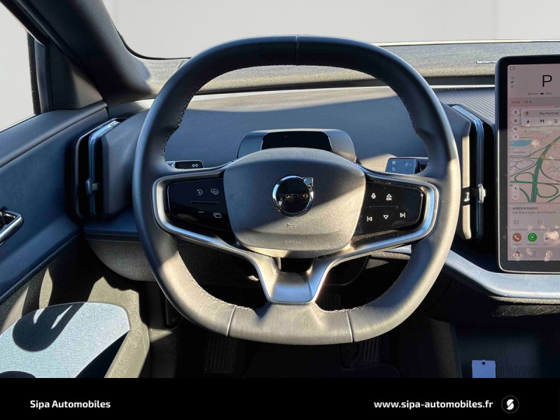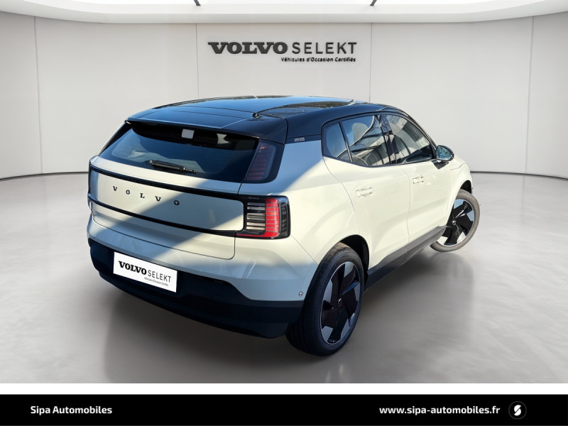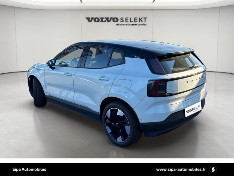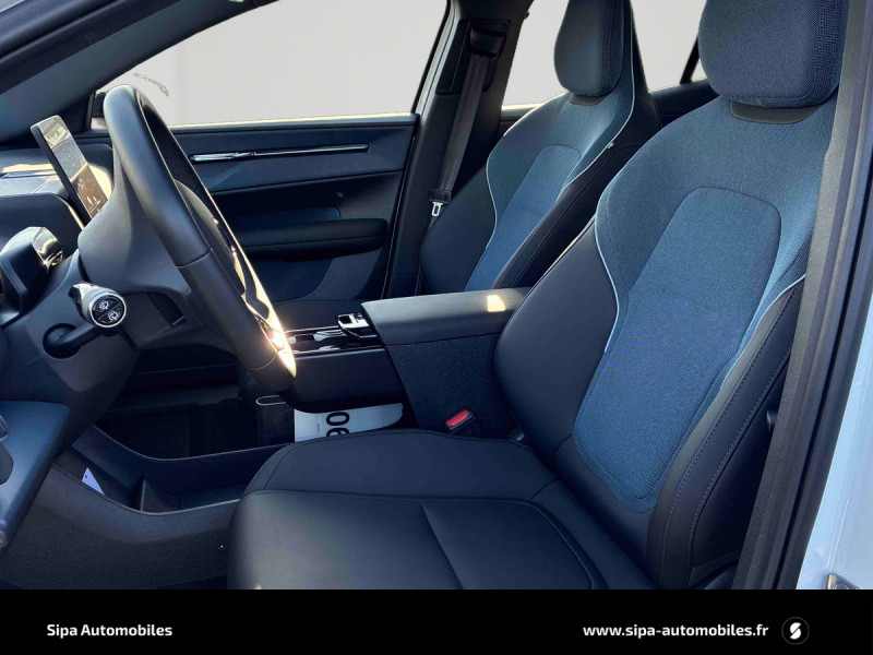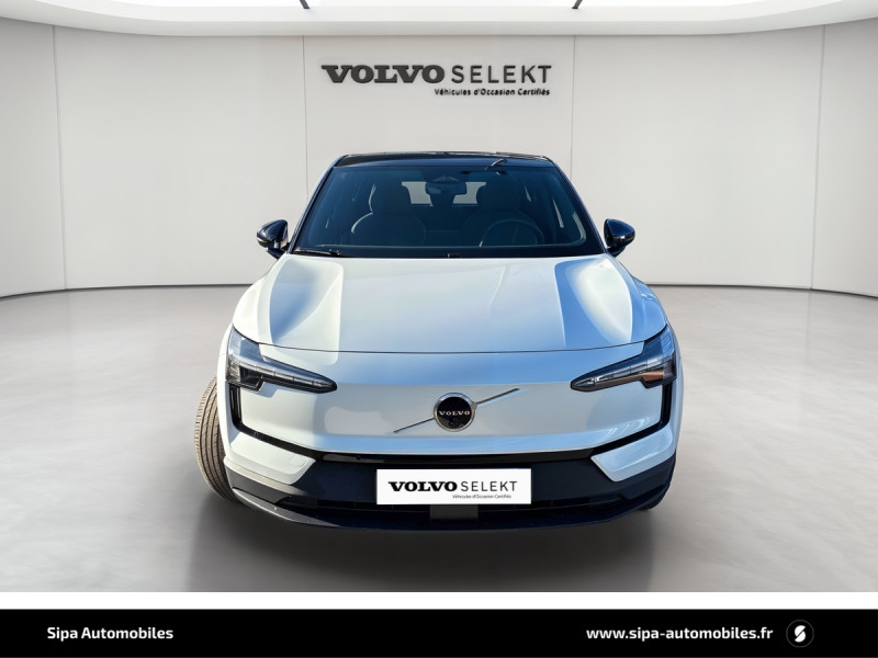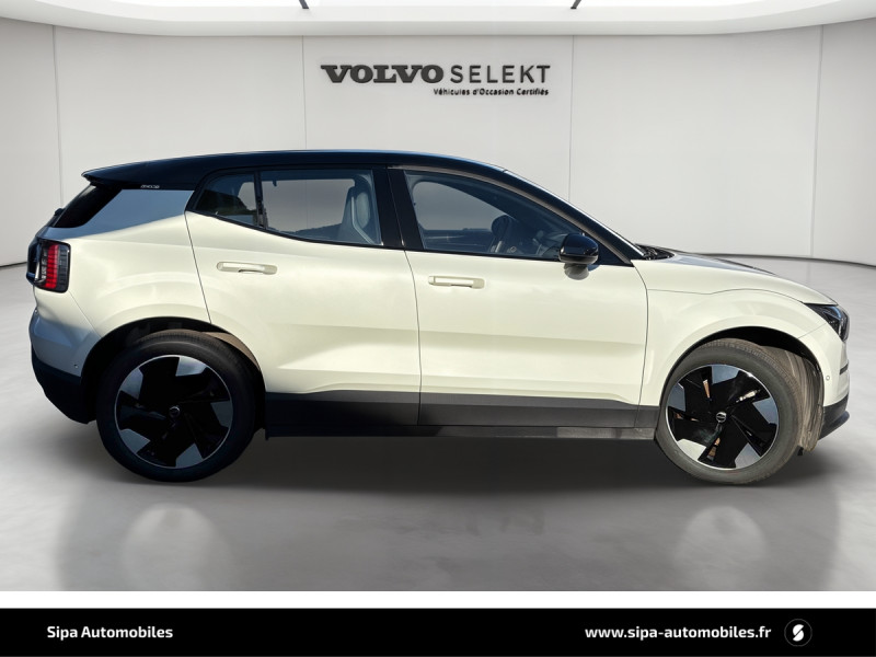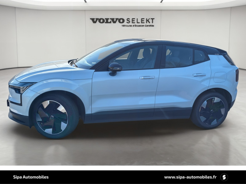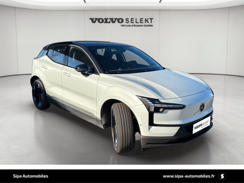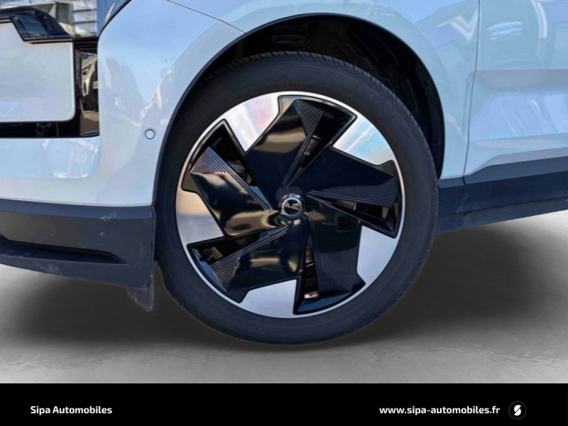 Aide au stationnement automatique nouvelle génération (Park Pilot Assist) Détection des places de parking libres adaptées au véhicule - Affichage du stationnement proposé sur l'écran central - En cas d'acceptation du stationnement proposé le véhicule se garera de lui même - Prise en charge de la direction, des freins et des changements de vitesse Peut être activé jusqu'à 22 km/h / Caméras Surround View (vision panoramique à 360°) incluant caméra AV et caméra de recul / Déclenchement automatique des feux de detresse lors d'un freinage d'urgence / En cas de collision, envoi automatique d'une alerte au service d'urgence Volvo Si un coussin gonflable ou un prétensionneur de ceinture de sécurité est déclenché lors d'une collision, une alerte est automatiquement envoyée au service d'urgence Volvo. Valable pendant 10 ans. / Fonction climatisation de l'habitacle moteur coupé / Fonctions d'intervention sur la direction aide au maintien dans la voie de 65 à 140 km/h, détection du risque de collision frontale en cas de chevauchement de voie du véhicule venant en sens inverse, Aide à diriger la voiture dans une trajectoire qui réduira le risque de sortie de route et si cela ne suffit pas, le système peut également intervenir en freinant pour réduire la vitesse / Frein de parking électronique automatique avec fonction Auto Hold (désactivable) / Jantes alliage 19'' 5 branches Noir / Diamant avec inserts aérodynamiques et pneus été 245/45 R19 / Phares LED avec feux de jour design marteau de Thor et feux de route adaptatifs / Pré-câblage électrique pour le crochet d'attelage / Système d'aide à la vigilance (ou Driver Awareness) Surveillance anti-angle mort BLIS, - Assistance au changement de file, - Alerte trafic en marche arrière, - Alerte collision arrière avec action corrective, - Alerte sortie sécurisée à l'ouverture d'une portière, - Freins actifs à l'arrêt, - Ceintures de sécurité avant avec système de prévention à la collision (serrage automatique) / Système de contrôle de la qualité de l'air avec fonction CleanAir Filtre à charbon de climatisation multi-actif (limite l'entrée de pollen, de particules de pollution et des mauvaises odeurs en fermant automatiquement les arrivées d'air). La fonction CleanAir recycle l'air de l'habitacle. / 2 cartes de verrouillage et déverrouillage du véhicule / 2 prises USB type-C aux places AR / 2 prises USB type-C AV / Accès au service d'assistance Volvo via bouton dédié dans le plafonnier / Accès au service d'urgence Volvo via bouton SOS dans le plafonnier / Airbag passager désactivable avec témoin d'indication (on/off) / Airbags latéraux droit et gauche pour le conducteur et droit pour le passager AV / Alerte vigilance conducteur (Driver Alert Control) Informe le conducteur lorsque le système remarque qu'il est nécessaire de porter plus d'attention sur le trafic ou que la conduite semble anormale. Si le conducteur ne réagit pas, alors le véhicule pourra effectuer un arrêt de sécurité / Application Volvo EX30 sur smartphone (iOS et Android) / Assistance à l'anticipation et à l'atténuation des collisions avec le freinage et la direction véhicule circulant avec écart de vitesse jusqu'à 60 km/h. Détection des piétons, cyclistes, scooters. Freinage en cas d'inattention et arrêt en toute sécurité en fonction de la compréhension de l'état du conducteur / Avertisseur sonore d'approche Le véhicule émettra un son subtil mais audible lorsqu'il est conduit à basse vitesse dans le but d'avertir notamment les piétons et les cyclistes. / Bouton de verrouillage centralisé sur l'accoudoir central AV / Calandre AV pleine couleur carrosserie / Ceintures de sécuritéà inertie à 3 points d'ancrage (sur les 5 sièges) / Chargeur embarqué 22 kW / Chargeur embarqué Puissance de charge maximale de 11 kW (courant alternatif).Puissance de charge maximale de 155 kW (courant continu) / Coffre sous le capot AV d'une capacité de 7 litres / Compartiment de rangement entre les sièges AV / Conduite à une pédale ou One Pedal Drive Une seule pédale vous permet de profiter d'une expérience de conduite encore plus intuitive (fonction désactivable). / Contrôle de la transmission en descente HDC / Coques de rétroviseurs Noir Laqué / Câble de recharge Type 2, 32 A triphasé (fonctionne également en monophasé) Pour borne de recharge / Direction assistée électrique asservie à la vitesse / Eclairage d'ambiance personnalisable selon 5 ambiances - Forêt, Crépuscule, Aurores Boréales, Archipel, Été / Eclairage d'approche et d'accompagnement / Espace de rangement sous l'écran central / Espaces de rangement dans les contre-portes / Espaces de rangement entre les deux sièges AV / Freins à disques 17" ventilés à l'AV et à l'AR / Grand écran central flottant 12,3 / Incrustations Denim recyclé / Indicateur de perte de pression des pneus / Kit anticrevaison / Miroirs de courtoisie éclairés, spots de lecture à l'AV et éclairage dans le coffre / Mise à jour du système à distance (Over The Air ou OTA) / Ouverture des portes sans clé Keyless Entry / Pare-brise en verre feuilleté et colonne de direction rétractable en cas de choc / Parties inférieures des vitres Noir brillant / Pilot Assist Lecture des marquages au sol, Observation de la circulation et des autres véhicules, Assistance avec adaptation de la vitesse, Action sur la direction afin de maintenir le véhicule centré dans sa voie avec un maintien de la distance de sécurité avec le véhicule qui précède, Assistance lorsqu'un changement de voie est nécessaire, peut être activé jusqu'à 130 km/h / Plancher de coffre amovible / Pompe à chaleur permet principalement d'économiser la puissance de la batterie. / Port de recharge sur l'aile AR gauche et connecteur charge rapide / Porte-gobelets AV / Prise 12 V dans le coffre / Préparation pour fixations Isofix (places latérales de la deuxième rangée de sièges) / R