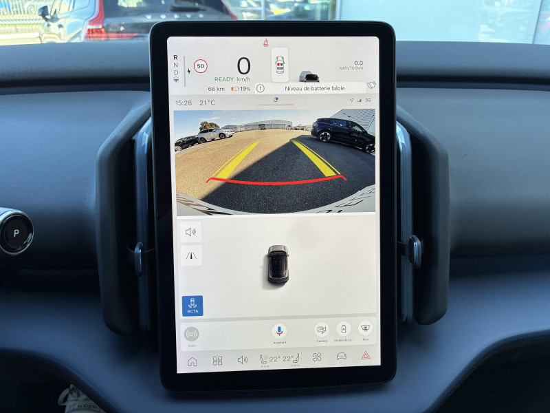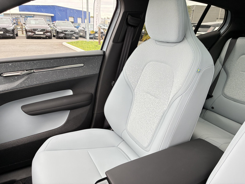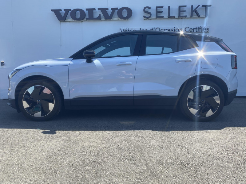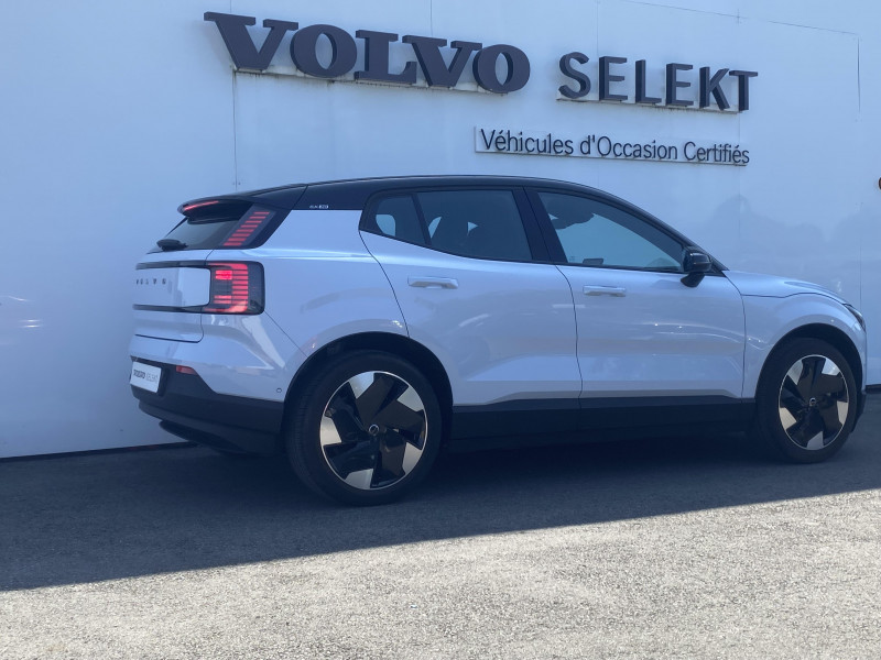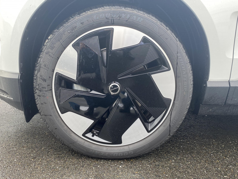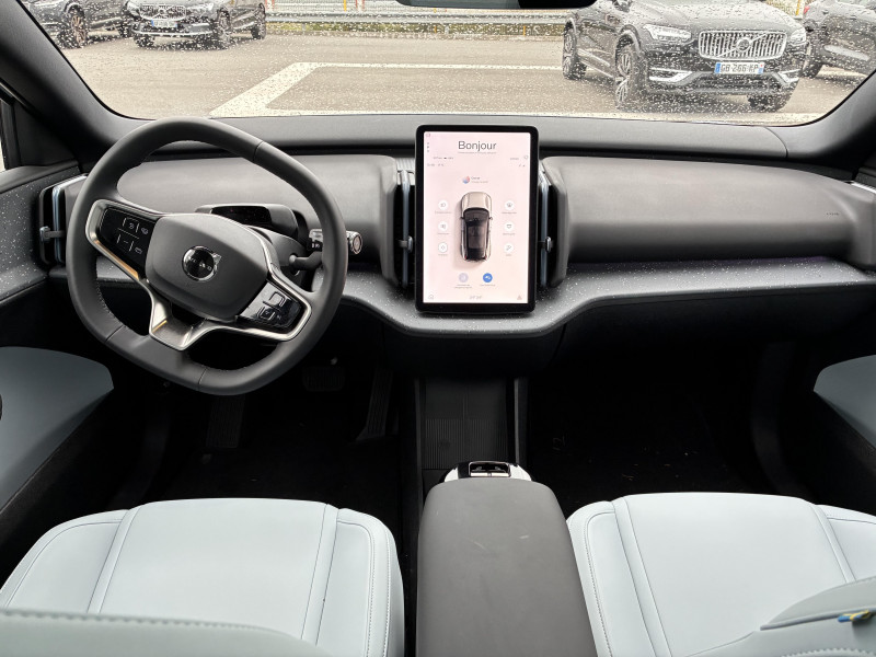 Aide au stationnement automatique nouvelle génération (Park Pilot Assist) Détection des places de parking libres adaptées au véhicule - Affichage du stationnement proposé sur l'écran central - En cas d'acceptation du stationnement proposé le véhicule se garera de lui même - Prise en charge de la direction, des freins et des changements de vitesse Peut être activé jusqu'à 22 km/h / Caméras Surround View (vision panoramique à 360°) incluant caméra AV et caméra de recul / Déclenchement automatique des feux de detresse lors d'un freinage d'urgence / En cas de collision, envoi automatique d'une alerte au service d'urgence Volvo Si un coussin gonflable ou un prétensionneur de ceinture de sécurité est déclenché lors d'une collision, une alerte est automatiquement envoyée au service d'urgence Volvo. Valable pendant 10 ans. / Fonction climatisation de l'habitacle moteur coupé / Fonctions d'intervention sur la direction aide au maintien dans la voie de 65 à 140 km/h, détection du risque de collision frontale en cas de chevauchement de voie du véhicule venant en sens inverse, Aide à diriger la voiture dans une trajectoire qui réduira le risque de sortie de route et si cela ne suffit pas, le système peut également intervenir en freinant pour réduire la vitesse / Frein de parking électronique automatique avec fonction Auto Hold (désactivable) / Jantes alliage 19" 5 branches Noir / Diamant avec inserts aérodynamiques 245/45 R19 / Phares LED avec feux de jour design marteau de Thor et feux de route adaptatifs / Pré-câblage électrique pour le crochet d'attelage / Système d'aide à la vigilance (ou Driver Awareness) Surveillance anti-angle mort BLIS, Assistance au changement de file, Alerte trafic en marche AR, Alerte collision AR avec action corrective, Alerte sortie sécurisée à l'ouverture d'une portière, Freins actifs à l'arrêt, / Système de contrôle de la qualité de l'air avec fonction CleanAir Filtre à charbon de climatisation multi-actif (limite l'entrée de pollen, de particules de pollution et des mauvaises odeurs en fermant automatiquement les arrivées d'air). La fonction CleanAir recycle l'air de l'habitacle. / 2 cartes de verrouillage et déverrouillage du véhicule / 2 prises USB type-C aux places AR / 2 prises USB type-C AV / Accès au service d'assistance Volvo via bouton dédié dans le plafonnier / Accès au service d'urgence Volvo via bouton SOS dans le plafonnier / Airbag passager désactivable avec témoin d'indication (on/off) / Airbags latéraux droit et gauche pour le conducteur et droit pour le passager AV / Alerte vigilance conducteur (Driver Alert Control) Informe le conducteur lorsque le système remarque qu'il est nécessaire de porter plus d'attention sur le trafic ou que la conduite semble anormale. Si le conducteur ne réagit pas, alors le véhicule pourra effectuer un arrêt de sécurité / Application Volvo EX30 sur smartphone (iOS et Android) / Assistance à l'anticipation et à l'atténuation des collisions avec le freinage et la direction véhicule circulant avec écart de vitesse jusqu'à 60 km/h. Détection des piétons, cyclistes, scooters. Freinage en cas d'inattention et arrêt en toute sécurité en fonction de la compréhension de l'état du conducteur / Avertisseur sonore d'approche Le véhicule émettra un son subtil mais audible lorsqu'il est conduit à basse vitesse dans le but d'avertir notamment les piétons et les cyclistes. / Bouton de verrouillage centralisé sur l'accoudoir central AV / Calandre AV pleine couleur carrosserie / Ceintures de sécuritéà inertie à 3 points d'ancrage (sur les 5 sièges) / Chargeur embarqué 22 kW / Chargeur embarqué Puissance de charge maximale de 11 kW (courant alternatif).Puissance de charge maximale de 155 kW (courant continu) / Coffre sous le capot AV d'une capacité de 7 litres / Compartiment de rangement entre les sièges AV / Conduite à une pédale ou One Pedal Drive Une seule pédale vous permet de profiter d'une expérience de conduite encore plus intuitive (fonction désactivable). / Contrôle de la transmission en descente HDC / Coques de rétroviseurs Noir / Câble de recharge Type 2, 32 A triphasé (fonctionne également en monophasé) Pour borne de recharge / Direction assistée électrique asservie à la vitesse / Eclairage d'ambiance personnalisable selon 5 ambiances - Forêt, Crépuscule, Aurores Boréales, Archipel, Été / Eclairage d'approche et d'accompagnement / Espace de rangement sous l'écran central / Espaces de rangement dans les contre-portes / Espaces de rangement entre les deux sièges AV / Freins à disques 17" à l'AV et à l'AR / Grand écran central flottant 12,3 / Incrustations (planche de bord et portières) Denim recyclé / Indicateur de perte de pression des pneus / Kit anticrevaison / Miroirs de courtoisie, spots de lecture à l'AV et éclairage dans le coffre / Ouverture des portes sans clé Keyless Entry / Pare-brise en verre feuilleté et colonne de direction rétractable en cas de choc / Parties inférieures des vitres Noir brillant / Pilot Assist Lecture des marquages au sol, Observation de la circulation et des autres véhicules, Assistance avec adaptation de la vitesse, Action sur la direction afin de maintenir le véhicule centré dans sa voie avec un maintien de la distance de sécurité avec le véhicule qui précède, Assistance lorsqu'un changement de voie est nécessaire, peut être activé jusqu'à 130 km/h / Plancher de coffre amovible / Pompe à chaleur permet principalement d'économiser la puissance de la batterie. / Port de recharge sur l'aile AR gauche et connecteur charge rapide / Porte-gobelets AV / Prise 12 V dans le coffre / Préparation pour fixations Isofix (places latérales de la deuxième rangée de sièges) / Rappel d'oubli de bouclage de ceinture de sécurité AV et AR / Réglage en hauteur manuel des ceintures AV / Régulateur adaptatif de vitesse et de distance ACC / Rétroviseur extérieur conduct