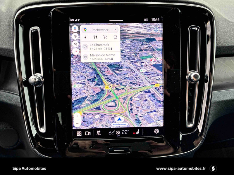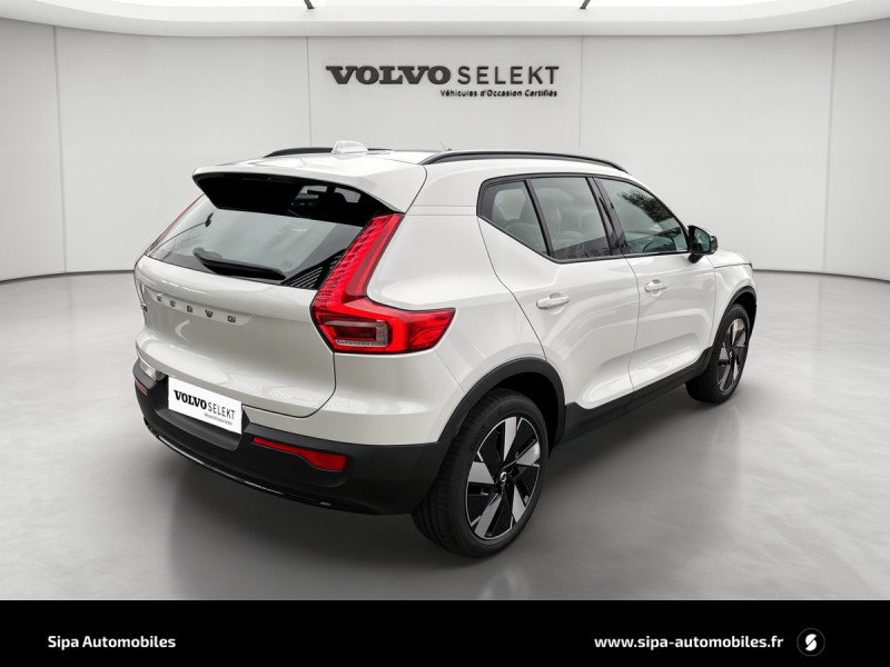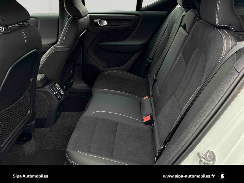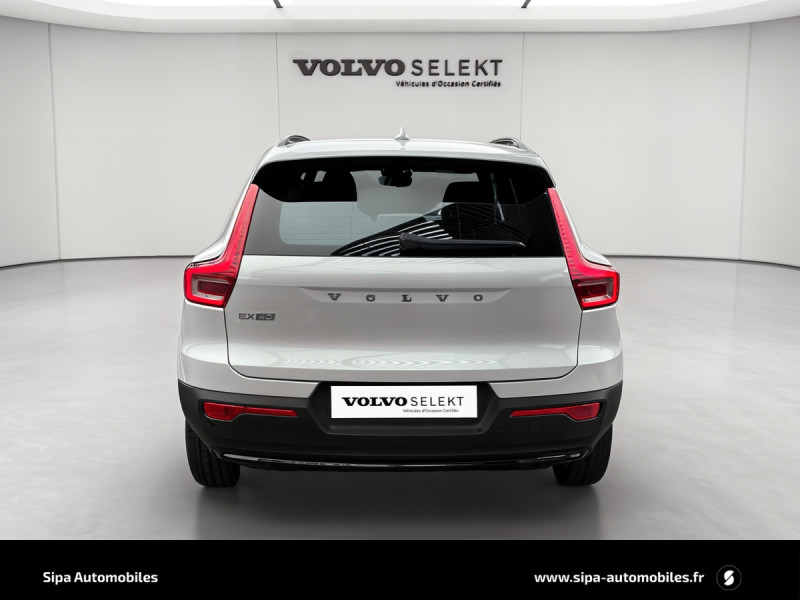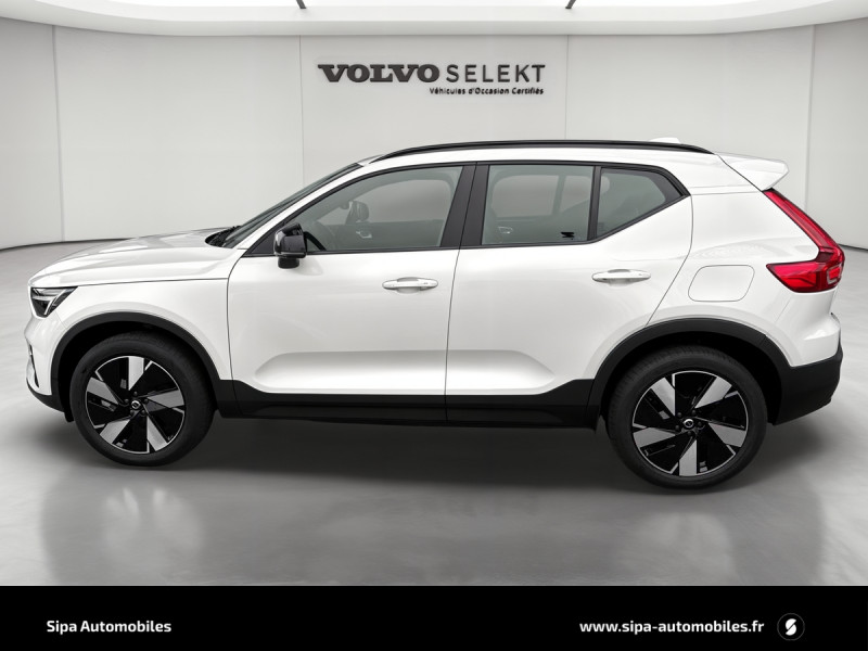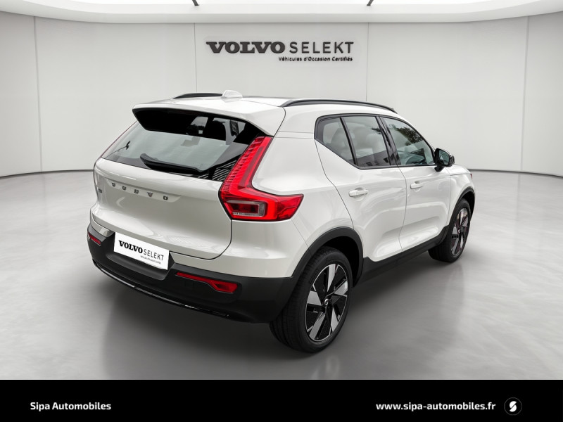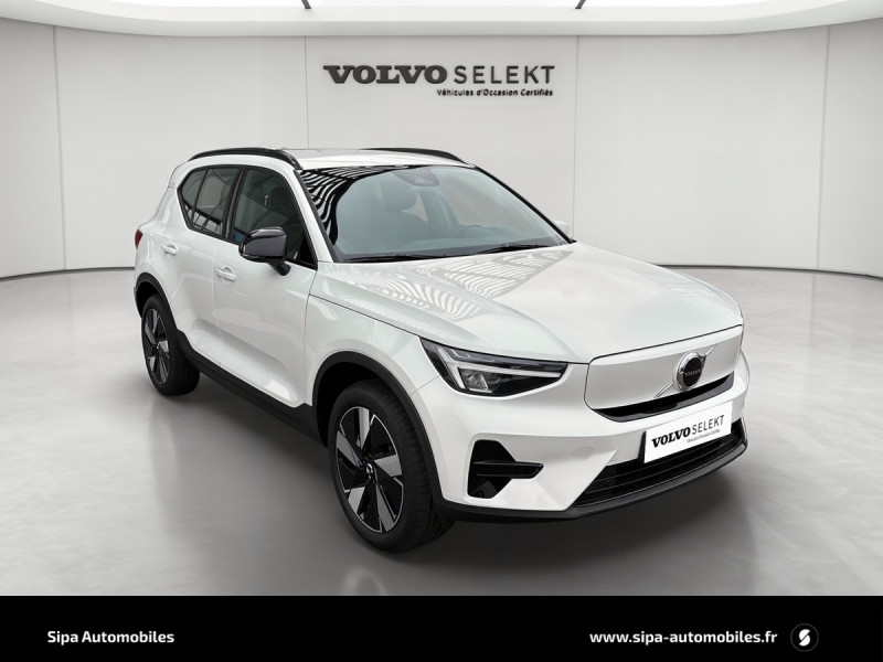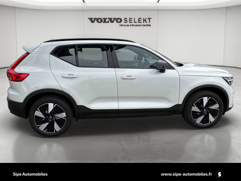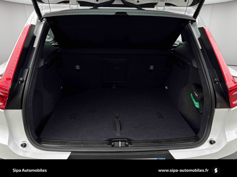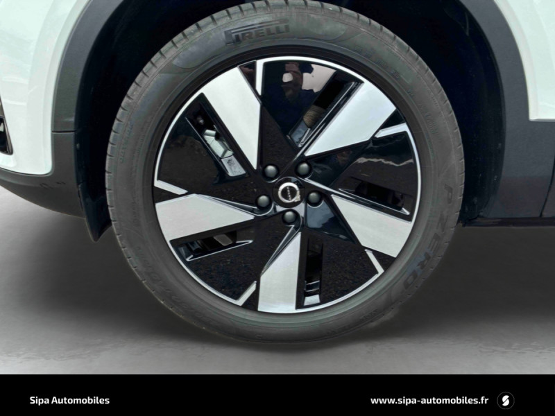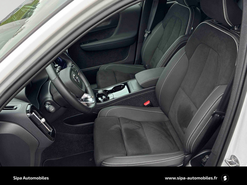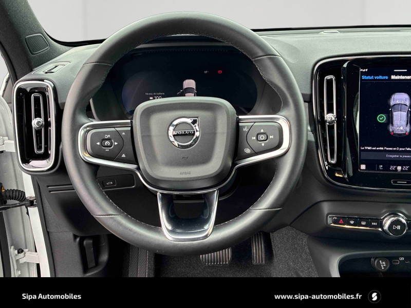 City Safety, système d'anticipation de collision intelligent Détection des véhicules, cyclistes, piétons et grands animaux avec freinage automatique à pleine puissance, Détection des véhicules aux intersections avec freinage automatique à pleine puissance, Avertissement lumineuse et sonore, Préparation des freins et ceintures de sécurité AV / CleanZone : Filtre à charbon de climatisation multi-actif et fonction pré-ventilation / Climatisation automatique bi-zone (incluant ouïes d'aération à l'AR) / Déclenchement automatique des feux de detresse lors d'un freinage d'urgence / En cas de collision, envoi automatique d'une alerte au service d'urgence Volvo Si un coussin gonflable ou un prétensionneur de ceinture de sécurité est déclenché lors d'une collision, une alerte est automatiquement envoyée au service d'urgence Volvo. Valable pendant 10 ans. / Fonction climatisation de l'habitacle moteur coupé / Frein de parking électronique automatique avec fonction Auto Hold (désactivable) / Freinage automatique post-collision (réduction du risque de suraccident) / Jantes alliage 19" 5 branches Noir Diamant (235/50 R19 AV et 255/45 R19 AR) / Pack Pilot Assist - Assistance à la conduite intelligente (le véhicule lit le marquage au sol et agit sur la direction afin de se maintenir au centre de sa voie, le conducteur doit garder les mains sur le volant, fonctionne jusqu'à 130 km/h) - Surveillances des angles morts : avec action correctrice sur la direction, assistance au changement de fil, alerte trafic en marche AR et Alerte collision AR avec freinage automatique / Phares LED avec feux de jour design marteau de Thor et feux de route adaptatifs / Pommeau de levier de vitesses Simili-Cuir / Pré-câblage électrique pour le crochet d'attelage / Télécommande de verrouillage centralisé avec clé contact integrée, fermeture à distance des vitres et du toit ouvrant et fonction panique (déclenchement du klaxon et des feux de détresse) / Verrouillage automatique des portes à partir de 7 km/h / Volant 3 branches sport avec insert Aluminium autour des boutons de commande / 2 porte-cintres / Accès au service d'assistance Volvo via bouton dédié dans le plafonnier / Accès au service d'urgence Volvo via bouton SOS dans le plafonnier / Airbag conducteur et passager à déclenchement différencié / Airbag passager désactivable avec témoin d'indication (on/off) / Alerte vigilance conducteur / Application Volvo Cars sur smartphone (iOS et Android) / Assise des sièges AV extensible manuellement / Assistance à l'évitement des piétons et des cyclistes / Bas de caisse et passages de roues Anthracite / Calandre AV pleine couleur carrosserie / Ceintures de sécuritéà inertie à 3 points d'ancrage (sur les 5 sièges) / Ciel de toit noir / Coffre sous le capot AV d'une capacité de 31 litres / Combiné d'instruments digital 12,3", nouvelle génération / Contrôle de la transmission en descente HDC / Coques de rétroviseurs Noir Brillant / Crochet pour sacs intégréà la boîte à gants / Câble de recharge Type 2, 4, 5 mètres, 32 A triphasé (fonctionne également en monophasé) Pour borne de recharge / Diffuseur AR Noir Laqué / Direction assistée électrique asservie à la vitesse / Eclairage d'approche et d'accompagnement / Ecran tactile multimédia haute résolution 9", personnalisable / Espace de rangement sous la console centrale / Filet de rangement pour le coffre / Freins à disques 18" à l'AR / Garantie 3 ans ou 100 000 km / Indicateur de perte de pression des pneus / Infotainment Volvo Car UX Services Google (comprend Google Maps, Google Assistant, Google Play Store, et un volume de données illimité pour les 4 premières années), kit mains libres Bluetooth et Streaming Audio, mode d'emploi numérique du véhicule, réception de la radio numérique (DAB+), mises à jour Over the Air (OTA) / Kit anticrevaison / Matériaux anti-allergènes dans l'habitacle / Miroirs de courtoisie éclairés, spots de lecture à l'AV et éclairage dans le coffre / Mise à jour du système à distance / Ouverture des portes sans clé Keyless Entry incluant éclairage du sol dans les poignées de porte AV + Hayon électrique avec fonction Confort (sans les mains) / Pare-brise en verre feuilleté et colonne de direction rétractable en cas de choc / Parties inférieures des vitres Noir brillant / Plancher du coffre rabattable avec crochets / Port de recharge sur l'aile AR gauche et connecteur charge rapide (jusqu'à 205 kW) / Porte-cartes bancaires et cartes de services intégré dans la planche de bord / Protections de pare-chocs AV et AR Noir brillant / Préparation pour fixations Isofix (places latérales de la deuxième rangée de sièges) / Rappel d'oubli de bouclage de ceinture de sécurité AV et AR / Réglage en hauteur manuel des ceintures AV / Régulateur adaptatif de vitesse et de distance ACC / Rétroviseur intérieur électrochrome sans contour / Rétroviseurs couleur carrosserie avec partie inférieure noir / Sabots de protection AV et AR Noir / Seuils de porte AV EX40 / Sièges conducteur et passager avec réglage manuel de la hauteur / Sièges conducteur et passager avec réglage manuel de la longueur, de l'inclinaison du dossier et de l´assise / Sièges conducteur et passager avec réglages électriques des supports lombaires / Sonde de température extérieure et horloge / Système audio Volvo Premium Sound by Harman/Kardon 600 W avec 13 HP et technologie Subwoofer / Système de contrôle de la stabilité et de la traction STC / Système de contrôle du freinage du véhicule VDC / Système de protection anti-sortie de route / Système de protection contre le coup du lapin WHIPS (sièges AV) / Système de protection contre les chocs latéraux SIPS / Système de protection en cas de sortie de route : Ceintures de sécurité actives à prétensionneurs, Assise des sièges AV à absorption d'énergie, Pédale de frein rétractable en cas de collision frontale / Systè