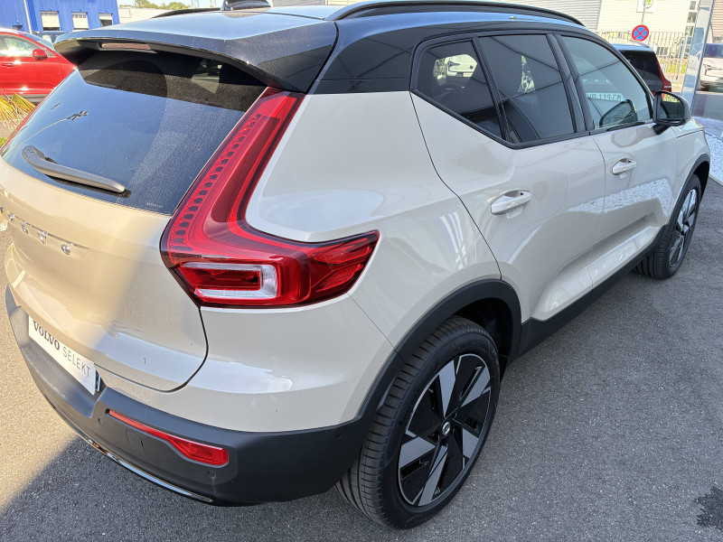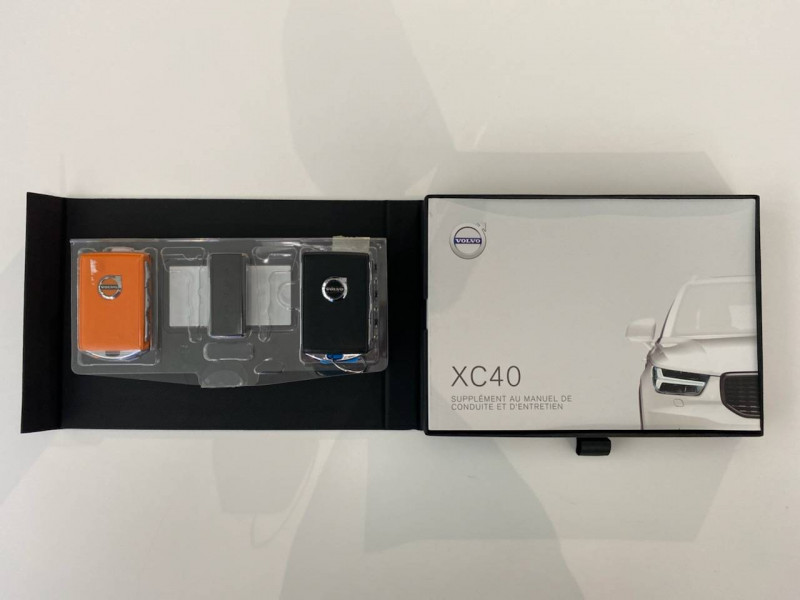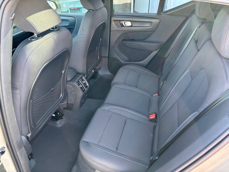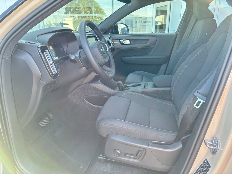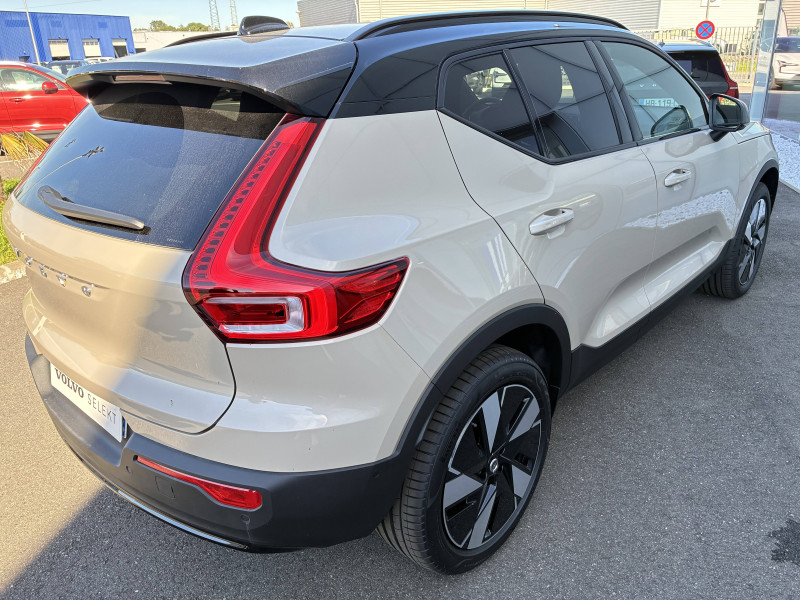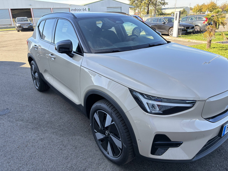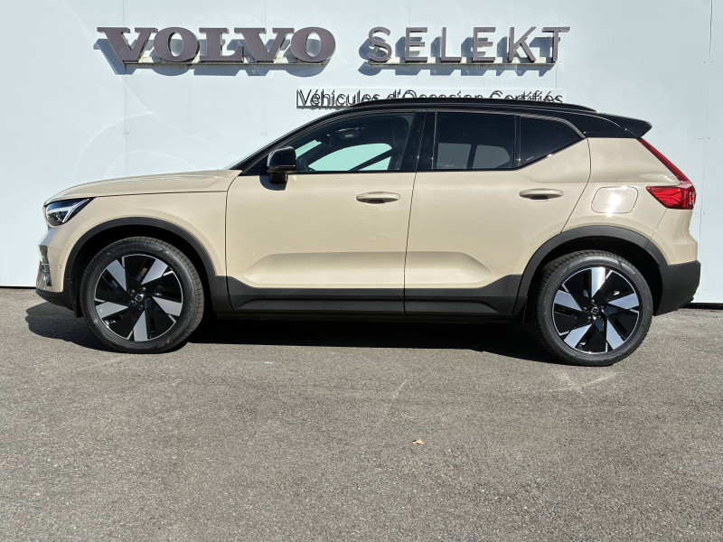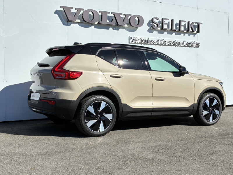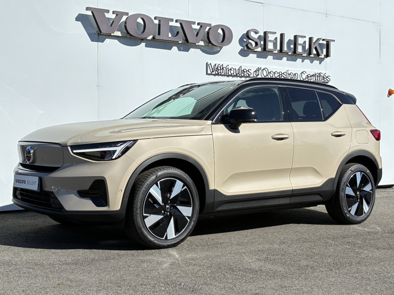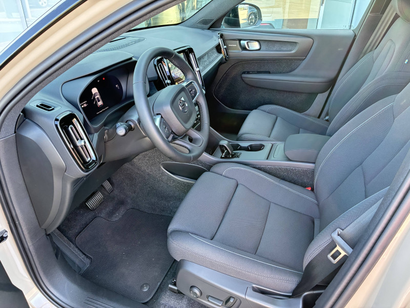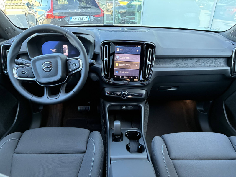 2 porte-cintres / Accès au service d'assistance Volvo via bouton dédié dans le plafonnier / Accès au service d'urgence Volvo via bouton SOS dans le plafonnier / Airbag conducteur et passager à déclenchement différencié / Airbag passager désactivable avec témoin d'indication (on/off) / Alerte vigilance conducteur / Application Volvo Cars sur smartphone (iOS et Android) / Assise des sièges AV extensible manuellement / Assistance à l'évitement des piétons et des cyclistes / Bas de caisse et passages de roues Anthracite / Câble de recharge Type 2, 4, 5 mètres, 32 A triphasé (fonctionne également en monophasé) Pour borne de recharge / Calandre AV pleine couleur carrosserie / Caméras Surround View (vision panoramique à 360°) incluant caméra AV et caméra de recul et assistance stationnement semi-automatique / Ceintures de sécuritéà inertie à 3 points d'ancrage (sur les 5 sièges) / Ciel de toit noir / City Safety, système d'anticipation de collision intelligent Détection des véhicules, cyclistes, piétons et grands animaux avec freinage automatique à pleine puissance, Détection des véhicules aux intersections avec freinage automatique à pleine puissance, Avertissement lumineuse et sonore, Préparation des freins et ceintures de sécurité AV / CleanZone : Filtre à charbon de climatisation multi-actif et fonction pré-ventilation / Climatisation automatique bi-zone (incluant ouïes d'aération à l'AR) / Coffre sous le capot AV d'une capacité de 31 litres / Combiné d'instruments digital 12,3", nouvelle génération / Contrôle de la transmission en descente HDC / Coques de rétroviseurs Noir Brillant / Crochet pour sacs intégréà la boîte à gants / Déclenchement automatique des feux de detresse lors d'un freinage d'urgence / Diffuseur AR Noir Laqué / Direction assistée électrique asservie à la vitesse / Eclairage d'approche et d'accompagnement / Ecran tactile multimédia haute résolution 9", personnalisable / En cas de collision, envoi automatique d'une alerte au service d'urgence Volvo Si un coussin gonflable ou un prétensionneur de ceinture de sécurité est déclenché lors d'une collision, une alerte est automatiquement envoyée au service d'urgence Volvo. Valable pendant 10 ans. / Espace de rangement sous la console centrale / Filet de rangement pour le coffre / Fonction climatisation de l'habitacle moteur coupé / Freinage automatique post-collision (réduction du risque de suraccident) / Frein de parking électronique automatique avec fonction Auto Hold (désactivable) / Freins à disques 18" à l'AR / Garantie 3 ans ou 100 000 km / Indicateur de perte de pression des pneus / Infotainment Volvo Car UX Services Google (comprend Google Maps, Google Assistant, Google Play Store, et un volume de données illimité pour les 4 premières années), kit mains libres Bluetooth et Streaming Audio, mode d'emploi numérique du véhicule, réception de la radio numérique (DAB+), mises à jour Over the Air (OTA) / Jantes alliage 19" 5 branches Noir Diamant (235/50 R19 AV et 255/45 R19 AR) / Kit anticrevaison / Matériaux anti-allergènes dans l'habitacle / Miroirs de courtoisie éclairés, spots de lecture à l'AV et éclairage dans le coffre / Mise à jour du système à distance / Ouverture des portes sans clé Keyless Entry incluant éclairage du sol dans les poignées de porte AV + Hayon électrique avec fonction Confort (sans les mains) / Pack Hiver Sièges AV chauffants, Volant chauffant, Pompe à chaleur / Pack Lounge Sellerie Connect / Microtech / Surpiqures blanches / Ambiance Anthracite, Toit ouvrant panoramique / Pack Pilot Assist - Assistance à la conduite intelligente (le véhicule lit le marquage au sol et agit sur la direction afin de se maintenir au centre de sa voie, le conducteur doit garder les mains sur le volant, fonctionne jusqu'à 130 km/h) - Surveillances des angles morts : avec action correctrice sur la direction, assistance au changement de fil, alerte trafic en marche AR et Alerte collision AR avec freinage automatique / Pack Sièges électriques Siège conducteur à réglages électriques et à fonction mémoire, Siège passager AV à réglages électriques, Appuie-têtes AR rabattables électriquement depuis l'écran central / Pare-brise en verre feuilleté et colonne de direction rétractable en cas de choc / Parties inférieures des vitres Noir brillant / Phares LED avec feux de jour design marteau de Thor et feux de route adaptatifs / Plancher du coffre rabattable avec crochets / Pommeau de levier de vitesses Simili-Cuir / Port de recharge sur l'aile AR gauche et connecteur charge rapide (jusqu'à 205 kW) / Porte-cartes bancaires et cartes de services intégré dans la planche de bord / Pré-câblage électrique pour le crochet d'attelage / Préparation pour fixations Isofix (places latérales de la deuxième rangée de sièges) / Protections de pare-chocs AV et AR Noir brillant / Rappel d'oubli de bouclage de ceinture de sécurité AV et AR / Réglage en hauteur manuel des ceintures AV / Régulateur adaptatif de vitesse et de distance ACC / Rétroviseur intérieur électrochrome sans contour / Rétroviseurs couleur carrosserie avec partie inférieure noir / Sabots de protection AV et AR Noir / Sellerie Connect / Microtech / Surpiqûres blanches / Ambiance Anthracite / Seuils de porte AV EX40 / Sièges conducteur et passager avec réglages électriques des supports lombaires / Sonde de température extérieure et horloge / Système audio Volvo Premium Sound by Harman/Kardon 600 W avec 13 HP et technologie Subwoofer / Système de contrôle de la stabilité et de la traction STC / Système de contrôle du freinage du véhicule VDC / Système de préconditionnement de l'habitacle (chauffage) / Système de protection anti-sortie de route / Système de protection contre le coup du lapin WHIPS (sièges AV) / Système de protection contre les chocs latéraux SIPS / Système de protection en cas de sortie de route : Ceintures de