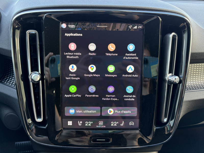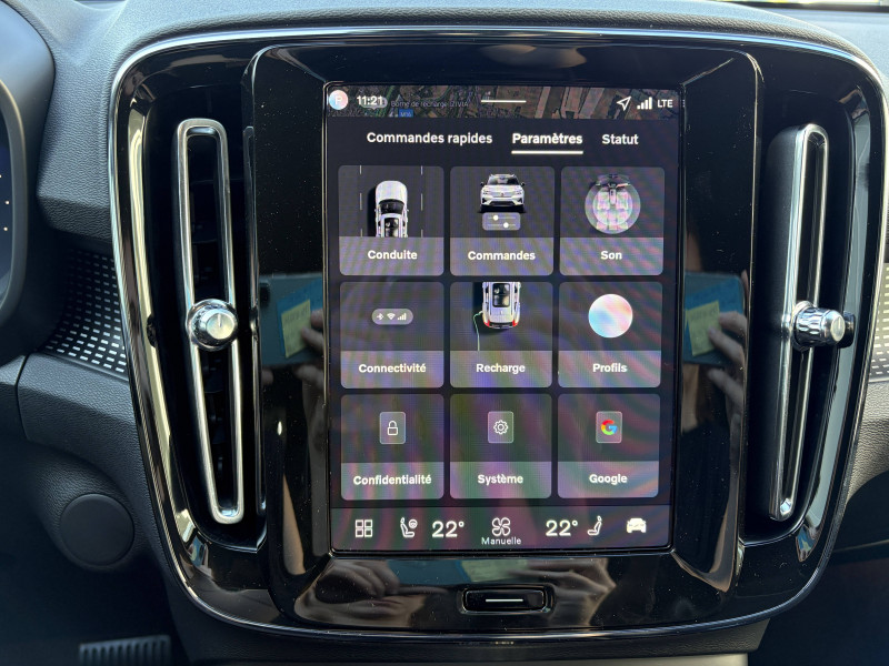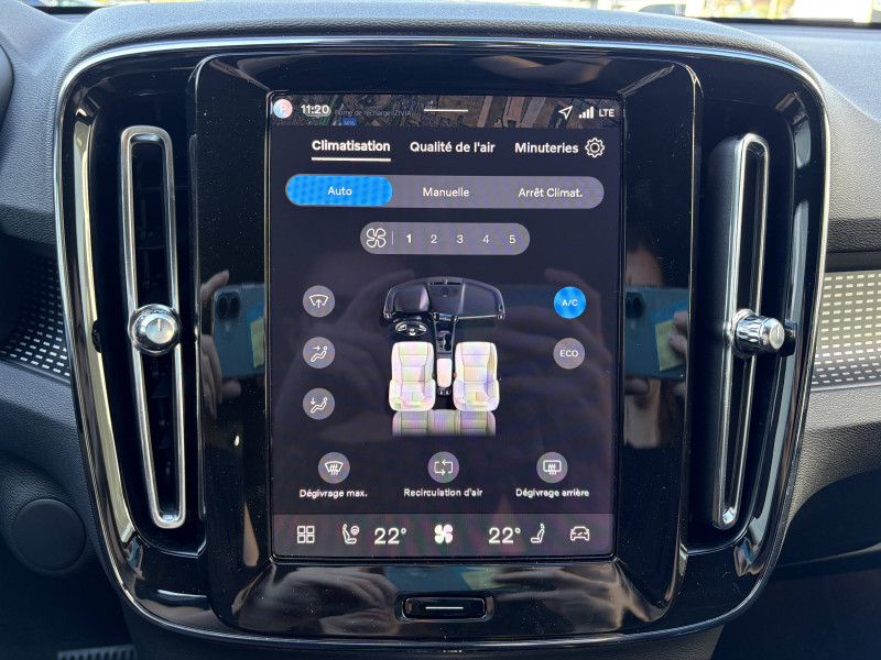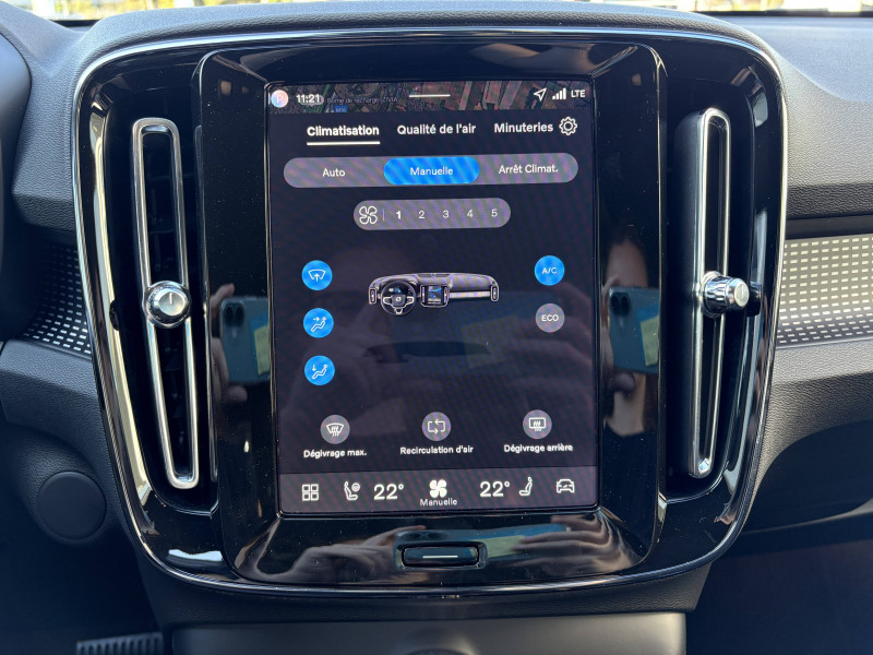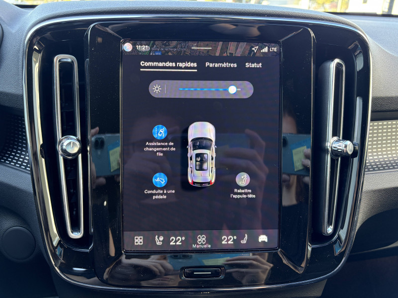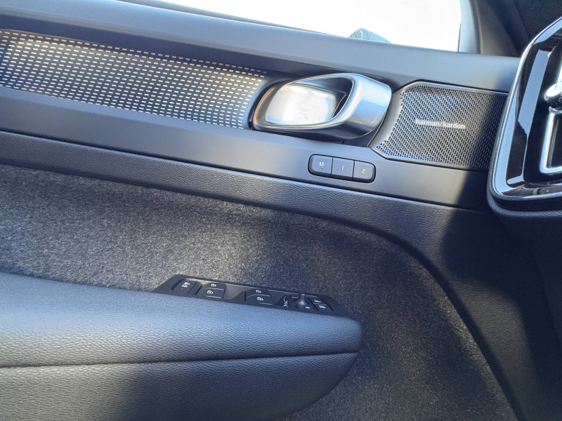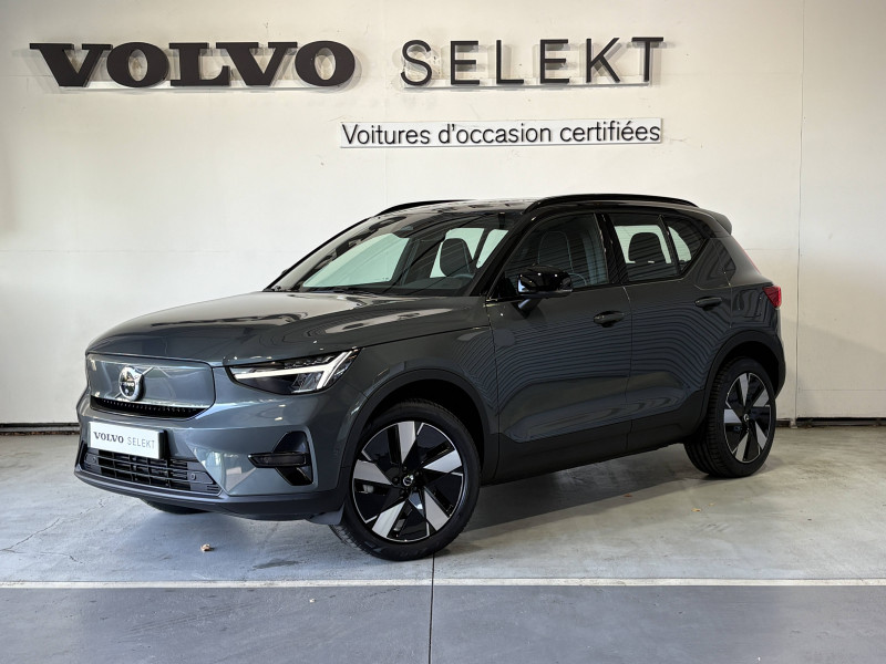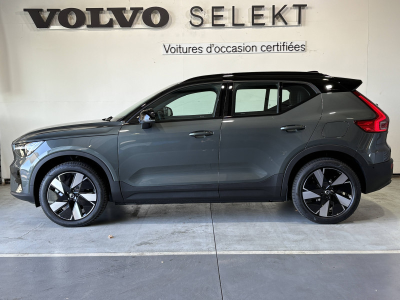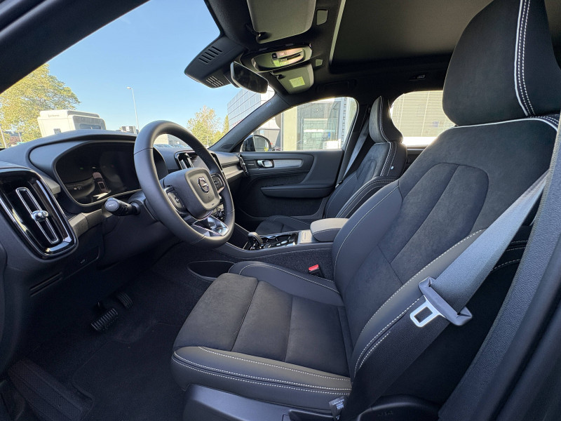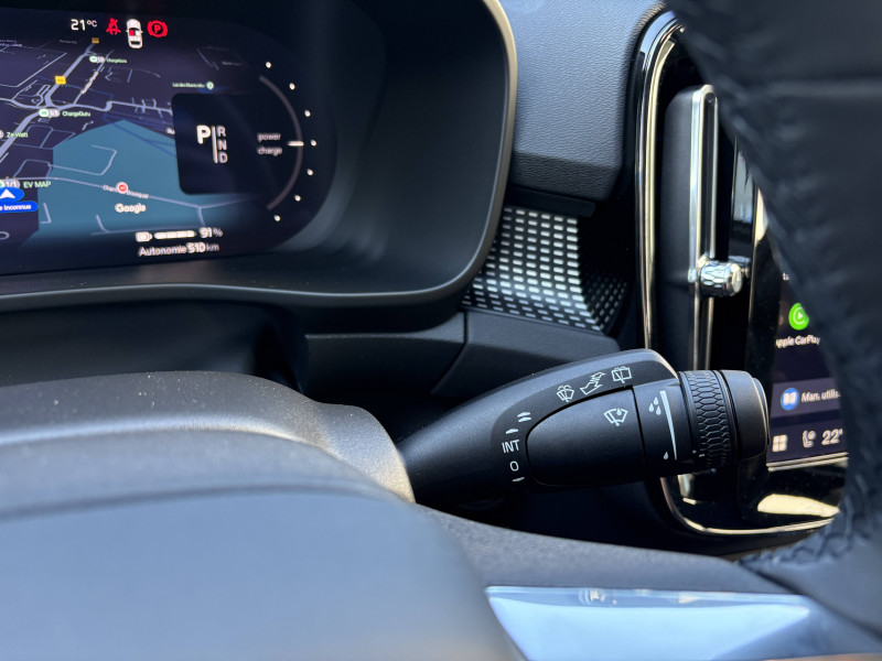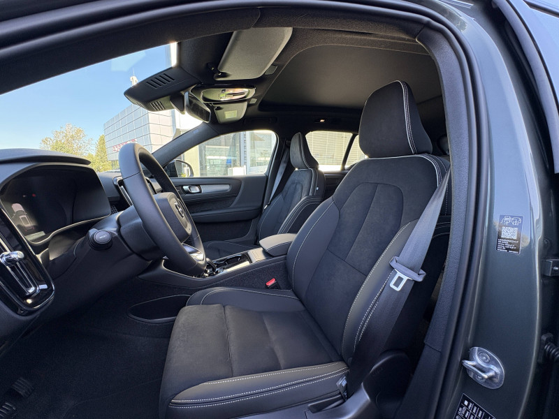 2 porte-cintres / Accès au service d'assistance Volvo via bouton dédié dans le plafonnier / Accès au service d'urgence Volvo via bouton SOS dans le plafonnier / Airbag conducteur et passager à déclenchement différencié / Airbag passager désactivable avec témoin d'indication (on/off) / Alerte vigilance conducteur / Application Volvo Cars sur smartphone (iOS et Android) / Assise des sièges AV extensible manuellement / Assistance à l'évitement des piétons et des cyclistes / Bas de caisse et passages de roues Anthracite / Câble de recharge Type 2, 4, 5 mètres, 32 A triphasé (fonctionne également en monophasé) Pour borne de recharge / Calandre AV pleine couleur carrosserie / Caméras Surround View (vision panoramique à 360°) incluant caméra AV et caméra de recul et assistance stationnement semi-automatique / Ceintures de sécuritéà inertie à 3 points d'ancrage (sur les 5 sièges) / Ciel de toit noir / City Safety, système d'anticipation de collision intelligent Détection des véhicules, cyclistes, piétons et grands animaux avec freinage automatique à pleine puissance, Détection des véhicules aux intersections avec freinage automatique à pleine puissance, Avertissement lumineuse et sonore, Préparation des freins et ceintures de sécurité AV / CleanZone : Filtre à charbon de climatisation multi-actif et fonction pré-ventilation / Climatisation automatique bi-zone (incluant ouïes d'aération à l'AR) / Coffre sous le capot AV d'une capacité de 31 litres / Combiné d'instruments digital 12,3", nouvelle génération / Contrôle de la transmission en descente HDC / Coques de rétroviseurs Noir Brillant / Crochet pour sacs intégréà la boîte à gants / Déclenchement automatique des feux de detresse lors d'un freinage d'urgence / Diffuseur AR Noir Laqué / Direction assistée électrique asservie à la vitesse / Eclairage d'approche et d'accompagnement / Ecran tactile multimédia haute résolution 9", personnalisable / En cas de collision, envoi automatique d'une alerte au service d'urgence Volvo Si un coussin gonflable ou un prétensionneur de ceinture de sécurité est déclenché lors d'une collision, une alerte est automatiquement envoyée au service d'urgence Volvo. Valable pendant 10 ans. / Espace de rangement sous la console centrale / Filet de rangement pour le coffre / Fonction climatisation de l'habitacle moteur coupé / Freinage automatique post-collision (réduction du risque de suraccident) / Frein de parking électronique automatique avec fonction Auto Hold (désactivable) / Freins à disques 18" à l'AR / Garantie 3 ans ou 100 000 km / Indicateur de perte de pression des pneus / Infotainment Volvo Car UX Services Google (comprend Google Maps, Google Assistant, Google Play Store, et un volume de données illimité pour les 4 premières années), kit mains libres Bluetooth et Streaming Audio, mode d'emploi numérique du véhicule, réception de la radio numérique (DAB+), mises à jour Over the Air (OTA) / Jantes alliage 19" 5 branches Noir Diamant (235/50 R19 AV et 255/45 R19 AR) / Kit anticrevaison / Matériaux anti-allergènes dans l'habitacle / Miroirs de courtoisie éclairés, spots de lecture à l'AV et éclairage dans le coffre / Mise à jour du système à distance / Ouverture des portes sans clé Keyless Entry incluant éclairage du sol dans les poignées de porte AV + Hayon électrique avec fonction Confort (sans les mains) / Pack Hiver Sièges AV chauffants, Volant chauffant, Pompe à chaleur / Pack Lounge Sellerie Connect / Microtech / Surpiqures blanches / Ambiance Anthracite, Toit ouvrant panoramique / Pack Pilot Assist - Assistance à la conduite intelligente (le véhicule lit le marquage au sol et agit sur la direction afin de se maintenir au centre de sa voie, le conducteur doit garder les mains sur le volant, fonctionne jusqu'à 130 km/h) - Surveillances des angles morts : avec action correctrice sur la direction, assistance au changement de fil, alerte trafic en marche AR et Alerte collision AR avec freinage automatique / Pack Sièges électriques Siège conducteur à réglages électriques et à fonction mémoire, Siège passager AV à réglages électriques, Appuie-têtes AR rabattables électriquement depuis l'écran central / Pare-brise en verre feuilleté et colonne de direction rétractable en cas de choc / Parties inférieures des vitres Noir brillant / Phares LED avec feux de jour design marteau de Thor et feux de route adaptatifs / Plancher du coffre rabattable avec crochets / Pommeau de levier de vitesses Simili-Cuir / Port de recharge sur l'aile AR gauche et connecteur charge rapide (jusqu'à 205 kW) / Porte-cartes bancaires et cartes de services intégré dans la planche de bord / Pré-câblage électrique pour le crochet d'attelage / Préparation pour fixations Isofix (places latérales de la deuxième rangée de sièges) / Protections de pare-chocs AV et AR Noir brillant / Rappel d'oubli de bouclage de ceinture de sécurité AV et AR / Réglage en hauteur manuel des ceintures AV / Régulateur adaptatif de vitesse et de distance ACC / Rétroviseur intérieur électrochrome sans contour / Rétroviseurs couleur carrosserie avec partie inférieure noir / Sabots de protection AV et AR Noir / Sellerie Connect / Microtech / Surpiqûres blanches / Ambiance Anthracite / Seuils de porte AV EX40 / Sièges conducteur et passager avec réglages électriques des supports lombaires / Sonde de température extérieure et horloge / Système audio Volvo Premium Sound by Harman/Kardon 600 W avec 13 HP et technologie Subwoofer / Système de contrôle de la stabilité et de la traction STC / Système de contrôle du freinage du véhicule VDC / Système de préconditionnement de l'habitacle (chauffage) / Système de protection anti-sortie de route / Système de protection contre le coup du lapin WHIPS (sièges AV) / Système de protection contre les chocs latéraux SIPS / Système de protection en cas de sortie de route : Ceintures de