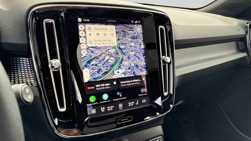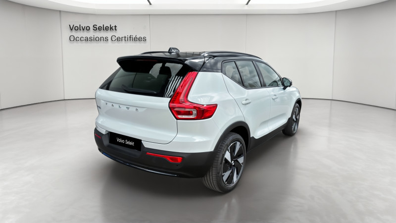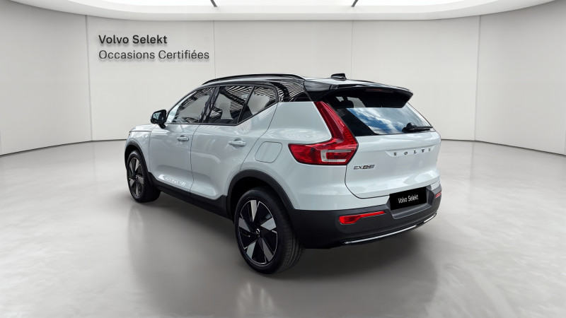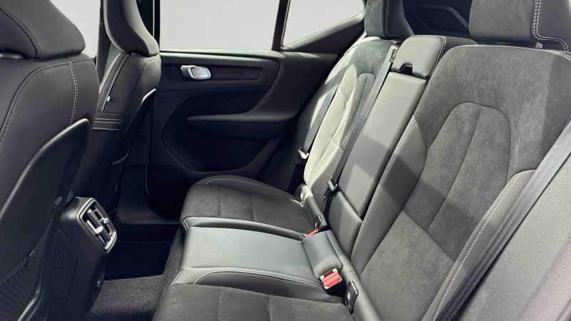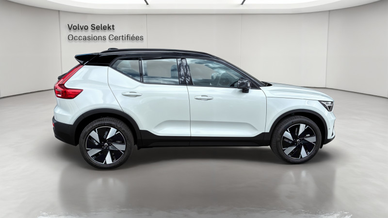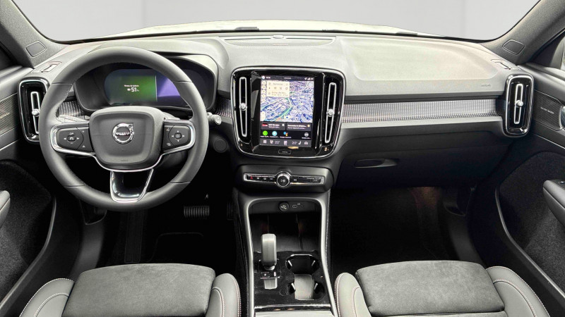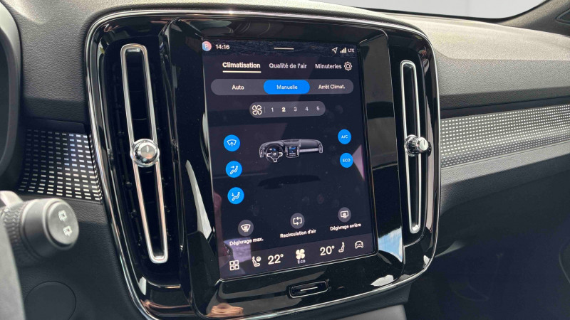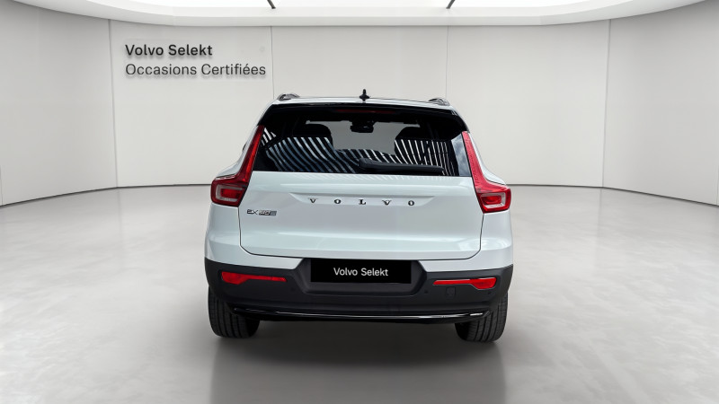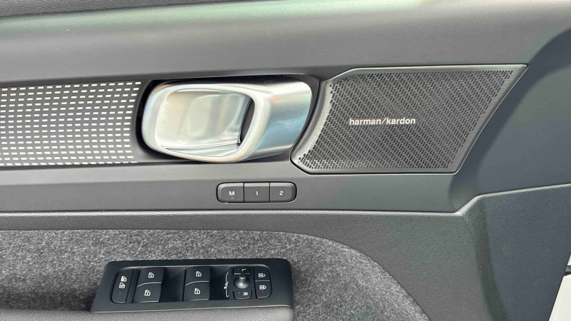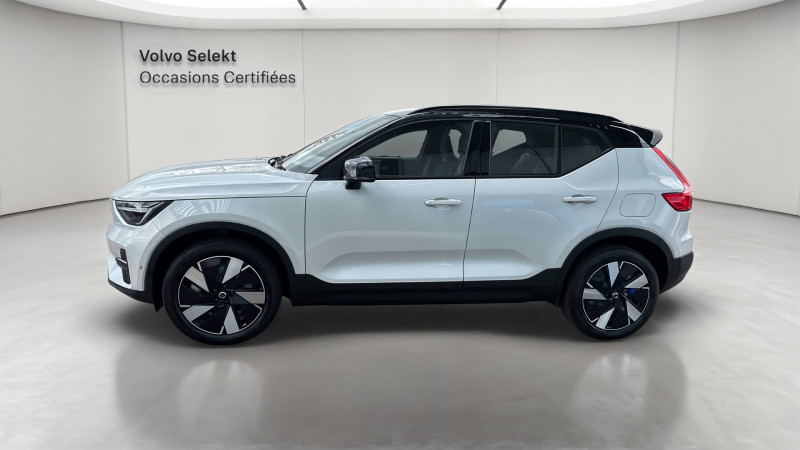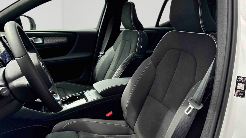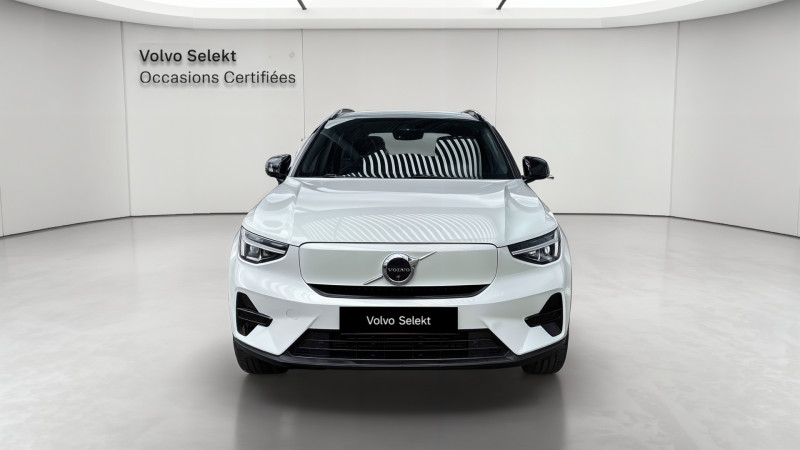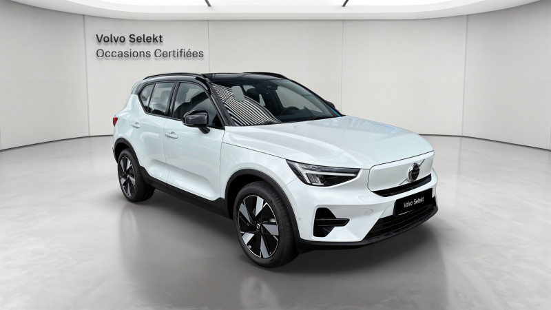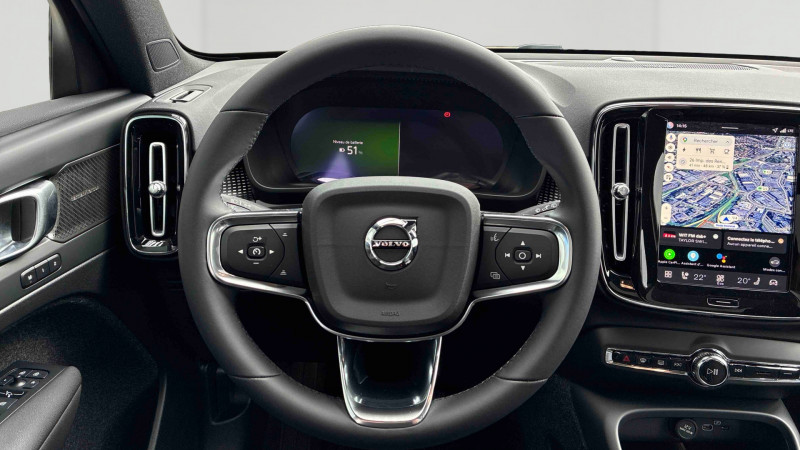 Caméras Surround View (vision panoramique à 360°) incluant caméra AV et caméra de recul / City Safety, système d'anticipation de collision intelligent Détection des véhicules, cyclistes, piétons et grands animaux avec freinage automatique à pleine puissance, Détection des véhicules aux intersections avec freinage automatique à pleine puissance, Avertissement lumineuse et sonore, Préparation des freins et ceintures de sécurité AV / CleanZone : Filtre à charbon de climatisation multi-actif et fonction pré-ventilation / Climatisation automatique bi-zone (incluant ouïes d'aération à l'AR) / Déclenchement automatique des feux de detresse lors d'un freinage d'urgence / En cas de collision, envoi automatique d'une alerte au service d'urgence Volvo Si un coussin gonflable ou un prétensionneur de ceinture de sécurité est déclenché lors d'une collision, une alerte est automatiquement envoyée au service d'urgence Volvo. Valable pendant 10 ans. / Fonction climatisation de l'habitacle moteur coupé / Frein de parking électronique automatique avec fonction Auto Hold (désactivable) / Freinage automatique post-collision (réduction du risque de suraccident) / Jantes alliage 19" 5 branches Noir Diamant Pneus 235/50 R19 AV et 255/45 R19 AR / Phares LED avec feux de jour design marteau de Thor et feux de route adaptatifs / Pommeau de levier de vitesses Simili-Cuir / Pré-câblage électrique pour le crochet d'attelage / Télécommande de verrouillage centralisé avec clé contact integrée, fermeture à distance des vitres et du toit ouvrant et fonction panique (déclenchement du klaxon et des feux de détresse) / Verrouillage automatique des portes à partir de 7 km/h / Volant 3 branches sport avec insert Aluminium autour des boutons de commande / 2 porte-cintres / Accès au service d'assistance Volvo via bouton dédié dans le plafonnier / Accès au service d'urgence Volvo via bouton SOS dans le plafonnier / Airbag conducteur et passager à déclenchement différencié / Airbag passager désactivable avec témoin d'indication (on/off) / Alerte vigilance conducteur / Application Volvo Cars sur smartphone (iOS et Android) / Assise des sièges AV extensible manuellement / Assistance à l'évitement des piétons et des cyclistes / Bas de caisse et passages de roues Anthracite / Calandre AV pleine couleur carrosserie / Ceintures de sécuritéà inertie à 3 points d'ancrage (sur les 5 sièges) / Ciel de toit noir / Coffre sous le capot AV d'une capacité de 31 litres / Combiné d'instruments digital 12,3" / Contrôle de la transmission en descente HDC / Coques de rétroviseurs Noir Brillant / Crochet pour sacs intégréà la boîte à gants / Câble de recharge Type 2, 4,5 mètres, 32 A triphasé (fonctionne également en monophasé) Pour borne de recharge / Diffuseur AR Noir laqué / Direction assistée électrique asservie à la vitesse / Eclairage d'approche et d'accompagnement / Ecran tactile multimédia haute résolution 9", personnalisable / EDT : Boîte Electrique Drive Train rapport unique / Espace de rangement sous la console centrale / Filet de rangement pour le coffre / Freins à disques 18" à l'AR / Indicateur de perte de pression des pneus / Infotainment Volvo Car UX Services Google (comprend Google Maps, Google Assistant, Google Play Store, et un volume de données illimité pour les 4 premières années), kit mains libres Bluetooth et Streaming Audio, mode d'emploi numérique du véhicule, réception de la radio numérique (DAB+), mises à jour Over the Air (OTA) / Kit anticrevaison / Matériaux anti-allergènes dans l'habitacle / Miroirs de courtoisie éclairés, spots de lecture à l'AV et éclairage dans le coffre / Mise à jour du système à distance / Ouverture des portes sans clé Keyless Entry incluant éclairage du sol dans les poignées de porte AV + Hayon électrique avec fonction Confort (sans les mains) / Pare-brise en verre feuilleté et colonne de direction rétractable en cas de choc / Parties inférieures des vitres Noir brillant / Plancher de coffre rabattable avec crochets / Port de recharge sur l'aile AR gauche et connecteur charge rapide (jusqu'à 205 kW) / Porte-cartes bancaires et cartes de services intégré dans la planche de bord / Protections de pare-chocs AV et AR Noir brillant / Préparation pour fixations Isofix (places latérales de la 2ème rangée de sièges) / Rappel d'oubli de bouclage de ceinture de sécurité AV et AR / Réglage en hauteur manuel des ceintures AV / Régulateur adaptatif de vitesse et de distance ACC / Rétroviseur intérieur électrochrome sans contour / Rétroviseurs couleur carrosserie avec partie inférieure noir / Sabots de protection AV et AR Noir / Seuils de porte AV EX40 / Sièges conducteur et passager avec réglages électriques des supports lombaires / Sonde de température extérieure et horloge / Système audio Volvo Premium Sound by Harman/Kardon 600 W avec 13 HP et technologie Subwoofer / Système de contrôle de la stabilité et de la traction STC / Système de contrôle du freinage du véhicule VDC / Système de protection anti-sortie de route Détection du risque de sortie de route (avec ou sans marquage au sol, de 65 à 140 km/h) avec action corrective sur la direction et, si nécessaire, sur les freins / Système de protection collision frontale Détection du risque de collision frontale (de 65 à 140 km/h) avec action corrective sur la direction / Système de protection contre le coup du lapin WHIPS (sièges AV) / Système de protection contre les chocs latéraux SIPS / Système de protection en cas de sortie de route : Ceintures de sécurité actives à prétensionneurs, Assise des sièges AV à absorption d'énergie, Pédale de frein rétractable en cas de collision frontale / Système de préconditionnement de l?habitacle (chauffage) / Système de réglage en hauteur des phares / Système intelligent d'informations au conducteur IDIS / Tapis de sol premium / Toit noir contrasté / Trousse
