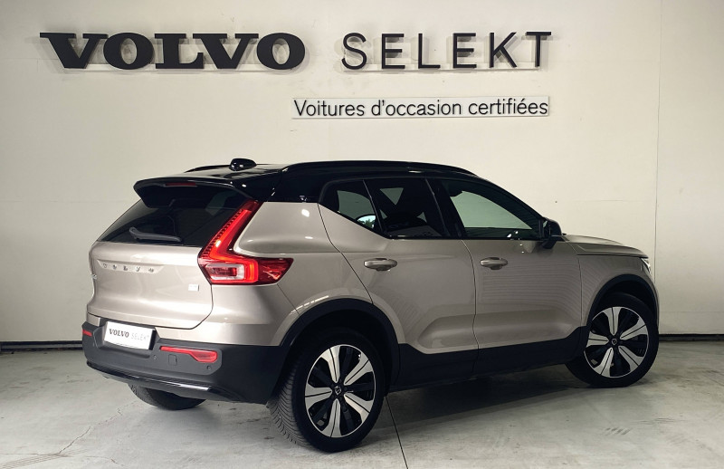 CleanZone : Filtre charbon de climatisation multi-actif (limite l'entrée de pollen, de particules de pollution et de mauvaises odeurs en fermant automatiquement les arrivées d'air si nécessaire) et fonction pré-ventillation / Climatisation automatique bi-zone (incluant ouïes d'aération à l'AR) / Déclenchement automatique des feux de detresse lors d'un freinage d'urgence / Envoi automatique d'une alerte au service d'urgence Volvo en cas de collision / Fonction climatisation de l'habitacle moteur coupé / Frein de parking électronique automatique en fonction Auto Hold (désactivable) / Freinage automatique post-collision (réduction du risque de suraccident) / Incrustations Aluminium / Jantes alliage 19" 5 branches Graphite Mat/Diamant AV 235/50 R19, AR 255/45 R19 / Phares LED avec feux de jour design marteau de Thor et feux de route adaptatifs / Pommeau de levier de vitesse gainé de Simili-Cuir / Pré-câblage électrique pour le crochet d'attelage / Seuil de coffre en Aluminium / Seuils de portes AV Volvo en Aluminium / Télécommande de verrouillage centralisé avec clé de contact intégrée, fermeture à distance des vitres et du toit ouvrant et fonction panique / Verrouillage automatique des portes à partir de 7 km/h / Volant sport avec insert Aluminium / 2 porte-cintres / Accès au service d'assistance Volvo via bouton dédié dans le plafonnier / Accès au service d'urgence Volvo via bouton SOS dans le plafonnier / Airbag passager désactivable avec témoin d'indication (on/off) / Airbags conducteur et passager à déclenchement différencié / Alerte vigilance conducteur / Application Volvo Cars sur smartphone iOS ou Android / Assise des sièges AV extensible manuellement / Assistance à l'évitement des piétons et des cyclistes / Badge Recharge sur le hayon / Bas de caisse et passages de roues Anthracite / Calandre AV pleine couleur carrosserie / Ceintures de sécuritéà inertie à 3 points d'ancrage (sur les 5 sièges) / City Safety, système d'anticipation de collision intelligent / Coffre sous le capot AV d'une capacité de 31 litres / Combiné d'instruments digital 12,3" / Contrôle de la transmission en descente HDC / Coques de rétroviseurs Noir brillant / Corbeille intégrée et amovible au niveau du tunnel central AV / Crochet pour sacs intégréà la boîte à gants / Câble de recharge de 7 mètres / 10 A. Pour prise secteur / Deuxième câble de recharge Type 2, 4.5 mètres, 32 A triphasé (fonctionne en monophasé) Pour borne de recharge / Diffuseur AR Noir laqué / Direction assistée asservie à la vitesse / Eclairage d'accompagnement et éclairage d'approche / Ecran tactile multimédia haute résolution 9" personnalisable / Espace de rangement sous la console centrale / Filet de sécurité derrière la rangée de sièges AV / Fonction Eco : optimisation des paramètres véhicule pour une conduite économique et écologique (à la demande) / Gravure Recharge sur les montants AR / Indicateur de perte de pression des pneus / Infotainment Google Android Services Google (comprend Google Maps, Google Assistant, Google Play Store, chargeur smartphone par induction et un volume de données illimité pour les 4 premières années) et Kit mains libres Bluetooth et Streaming Audio, mode d'emploi numérique du véhicule, réception de la radio numérique (DAB+), mises à jour Over the Air (OTA). / IntelliSafe Assist / IntelliSafe Surround / Kit anti-crevaison / Miroirs de courtoisie éclairés, spots de lecture à l'AV et éclairage dans le coffre / Mise à jour du système à distance / Ouverture des portes sans clé Keyless Entry Eclairage du sol dans les poignées de porte AV + Hayon électrique avec fonction Confort (sans les mains) / Pare-brise en verre feuilleté et colonne de direction rétractable en cas de choc / Parties inférieures des vitres noir brillant / Plancher du coffre rabattable avec crochets / Pneus toutes saison / Port de recharge sur l'aile AR gauche et connecteur charge rapide (jusqu'à 150 kW) / Porte-cartes bancaires et cartes de services intégré dans la planche de bord / Protections de pare-chocs AV et AR Noir brillant / Préparation pour le système Isofix (places latérales de la 2ème rangée de sièges) / Rappel d'oubli de bouclage des ceintures de sécurité AV et AR / Réglage en hauteur manuel des ceintures AV / Rétroviseurs couleur carrosserie avec partie inférieure noir / Rétroviseurs intérieur (sans contour) et extérieur électrochrome / Sabots de protection AV et AR Noir / Siège conducteur et passager avec réglage manuel de la hauteur / Sièges conducteur et passager avec réglage manuel de la longueur, de l'inclinaison du dossier et de l'assise / Sièges conducteur et passager avec réglages électriques des supports lombaires / Sonde de température extérieure et horloge / Système audio Volvo High Performance avec technologie air woofer au niveau de la console centrale 250 W, 8 HP, radio numérique terrestre, prise 12 V et 2 ports USB C à l'AV / Système de contrôle de la stabilité et de la traction STC / Système de contrôle du freinage du véhicule VDC / Système de protection anti-sortie de route / Système de protection collision frontale : Détection du risque de collision frontale (de 65 à 140 km/h) avec action corrective sur la direction / Système de protection contre le coup du lapin WHIPS (sièges AV) / Système de protection contre les chocs latéraux SIPS / Système de protection en cas de sortie de route / Système de pré-conditionnement de l'habitacle (chauffage) / Système de réglage en hauteur des phares / Système intelligent d'information au conducteur IDIS / Tapis de sol premium / Trousse de 1er secours et triangle de présignalisation / Tunnel de la console centrale Noir brillant / Verrouillage de sécurité enfant manuel / Vitres AV et AR électriques à impulsion (montée et descente) avec système anti-pincement