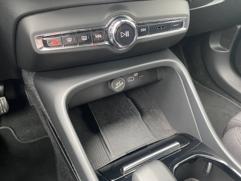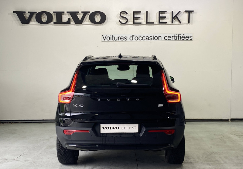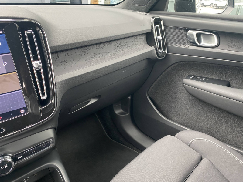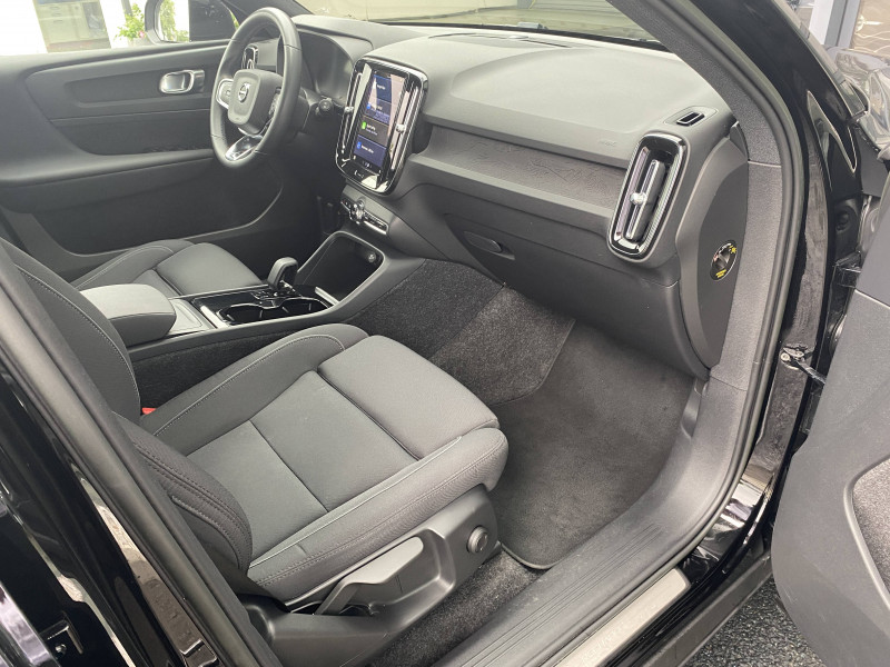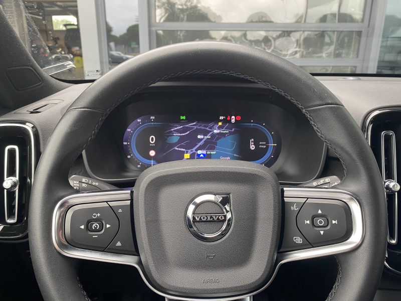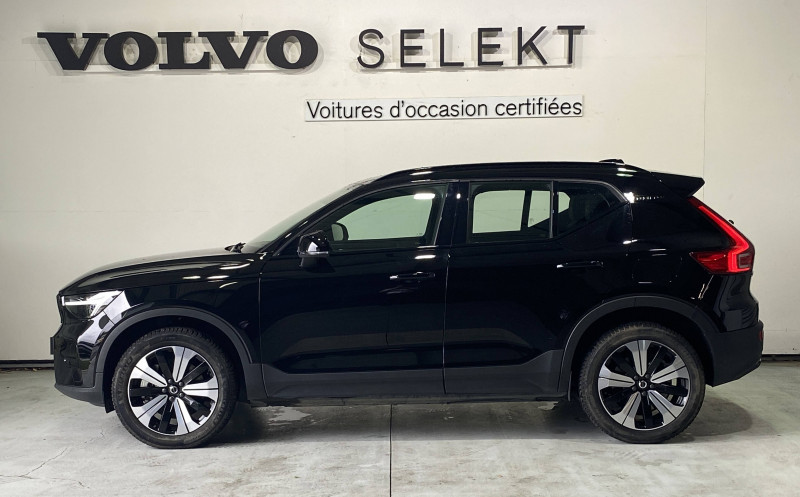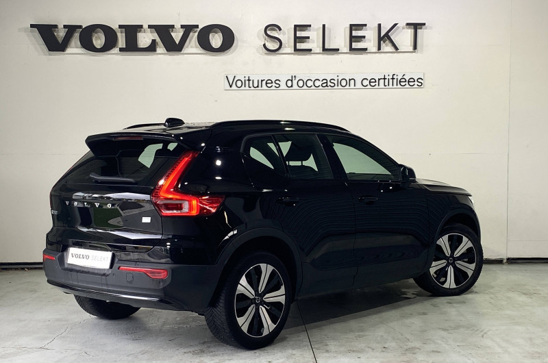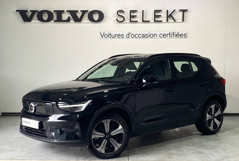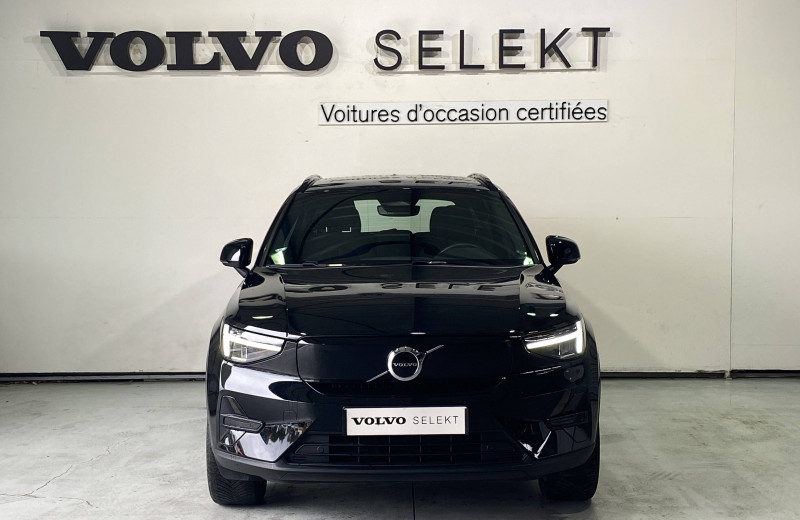 2 porte-cintres / Accès au service d'assistance Volvo via bouton dédié dans le plafonnier / Accès au service d'urgence Volvo via bouton SOS dans le plafonnier / Airbag passager désactivable avec témoin d'indication (on/off) / Airbags conducteur et passager à déclenchement différencié / Alerte vigilance conducteur / Application Volvo Cars sur smartphone iOS ou Android / Assise des sièges AV extensible manuellement / Assistance à l'évitement des piétons et des cyclistes / Badge Recharge sur le hayon / Bas de caisse et passages de roues Anthracite / Câble de recharge de 7 mètres / 10 A. Pour prise secteur / Calandre AV pleine couleur carrosserie / Ceintures de sécuritéà inertie à 3 points d'ancrage (sur les 5 sièges) / City Safety, système d'anticipation de collision intelligent / CleanZone : Filtre charbon de climatisation multi-actif (limite l'entrée de pollen, de particules de pollution et de mauvaises odeurs en fermant automatiquement les arrivées d'air si nécessaire) et fonction pré-ventillation / Climatisation automatique bi-zone (incluant ouïes d'aération à l'AR) / Coffre sous le capot AV d'une capacité de 31 litres / Combiné d'instruments digital 12,3" / Contrôle de la transmission en descente HDC / Coques de rétroviseurs Noir brillant / Corbeille intégrée et amovible au niveau du tunnel central AV / Crochet pour sacs intégréà la boîte à gants / Déclenchement automatique des feux de detresse lors d'un freinage d'urgence / Deuxième câble de recharge Type 2, 4.5 mètres, 32 A triphasé (fonctionne en monophasé) Pour borne de recharge / Diffuseur AR Noir laqué / Direction assistée asservie à la vitesse / Eclairage d'accompagnement et éclairage d'approche / Ecran tactile multimédia haute résolution 9" personnalisable / Envoi automatique d'une alerte au service d'urgence Volvo en cas de collision / Espace de rangement sous la console centrale / Fonction climatisation de l'habitacle moteur coupé / Fonction Eco : optimisation des paramètres véhicule pour une conduite économique et écologique (à la demande) / Freinage automatique post-collision (réduction du risque de suraccident) / Frein de parking électronique automatique en fonction Auto Hold (désactivable) / Gravure Recharge sur les montants AR / Incrustations Aluminium / Indicateur de perte de pression des pneus / Infotainment Google Android Services Google (comprend Google Maps, Google Assistant, Google Play Store, chargeur smartphone par induction et un volume de données illimité pour les 4 premières années) et Kit mains libres Bluetooth et Streaming Audio, mode d'emploi numérique du véhicule, réception de la radio numérique (DAB+), mises à jour Over the Air (OTA). / Jantes alliage 19" 5 branches Graphite Mat/Diamant AV 235/50 R19, AR 255/45 R19 / Kit anti-crevaison / Matériaux anti-allergènes dans l'habitacle (sellerie tissu, ceintures de sécurité, incrustations) / Miroirs de courtoisie éclairés, spots de lecture à l'AV et éclairage dans le coffre / Mise à jour du système à distance / Pare-brise en verre feuilleté et colonne de direction rétractable en cas de choc / Parties inférieures des vitres noir brillant / Phares LED avec feux de jour design marteau de Thor et feux de route adaptatifs / Pneus toutes saison / Pommeau de levier de vitesse gainé de Simili-Cuir / Port de recharge sur l'aile AR gauche et connecteur charge rapide (jusqu'à 150 kW) / Porte-cartes bancaires et cartes de services intégré dans la planche de bord / Pré-câblage électrique pour le crochet d'attelage / Préparation pour le système Isofix (places latérales de la 2ème rangée de sièges) / Protections de pare-chocs AV et AR Noir brillant / Rappel d'oubli de bouclage des ceintures de sécurité AV et AR / Réglage en hauteur manuel des ceintures AV / Rétroviseurs couleur carrosserie avec partie inférieure noir / Rétroviseurs intérieur (sans contour) et extérieur électrochrome / Sabots de protection AV et AR Noir / Sellerie Tissu City Canvas/Antracite / Seuil de coffre en Aluminium / Seuils de portes AV Volvo en Aluminium / Siège conducteur et passager avec réglage manuel de la hauteur / Sièges conducteur et passager avec réglage manuel de la longueur, de l'inclinaison du dossier et de l'assise / Sièges conducteur et passager avec réglages électriques des supports lombaires / Sonde de température extérieure et horloge / Système audio Volvo High Performance avec technologie air woofer au niveau de la console centrale 250 W, 8 HP, radio numérique terrestre, prise 12 V et 2 ports USB C à l'AV / Système de contrôle de la stabilité et de la traction STC / Système de contrôle du freinage du véhicule VDC / Système de pré-conditionnement de l'habitacle (chauffage) / Système de protection anti-sortie de route / Système de protection collision frontale : Détection du risque de collision frontale (de 65 à 140 km/h) avec action corrective sur la direction / Système de protection contre le coup du lapin WHIPS (sièges AV) / Système de protection contre les chocs latéraux SIPS / Système de protection en cas de sortie de route / Système de réglage en hauteur des phares / Système intelligent d'information au conducteur IDIS / Tapis de sol premium / Télécommande de verrouillage centralisé avec clé de contact intégrée, fermeture à distance des vitres et du toit ouvrant et fonction panique / Trousse de 1er secours et triangle de présignalisation / Tunnel de la console centrale Noir brillant / Verrouillage automatique des portes à partir de 7 km/h / Verrouillage de sécurité enfant manuel / Vitres AV et AR électriques à impulsion (montée et descente) avec système anti-pincement / Volant sport avec insert Aluminium
