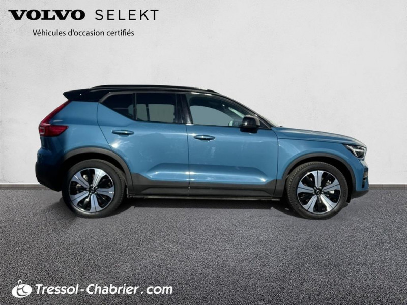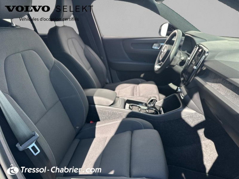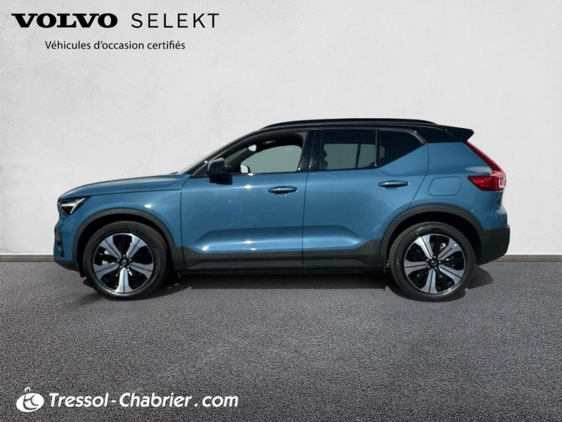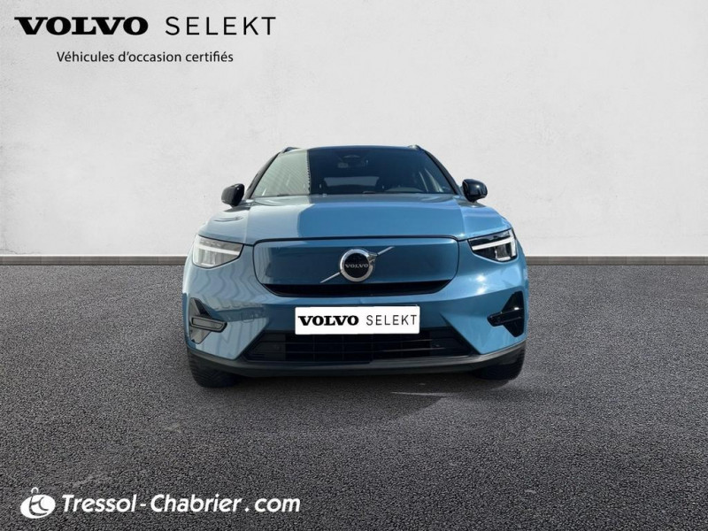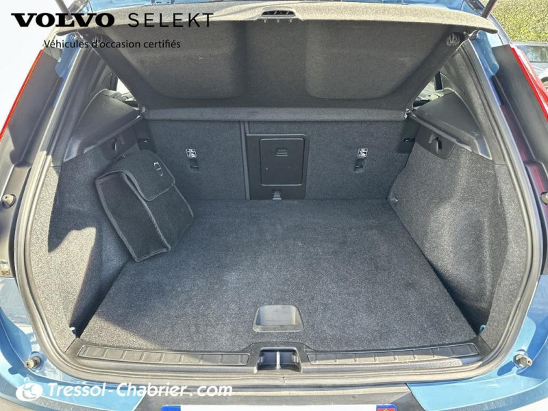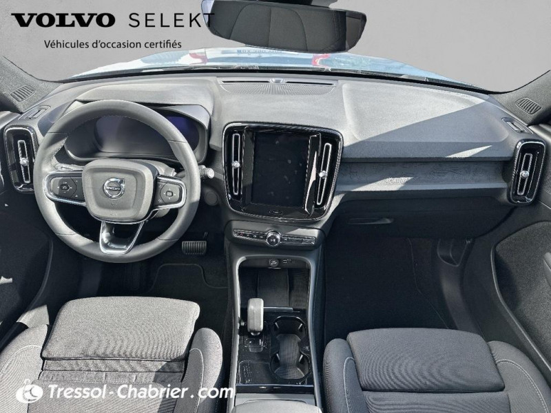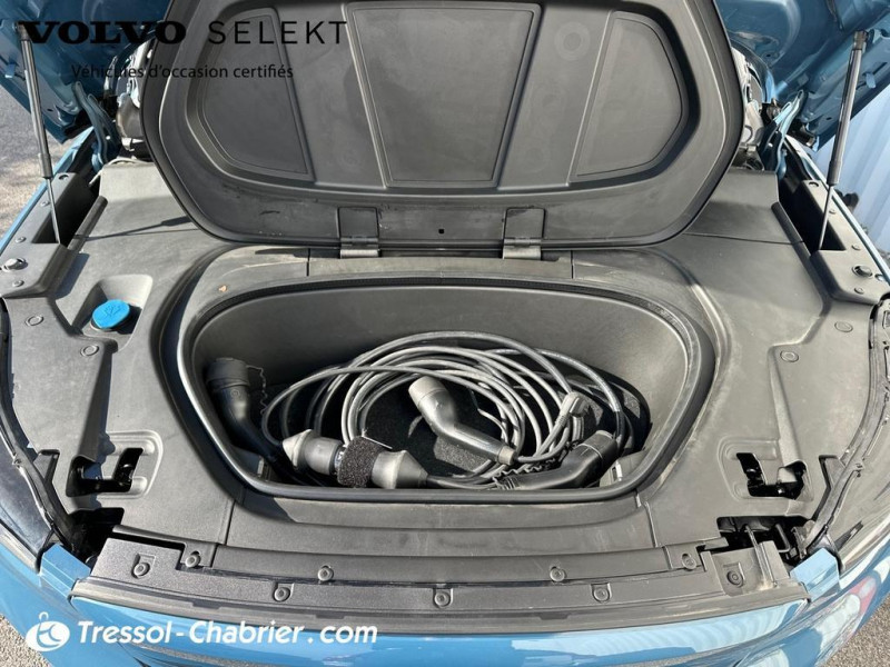 2 porte-cintres / Accès au service d'assistance Volvo via bouton dédié dans le plafonnier / Accès au service d'urgence Volvo via bouton SOS / Accès au service d'urgence Volvo via bouton SOS dans le plafonnier / Airbag passager désactivable avec témoin d'indication (on/off) / Airbags conducteur et passager à déclenchement différencié / Alerte vigilance conducteur / Application Volvo Cars / Application Volvo Cars sur smartphone iOS ou Android / Appuie-tête sur chaque siège réglable en hauteur / Assise des sièges AV extensible manuellement / Assistance à l'évitement des piétons et des cyclistes / Badge Recharge sur le hayon / Bas de caisse et passages de roues Anthracite / Bouton de verrouillage centralisé / Calandre AV pleine couleur carrosserie / Ceintures de sécurité à inertie à 3 points d'ancrage (sur les 5 sièges) / City Safety / système d'anticipation de collision intelligent / CleanZone : / Climatisation automatique bi-zone (incluant ouïes d'aération à l'AR) / Coffre sous le capot AV d'une capacité de 31 litres / Combiné d'instruments digital 12 / 3p / Combiné d'instruments digital 12 / 3p nouvelle génération / Commande vocale avancée / Contrôle de la transmission en descente HDC / Contrôle de stabilité au roulis RSC / Coques de rétroviseurs Noir brillant / Corbeille intégrée et amovible au niveau du tunnel central AV / Crochet pour sacs intégré à la boîte à gants / Câble de recharge de 7 mètres / 10 A. Pour prise secteur / Deuxième câble de recharge Type 2 / 4.5 mètres / 32 A triphasé (fonctionne en monophasé) / Diffuseur AR Noir laqué / Direction assistée asservie à la vitesse / Déclenchement automatique des feux de detresse lors d'un freinage d'urgence / Eclairage d'accompagnement et éclairage d'approche / Ecran tactile multimédia haute résolution 9p personnalisable / En cas de collision / envoi automatique d'une alerte au service d'urgence Volvo / Envoi automatique d'une alerte au service d'urgence Volvo en cas de collision / Espace de rangement sous la console centrale / Filtre à particules sans entretien / Fonction Eco : / Fonction climatisation de l'habitacle moteur coupé / Frein de parking électronique automatique en fonction Auto Hold (désactivable) / Freinage automatique post-collision / Gravure Recharge sur les montants AR / Incrustations Aluminium / Indicateur de perte de pression des pneus / Infotainment Google Android / Intégration pour smartphone / Jantes alliage 19p 5 branches Graphite Mat/Diamant / Kit anti-crevaison / Matériaux anti-allergènes dans l'habitacle (sellerie tissu / ceintures de sécurité / incrustations) / spots de lecture à l'AV et éclairage dans le coffre / Mise à jour du système à distance / Pack Eclairage supérieur / Pare-brise en verre feuilleté et colonne de direction rétractable en cas de choc / Parties inférieures des vitres noir brillant / Phares LED avec correcteur dynamique de la portée / feux de route adaptatifs et feux de / Phares LED avec feux de jour design marteau de Thor et feux de route adaptatifs / Pneus toutes saison / Pommeau de levier de vitesse gainé de Simili-Cuir / Port de recharge sur l'aile AR gauche et connecteur charge rapide (jusqu'à 150 kW) / Porte-cartes bancaires et cartes de services intégré dans la planche de bord / Protections de pare-chocs AV et AR Noir brillant / Pré-câblage électrique pour le crochet d'attelage / Préparation pour le système Isofix (places latérales de la 2ème rangée de sièges) / Pédales Sport en Aluminium / Rappel d'oubli de bouclage des ceintures de sécurité AV et AR / Réglage en hauteur manuel des ceintures AV / Rétroviseur extérieur conducteur grand angle / Rétroviseurs couleur carrosserie avec partie inférieure noir / Rétroviseurs intérieur (sans contour) et extérieur électrochrome / Sabots de protection AV et AR Noir / Sellerie Tissu City Canvas/Antracite / Seuil de coffre en Aluminium / Seuils de portes AV Volvo en Aluminium / Siège conducteur et passager avec réglage manuel de la hauteur / Sièges conducteur et passager avec réglage manuel de la longueur / de l'inclinaison du dossier / Sièges conducteur et passager avec réglages électriques des supports lombaires / Sonde de température extérieure et horloge / Système audio Volvo High Performance avec technologie air woofer au niveau de la console centrale / Système de contrôle de la stabilité et de la traction STC / Système de contrôle du freinage du véhicule VDC / Système de protection anti-sortie de route / Système de protection collision frontale : / Système de protection contre le coup du lapin WHIPS (sièges AV) / Système de protection contre les chocs latéraux SIPS / Système de protection en cas de sortie de route / Système de pré-conditionnement de l'habitacle (chauffage) / Système de réglage en hauteur des phares / Système intelligent d'information au conducteur IDIS / Tapis de sol premium / Toit contrasté noir / Trousse de 1er secours et triangle de présignalisation / Tunnel de la console centrale Noir brillant / Télécommande de verrouillage centralisé avec clé de contact intégrée / fermeture à distance des / Verrouillage automatique des portes à partir de 7 km/h / Verrouillage de sécurité enfant manuel / Vitres AV et AR électriques à impulsion (montée et descente) avec système anti-pincement / Volant sport avec insert Aluminium / Volant sport en Cuir perforé avec insert Aluminium