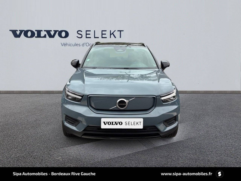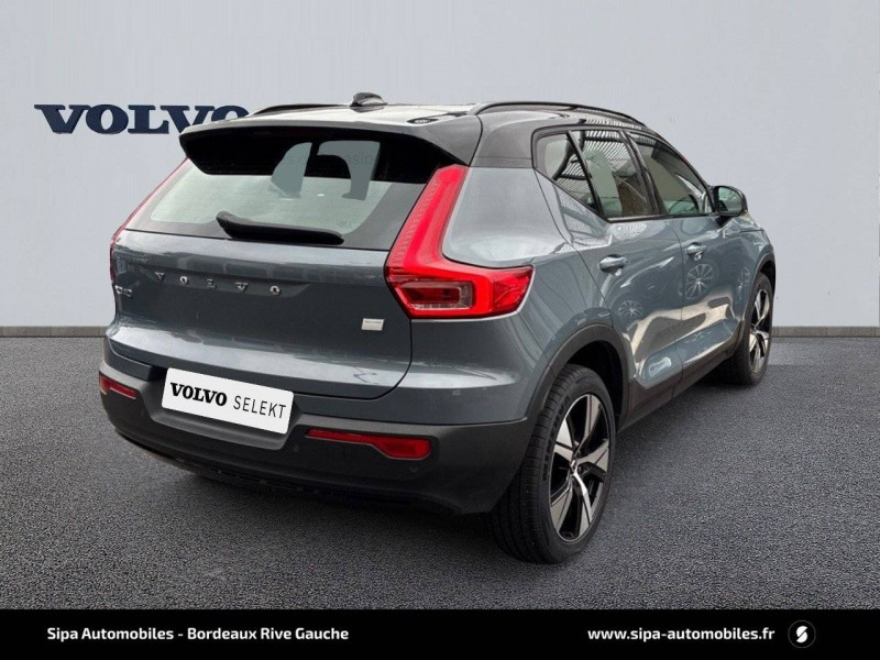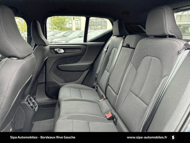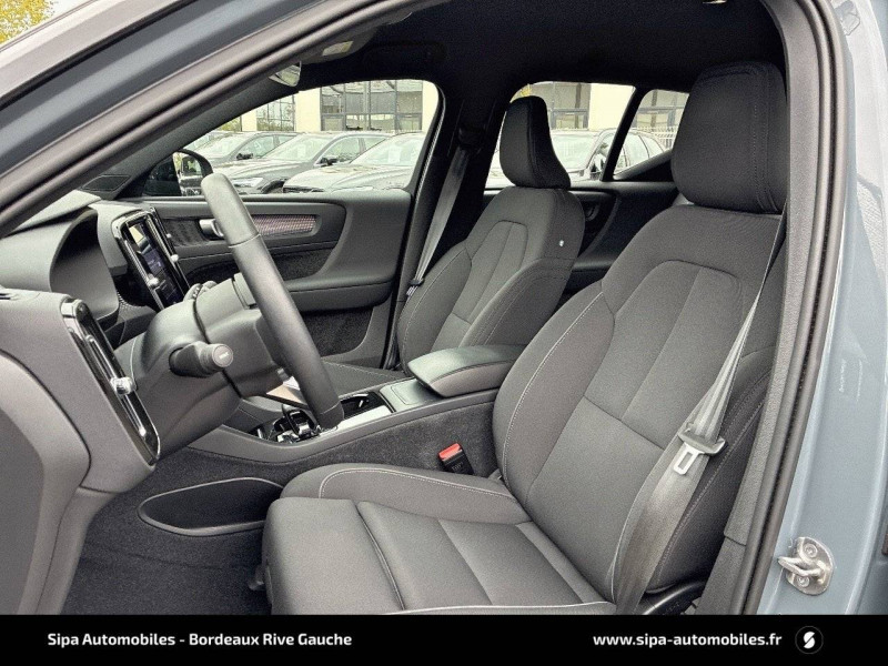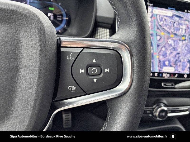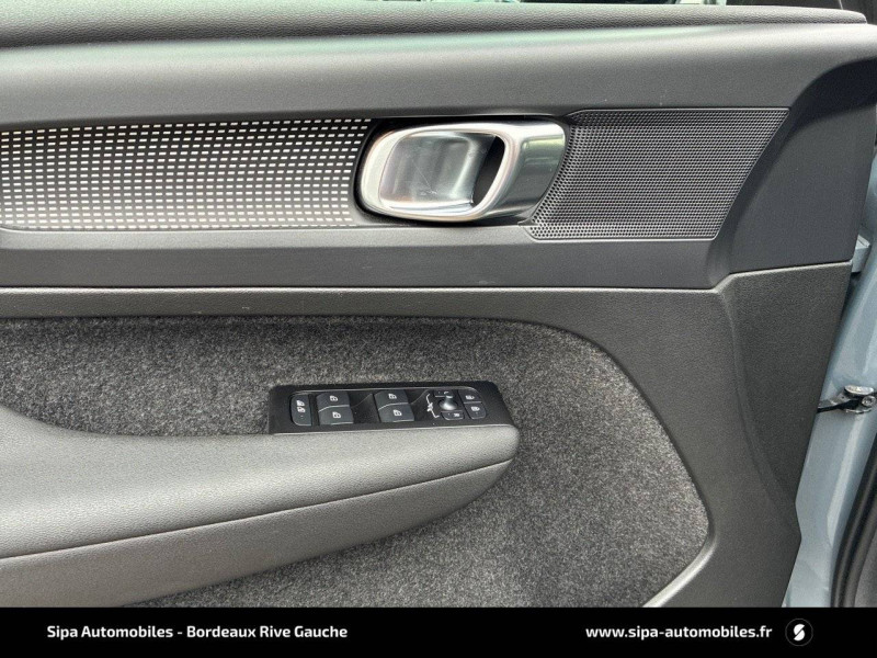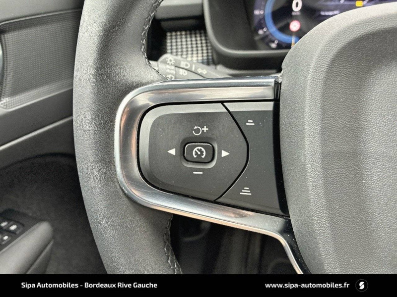 2 porte-cintres / Accès au service d'assistance Volvo via bouton dédié dans le plafonnier / Accès au service d'urgence Volvo via bouton SOS dans le plafonnier / Airbag passager désactivable avec témoin d'indication (on/off) / Airbags conducteur et passager à déclenchement différencié / Alerte vigilance conducteur / Application Volvo Cars sur smartphone iOS ou Android / Assise des sièges AV extensible manuellement / Assistance à l'évitement des piétons et des cyclistes / Badge Recharge sur le hayon / Bas de caisse et passages de roues Anthracite / Câble de recharge de 7 mètres / 10 A. Pour prise secteur / Calandre AV pleine couleur carrosserie / Ceintures de sécuritéà inertie à 3 points d'ancrage (sur les 5 sièges) / City Safety, système d'anticipation de collision intelligent / CleanZone : Filtre charbon de climatisation multi-actif (limite l'entrée de pollen, de particules de pollution et de mauvaises odeurs en fermant automatiquement les arrivées d'air si nécessaire) et fonction pré-ventillation / Climatisation automatique bi-zone (incluant ouïes d'aération à l'AR) / Coffre sous le capot AV d'une capacité de 31 litres / Combiné d'instruments digital 12,3" / Contrôle de la transmission en descente HDC / Coques de rétroviseurs Noir brillant / Corbeille intégrée et amovible au niveau du tunnel central AV / Crochet pour sacs intégréà la boîte à gants / Déclenchement automatique des feux de detresse lors d'un freinage d'urgence / Deuxième câble de recharge Type 2, 4.5 mètres, 32 A triphasé (fonctionne en monophasé) Pour borne de recharge / Diffuseur AR Noir laqué / Direction assistée asservie à la vitesse / Eclairage d'accompagnement et éclairage d'approche / Ecran tactile multimédia haute résolution 9" personnalisable / Envoi automatique d'une alerte au service d'urgence Volvo en cas de collision / Espace de rangement sous la console centrale / Fonction climatisation de l'habitacle moteur coupé / Fonction Eco : optimisation des paramètres véhicule pour une conduite économique et écologique (à la demande) / Freinage automatique post-collision (réduction du risque de suraccident) / Frein de parking électronique automatique en fonction Auto Hold (désactivable) / Gravure Recharge sur les montants AR / Incrustations Aluminium / Indicateur de perte de pression des pneus / Infotainment Google Android Services Google (comprend Google Maps, Google Assistant, Google Play Store, chargeur smartphone par induction et un volume de données illimité pour les 4 premières années) et Kit mains libres Bluetooth et Streaming Audio, mode d'emploi numérique du véhicule, réception de la radio numérique (DAB+), mises à jour Over the Air (OTA). / Jantes alliage 19" 5 branches Graphite Mat/Diamant AV 235/50 R19, AR 255/45 R19 / Kit anti-crevaison / Matériaux anti-allergènes dans l'habitacle (sellerie tissu, ceintures de sécurité, incrustations) / Miroirs de courtoisie éclairés, spots de lecture à l'AV et éclairage dans le coffre / Mise à jour du système à distance / Pare-brise en verre feuilleté et colonne de direction rétractable en cas de choc / Parties inférieures des vitres noir brillant / Phares LED avec feux de jour design marteau de Thor et feux de route adaptatifs / Pneus toutes saison / Pommeau de levier de vitesse gainé de Simili-Cuir / Port de recharge sur l'aile AR gauche et connecteur charge rapide (jusqu'à 150 kW) / Porte-cartes bancaires et cartes de services intégré dans la planche de bord / Pré-câblage électrique pour le crochet d'attelage / Préparation pour le système Isofix (places latérales de la 2ème rangée de sièges) / Protections de pare-chocs AV et AR Noir brillant / Rappel d'oubli de bouclage des ceintures de sécurité AV et AR / Réglage en hauteur manuel des ceintures AV / Rétroviseurs couleur carrosserie avec partie inférieure noir / Rétroviseurs intérieur (sans contour) et extérieur électrochrome / Sabots de protection AV et AR Noir / Sellerie Tissu City Canvas/Antracite / Seuil de coffre en Aluminium / Seuils de portes AV Volvo en Aluminium / Siège conducteur et passager avec réglage manuel de la hauteur / Sièges conducteur et passager avec réglage manuel de la longueur, de l'inclinaison du dossier et de l'assise / Sièges conducteur et passager avec réglages électriques des supports lombaires / Sonde de température extérieure et horloge / Système audio Volvo High Performance avec technologie air woofer au niveau de la console centrale 250 W, 8 HP, radio numérique terrestre, prise 12 V et 2 ports USB C à l'AV / Système de contrôle de la stabilité et de la traction STC / Système de contrôle du freinage du véhicule VDC / Système de pré-conditionnement de l'habitacle (chauffage) / Système de protection anti-sortie de route / Système de protection collision frontale : Détection du risque de collision frontale (de 65 à 140 km/h) avec action corrective sur la direction / Système de protection contre le coup du lapin WHIPS (sièges AV) / Système de protection contre les chocs latéraux SIPS / Système de protection en cas de sortie de route / Système de réglage en hauteur des phares / Système intelligent d'information au conducteur IDIS / Tapis de sol premium / Télécommande de verrouillage centralisé avec clé de contact intégrée, fermeture à distance des vitres et du toit ouvrant et fonction panique / Trousse de 1er secours et triangle de présignalisation / Tunnel de la console centrale Noir brillant / Verrouillage automatique des portes à partir de 7 km/h / Verrouillage de sécurité enfant manuel / Vitres AV et AR électriques à impulsion (montée et descente) avec système anti-pincement / Volant sport avec insert Aluminium