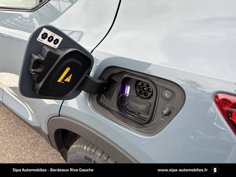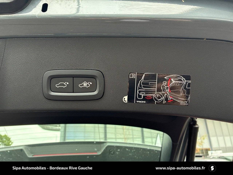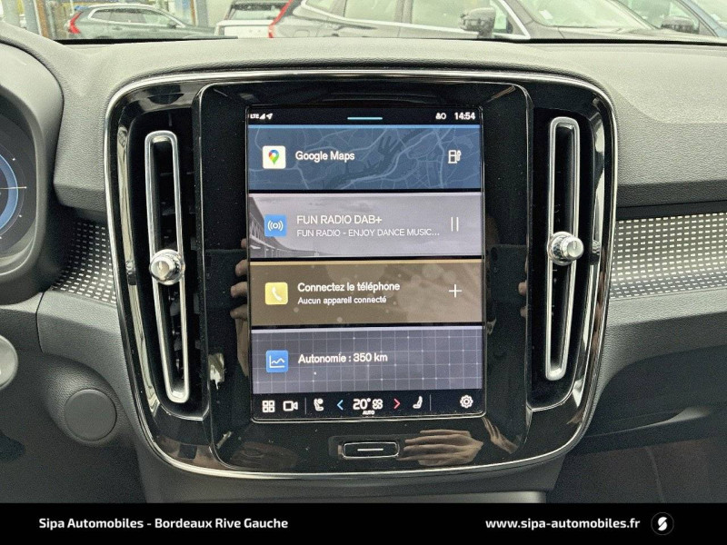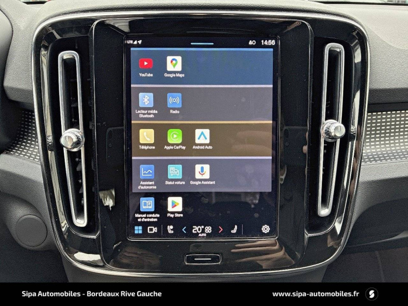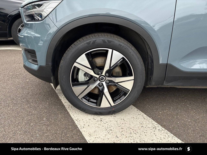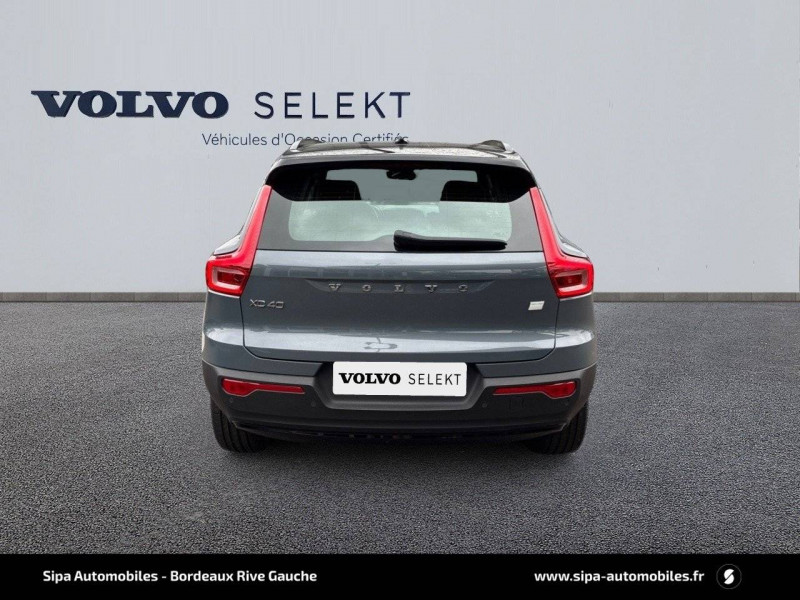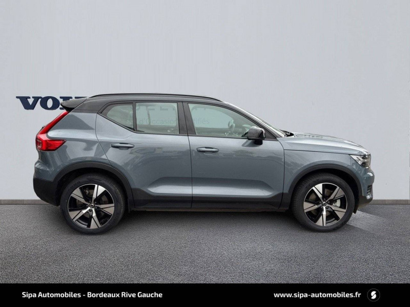 2 porte-cintres / Accès au service d'assistance Volvo via bouton dédié dans le plafonnier / Accès au service d'urgence Volvo via bouton SOS dans le plafonnier / Airbag passager désactivable avec témoin d'indication (on/off) / Airbags conducteur et passager à déclenchement différencié / Alerte vigilance conducteur / Application Volvo Cars sur smartphone iOS ou Android / Assise des sièges AV extensible manuellement / Assistance à l'évitement des piétons et des cyclistes / Badge Recharge sur le hayon / Bas de caisse et passages de roues Anthracite / Câble de recharge de 7 mètres / 10 A. Pour prise secteur / Calandre AV pleine couleur carrosserie / Ceintures de sécuritéà inertie à 3 points d'ancrage (sur les 5 sièges) / City Safety, système d'anticipation de collision intelligent / CleanZone : Filtre charbon de climatisation multi-actif (limite l'entrée de pollen, de particules de pollution et de mauvaises odeurs en fermant automatiquement les arrivées d'air si nécessaire) et fonction pré-ventillation / Climatisation automatique bi-zone (incluant ouïes d'aération à l'AR) / Coffre sous le capot AV d'une capacité de 31 litres / Combiné d'instruments digital 12,3" / Contrôle de la transmission en descente HDC / Coques de rétroviseurs Noir brillant / Corbeille intégrée et amovible au niveau du tunnel central AV / Crochet pour sacs intégréà la boîte à gants / Déclenchement automatique des feux de detresse lors d'un freinage d'urgence / Deuxième câble de recharge Type 2, 4.5 mètres, 32 A triphasé (fonctionne en monophasé) Pour borne de recharge / Diffuseur AR Noir laqué / Direction assistée asservie à la vitesse / Eclairage d'accompagnement et éclairage d'approche / Ecran tactile multimédia haute résolution 9" personnalisable / Envoi automatique d'une alerte au service d'urgence Volvo en cas de collision / Espace de rangement sous la console centrale / Fonction climatisation de l'habitacle moteur coupé / Fonction Eco : optimisation des paramètres véhicule pour une conduite économique et écologique (à la demande) / Freinage automatique post-collision (réduction du risque de suraccident) / Frein de parking électronique automatique en fonction Auto Hold (désactivable) / Gravure Recharge sur les montants AR / Incrustations Aluminium / Indicateur de perte de pression des pneus / Infotainment Google Android Services Google (comprend Google Maps, Google Assistant, Google Play Store, chargeur smartphone par induction et un volume de données illimité pour les 4 premières années) et Kit mains libres Bluetooth et Streaming Audio, mode d'emploi numérique du véhicule, réception de la radio numérique (DAB+), mises à jour Over the Air (OTA). / Jantes alliage 19" 5 branches Graphite Mat/Diamant AV 235/50 R19, AR 255/45 R19 / Kit anti-crevaison / Matériaux anti-allergènes dans l'habitacle (sellerie tissu, ceintures de sécurité, incrustations) / Miroirs de courtoisie éclairés, spots de lecture à l'AV et éclairage dans le coffre / Mise à jour du système à distance / Pare-brise en verre feuilleté et colonne de direction rétractable en cas de choc / Parties inférieures des vitres noir brillant / Phares LED avec feux de jour design marteau de Thor et feux de route adaptatifs / Pneus toutes saison / Pommeau de levier de vitesse gainé de Simili-Cuir / Port de recharge sur l'aile AR gauche et connecteur charge rapide (jusqu'à 150 kW) / Porte-cartes bancaires et cartes de services intégré dans la planche de bord / Pré-câblage électrique pour le crochet d'attelage / Préparation pour le système Isofix (places latérales de la 2ème rangée de sièges) / Protections de pare-chocs AV et AR Noir brillant / Rappel d'oubli de bouclage des ceintures de sécurité AV et AR / Réglage en hauteur manuel des ceintures AV / Rétroviseurs couleur carrosserie avec partie inférieure noir / Rétroviseurs intérieur (sans contour) et extérieur électrochrome / Sabots de protection AV et AR Noir / Sellerie Tissu City Canvas/Antracite / Seuil de coffre en Aluminium / Seuils de portes AV Volvo en Aluminium / Siège conducteur et passager avec réglage manuel de la hauteur / Sièges conducteur et passager avec réglage manuel de la longueur, de l'inclinaison du dossier et de l'assise / Sièges conducteur et passager avec réglages électriques des supports lombaires / Sonde de température extérieure et horloge / Système audio Volvo High Performance avec technologie air woofer au niveau de la console centrale 250 W, 8 HP, radio numérique terrestre, prise 12 V et 2 ports USB C à l'AV / Système de contrôle de la stabilité et de la traction STC / Système de contrôle du freinage du véhicule VDC / Système de pré-conditionnement de l'habitacle (chauffage) / Système de protection anti-sortie de route / Système de protection collision frontale : Détection du risque de collision frontale (de 65 à 140 km/h) avec action corrective sur la direction / Système de protection contre le coup du lapin WHIPS (sièges AV) / Système de protection contre les chocs latéraux SIPS / Système de protection en cas de sortie de route / Système de réglage en hauteur des phares / Système intelligent d'information au conducteur IDIS / Tapis de sol premium / Télécommande de verrouillage centralisé avec clé de contact intégrée, fermeture à distance des vitres et du toit ouvrant et fonction panique / Trousse de 1er secours et triangle de présignalisation / Tunnel de la console centrale Noir brillant / Verrouillage automatique des portes à partir de 7 km/h / Verrouillage de sécurité enfant manuel / Vitres AV et AR électriques à impulsion (montée et descente) avec système anti-pincement / Volant sport avec insert Aluminium