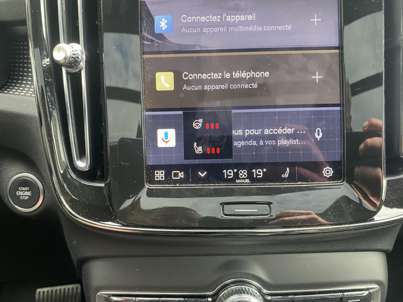 Aide à la sécurité / City Safety, système d'anticipation de collision intelligent : Détection des véhicules, cyclistes et piétons avec freinage automatique à pleine puissance. Détection des véhicules aux intersections avec freinage automatique à pleine puissance. Avertissement visuel et sonore paramétrable. Préparation des freins et ceintures de sécurité AV. / Climatisation automatique bi-zone (incluant ouïes d'aération à l'AR) / Commande vocale avancée (climatisation, médias, téléphone, eManuel utilisateur et navigation) / Déclenchement automatique des feux de detresse lors d'un freinage d'urgence / Envoi automatique d'une alerte au service d'urgence Volvo en cas de collision / Fonction climatisation de l'habitacle moteur coupé / Frein de parking électronique automatique en fonction Auto Hold (désactivable) / Freinage automatique post-collision (réduction du risque de suraccident) / Jantes alliage 19" 5 branches Y Noir Mat/Diamant 235/50 R19 / Pack Digital Services 4 ans / Pack Intellisafe Pro / Pack Visibilté / Phares LED avec correcteur dynamique de la portée et feux de jour design marteau de Thor / Pré-câblage électrique pour le crochet d'attelage / Seuils de portes AV Volvo en Aluminium / Toit ouvrant panoramique en deux parties avec pare-soleil électrique / Télécommande de verrouillage centralisé avec clé de contact intégrée, fermeture à distance des vitres et du toit ouvrant et fonction panique / Verrouillage automatique des portes à partir de 7 km/h / Volant sport en Cuir avec insert Aluminium / Accès au service d'assistance Volvo via bouton dédié dans le plafonnier / Accès au service d'urgence Volvo via bouton SOS dans le plafonnier / Airbag conducteur à déclenchement différencié / Airbag passager désactivable avec témoin d'indication (on/off) / Alerte vigilance conducteur / Application Volvo Cars / Assise des sièges AV extensible manuellement / Assistant d'arrêt d'urgence, qui peut faire ralentir le véhicule jusqu'à l'arrêt en cas d'absence de réaction du conducteur aux signaux d'alerte / Bas de caisse et passages de roues Anthracite / Ceintures de sécuritéà inertie à 3 points d'ancrage (sur les 5 sièges) / Combiné d'instruments digital 12,3" / Contour de la calandre chromé / Contrôle de la transmission en descente HDC / Direction assistée asservie à la vitesse / Eclairage d'accompagnement et éclairage d'approche / Eclairage d'intérieur : Spots de lecture à l'AV avec éclairage des passagers AV, éclairages dans le coffre (x2). Miroirs de courtoisie éclairés avec éclairage d'ambiance au niveau des pieds. Boîte à gants éclairée / Ecran tactile multimédia haute résolution 9" personnalisable / Espace de rangement sous la console centrale / Fonction Eco : optimisation des paramètres véhicule pour une conduite économique et écologique (à la demande) / Fonction Stop&Start : coupe et redémarre le moteur lorsque la voiture est à l'arrêt (déconnectable) / Incrustations Urban Grid / Indicateur de perte de pression des pneus / Infotainment Google Android / Intégration pour smartphone / Kit anti-crevaison / Ouverture des portes sans clé Keyless Entry Eclairage du sol dans les poignées de porte AV + Hayon électrique avec fonction Confort (sans les mains) / Pare-brise en verre feuilleté et colonne de direction rétractable en cas de choc / Park Assist / Pistage du véhicule par le service en cas de vol du véhicule / Porte-cartes bancaires et cartes de services intégré dans la planche de bord / Porte-ticket de parking et d'autoroute / Protection de pare-chocs AV et AR Noir / Rails de toit couleur noir / Rappel d'oubli de bouclage de ceinture de sécurité AV et AR / Réglage en hauteur manuel des ceintures AV / Rétroviseurs couleur carrosserie avec partie inférieure noir / Sabots de protection AV et AR Noir / Siège conducteur à commande électrique avec fonction de mémoire pour la position d'assise et les rétroviseurs extérieurs / Sonde de température extérieure et horloge / Sortie d'échappement non visible / Style extérieur dark / Système audio Volvo Premium Sound by Harman/Kardon 600 W avec 13 HP et technologie Subwoofer / Système de contrôle de la stabilité et de la traction STC / Système de contrôle du freinage du véhicule VDC / Système de filtration de l'air CleanZone Advanced avec indication de la qualité de l'air intérieur / Système de protection anti-sortie de route / Système de protection collision frontale : Détection du risque de collision frontale (de 65 à 140 km/h) avec action corrective sur la direction / Système de protection contre le coup du lapin WHIPS (sièges AV) / Système de protection contre les chocs latéraux SIPS / Système de protection en cas de sortie de route / Système de recharge sans fil pour smartphone situé dans le compartiment de rangement AV / Système de réglage en hauteur des phares / Système intelligent d'information au conducteur IDIS / Sécurité enfant à commande électrique / Tapis de sol textile AV/AR / Trappe de carburant intelligente sans bouchon / Trousse de 1er secours et triangle de présignalisation / Tunnel de la console centrale Anthracite / Verrouillage de sécurité enfant manuel / Vitres AV et AR électriques à impulsion (montée et descente) avec système anti-pincement