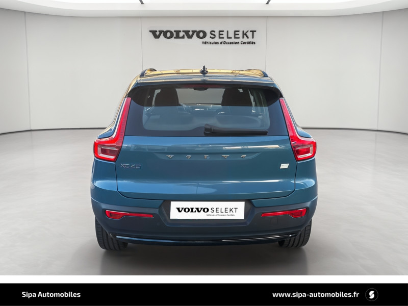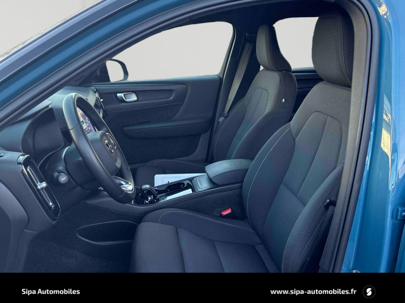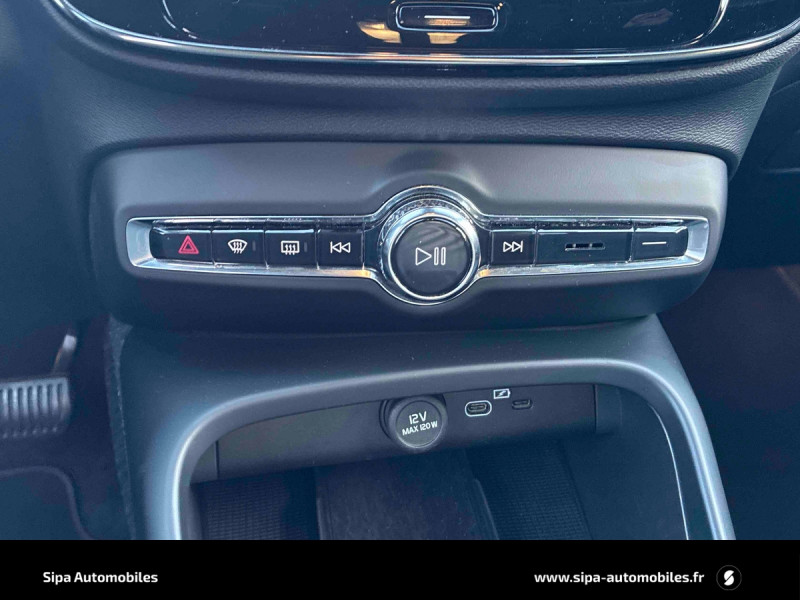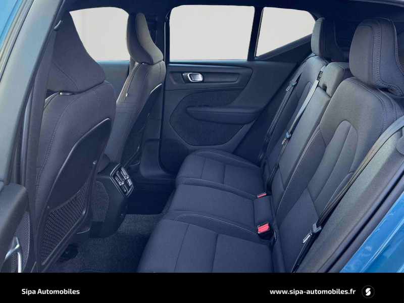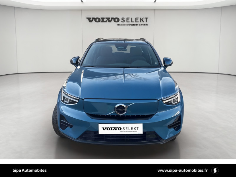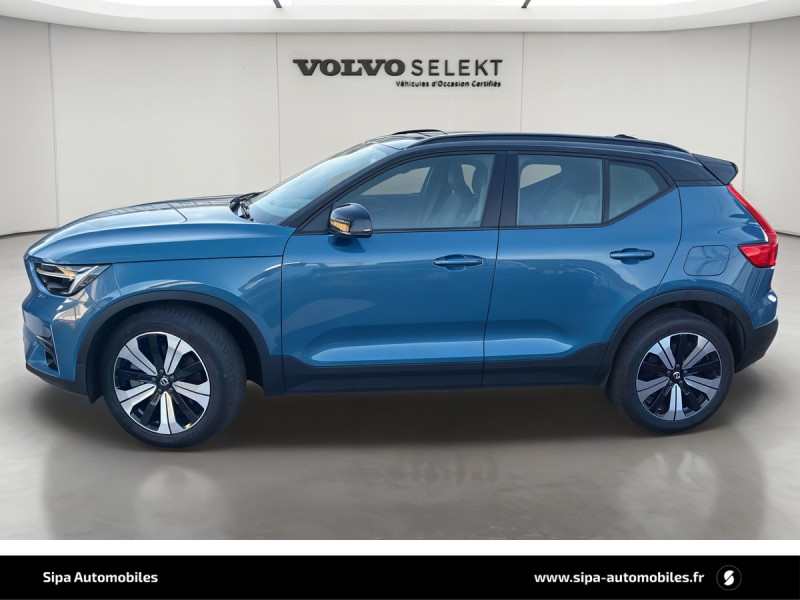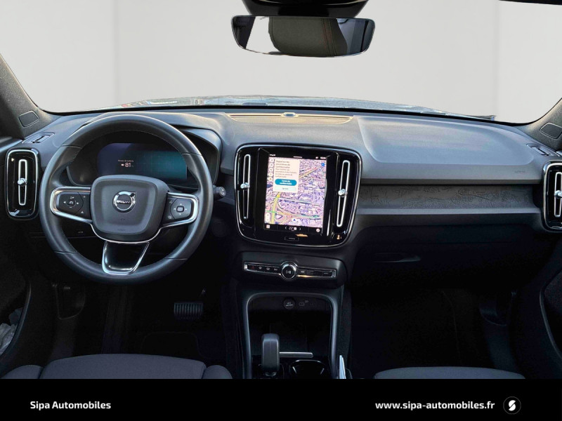 CleanZone : Filtre charbon de climatisation multi-actif (limite l'entrée de pollen, de particules de pollution et de mauvaises odeurs en fermant automatiquement les arrivées d'air si nécessaire) et fonction pré-ventillation / Climatisation automatique bi-zone (incluant ouïes d'aération à l'AR) / Déclenchement automatique des feux de detresse lors d'un freinage d'urgence / Envoi automatique d'une alerte au service d'urgence Volvo en cas de collision / Fonction climatisation de l'habitacle moteur coupé / Frein de parking électronique automatique en fonction Auto Hold (désactivable) / Freinage automatique post-collision (réduction du risque de suraccident) / Incrustations Aluminium / Jantes alliage 19" 5 branches Graphite Mat/Diamant AV 235/50 R19, AR 255/45 R19 / Phares LED avec feux de jour design marteau de Thor et feux de route adaptatifs / Pommeau de levier de vitesse gainé de Simili-Cuir / Pré-câblage électrique pour le crochet d'attelage / Seuil de coffre en Aluminium / Seuils de portes AV Volvo en Aluminium / Télécommande de verrouillage centralisé avec clé de contact intégrée, fermeture à distance des vitres et du toit ouvrant et fonction panique / Verrouillage automatique des portes à partir de 7 km/h / Volant sport avec insert Aluminium / 2 porte-cintres / Accès au service d'assistance Volvo via bouton dédié dans le plafonnier / Accès au service d'urgence Volvo via bouton SOS dans le plafonnier / Airbag passager désactivable avec témoin d'indication (on/off) / Airbags conducteur et passager à déclenchement différencié / Alerte vigilance conducteur / Application Volvo Cars sur smartphone iOS ou Android / Assise des sièges AV extensible manuellement / Assistance à l'évitement des piétons et des cyclistes / Badge Recharge sur le hayon / Bas de caisse et passages de roues Anthracite / Calandre AV pleine couleur carrosserie / Ceintures de sécuritéà inertie à 3 points d'ancrage (sur les 5 sièges) / City Safety, système d'anticipation de collision intelligent / Coffre sous le capot AV d'une capacité de 31 litres / Combiné d'instruments digital 12,3" / Contrôle de la transmission en descente HDC / Coques de rétroviseurs Noir brillant / Corbeille intégrée et amovible au niveau du tunnel central AV / Crochet pour sacs intégréà la boîte à gants / Câble de recharge de 7 mètres / 10 A. Pour prise secteur / Deuxième câble de recharge Type 2, 4.5 mètres, 32 A triphasé (fonctionne en monophasé) Pour borne de recharge / Diffuseur AR Noir laqué / Direction assistée asservie à la vitesse / Eclairage d'accompagnement et éclairage d'approche / Ecran tactile multimédia haute résolution 9" personnalisable / Espace de rangement sous la console centrale / Fonction Eco : optimisation des paramètres véhicule pour une conduite économique et écologique (à la demande) / Gravure Recharge sur les montants AR / Indicateur de perte de pression des pneus / Infotainment Google Android Services Google (comprend Google Maps, Google Assistant, Google Play Store, chargeur smartphone par induction et un volume de données illimité pour les 4 premières années) et Kit mains libres Bluetooth et Streaming Audio, mode d'emploi numérique du véhicule, réception de la radio numérique (DAB+), mises à jour Over the Air (OTA). / Kit anti-crevaison / Miroirs de courtoisie éclairés, spots de lecture à l'AV et éclairage dans le coffre / Mise à jour du système à distance / Pare-brise en verre feuilleté et colonne de direction rétractable en cas de choc / Parties inférieures des vitres noir brillant / Pneus toutes saison / Port de recharge sur l'aile AR gauche et connecteur charge rapide (jusqu'à 150 kW) / Porte-cartes bancaires et cartes de services intégré dans la planche de bord / Protections de pare-chocs AV et AR Noir brillant / Préparation pour le système Isofix (places latérales de la 2ème rangée de sièges) / Rappel d'oubli de bouclage des ceintures de sécurité AV et AR / Réglage en hauteur manuel des ceintures AV / Rétroviseurs couleur carrosserie avec partie inférieure noir / Rétroviseurs intérieur (sans contour) et extérieur électrochrome / Sabots de protection AV et AR Noir / Siège conducteur et passager avec réglage manuel de la hauteur / Sièges conducteur et passaer avec réglage manuel de la longueur, de l'inclinaison du dossier et de l'assie / Sièges conducteur et passager avec réglages électriques des supports lombaires / Sonde de température extérieure et horloge / Système audio Volvo High Performance avec technologie air woofer au niveau de la console centrale 250 W, 8 HP, radio numérique terrestre, prise 12 V et 2 ports USB C à l'AV / Système de contrôle de la stabilité et de la traction STC / Système de contrôle du freinage du véhicule VDC / Système de protection anti-sortie de route / Système de protection collision frontale : Détection du risque de collision frontale (de 65 à 140 km/h) avec action corrective sur la direction / Système de protection contre le coup du lapin WHIPS (sièges AV) / Système de protection contre les chocs latéraux SIPS / Système de protection en cas de sortie de route / Système de pré-conditionnement de l'habitacle (chauffage) / Système de réglage en hauteur des phares / Système intelligent d'information au conducteur IDIS / Tapis de sol premium / Trousse de 1er secours et triangle de présignalisation / Tunnel de la console centrale Noir brillant / Verrouillage de sécurité enfant manuel / Vitres AV et AR électriques à impulsion (montée et descente) avec système anti-pincement