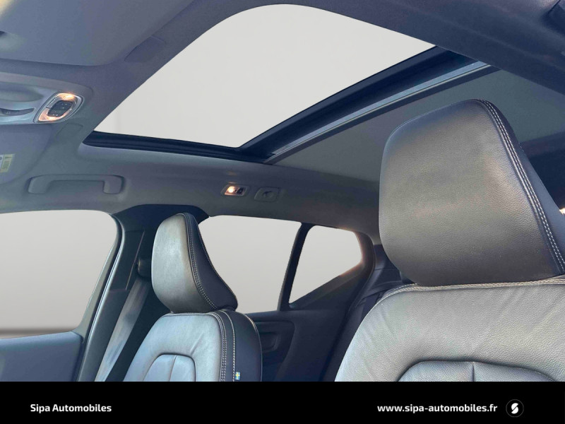 Appuis-tête AR rabattables automatiquement depuis l'écran central / Assise et dossier des sièges en Cuir / CleanZone : filtre à charbon de climatisation multi-actif et fonction pré-ventilation / Climatisation automatique bi-zone et aérations individuelles à l'AR / Commande vocale avancée (climatisation, médias, téléphone, eManuel utilisateur et navigation) / Déclenchement automatique des feux de detresse lors d'un freinage d'urgence / Fonction climatisation de l'habitacle moteur coupé / Frein de parking électronique automatique en fonction Auto Hold (désactivable) / Freinage automatique post-collision (réduction du risque de suraccident) / Incrustations Bois Flotté / Jantes alliage 19" 5 branches double Noir / Diamant, 235/50 R19 / Phares LED avec correcteur dynamique de la portée, feux de route adaptatifs et feux de jour design marteau de Thor / Pommeau de levier de vitesse Simili-cuir / Pré-câblage électrique pour le crochet d'attelage / Radars de stationnement AV et AR avec signal sonore et visuel / Sensus Navigation, Affichage 3D, cartographie Europe, information trafic en temps réel Applications web dédiées, 8 ans de mises à jour cartographiques gratuites grâce au programme MapCare / Seuil de coffre en Aluminium / Seuils de portes AV Inscription en Aluminium / Toit ouvrant panoramique en deux parties avec pare-soleil électrique / Télécommande de verrouillage centralisé avec clé de contact integrée, fermeture automatique des vitres et du toit ouvrant, fonction panique (déclenchement du klaxon et des feux de détresse) / Verrouillage automatique des portes à partir de 7 km/h / Volant 3 branches gainé de Cuir avec insert en Aluminium / 2 porte-cintres / Accès au service d'urgence Volvo via bouton SOS dans le plafonnier / Airbag passager désactivable avec témoin d'indication (on/off) / Airbags conducteur et passager à déclenchement différencié / Alerte vigilance conducteur / Application Volvo Cars avec fonction Car Sharing / Assise des sièges AV extensible manuellement / Badge T4/T5 Recharge sur le hayon / Bas de caisse et passages de roues Anthracite / Calandre spécifique Inscription avec contour chromé / Ceintures de sécuritéà inertie à 3 points d'ancrage (sur les 5 sièges) / City Safety, système d'anticipation de collision intelligent / Combiné d'instruments digital 12,3" / Contour inférieur des fenêtres latérales Argent brillant / Contrôle de la transmission en descente HDC / Crochet pour sacs intégréà la boîte à gants / Câble de recharge de 4,5 mètres / 10 A / Direction assistée électrique asservie à la vitesse / Eclairage d'accompagnement et éclairage d'approche / Ecran tactile multimédia haute résolution 9" personnalisable / Espace de rangement sous la console centrale / Filet de protection coffre/habitacle / Fonction Eco : optimisation des paramètres véhicule pour une conduite économique et écologique (à la demande) / Fonction Stop&Start : coupe et redémarre le moteur lorsque la voiture est à l'arrêt (déconnectable) / Gravure Recharge sur les montants AR / Indicateur de perte de pression des pneus / IntelliSafe Assist : régulateur adaptatif de vitesse et de distance ACC, Assistance à la conduite intelligente, Alerte distance de sécurité / Kit anti-crevaison / Matériaux anti-allergènes dans l'habitacle (sellerie tissu, ceintures de sécurité, incrustations) / Miroirs de courtoisie éclairés, spots de lecture à l'AV et éclairage dans le coffre / Mode de conduite personnalisable / Ouverture des portes sans clé Keyless Entry Eclairage du sol dans les poignées de porte AV + Hayon électrique avec fonction Confort (sans les mains) / Pare-brise en verre feuilleté et colonne de direction rétractable en cas de choc / Port de recharge sur l'aile AV gauche / Porte-cartes bancaires et cartes de services intégré dans la planche de bord / Porte-ticket de parking et d'autoroute / Protections de pare-chocs AV et AR Argent Mat / Préparation pour le système Isofix (places latérales de la 2ème rangée de sièges) / Rails de toit couleur Argent brillant / Rappel d'oubli de bouclage de ceinture de sécurité AV et AR / Réglage en hauteur manuel des ceintures AV / Rétroviseurs couleur carrosserie avec partie inférieure noir / Rétroviseurs intérieur (sans contour) et extérieurs électrochromes / Sabots de protection AV et AR Noir / Sensus Connect : Applications web, affichage et lecture vocale des SMS (TTS), eManuel utilisateur et service révision connectée / Siège conducteur à réglages électriques et à mémoires / Sièges AV chauffants (3 niveaux d'intensité) / Sièges conducteur et passager avec réglages électriques des supports lombaires / Sonde de température extérieure et horloge / Sortie d'échappement non visible / Système audio Volvo Premium Sound by Harman Kardon avec 13 HP et technologie Subwoofer / Système de contrôle de la stabilité et de la traction STC / Système de contrôle du freinage du véhicule VDC / Système de protection anti-sortie de route / Système de protection collision frontale : Détection du risque de collision frontale (de 65 à 140 km/h) avec action corrective sur la direction / Système de protection contre le coup du lapin WHIPS (sièges AV) / Système de protection contre les chocs latéraux SIPS / Système de protection en cas de sortie de route / Système de pré-conditionnement de l'habitacle (chauffage) / Système de réglage en hauteur des phares / Système intelligent d'information au conducteur IDIS / Tapis de sol textile AV/AR / Trappe de carburant intelligente sans bouchon / Trousse de 1er secours et triangle de présignalisation / Tunnel de la console centrale Noir brillant / Verrouillage de sécurité enfant manuel / Vitres AV et AR électriques à impulsion (montée et descente) avec système anti-pincement
